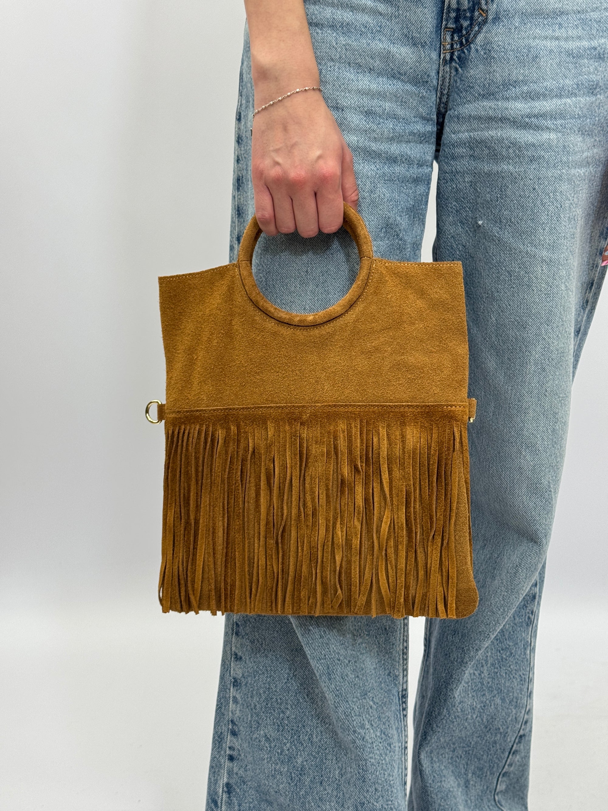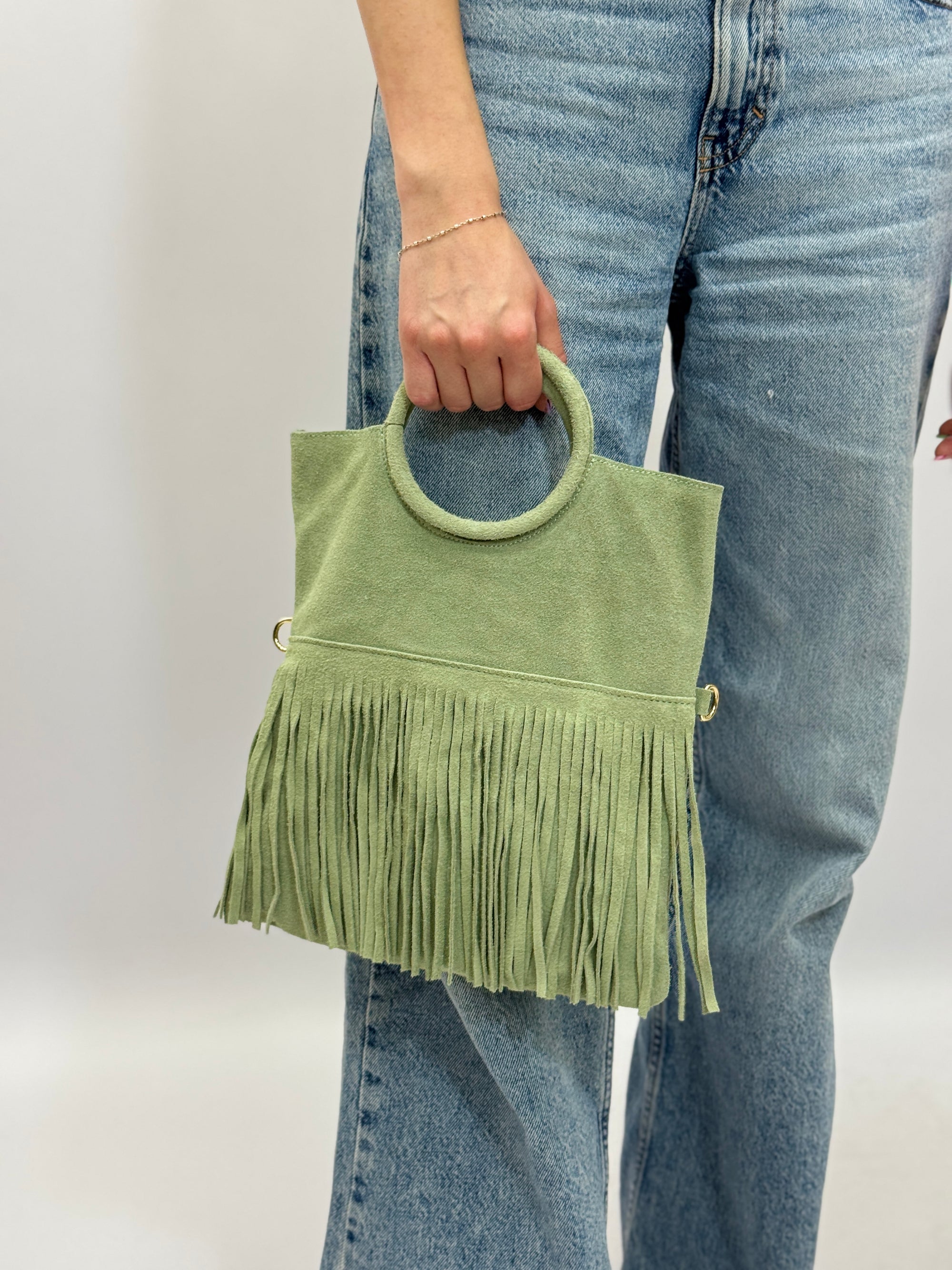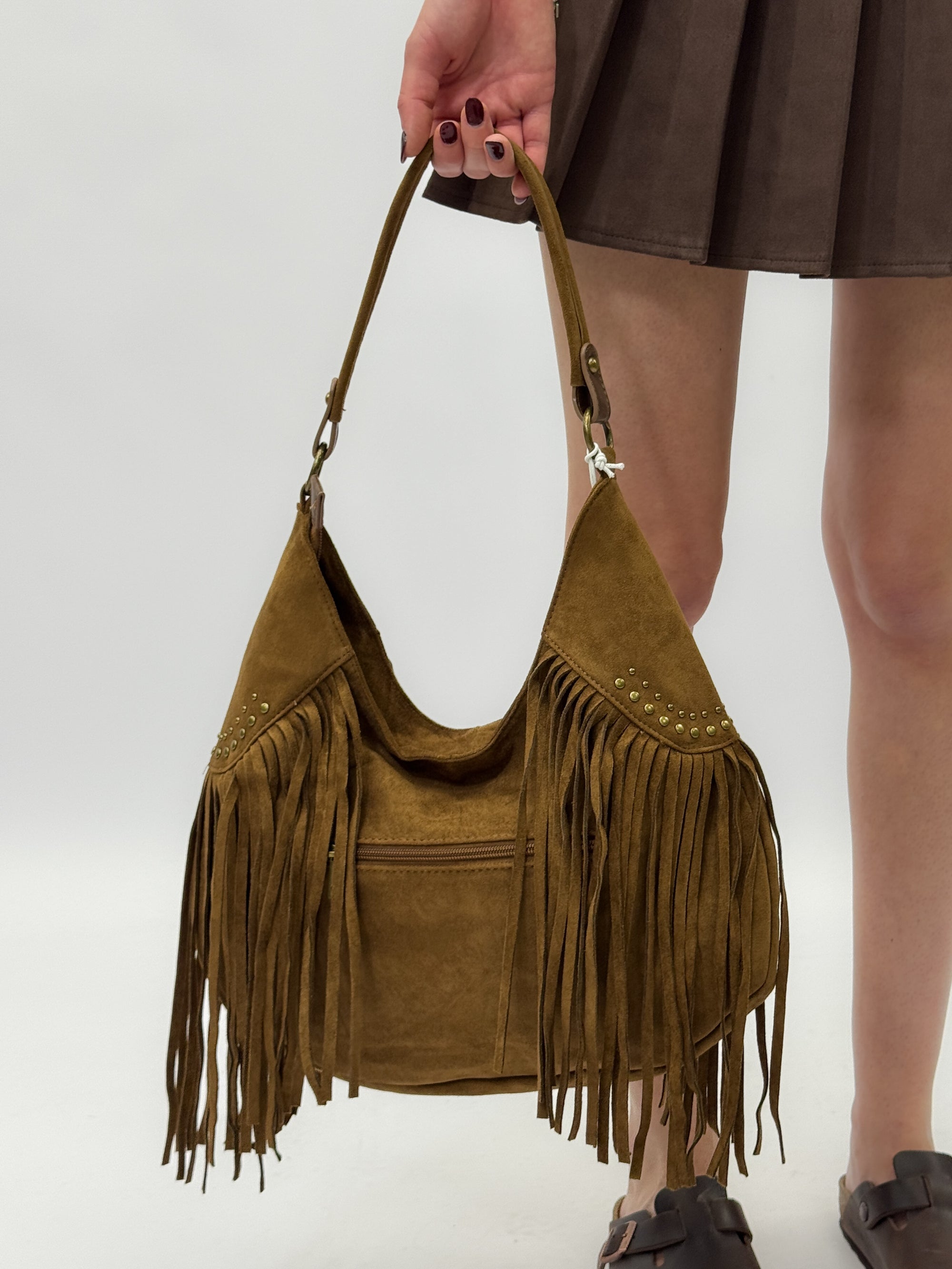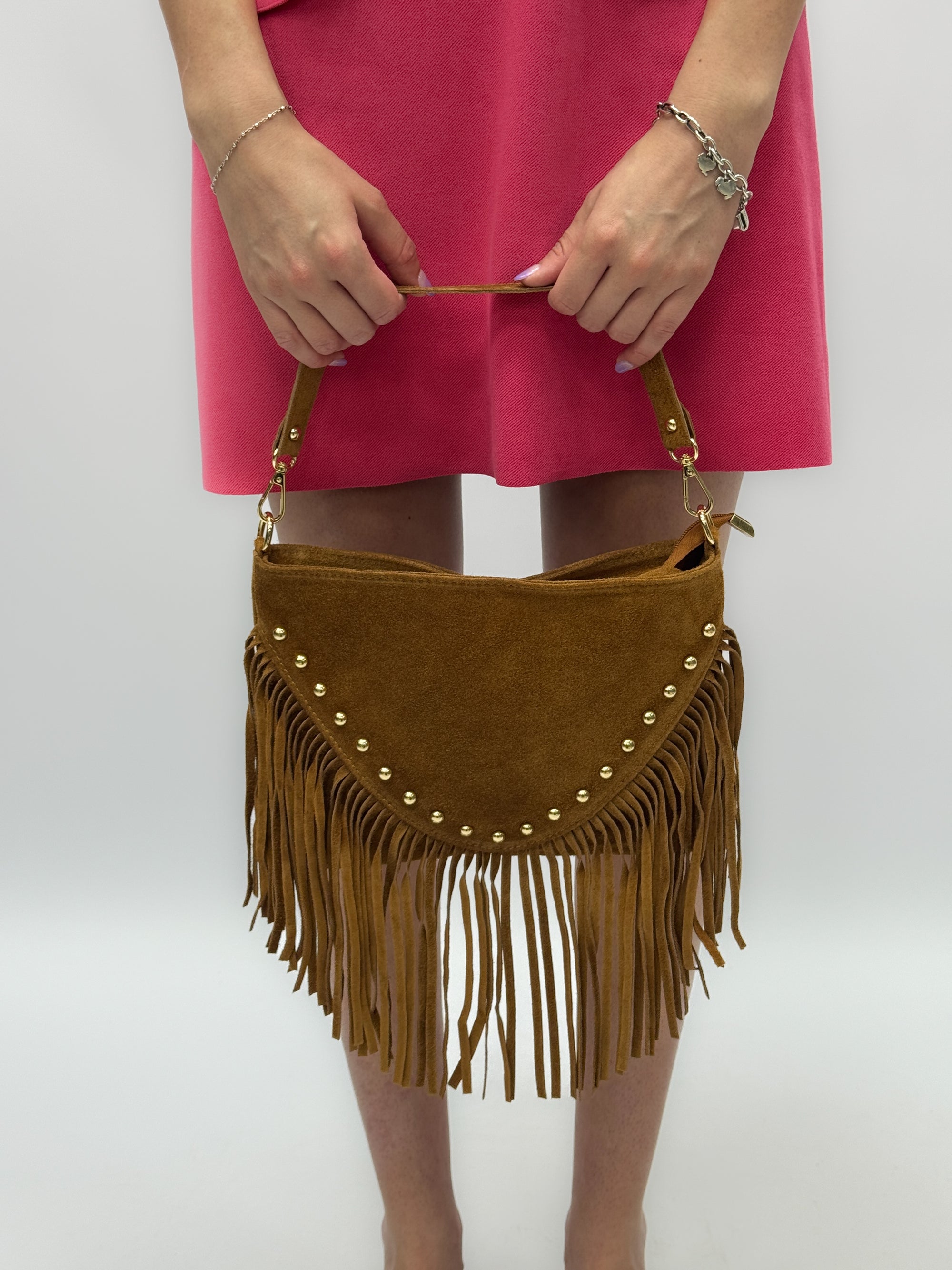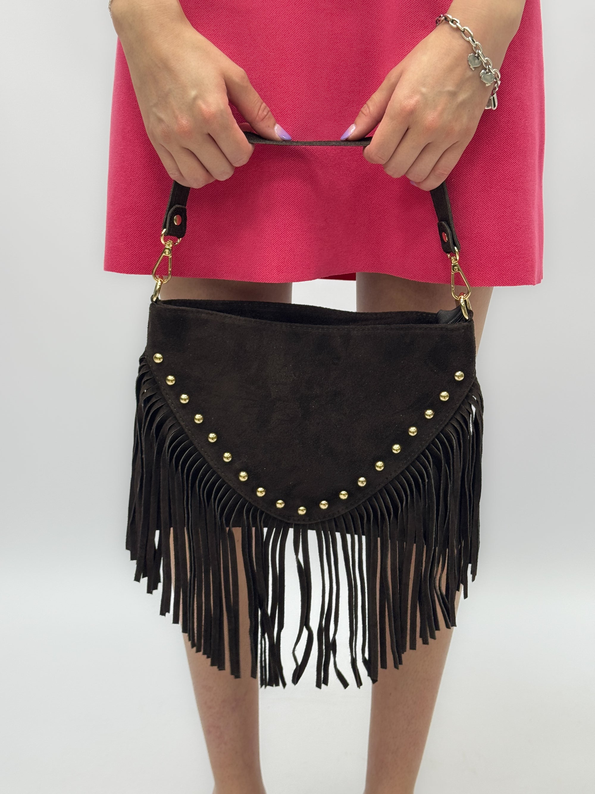 Borsa a mano in vera pelle scamosciata con frange e borchiette – Made in Italy