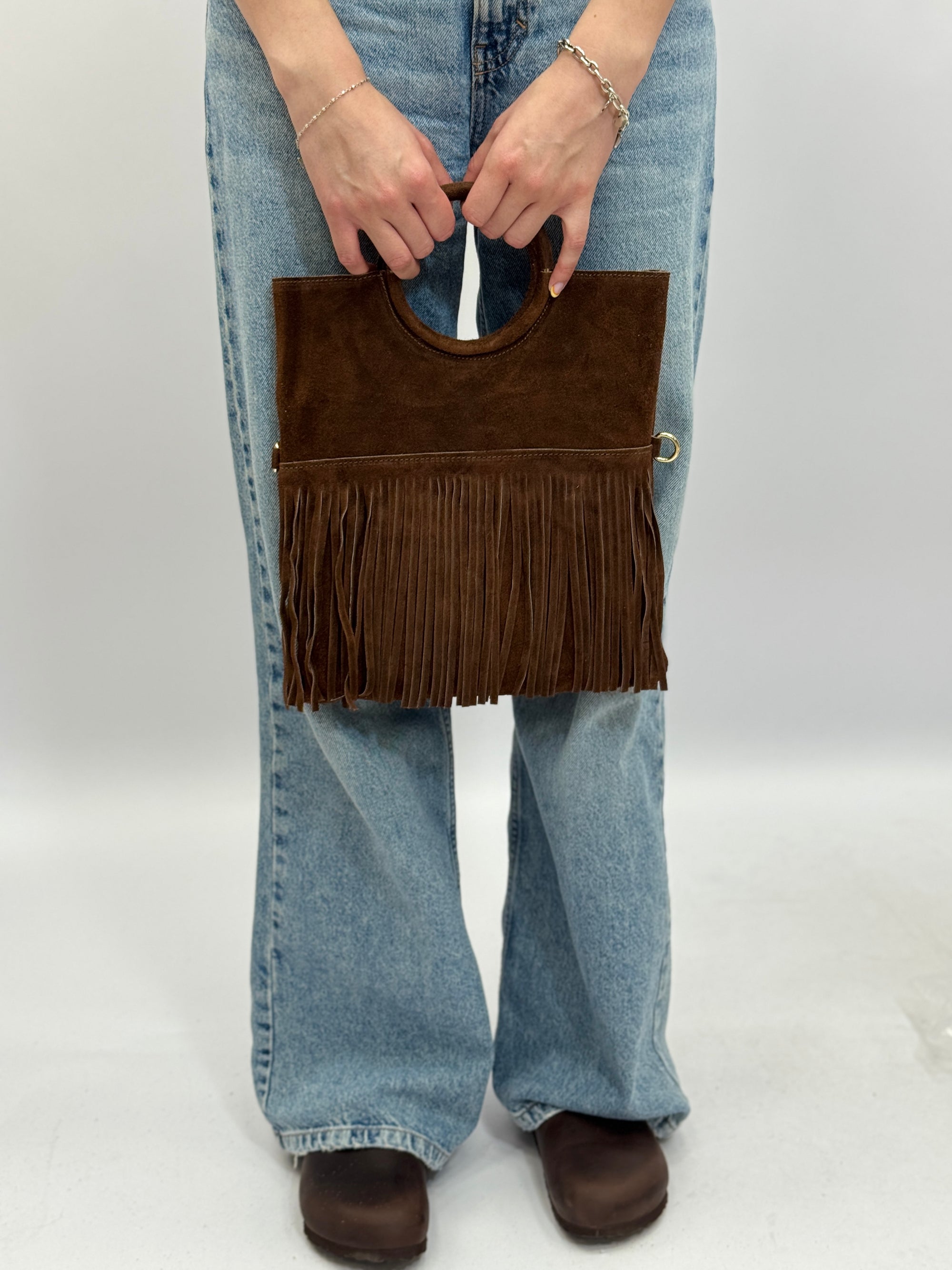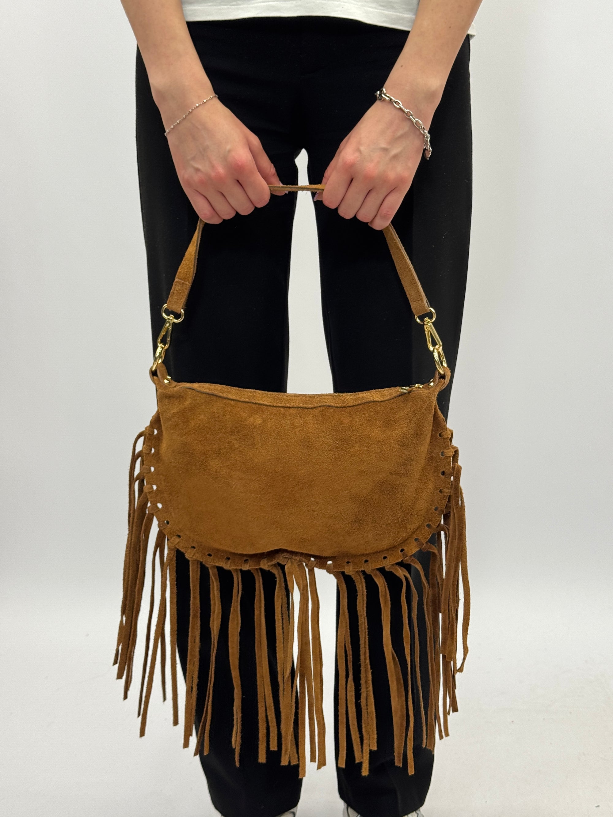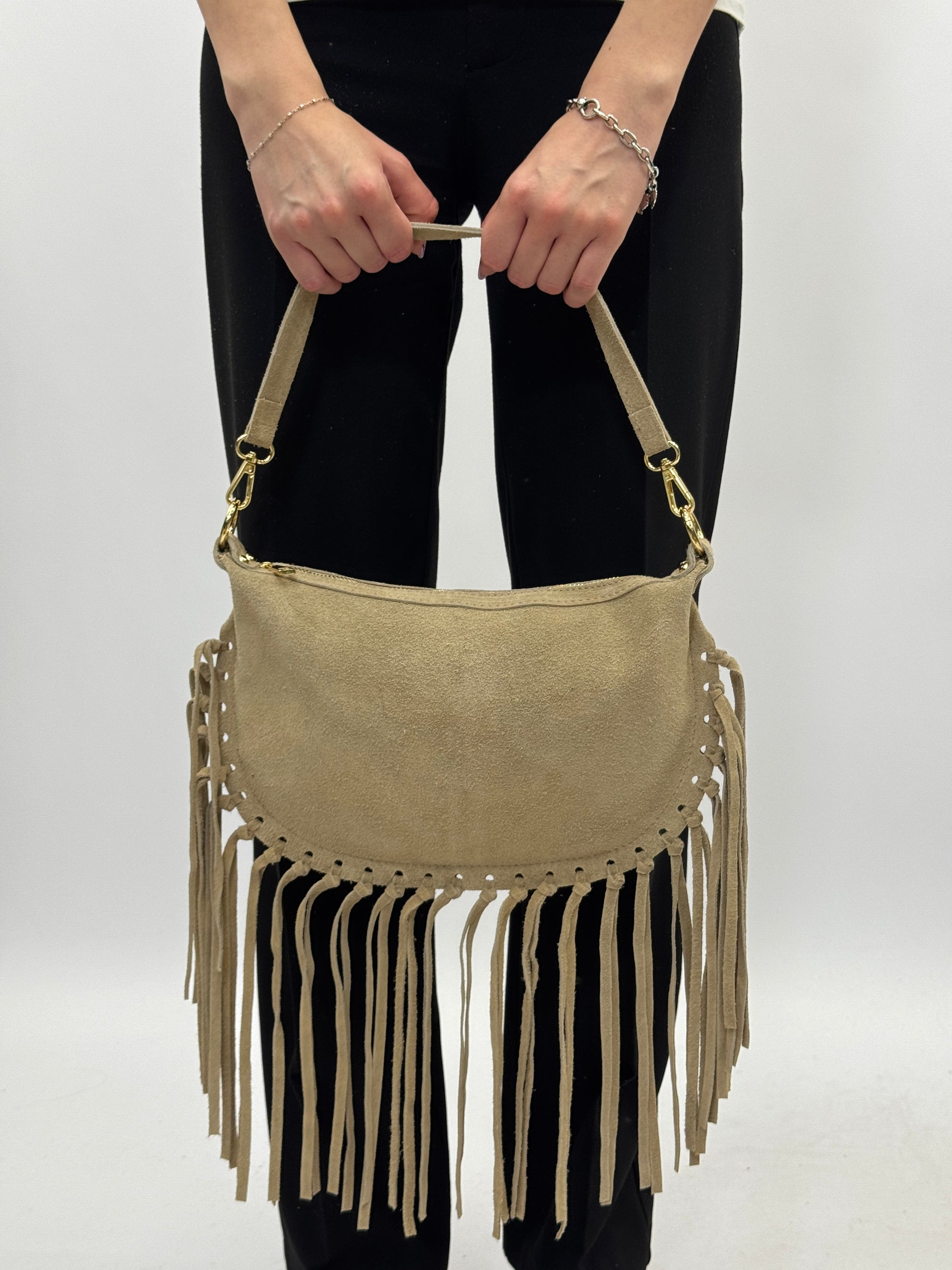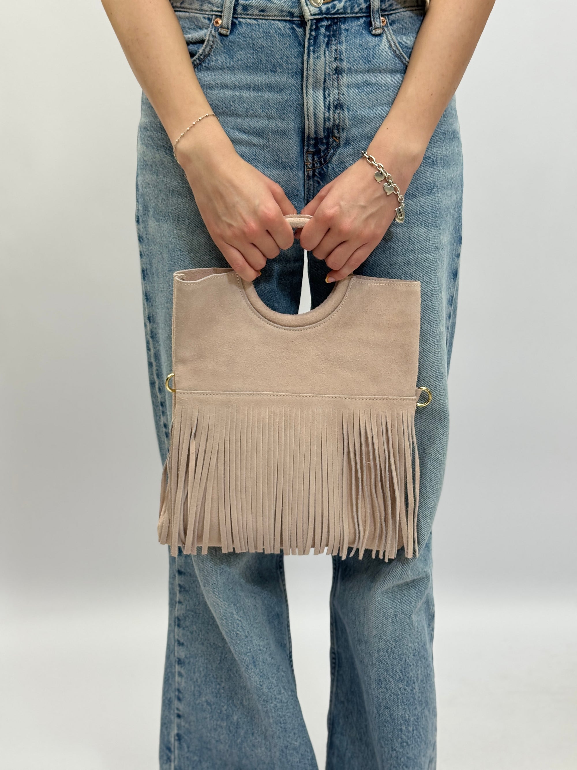 Borsa a mano in vera pelle scamosciata con frange e borchiette – Made in Italy