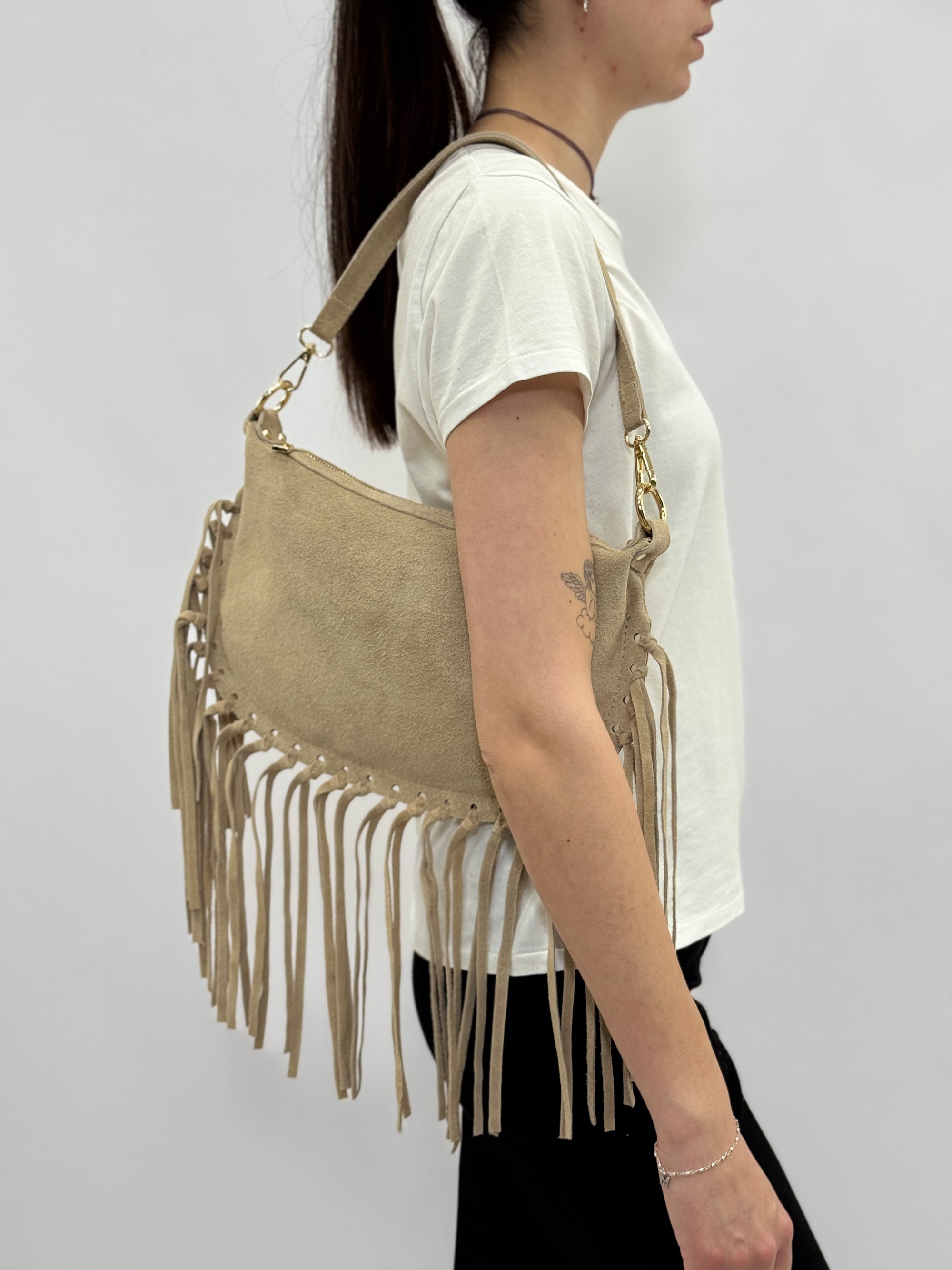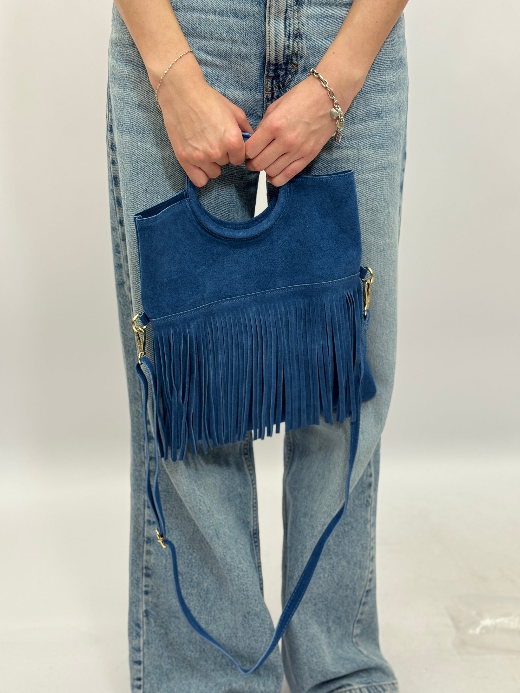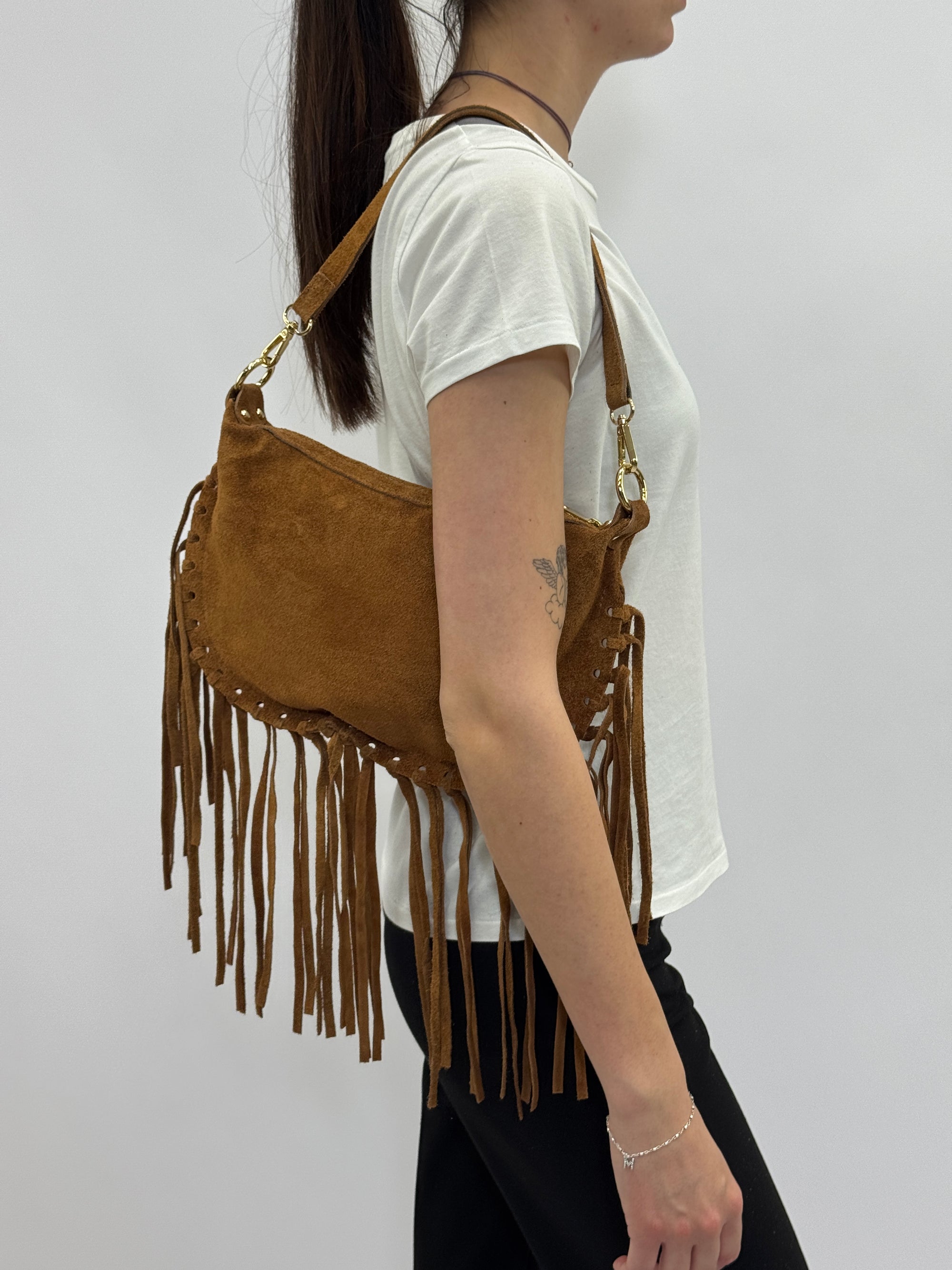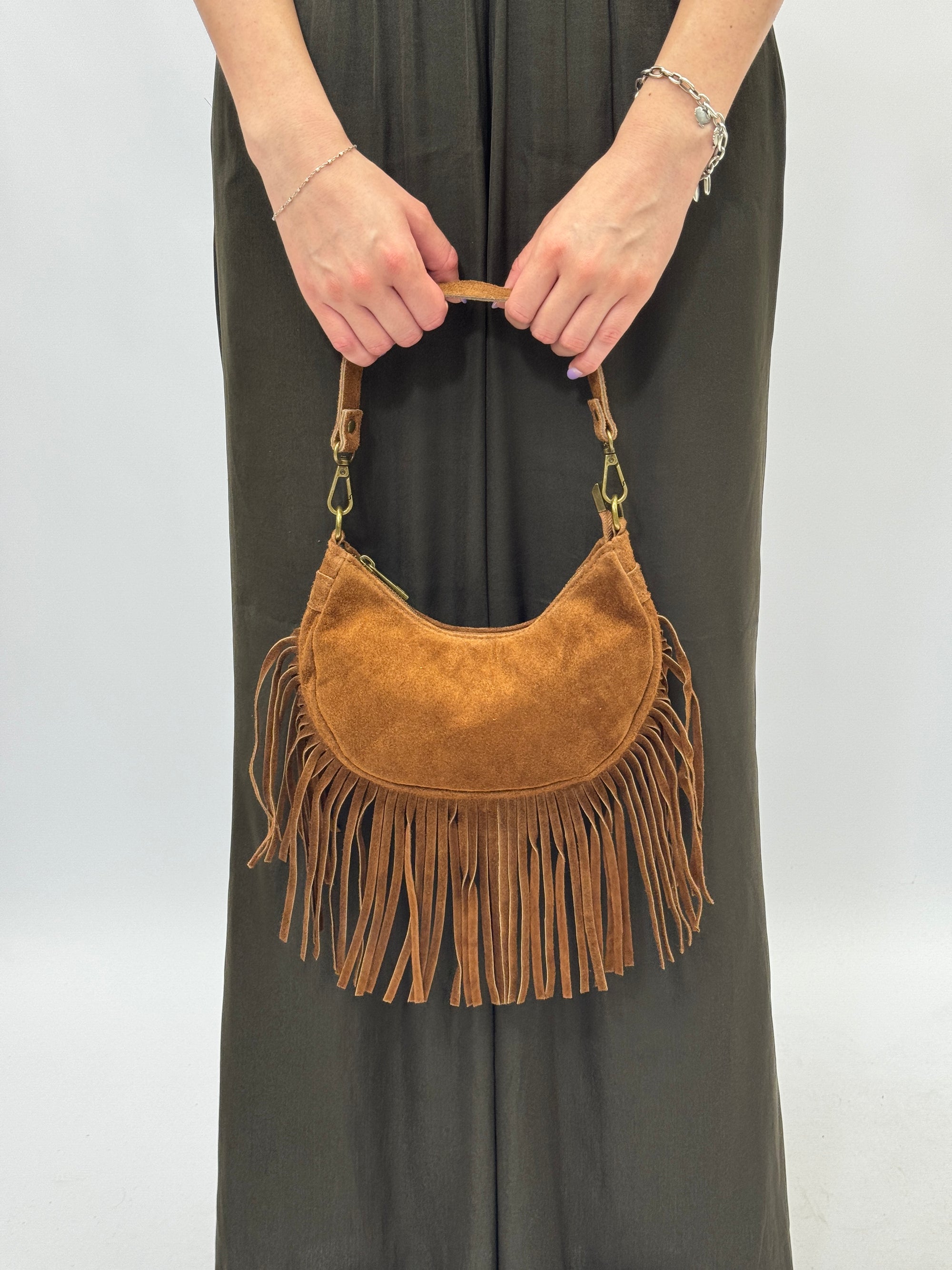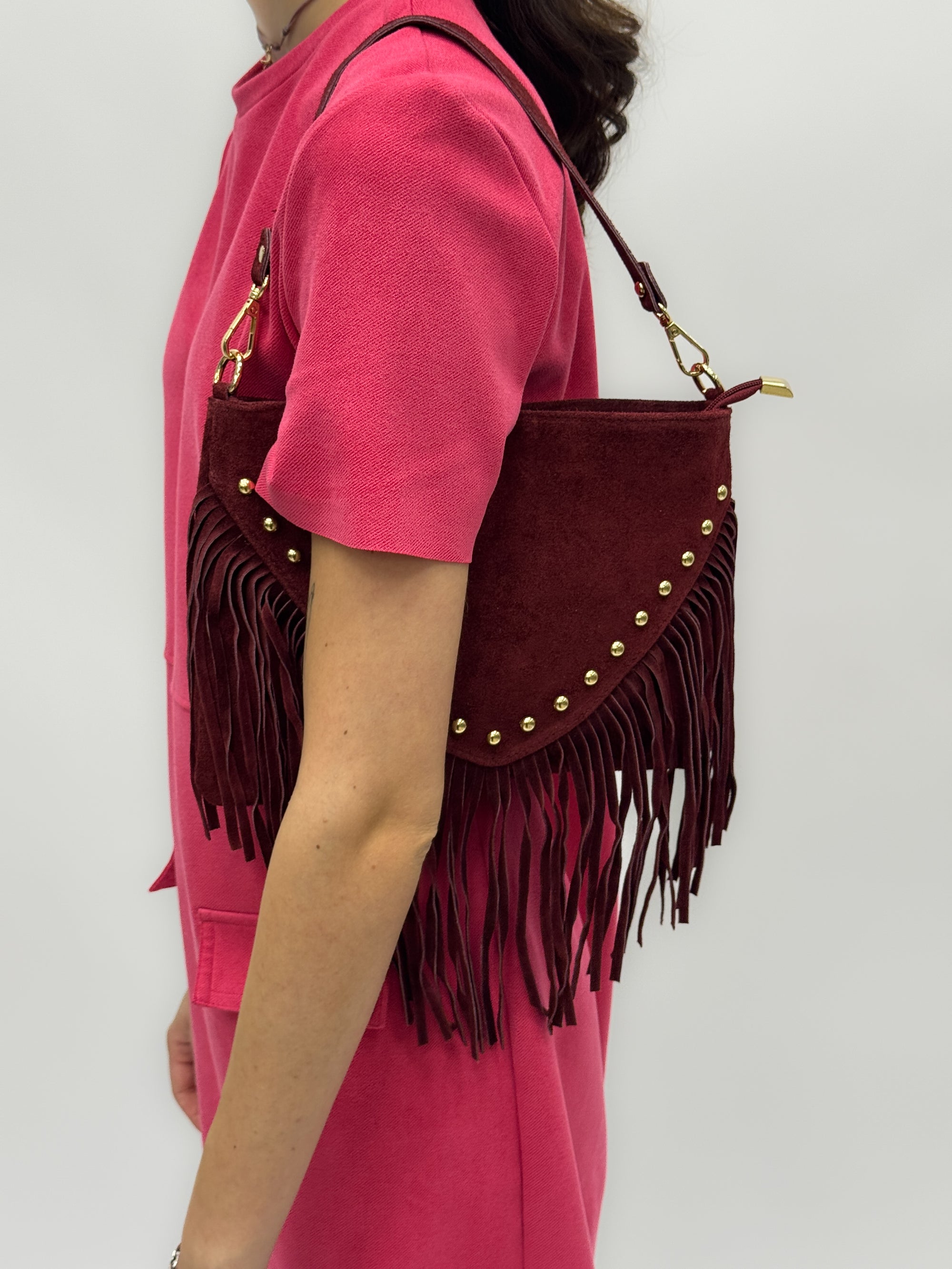 Borsa a mano in vera pelle scamosciata con frange e borchiette – Made in Italy