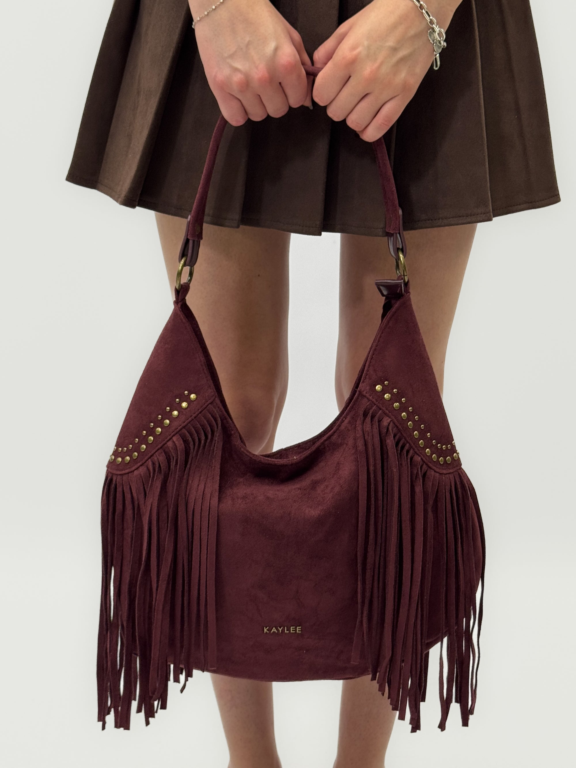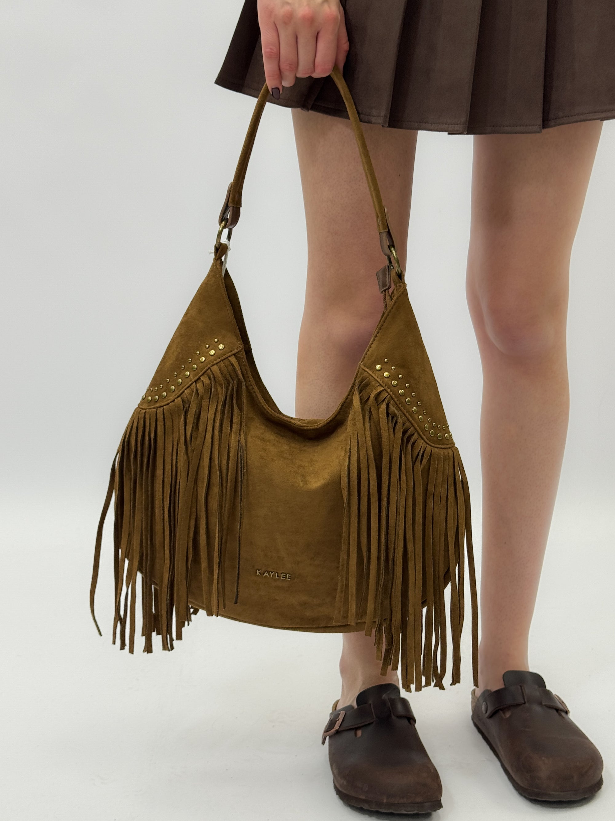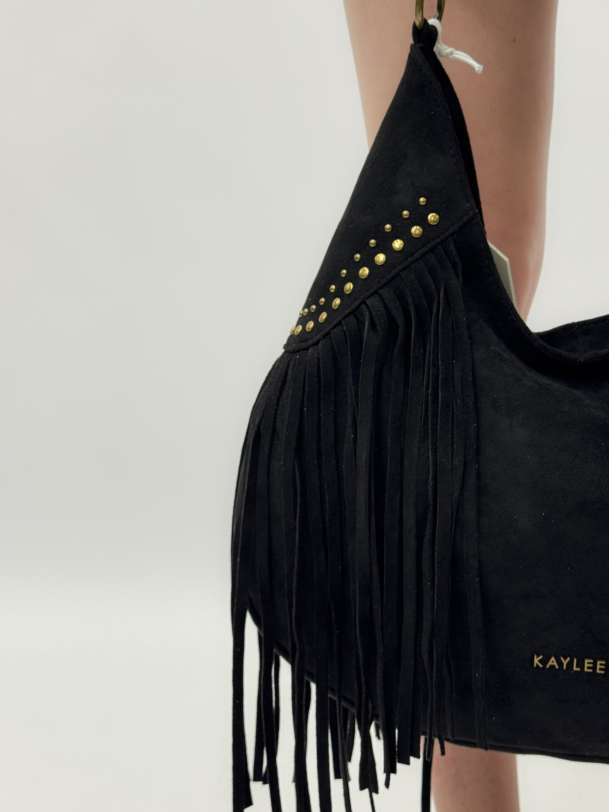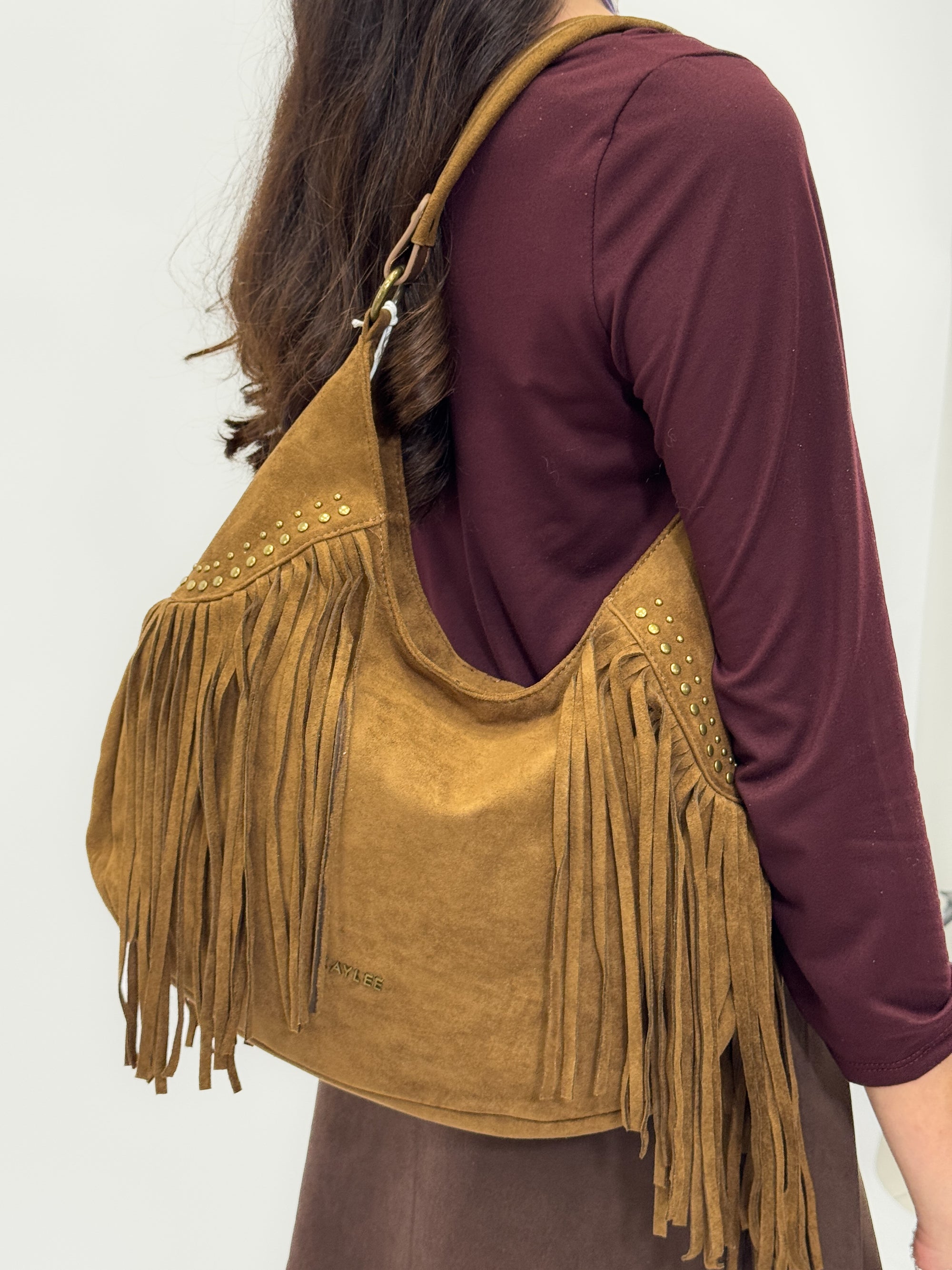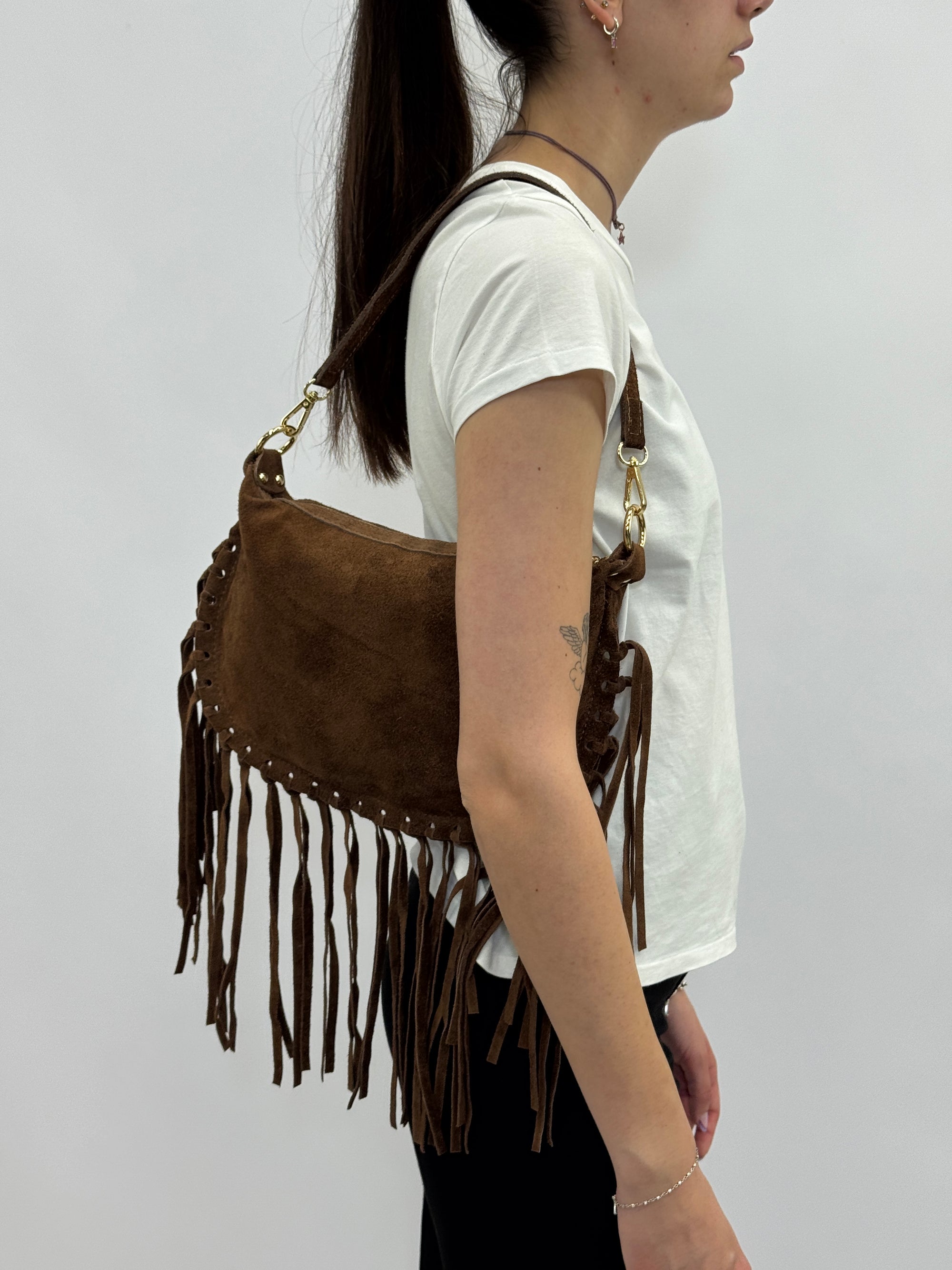 Borsa a mano in vera pelle scamosciata con frange e borchiette – Made in Italy