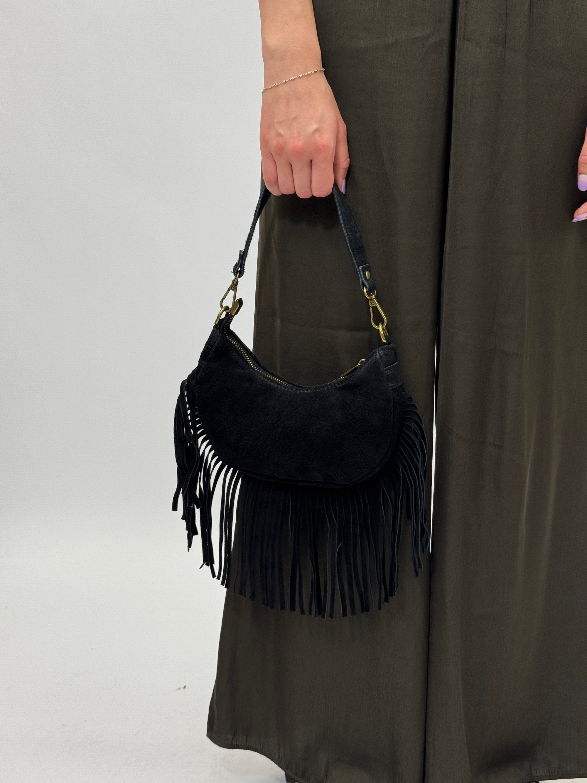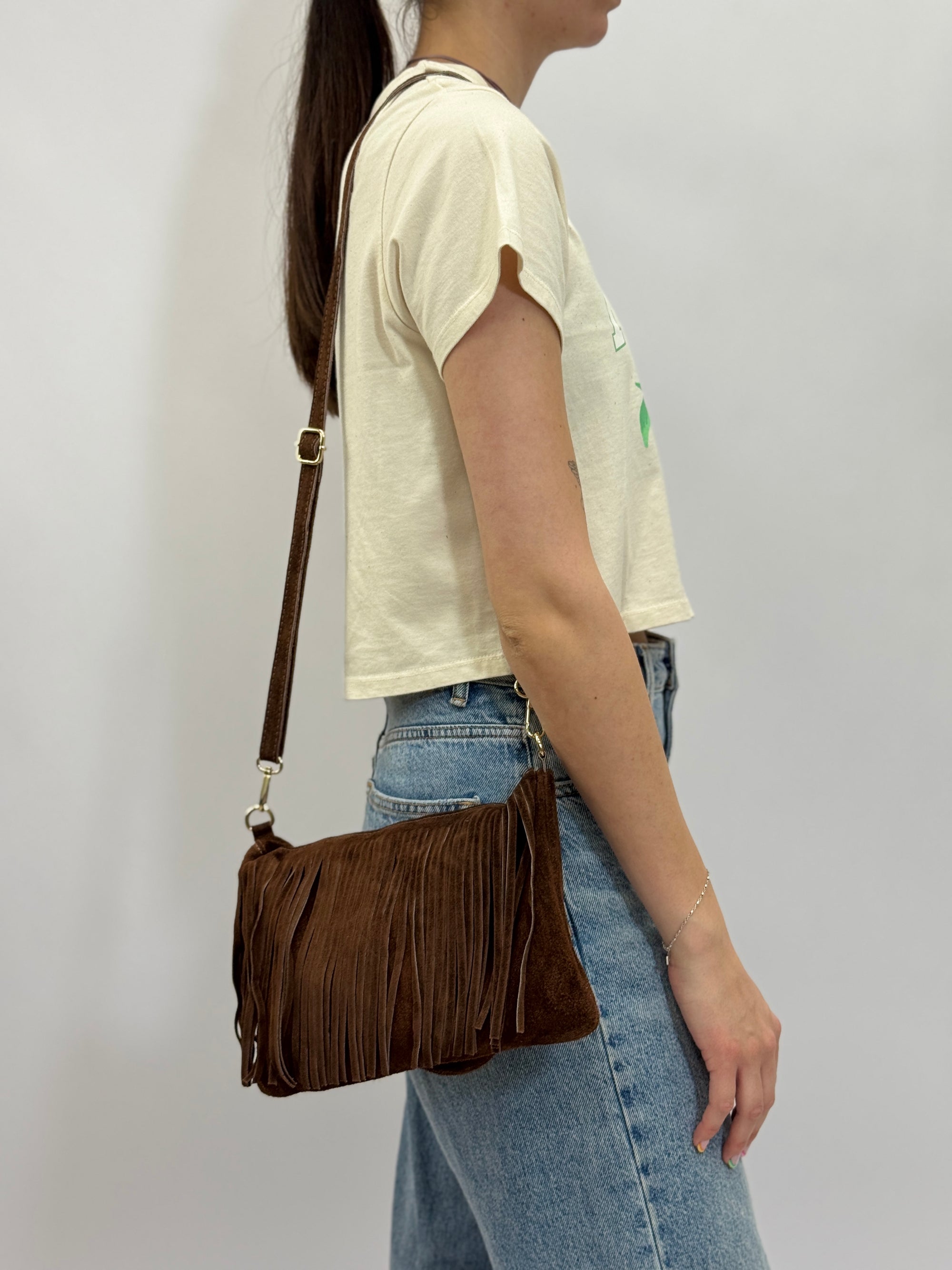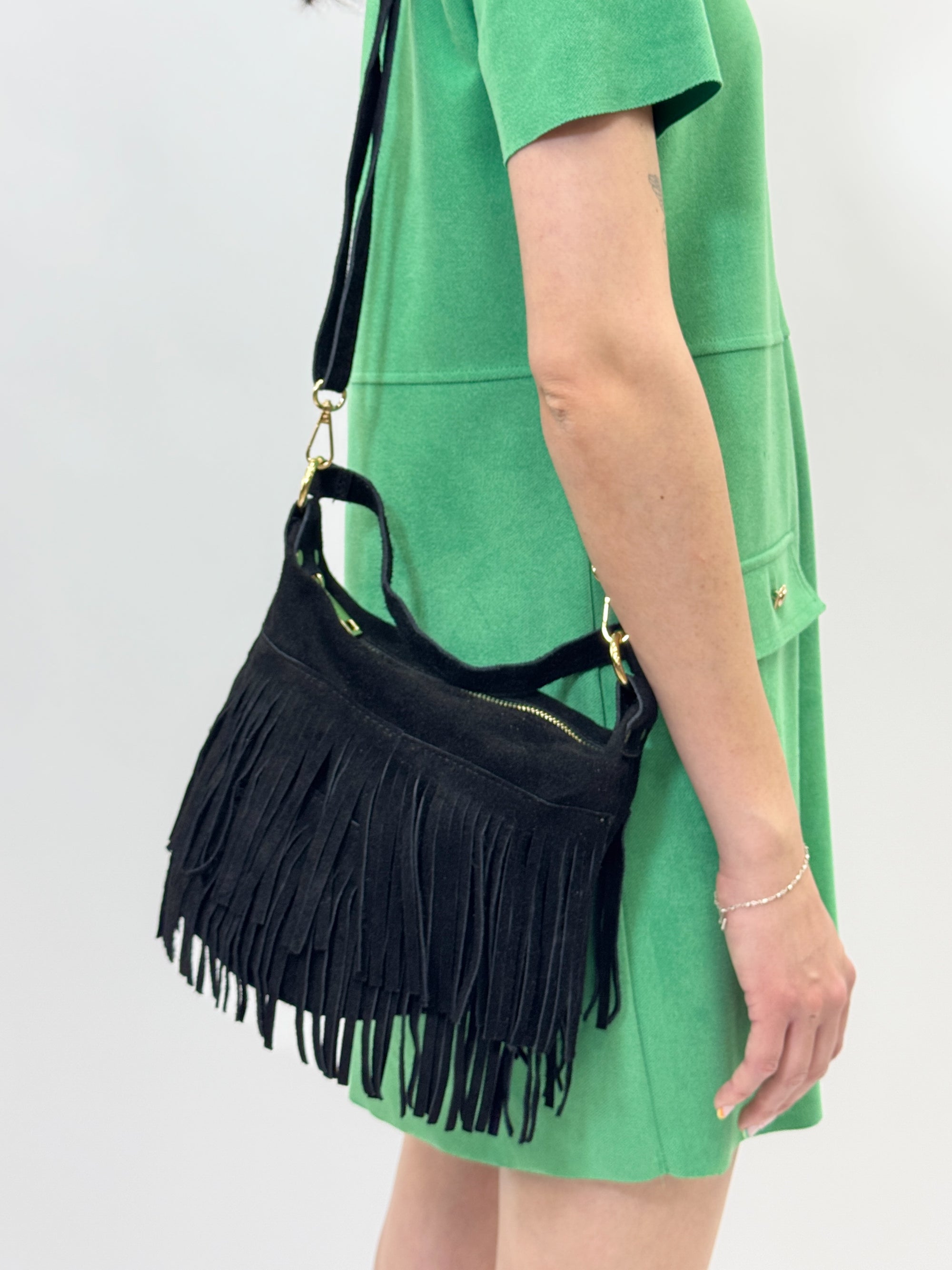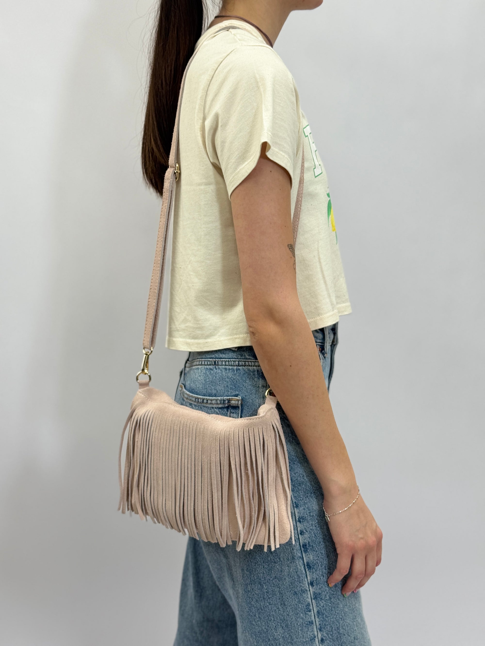 Borsa mini in vera pelle scamosciata con frange – Made in Italy