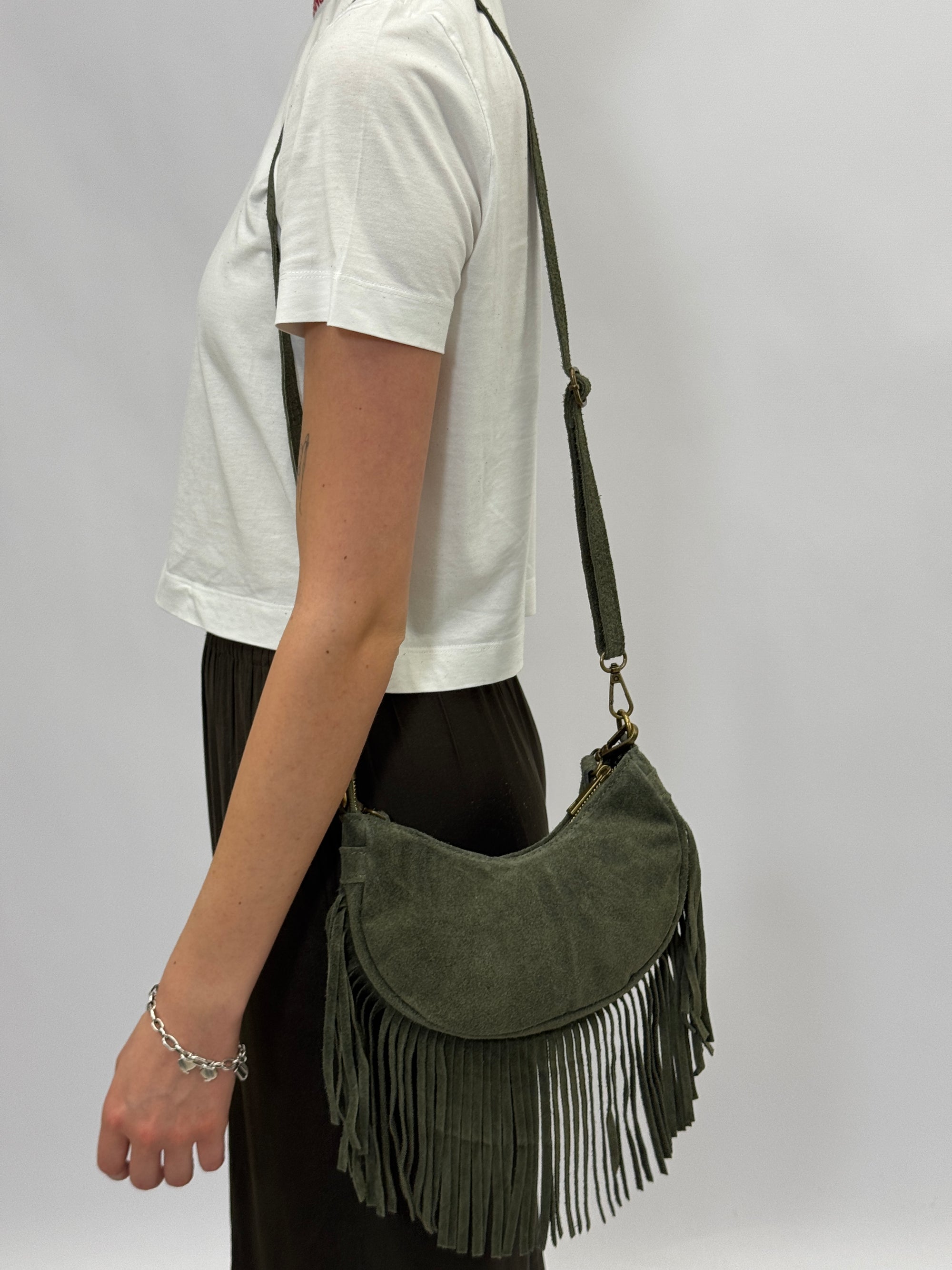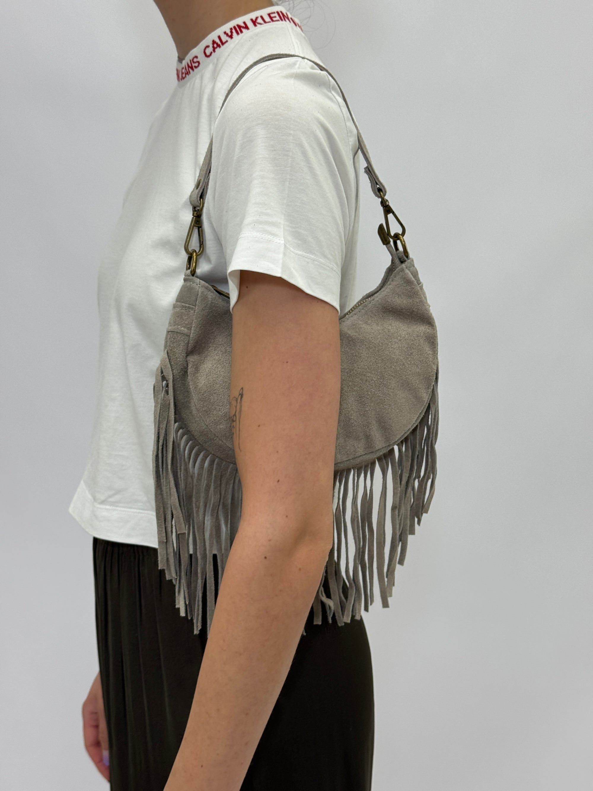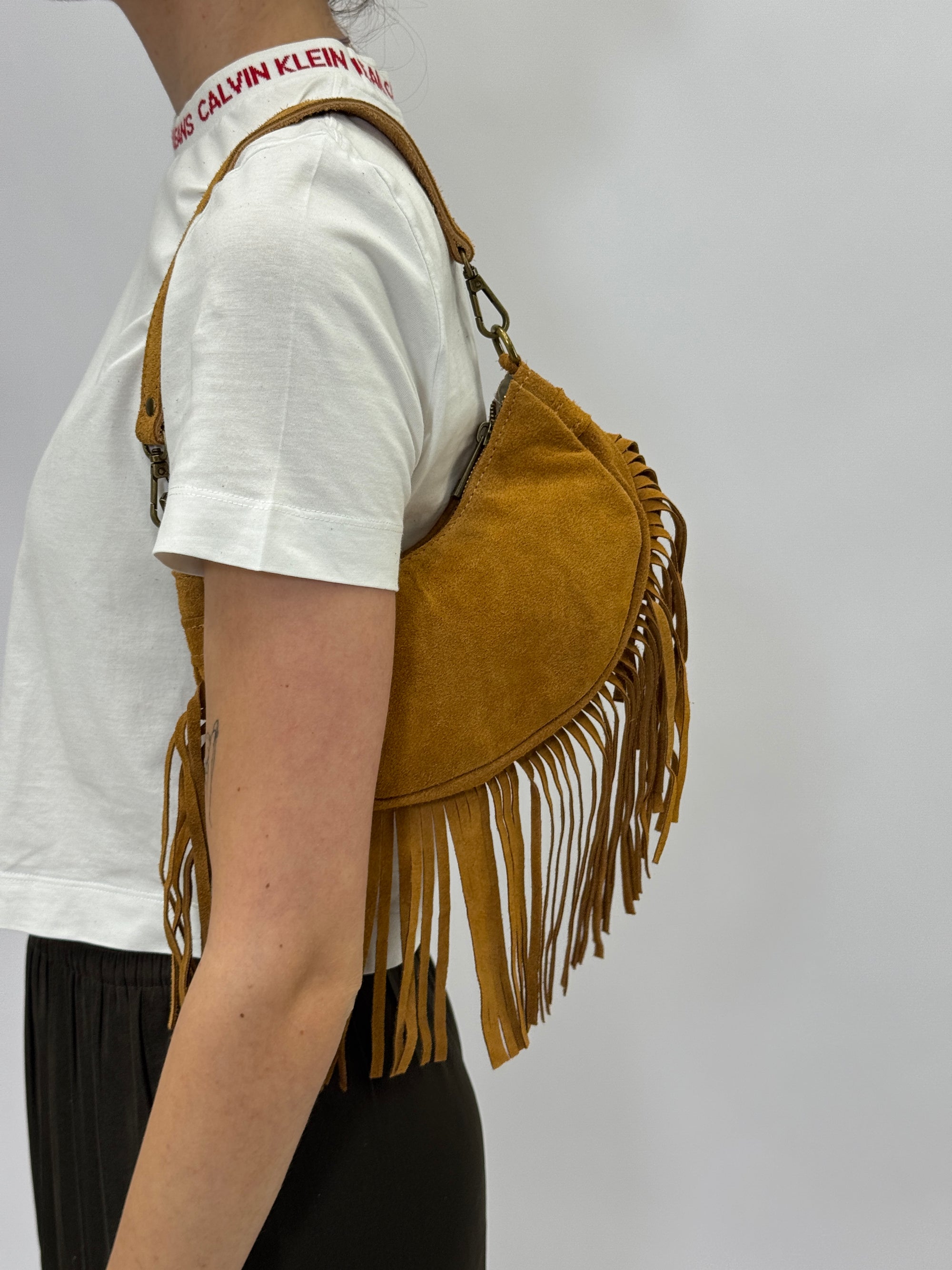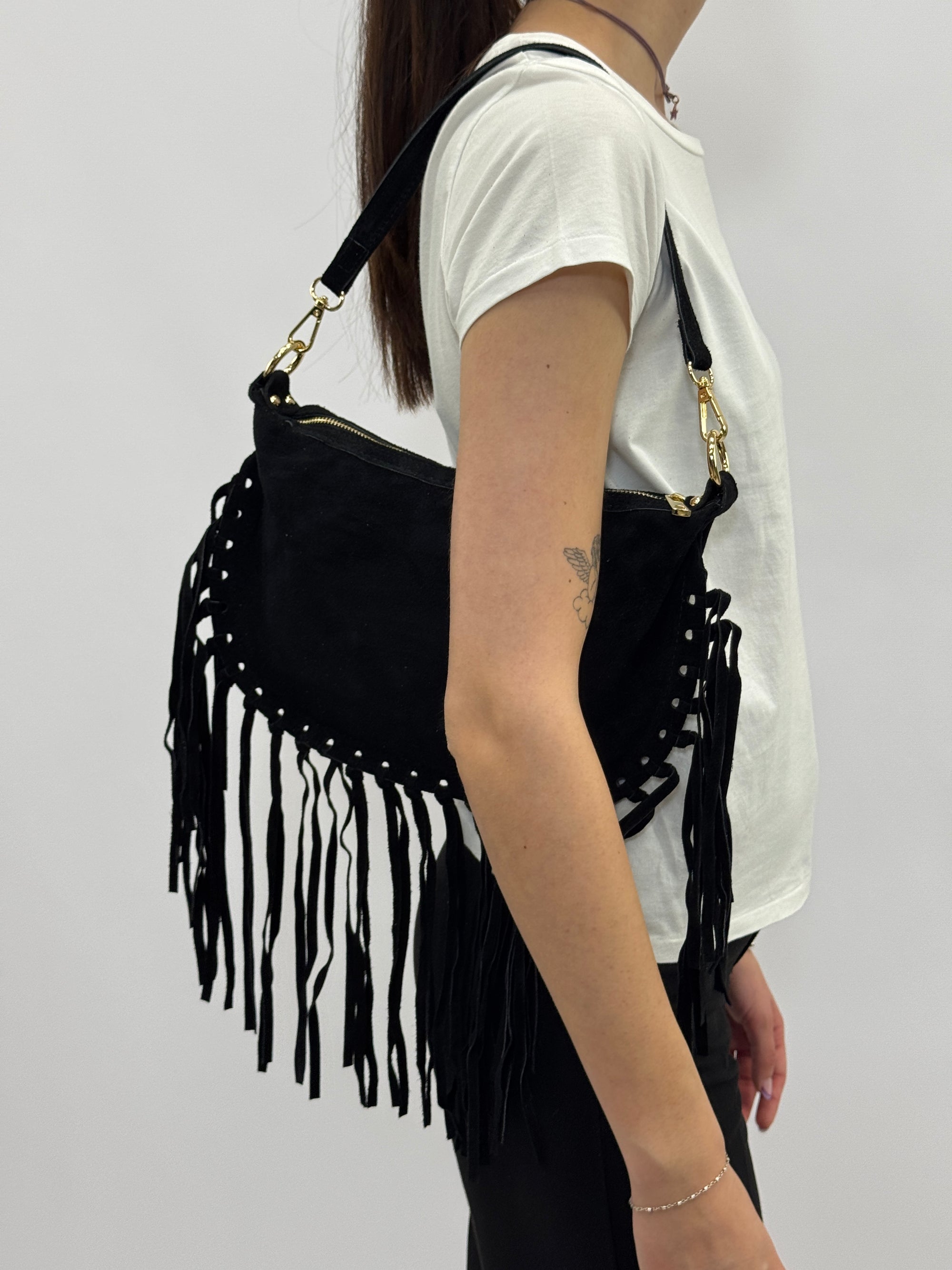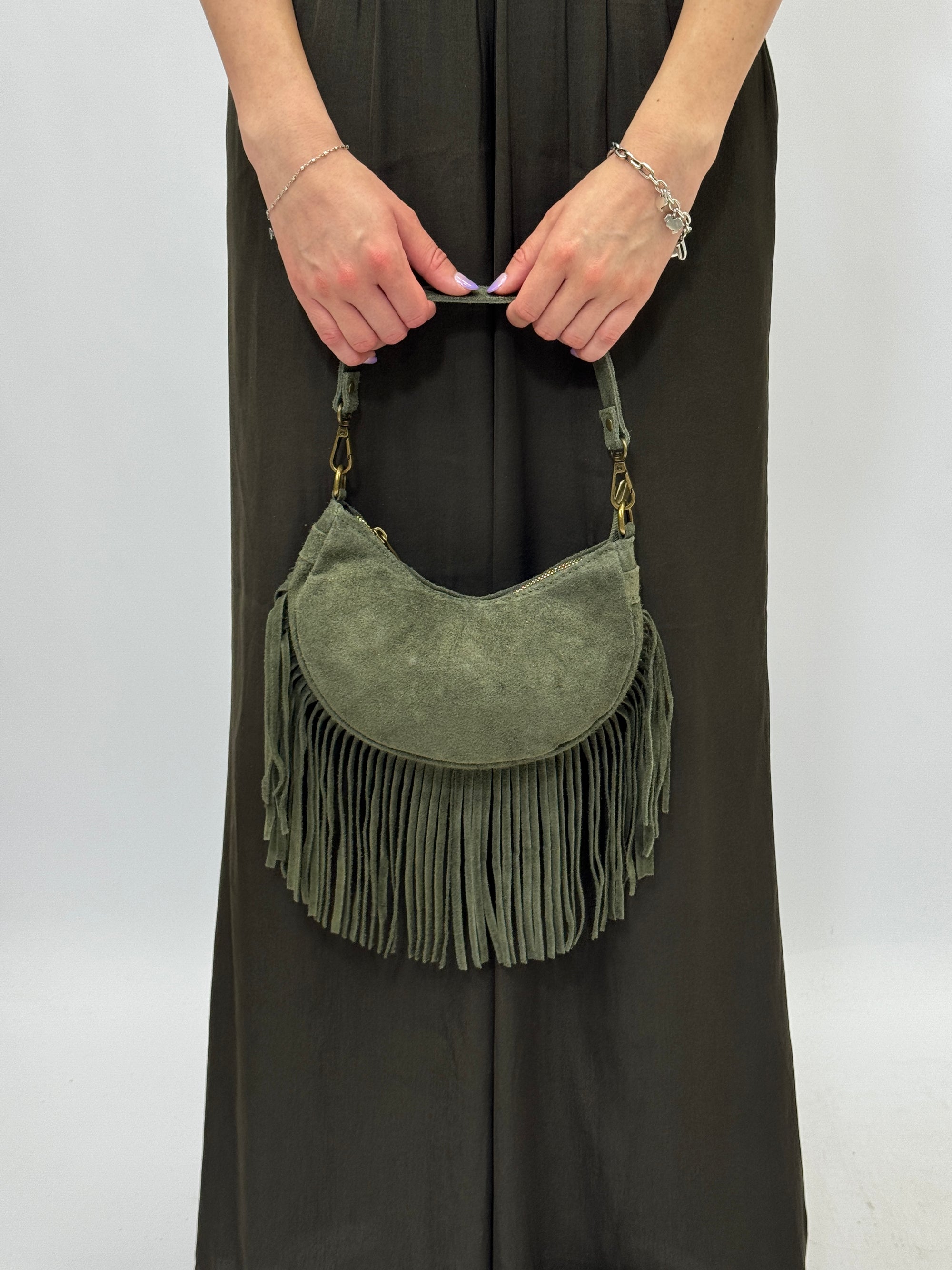 Borsa mini in vera pelle scamosciata con frange – Made in Italy