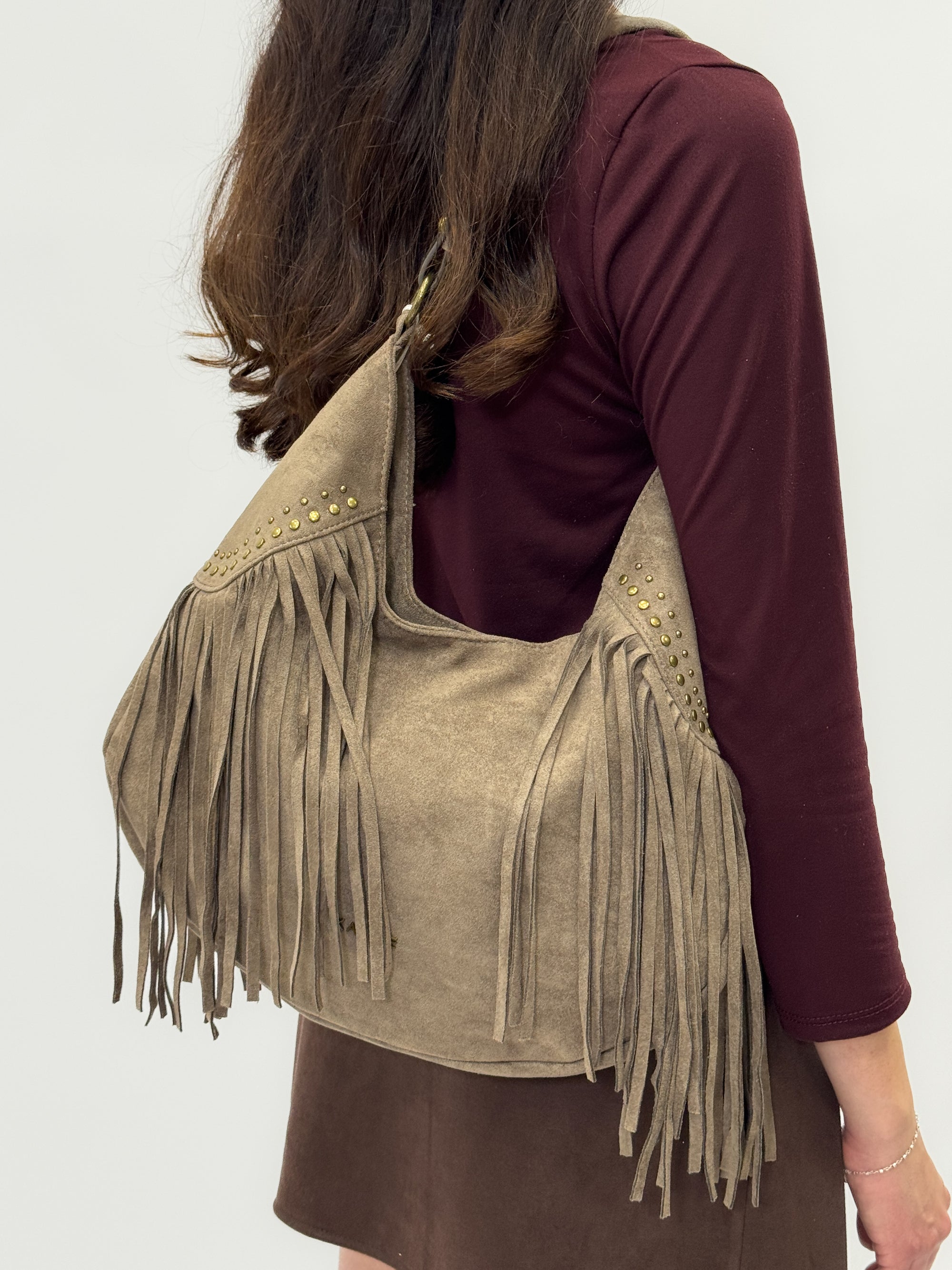 Borsa a spalla in suede con frange e borchie