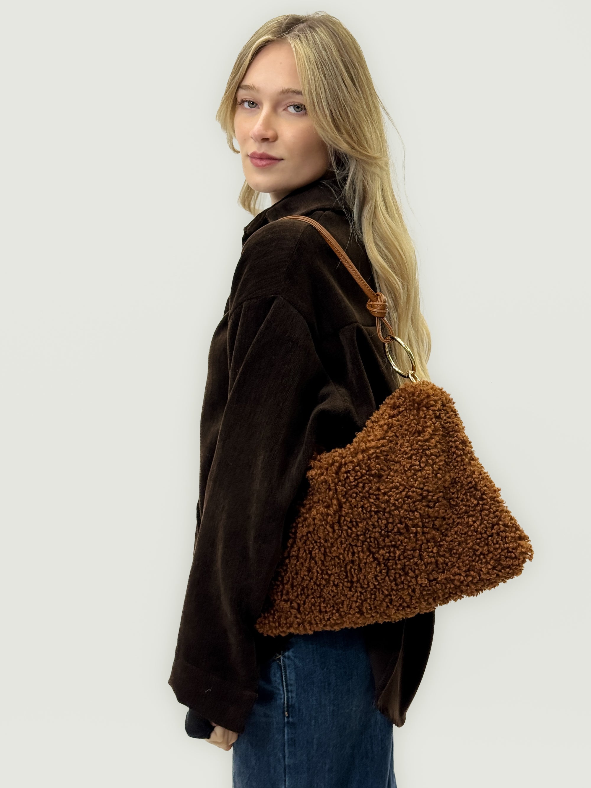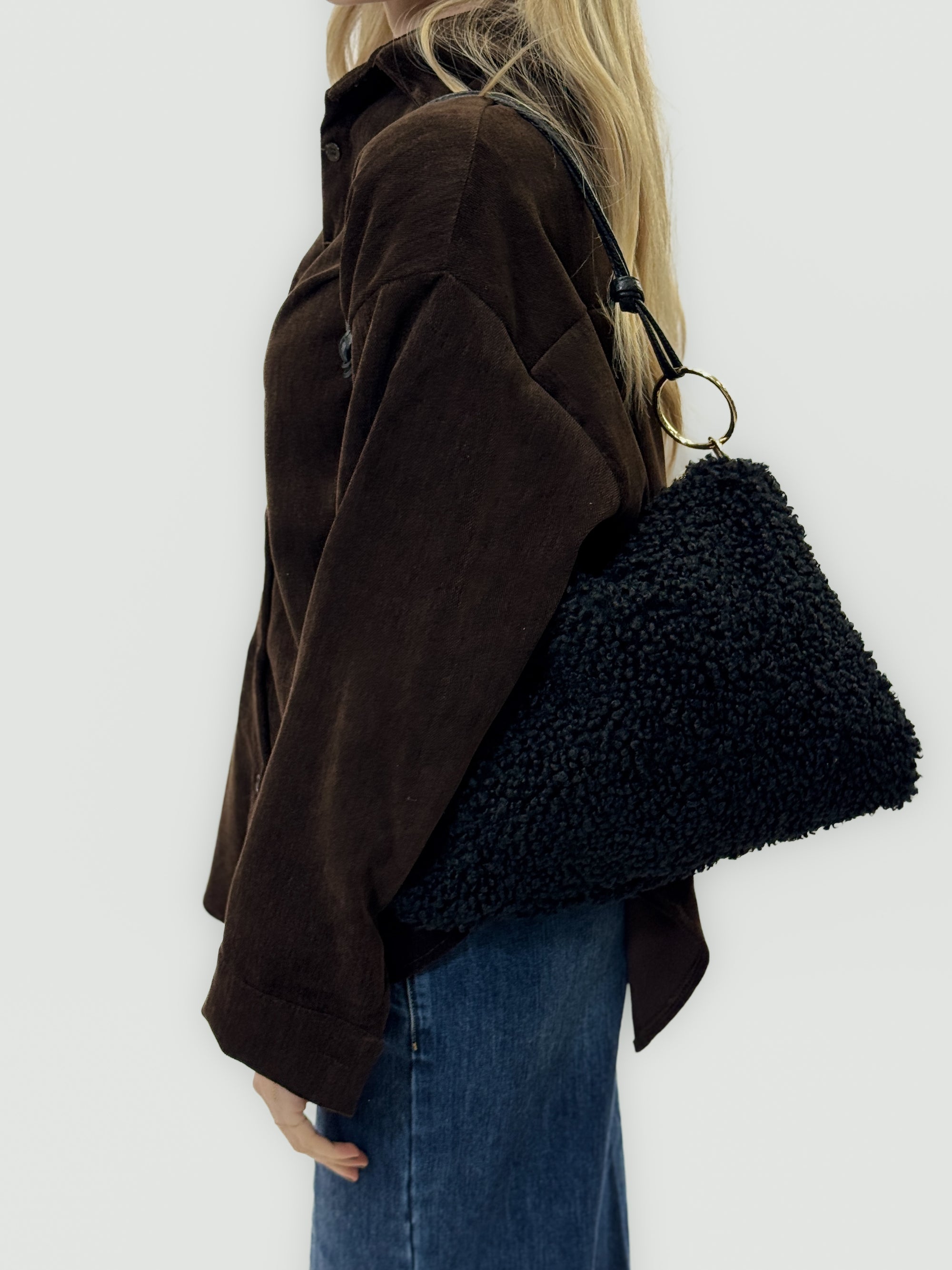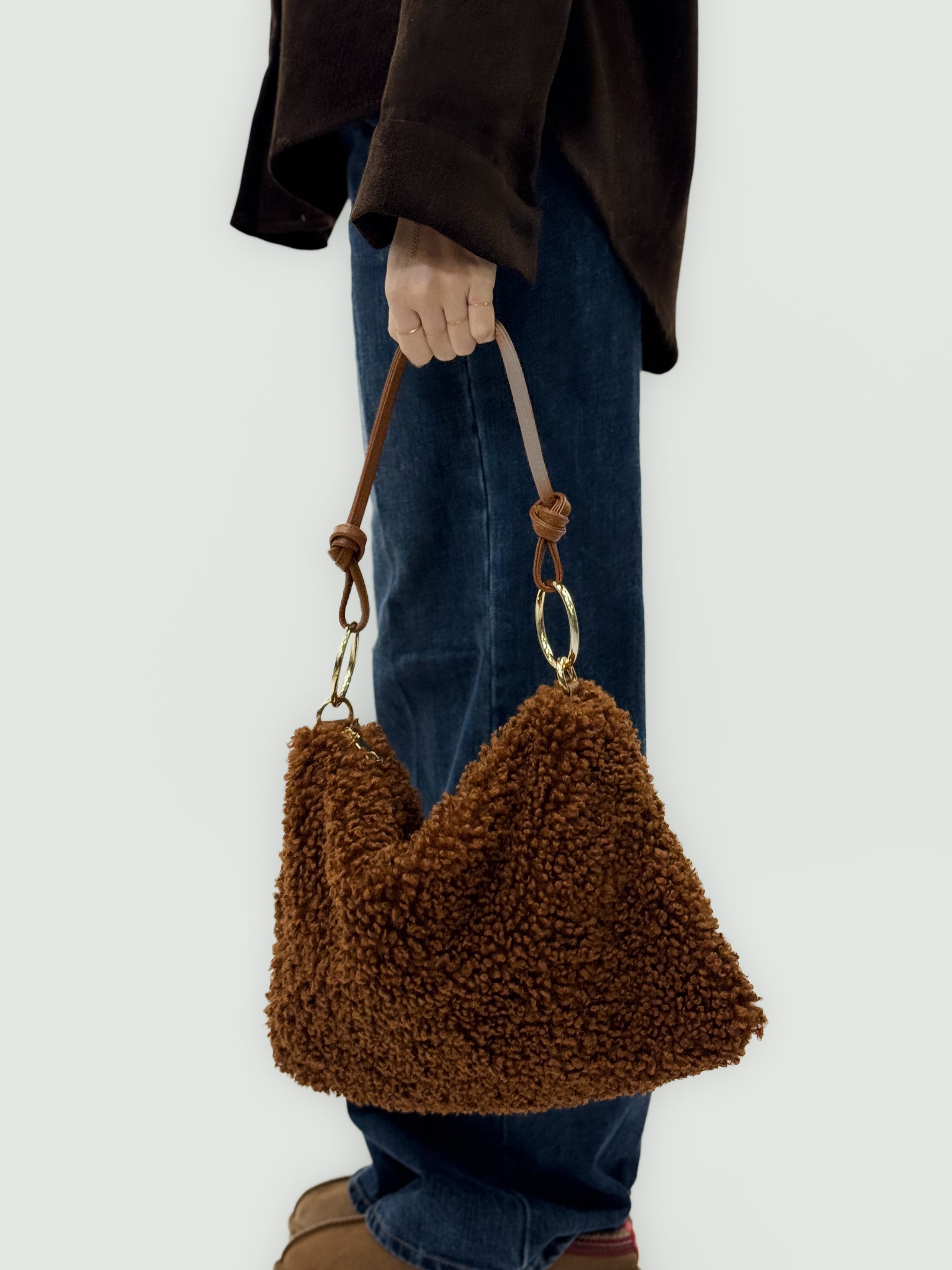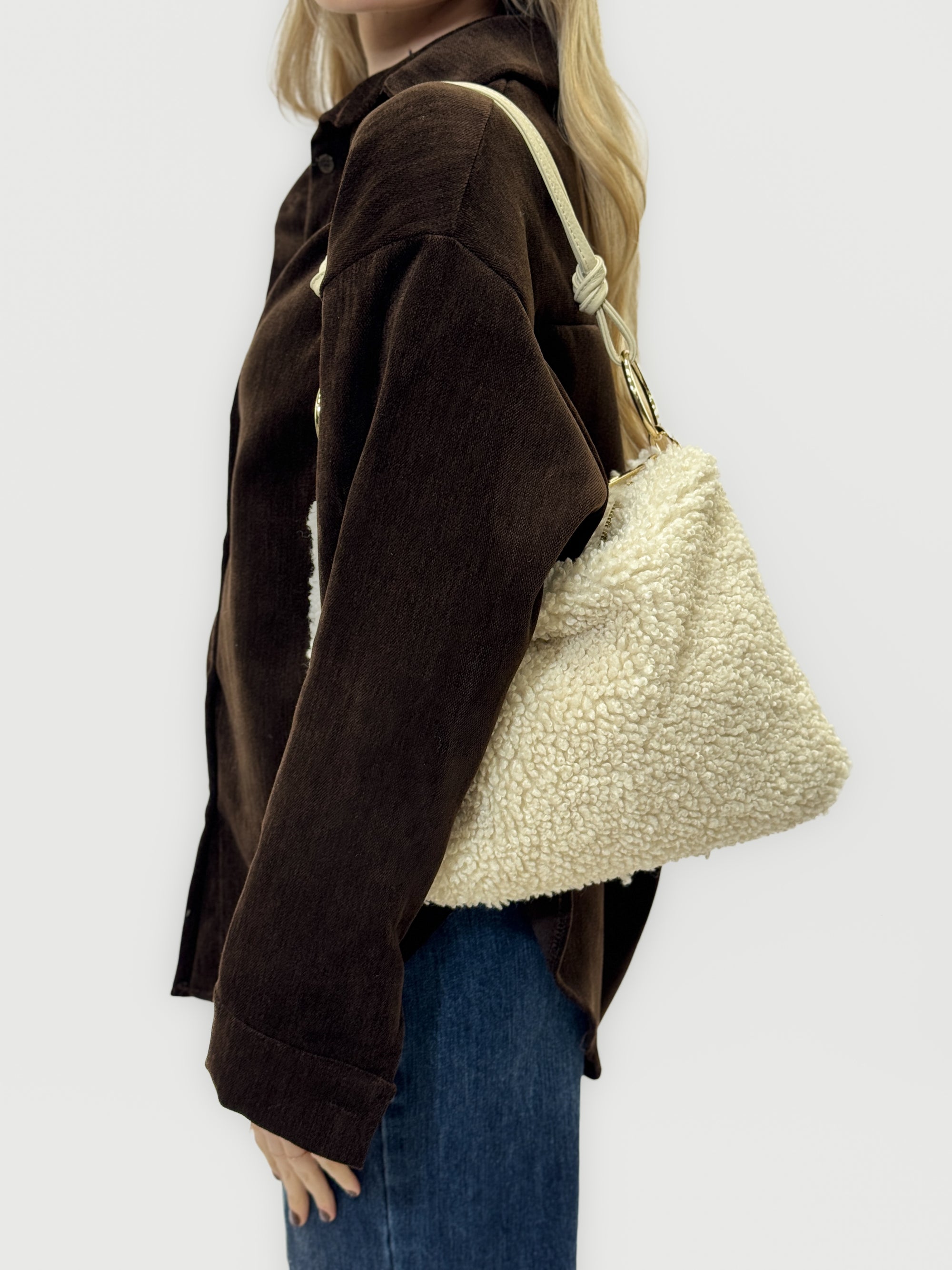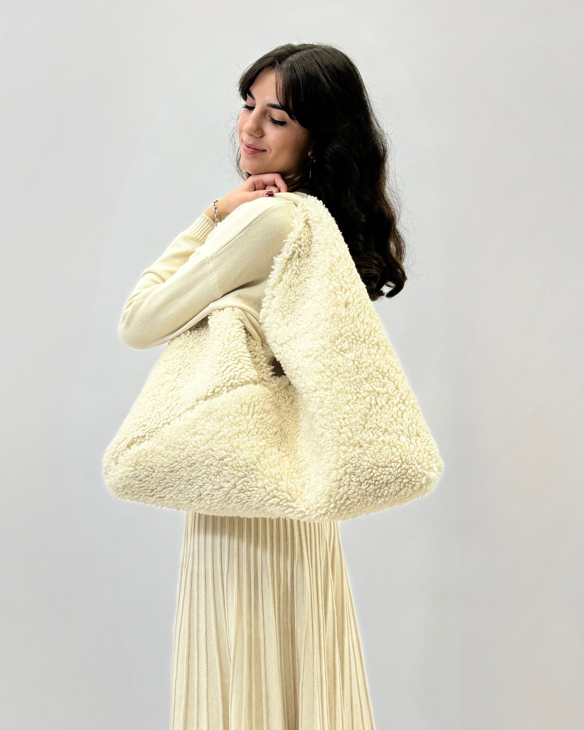 Borsa in pelliccia effetto teddy con manico in pelle – Made in italy