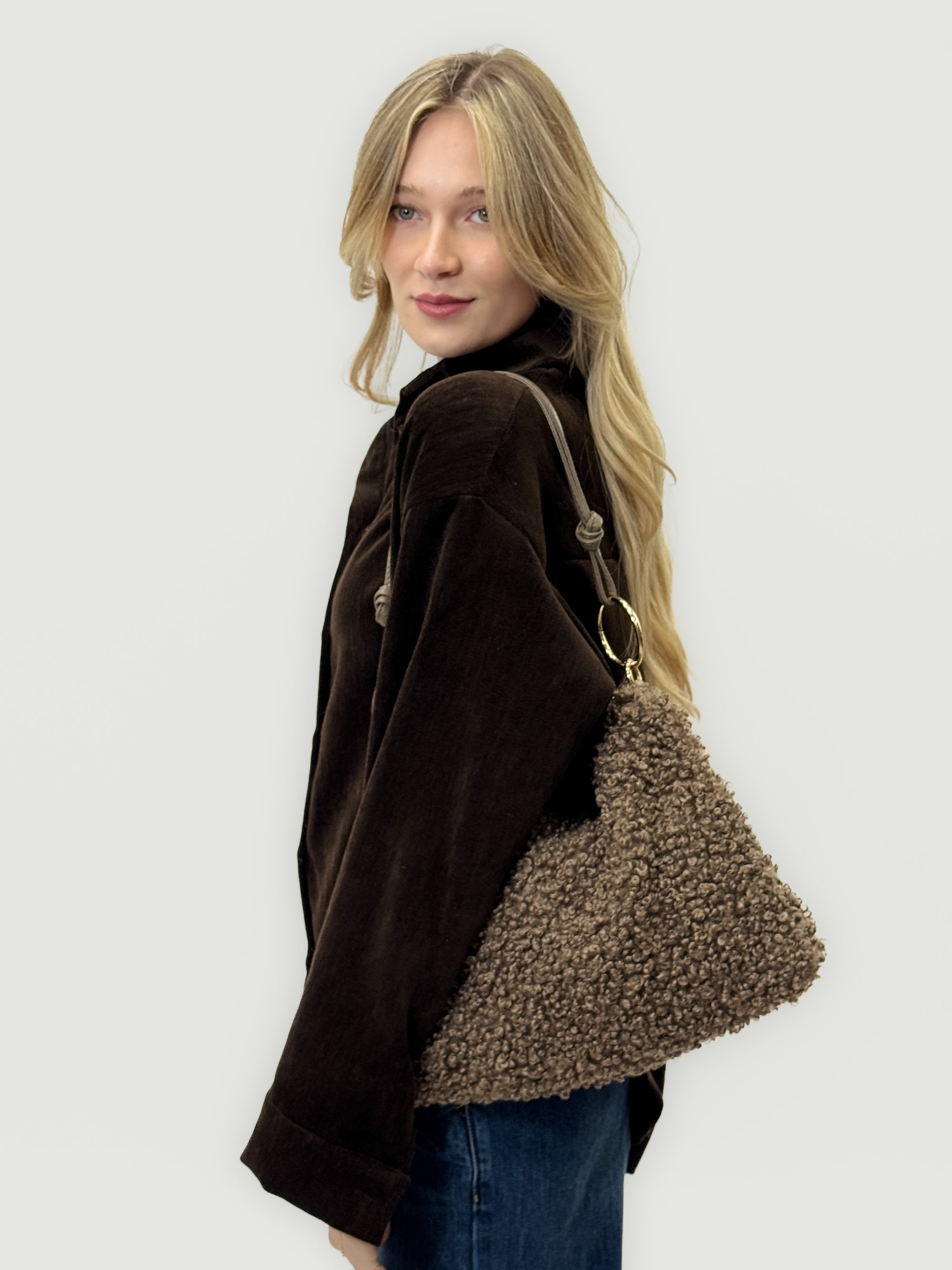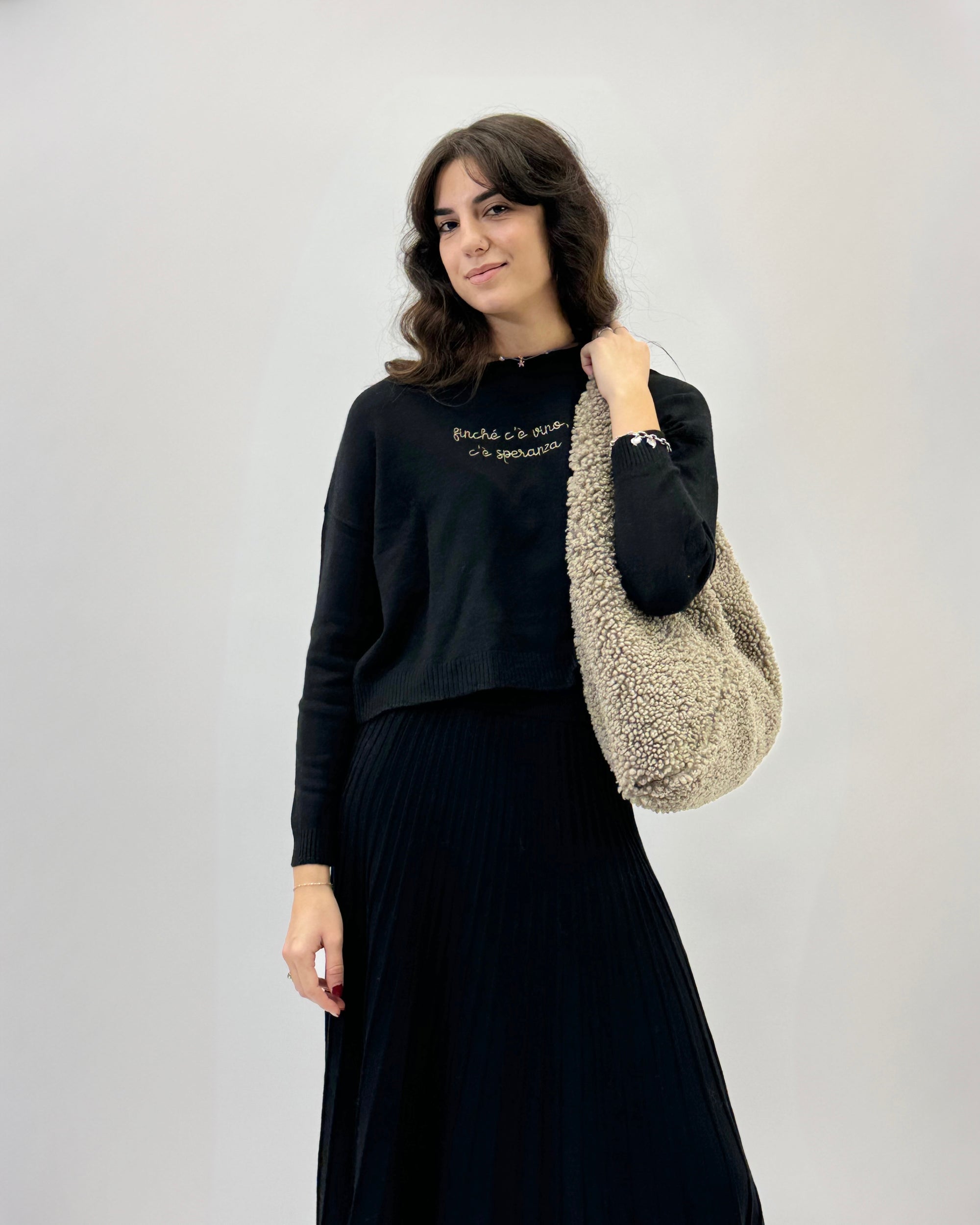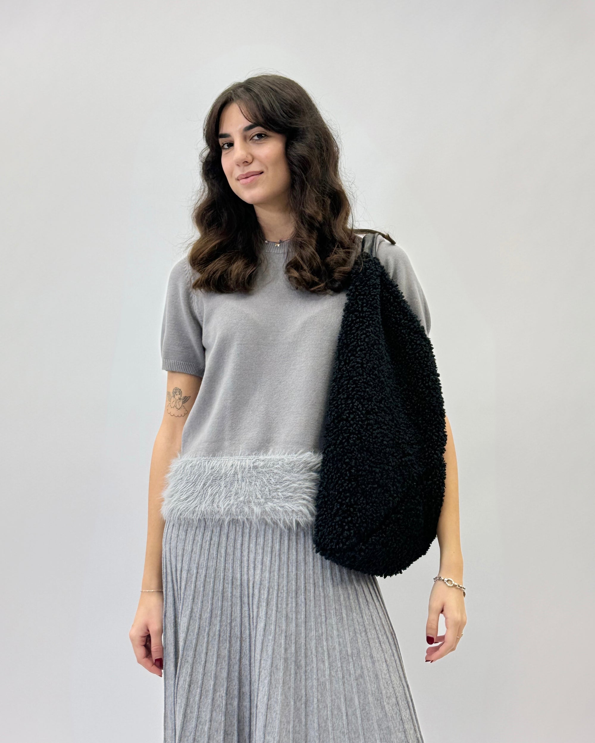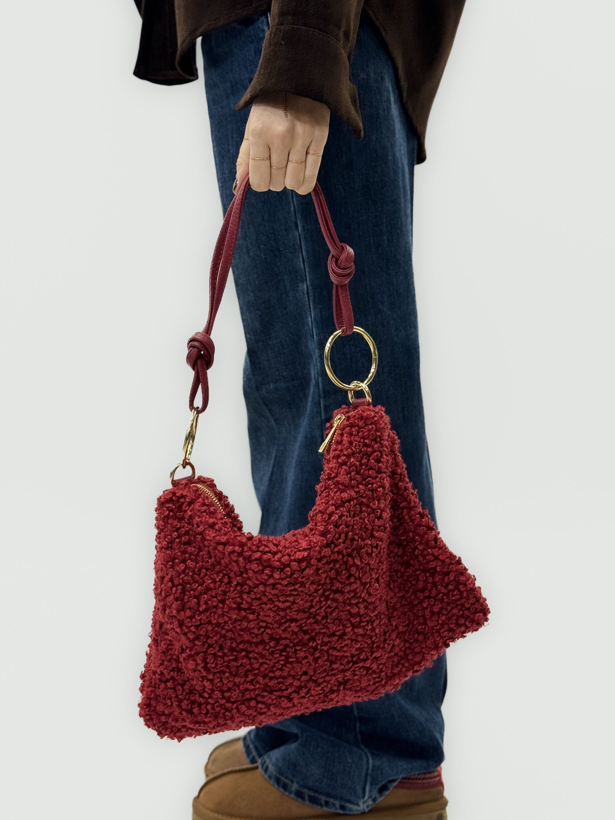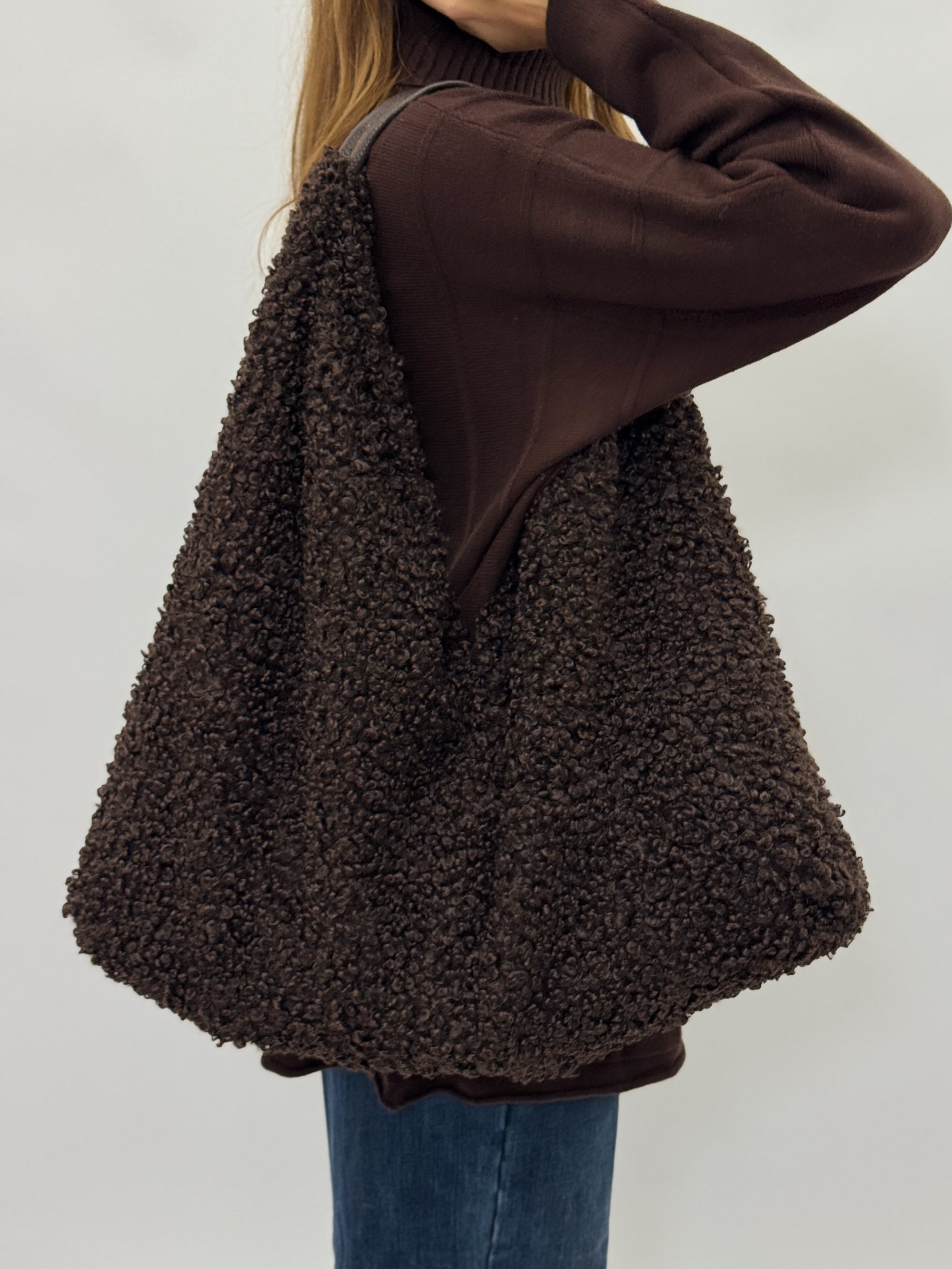 Borsa in pelliccia effetto teddy con manico in pelle – Made in italy