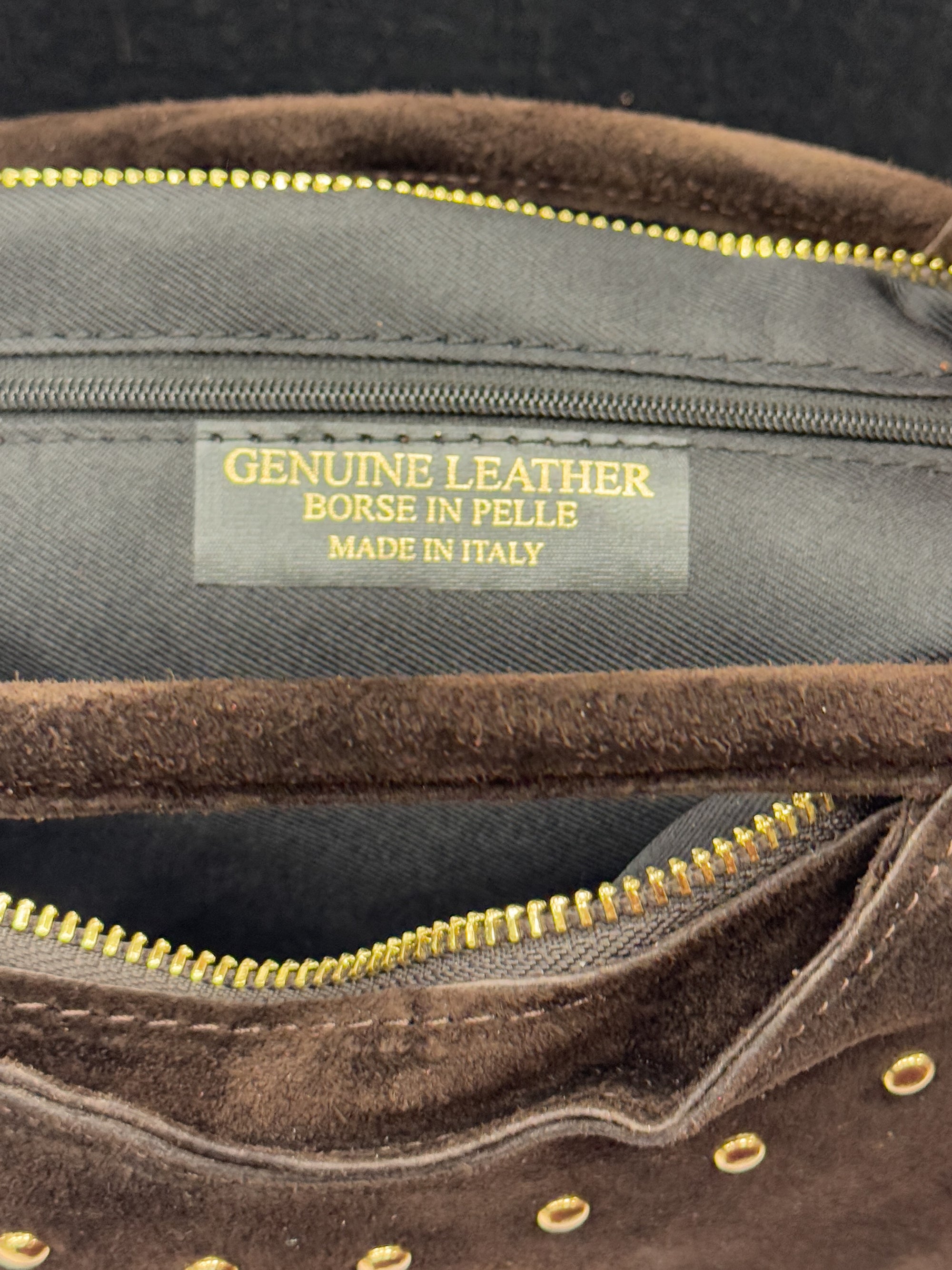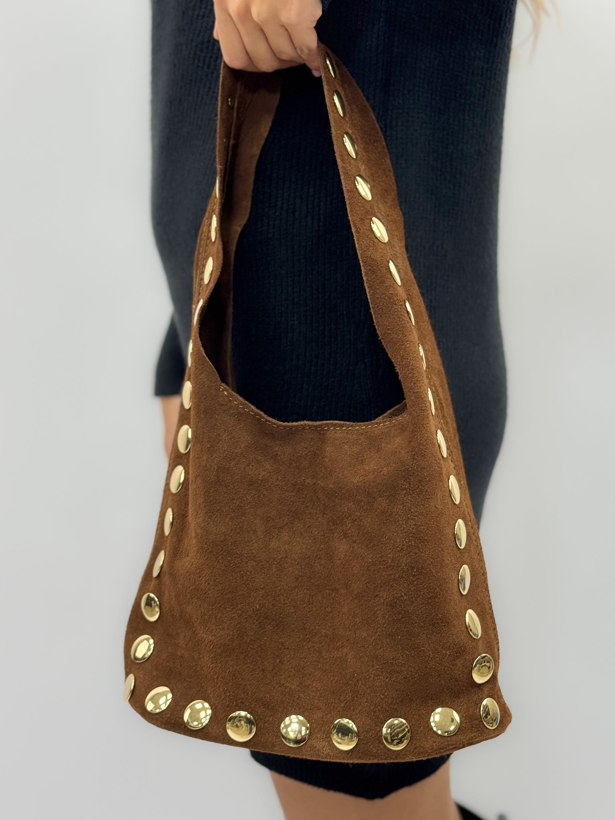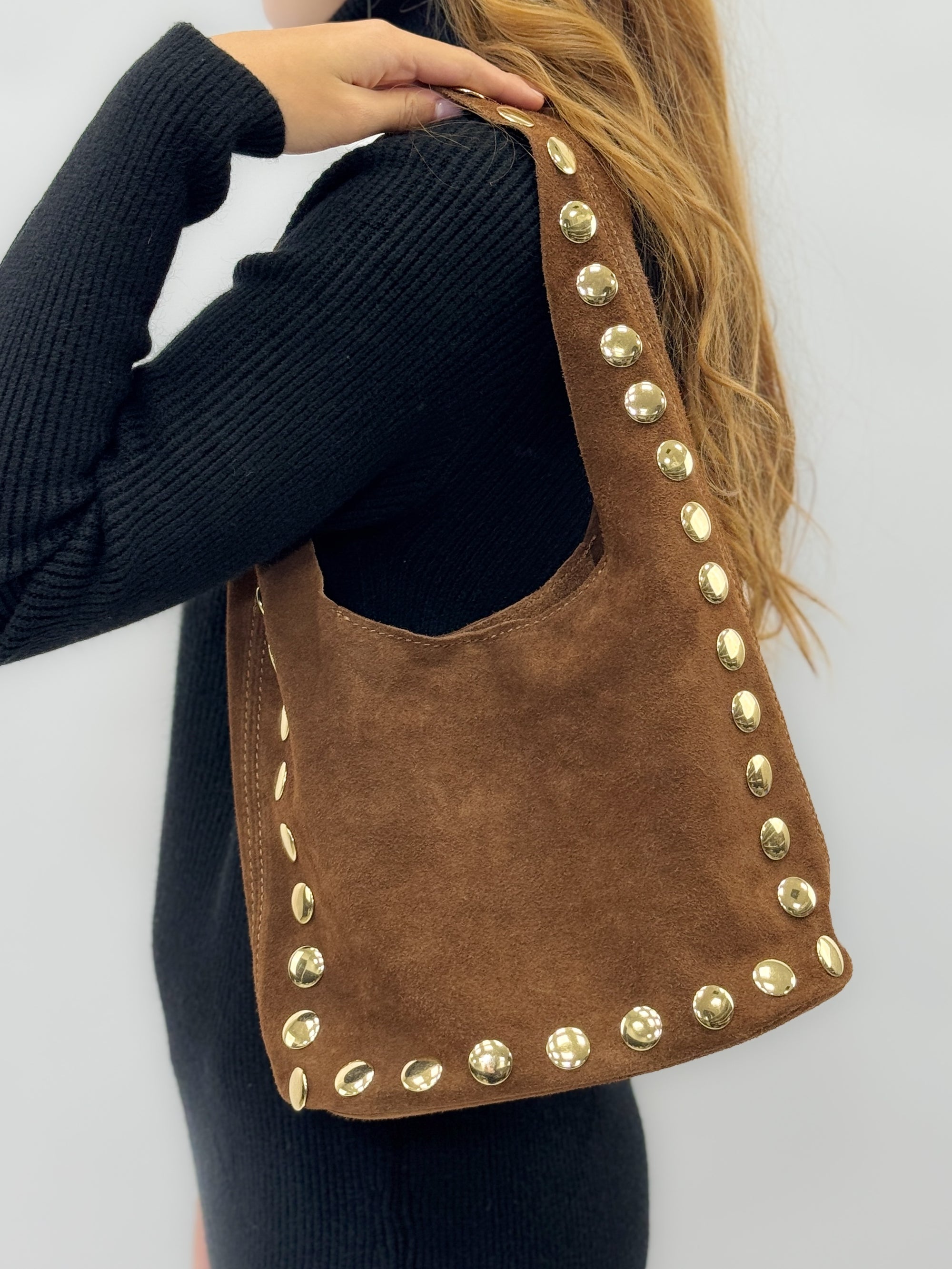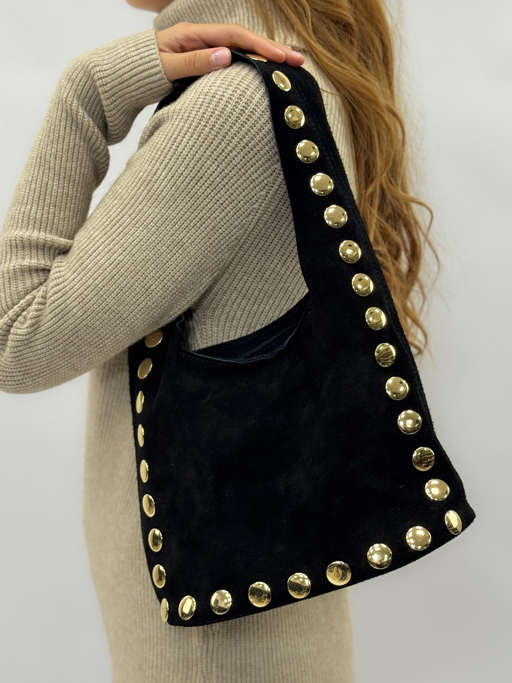 Borsa “Nora” in vera pelle scamosciata con borchie – Made in Italy