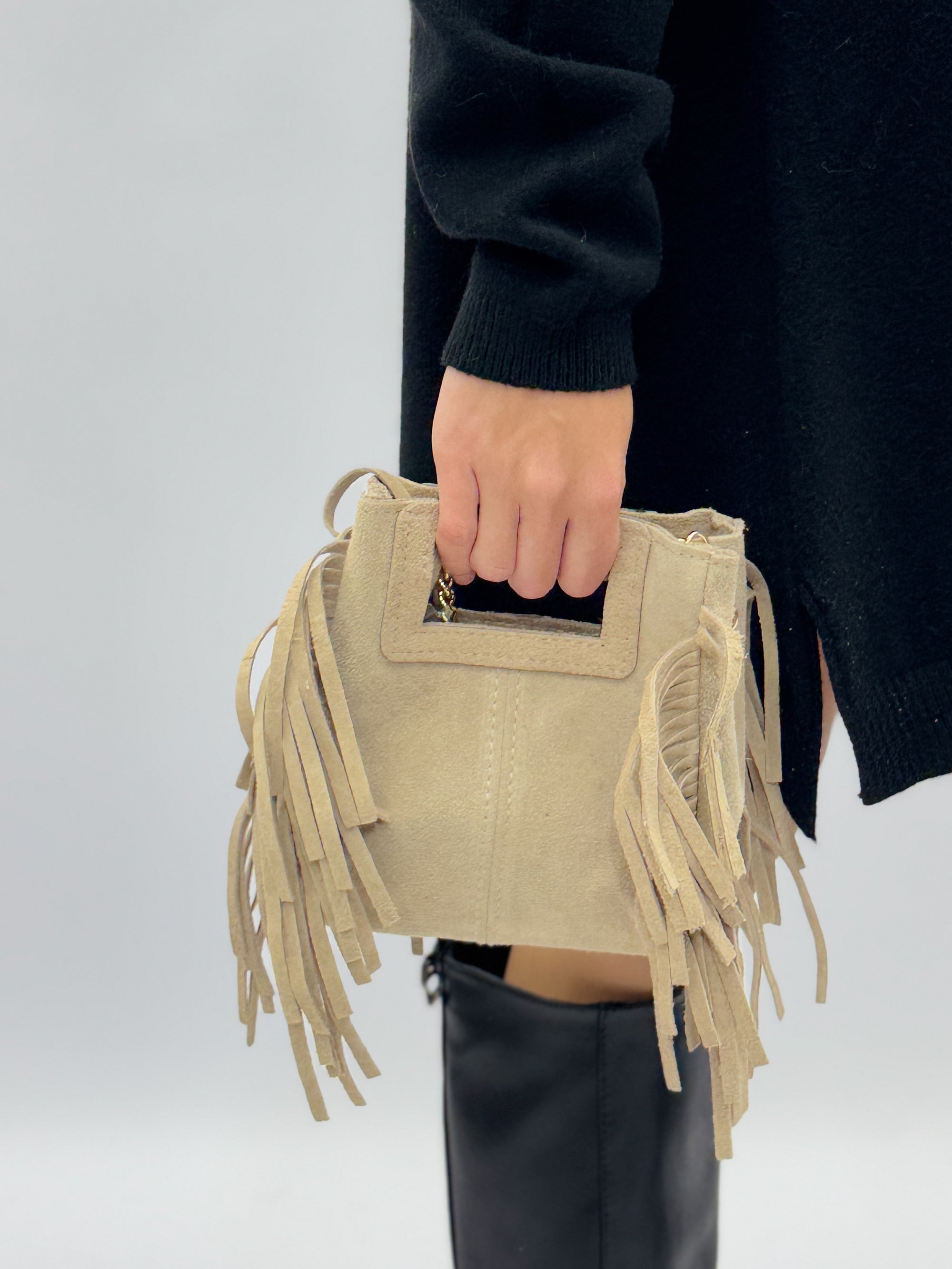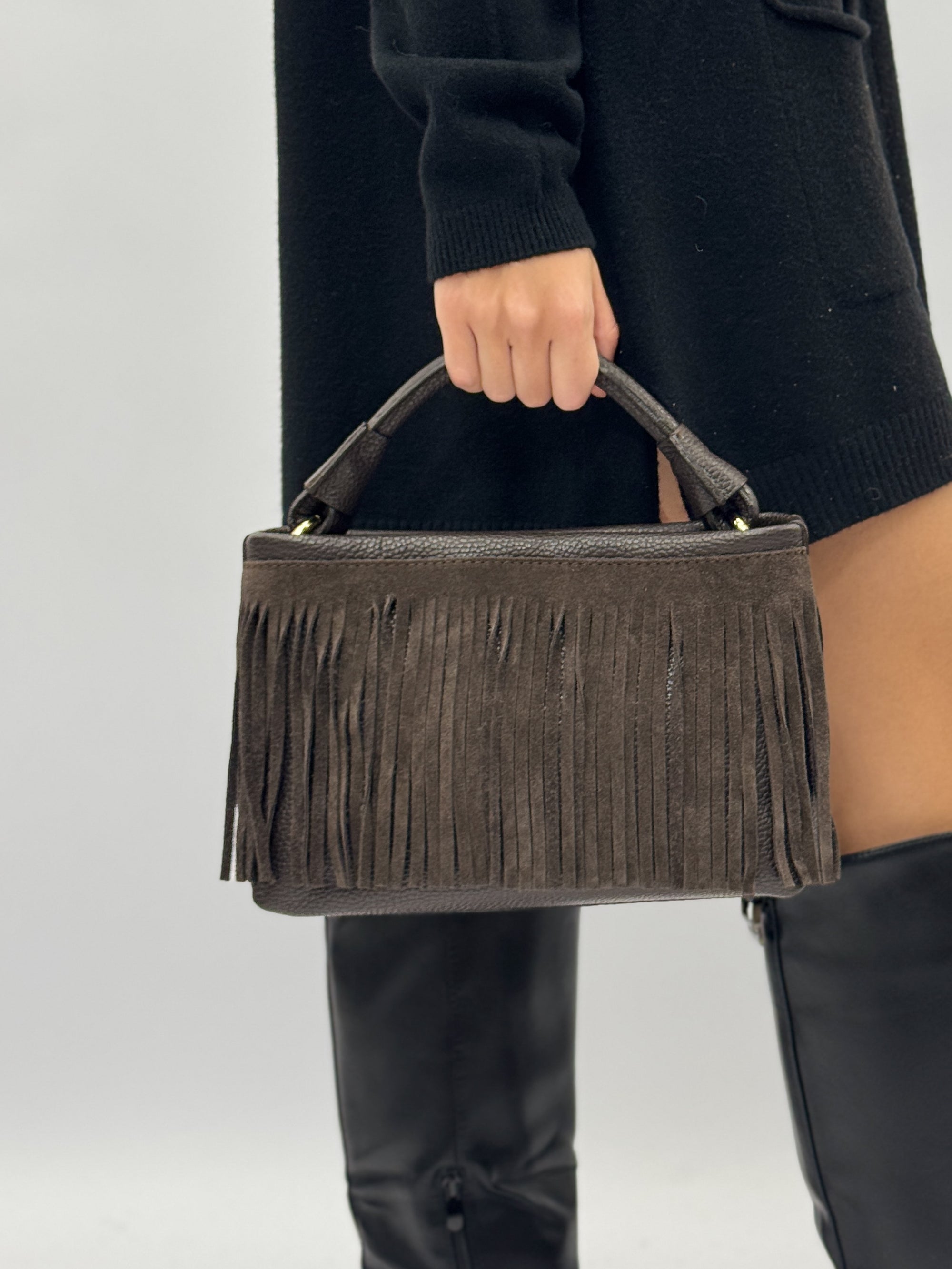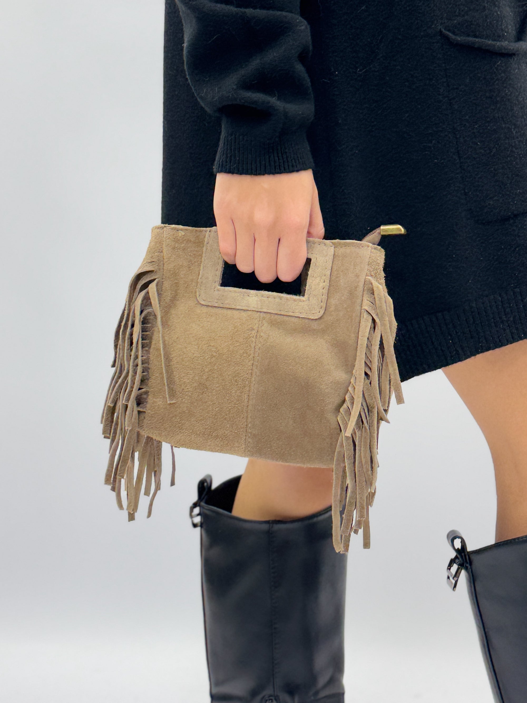 Borsa mini in vera pelle scamosciata con frange – Made in Italy