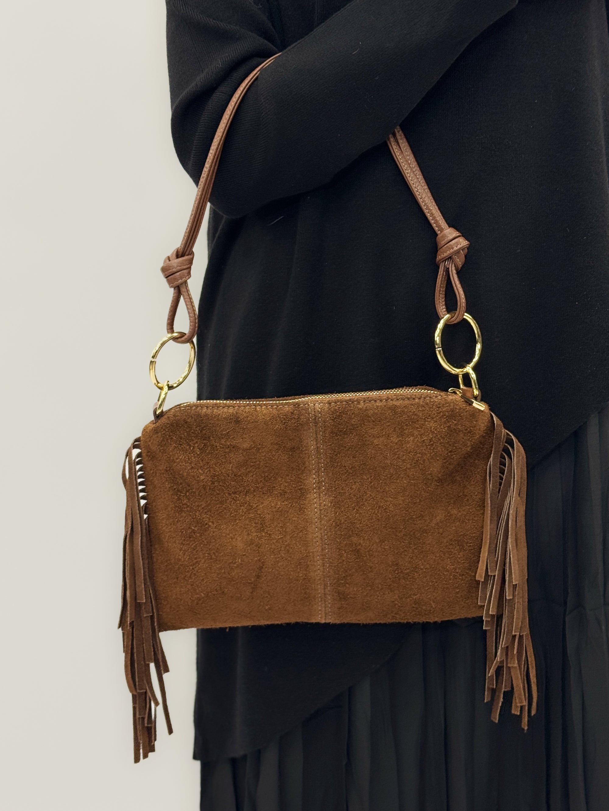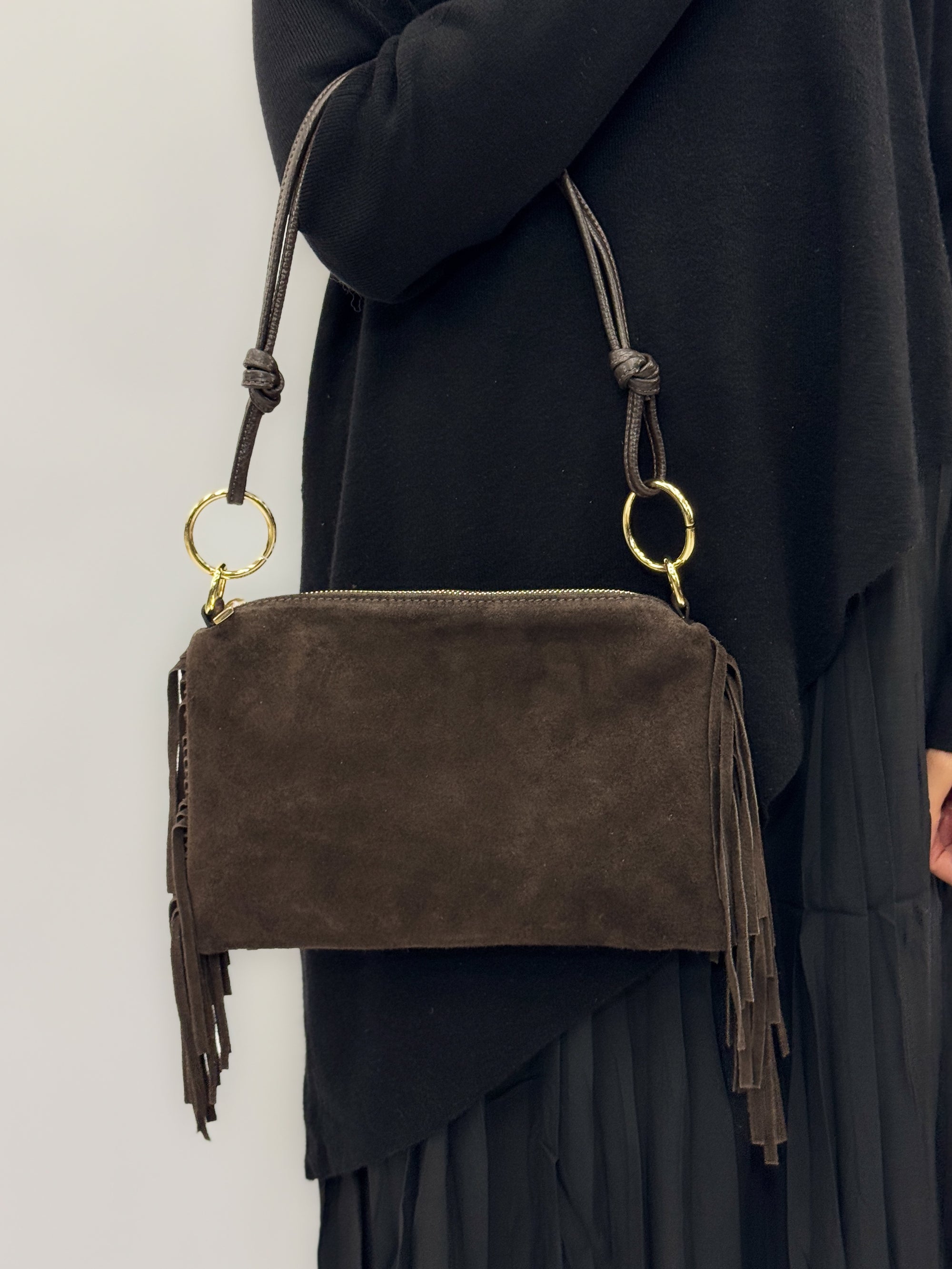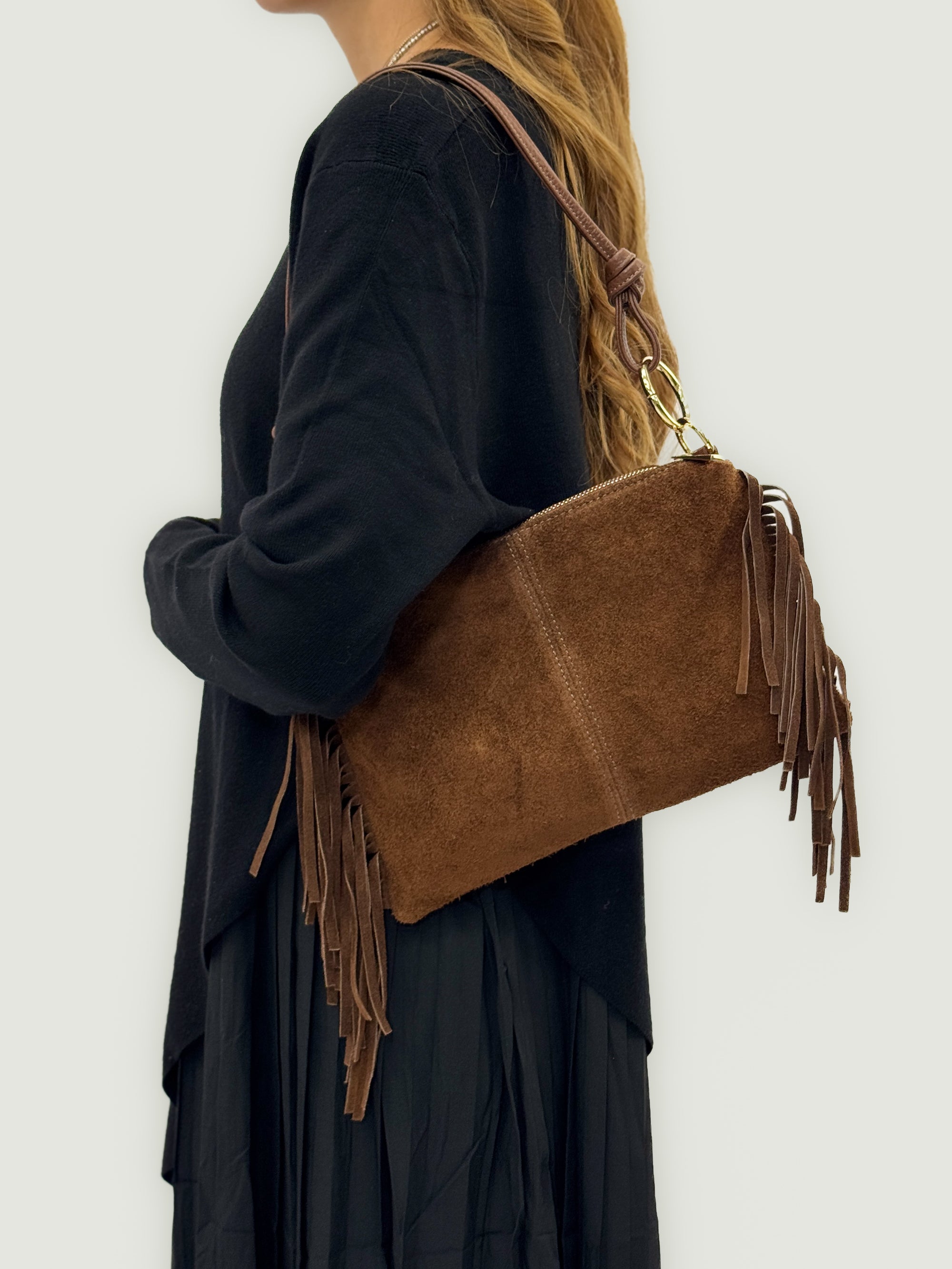 Borsa a spalla in vera pelle scamosciata con frange – Made in Italy