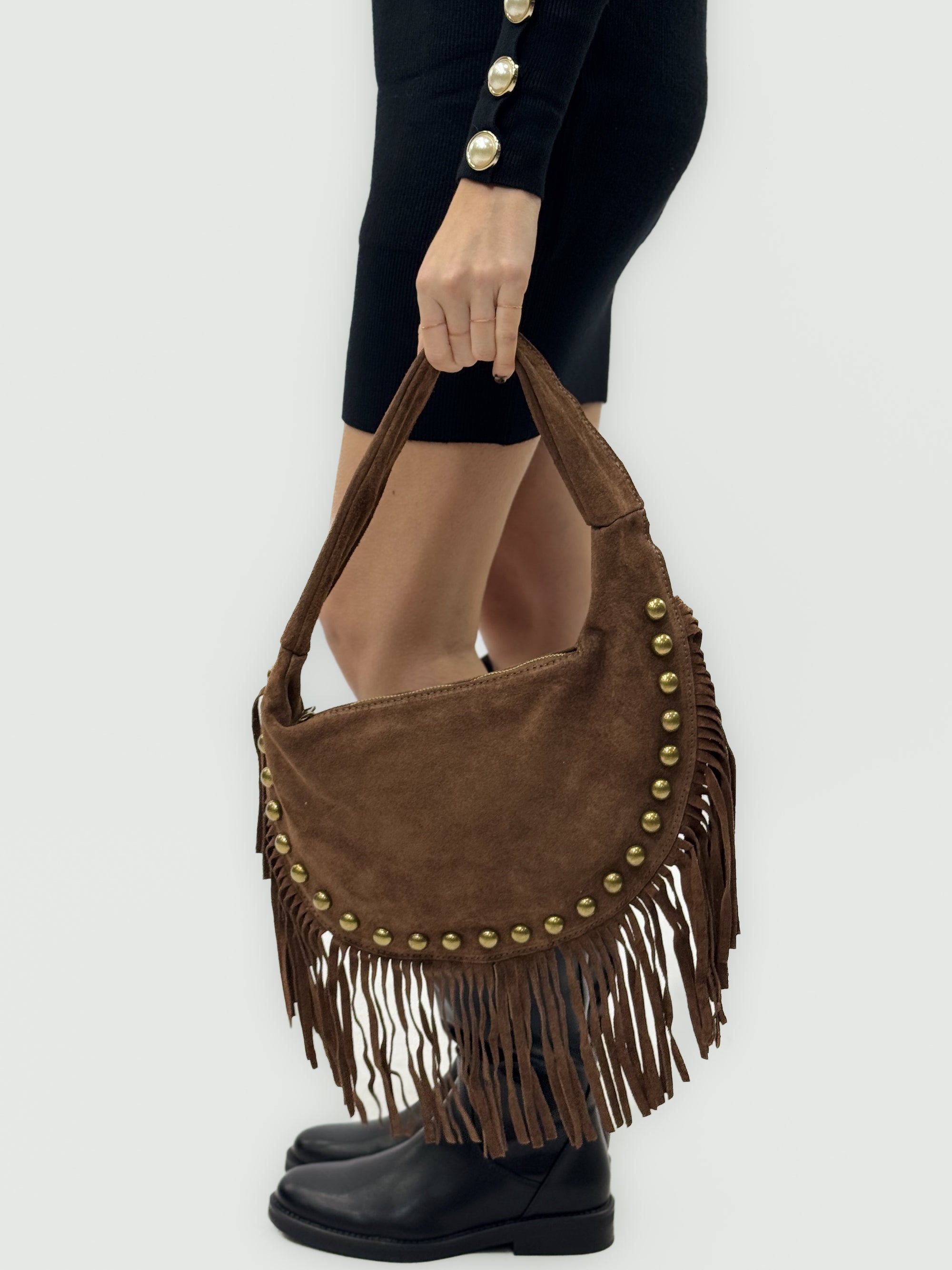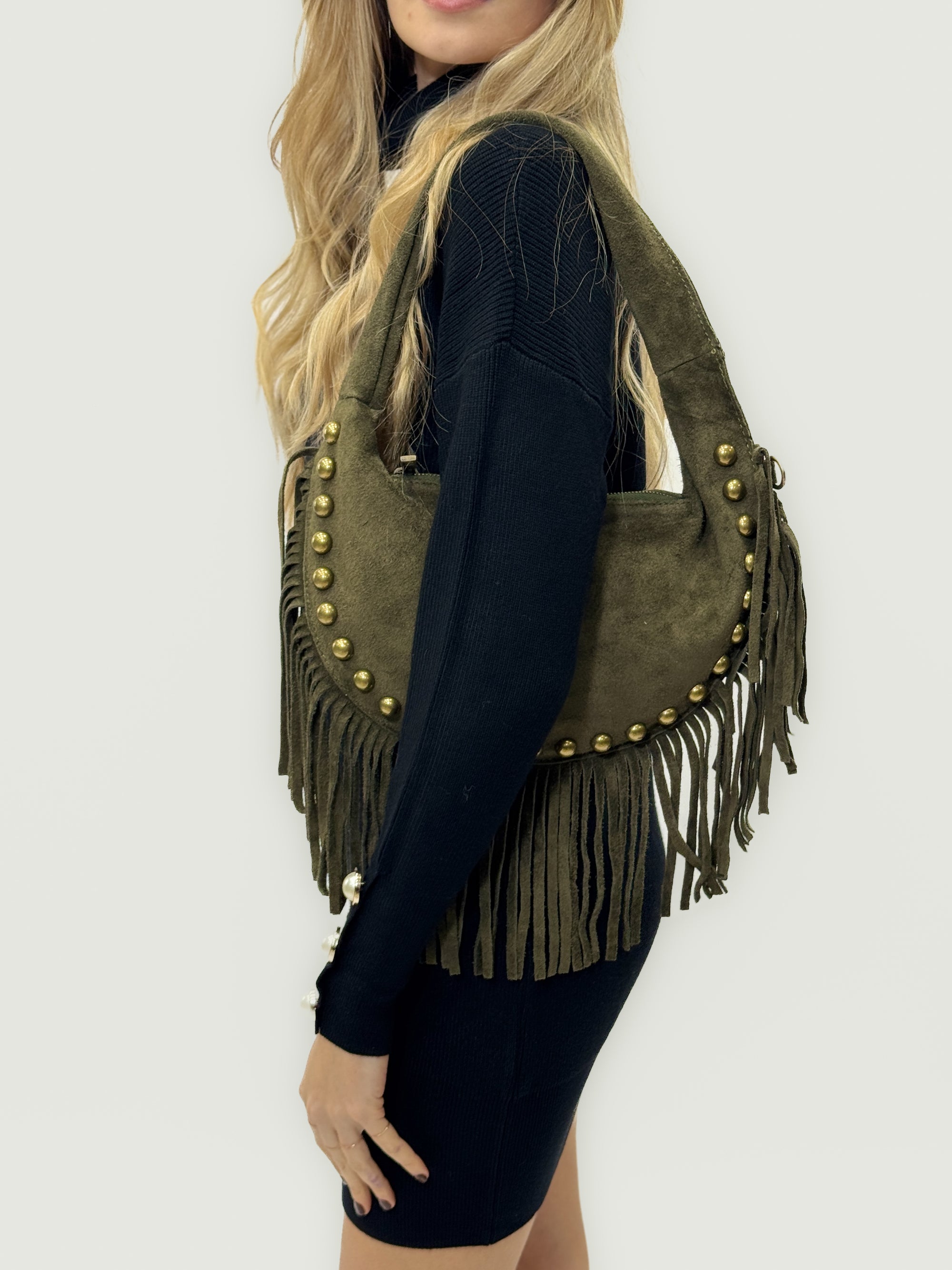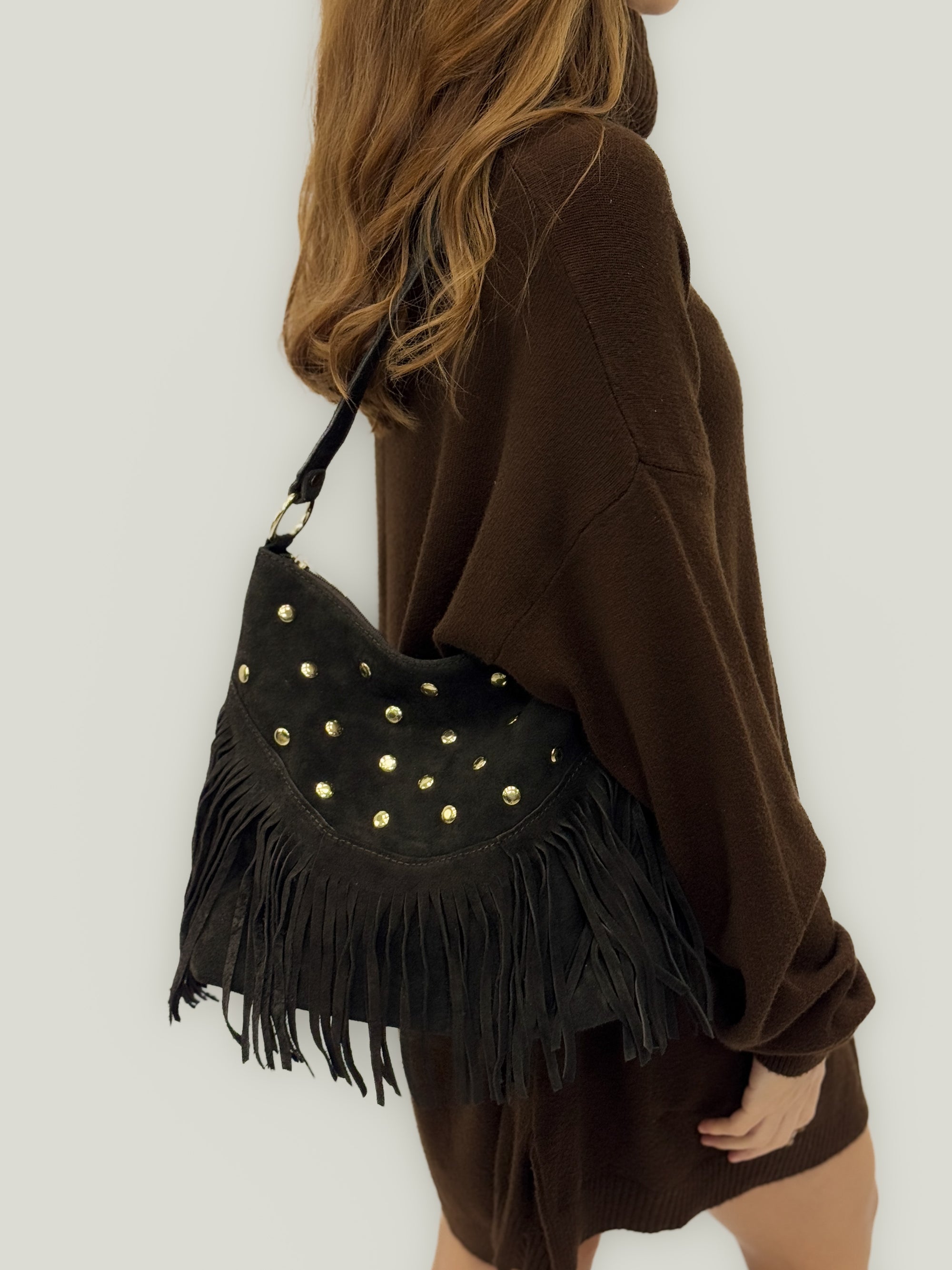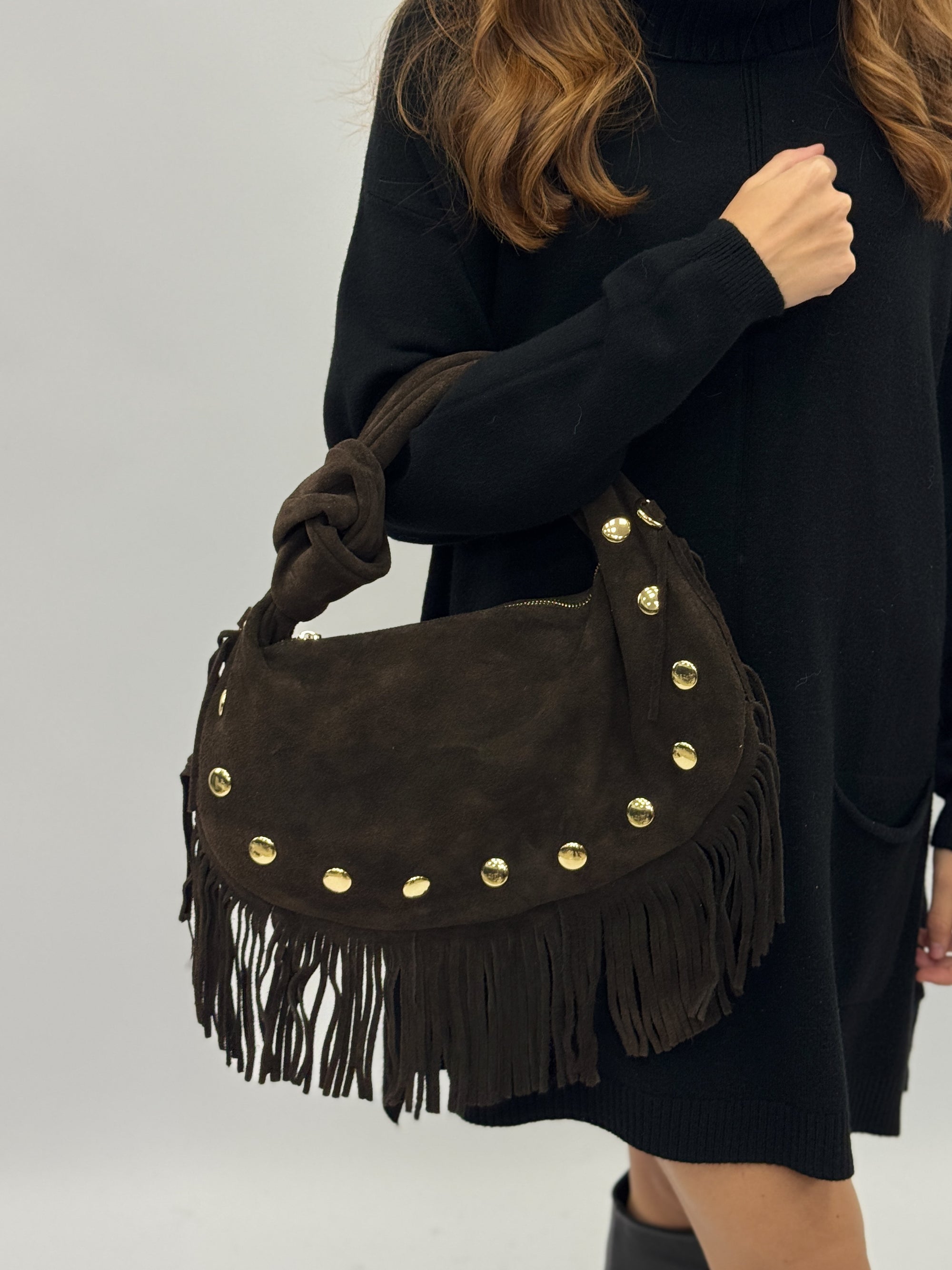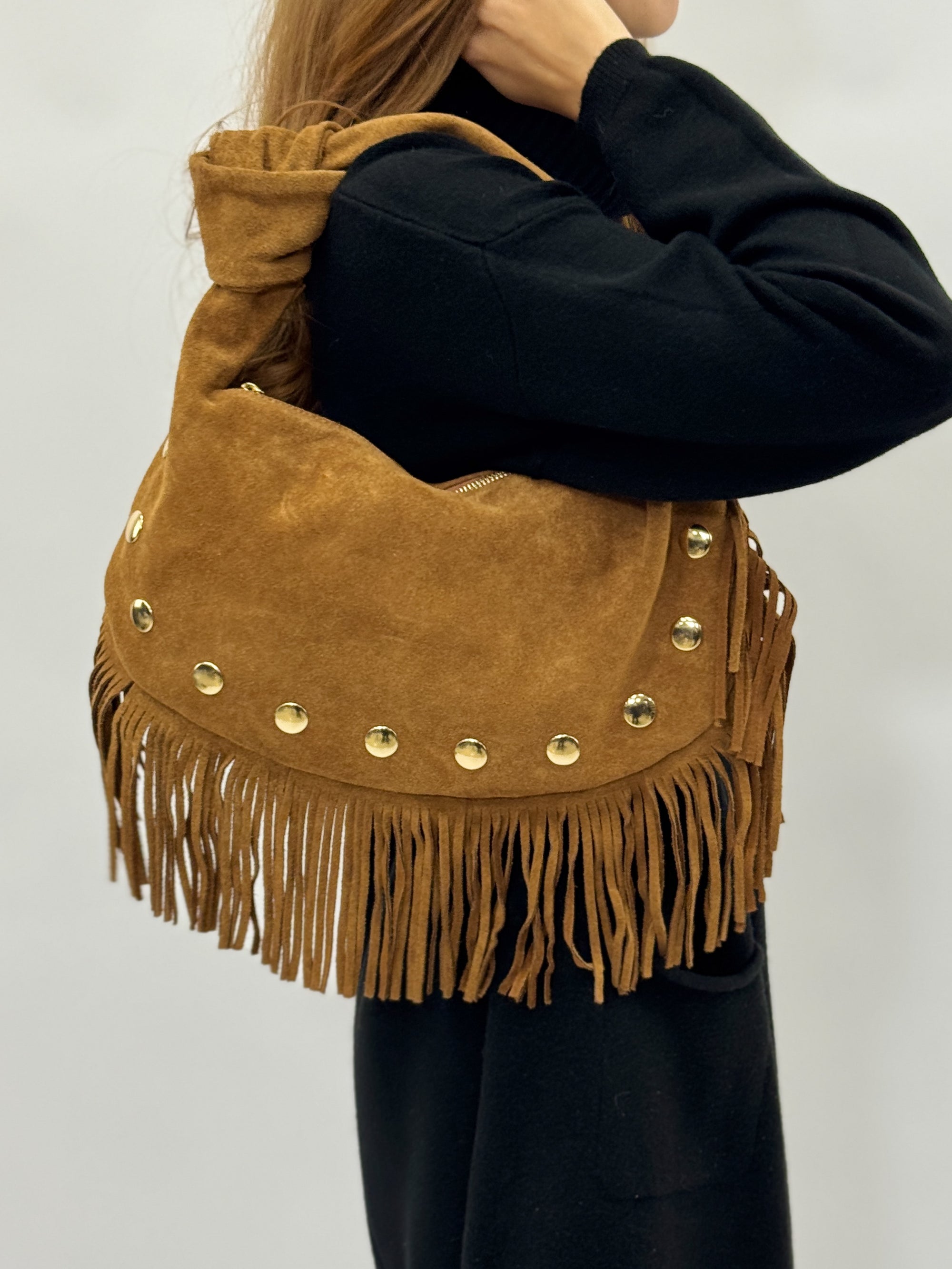 Borsa a spalla in vera pelle scamosciata con frange e borchie – Made in Italy