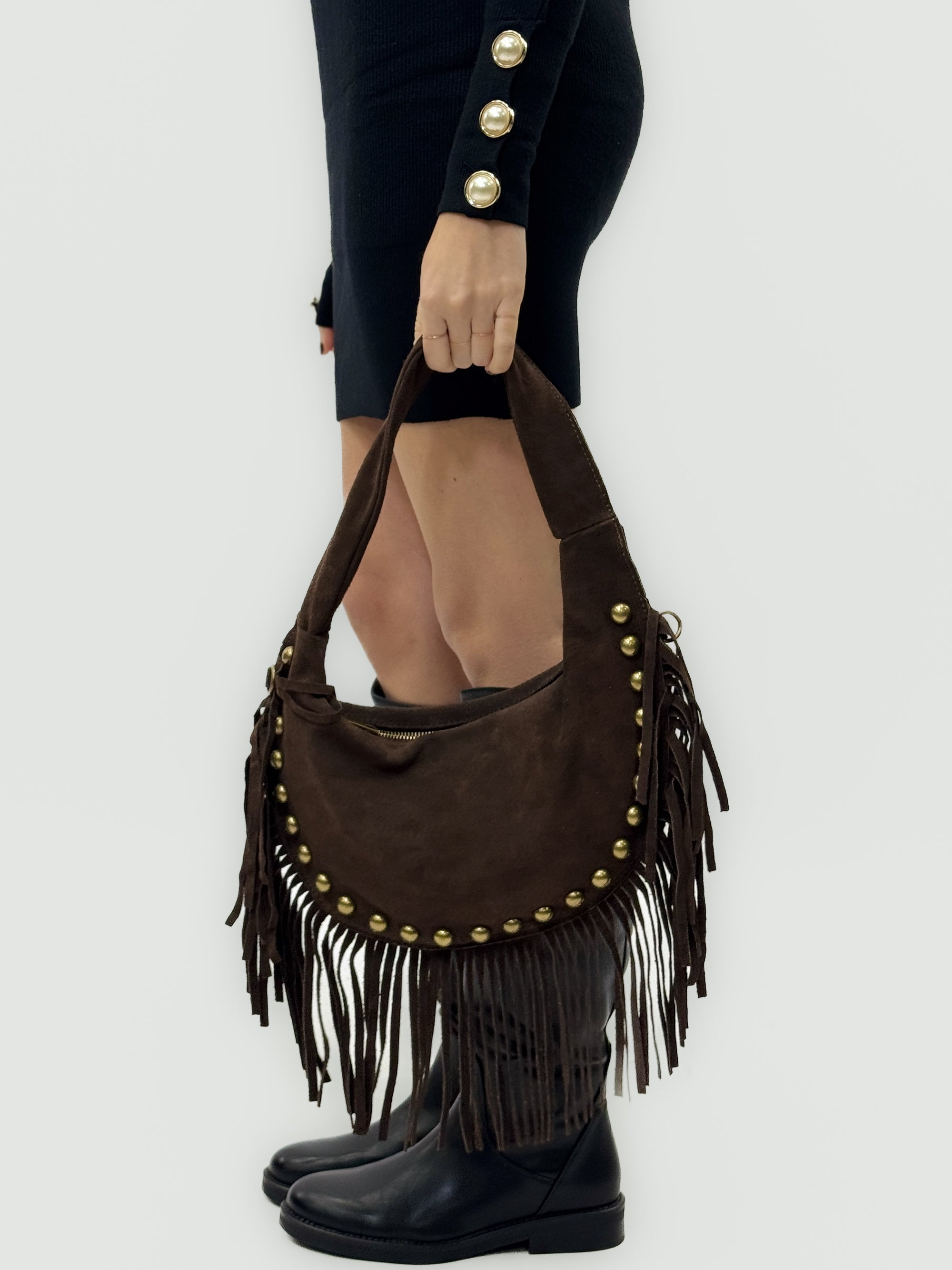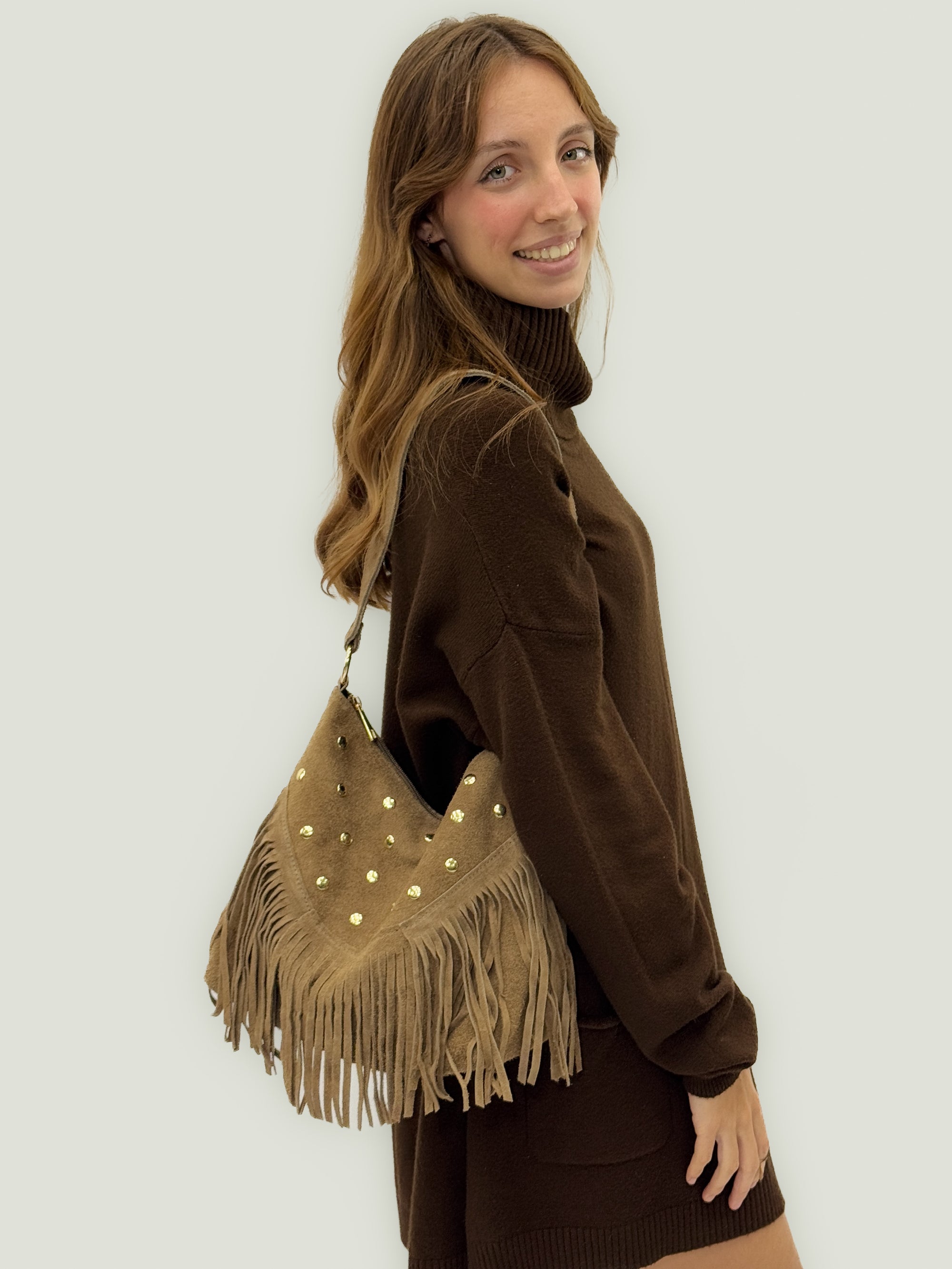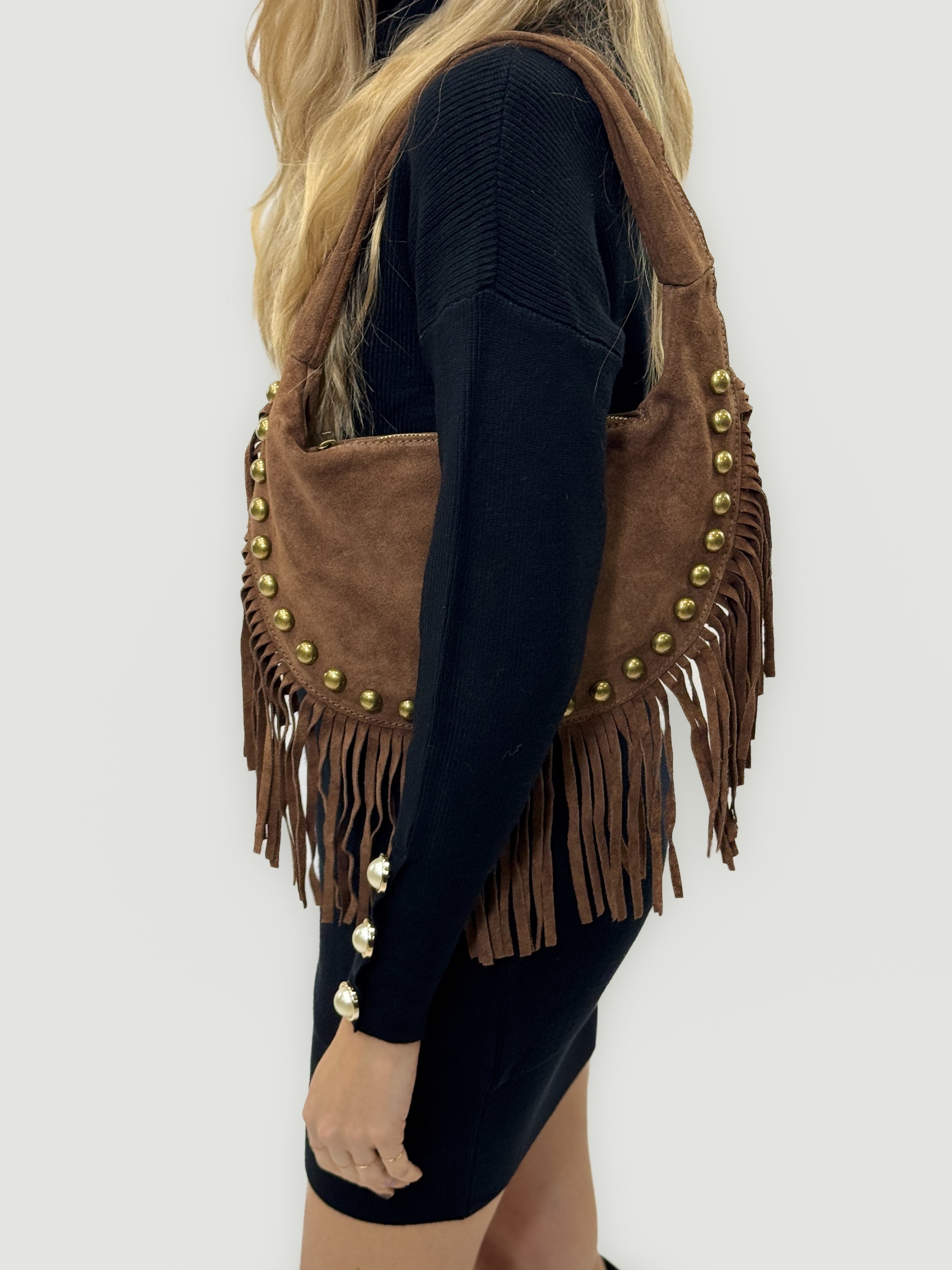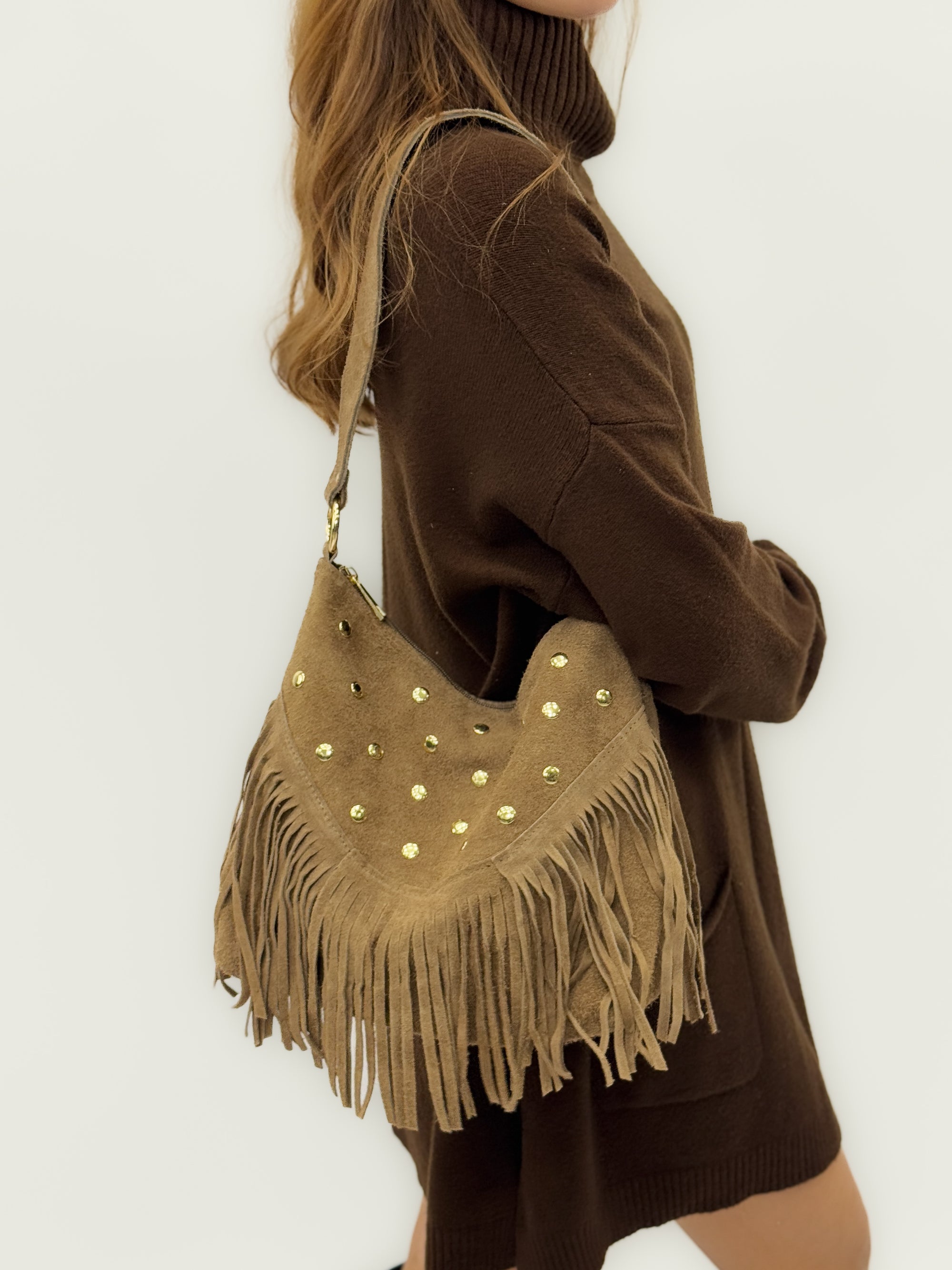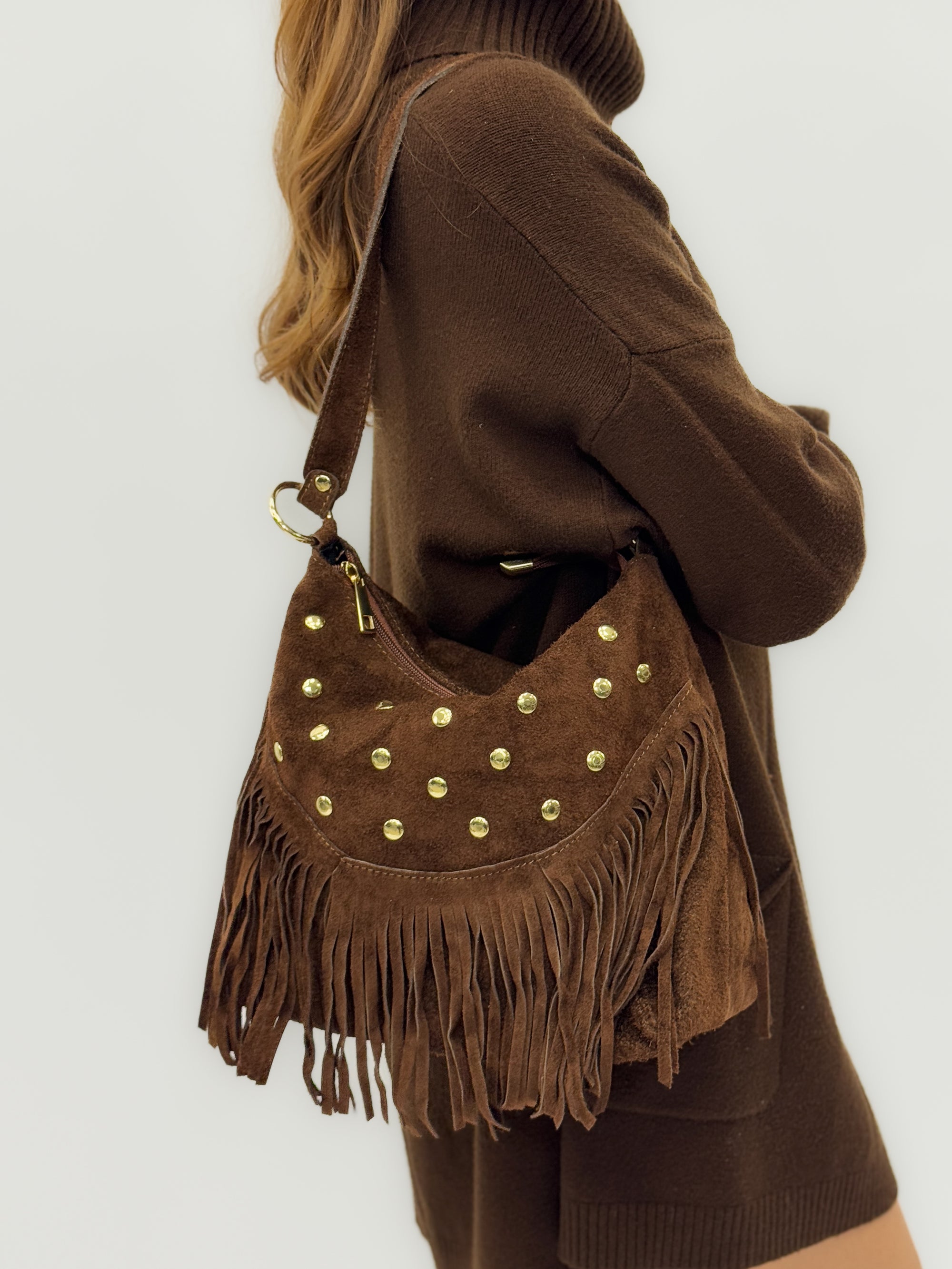 Borsa a spalla in vera pelle scamosciata con frange e borchie – Made in Italy