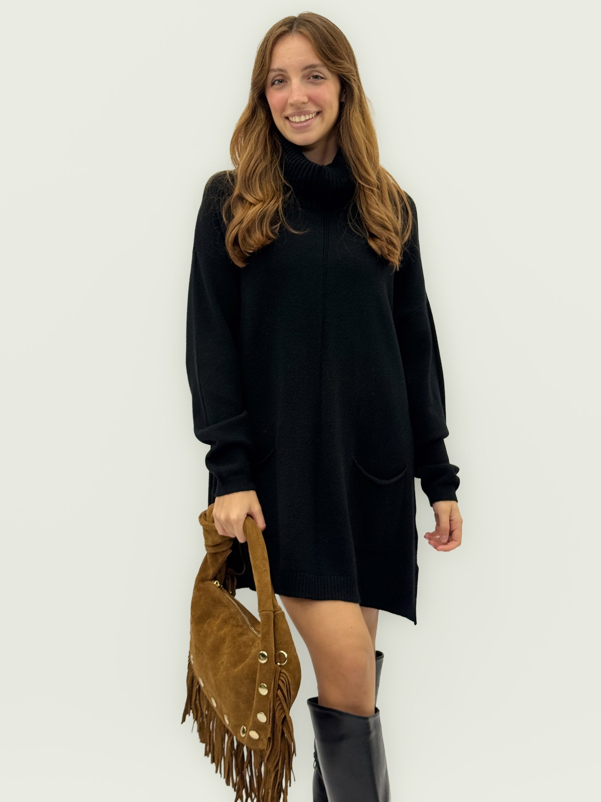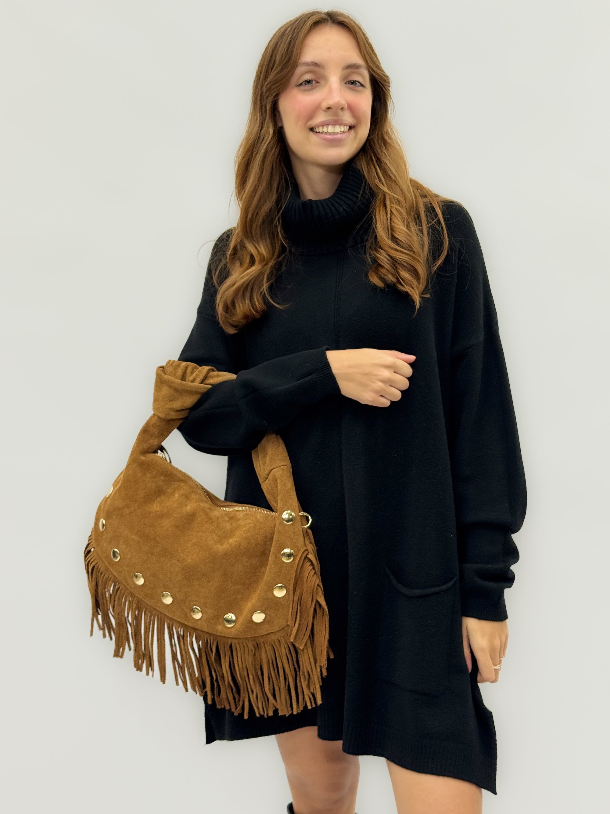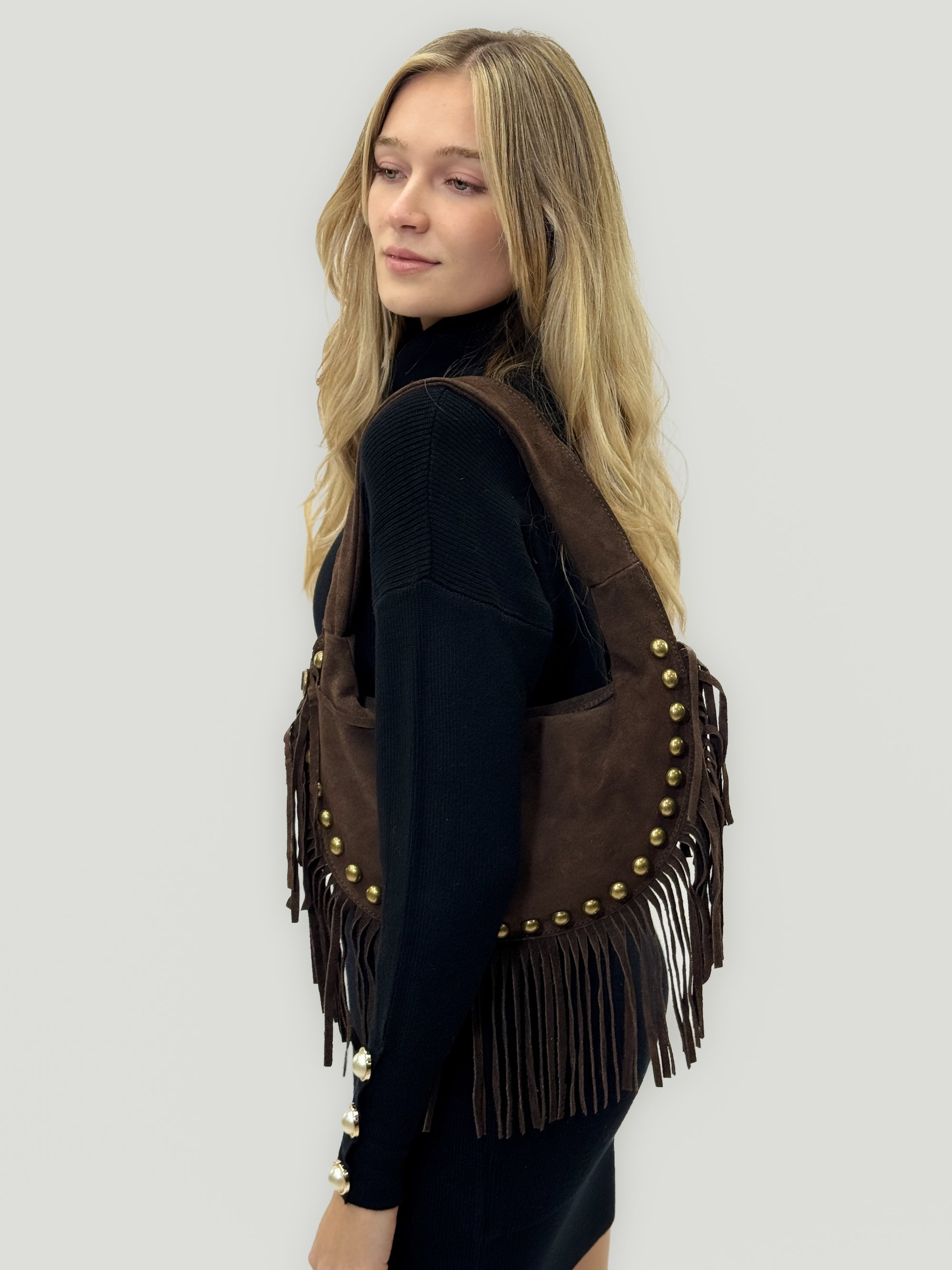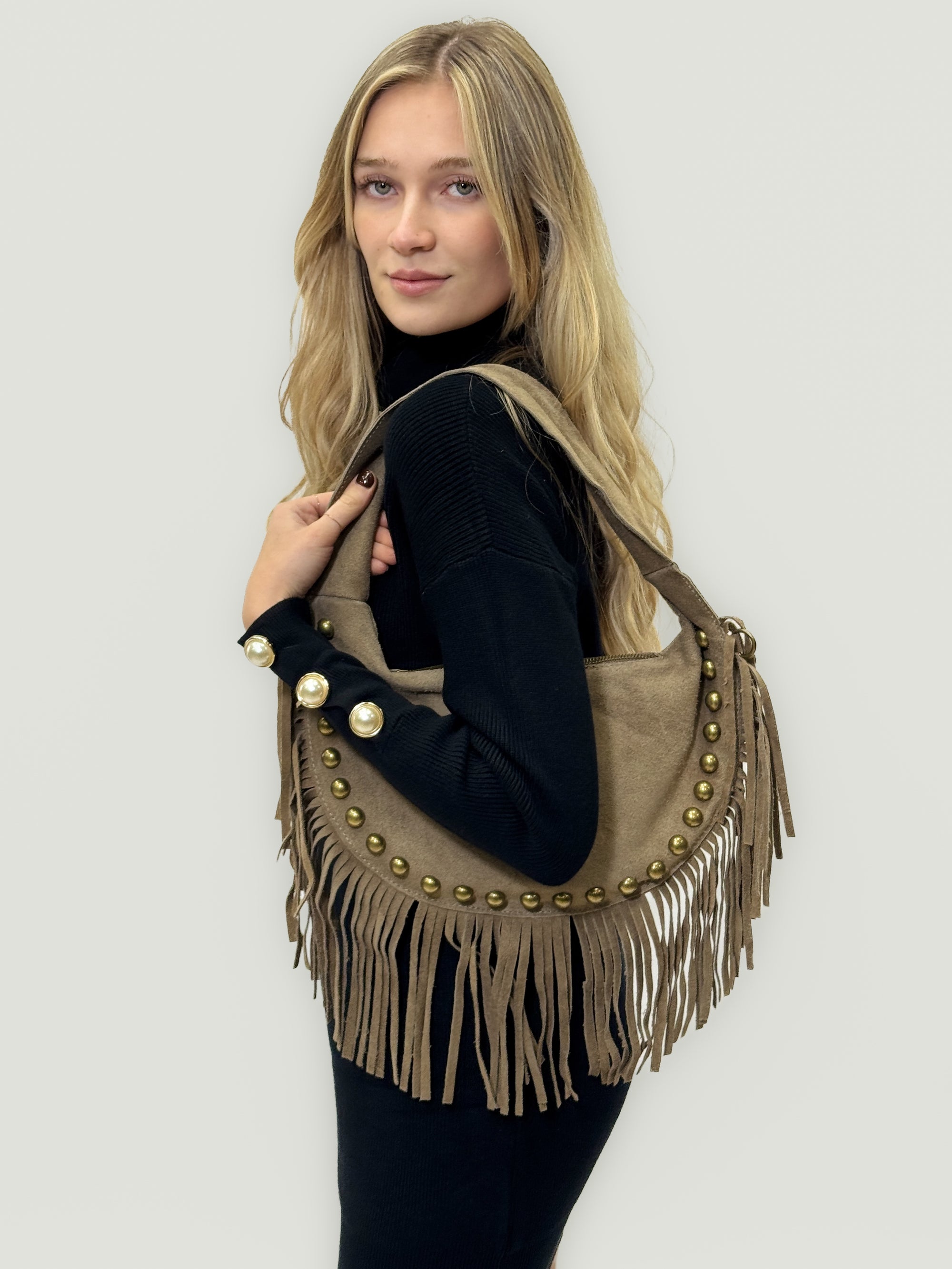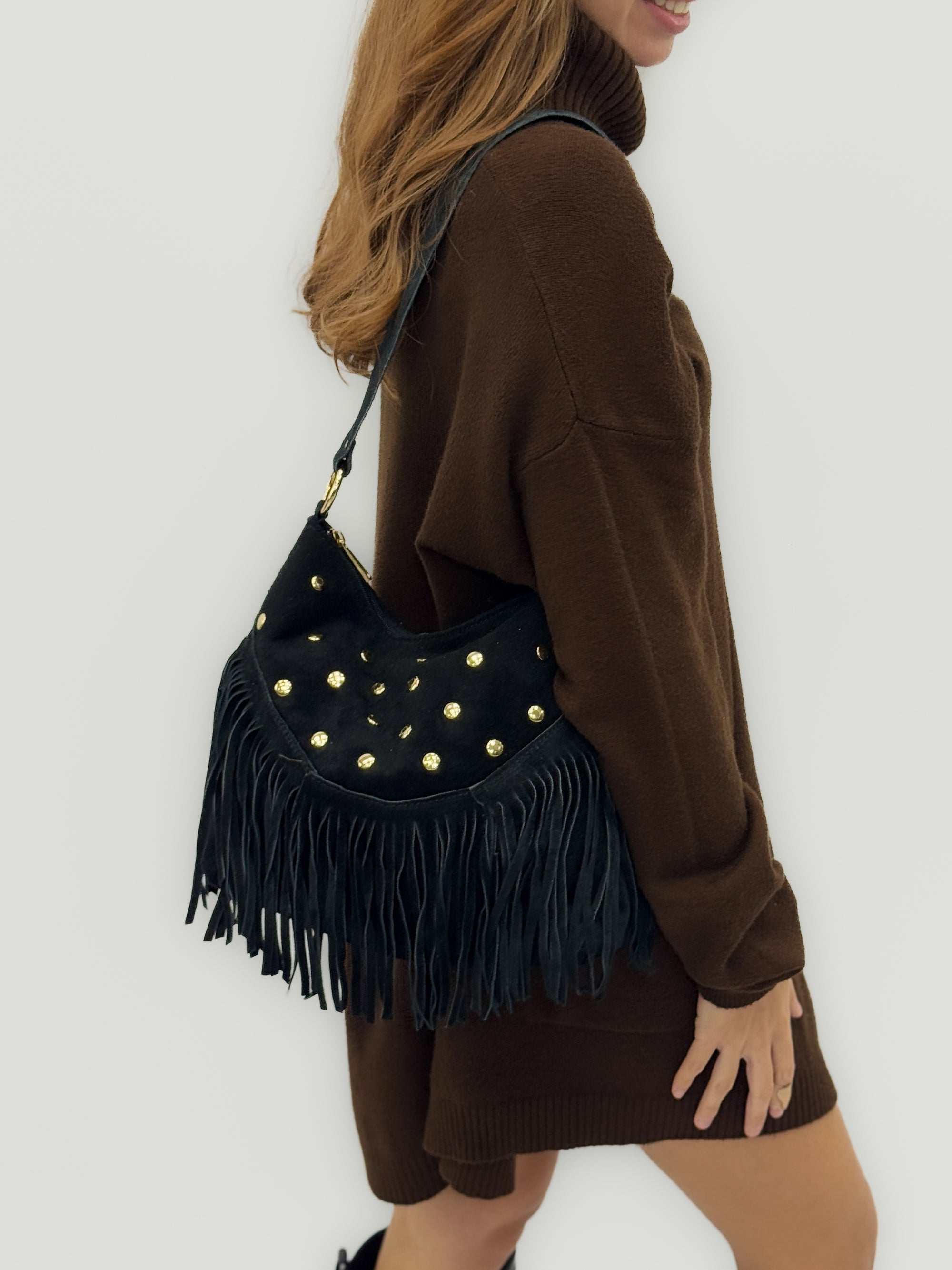 Borsa a spalla in vera pelle scamosciata con frange e borchie – Made in Italy