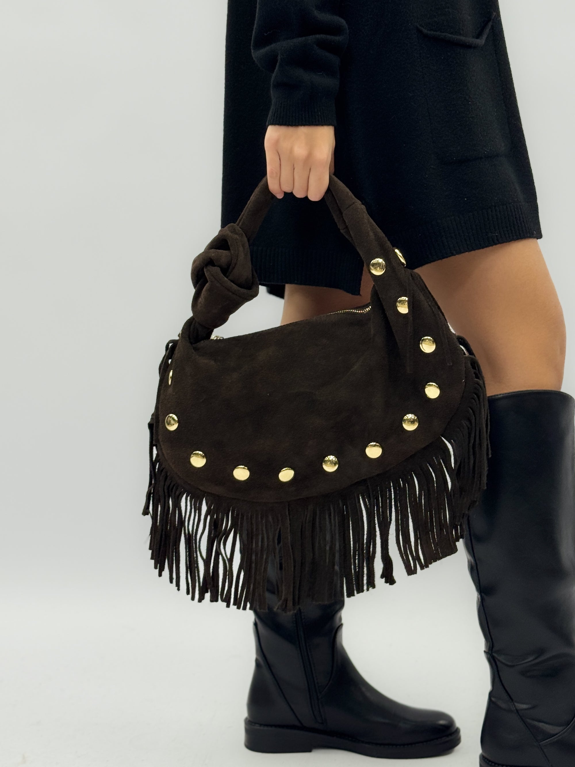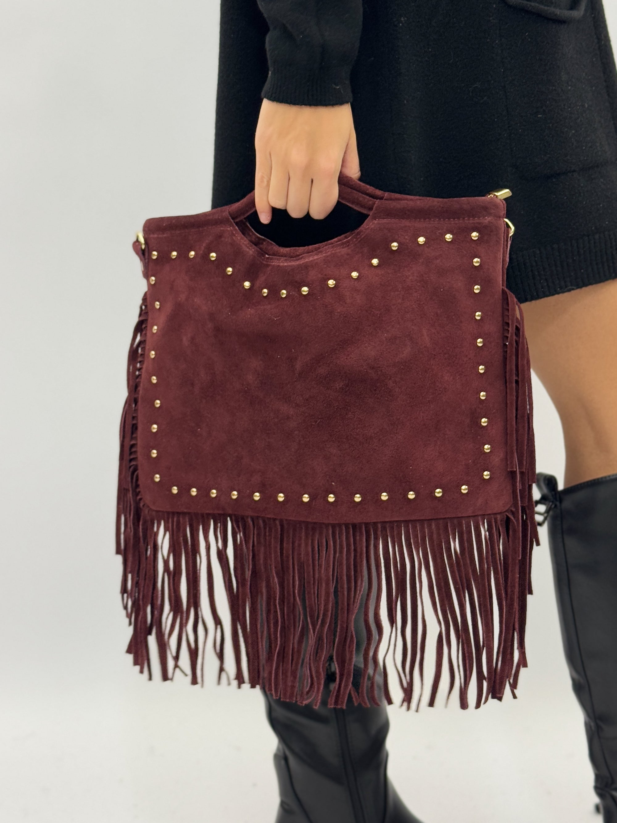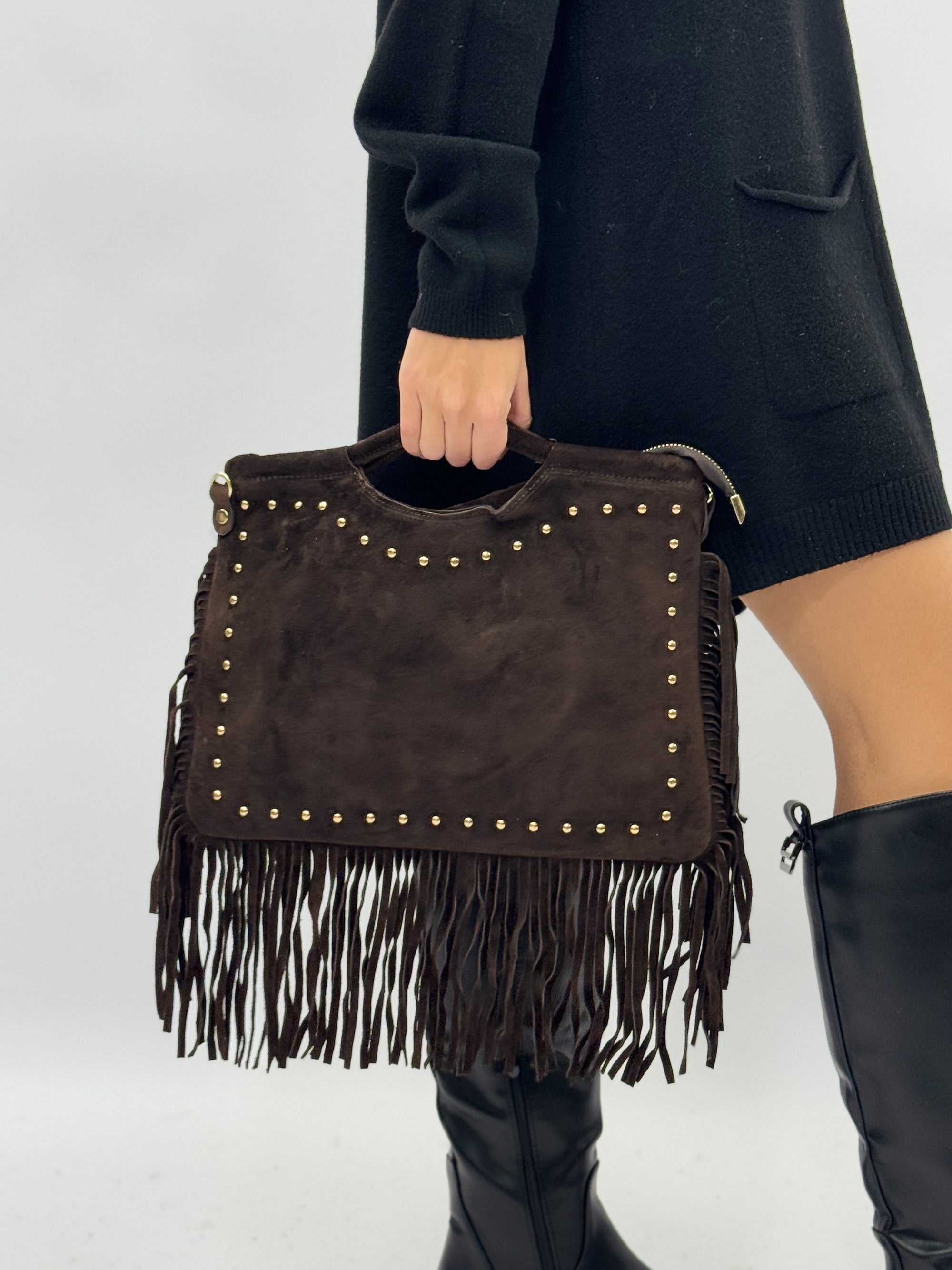 Borsa in vera pelle scamosciata con borchie e frange - Made in Italy
