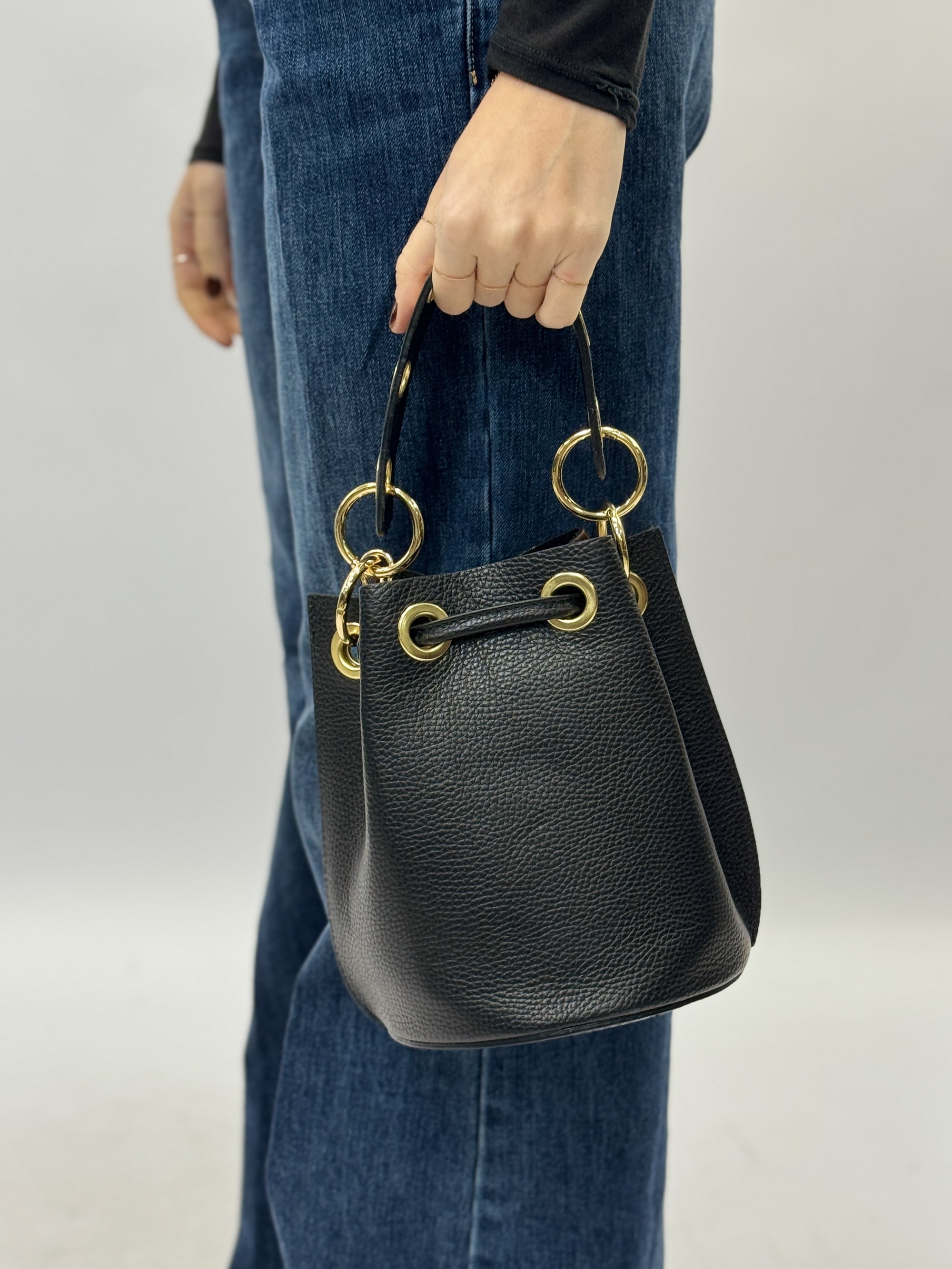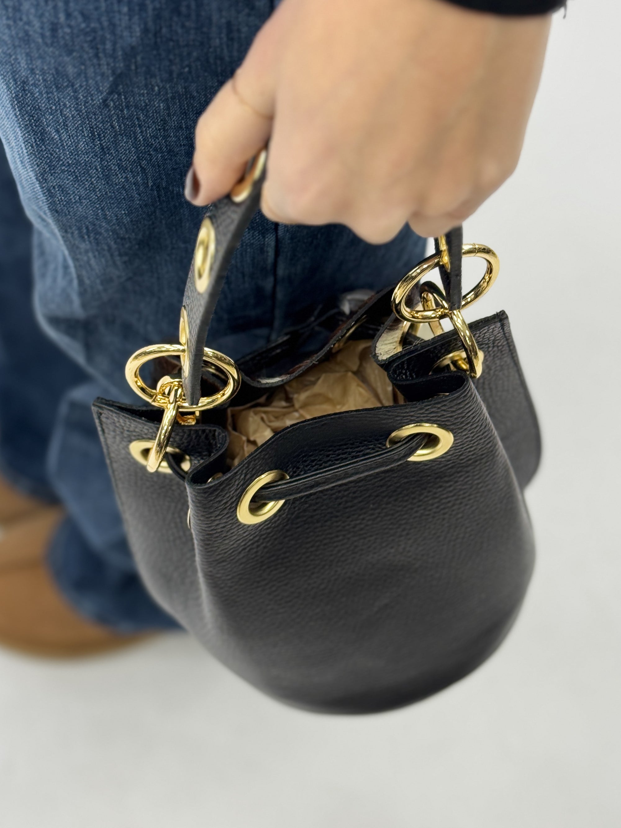 Borsa Secchiello in Vera Pelle cavallino con Dettagli Oro – Made in Italy