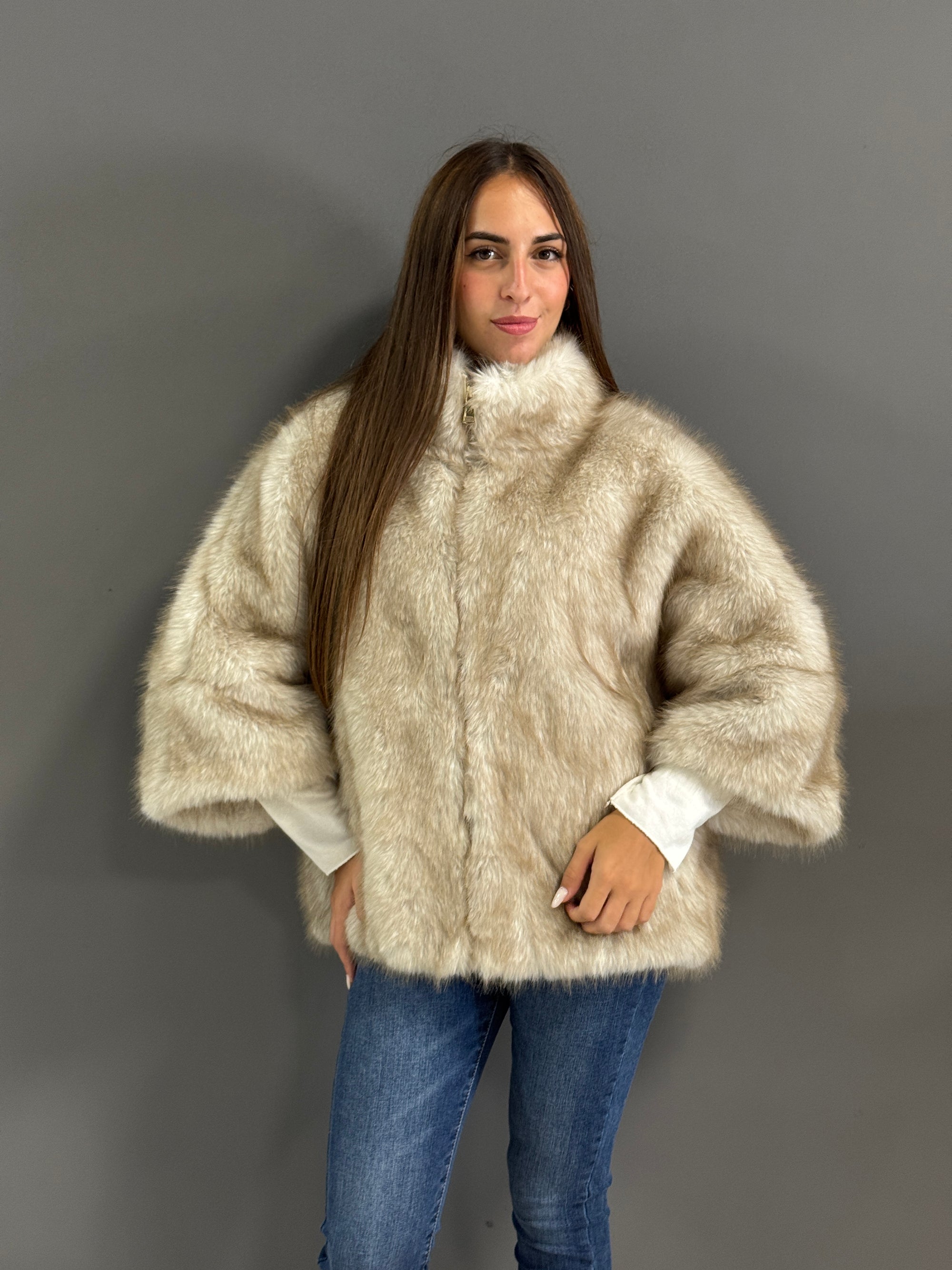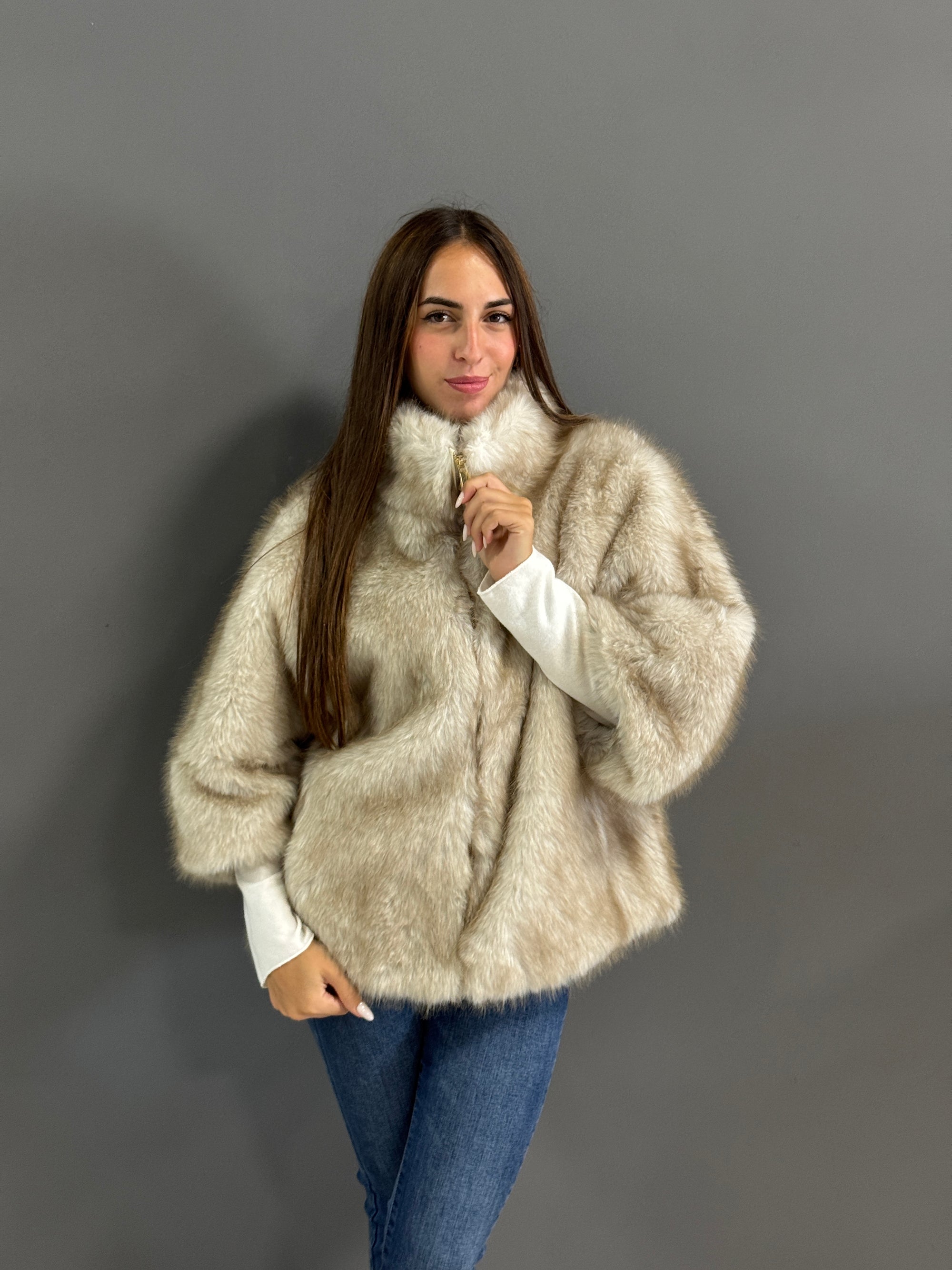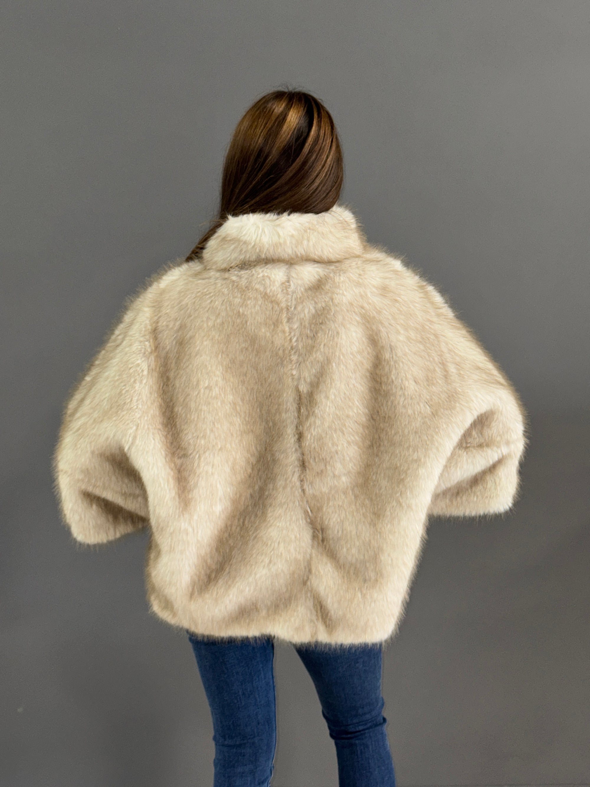 Giacca corta in ecopelliccia beige con tasche gioiello