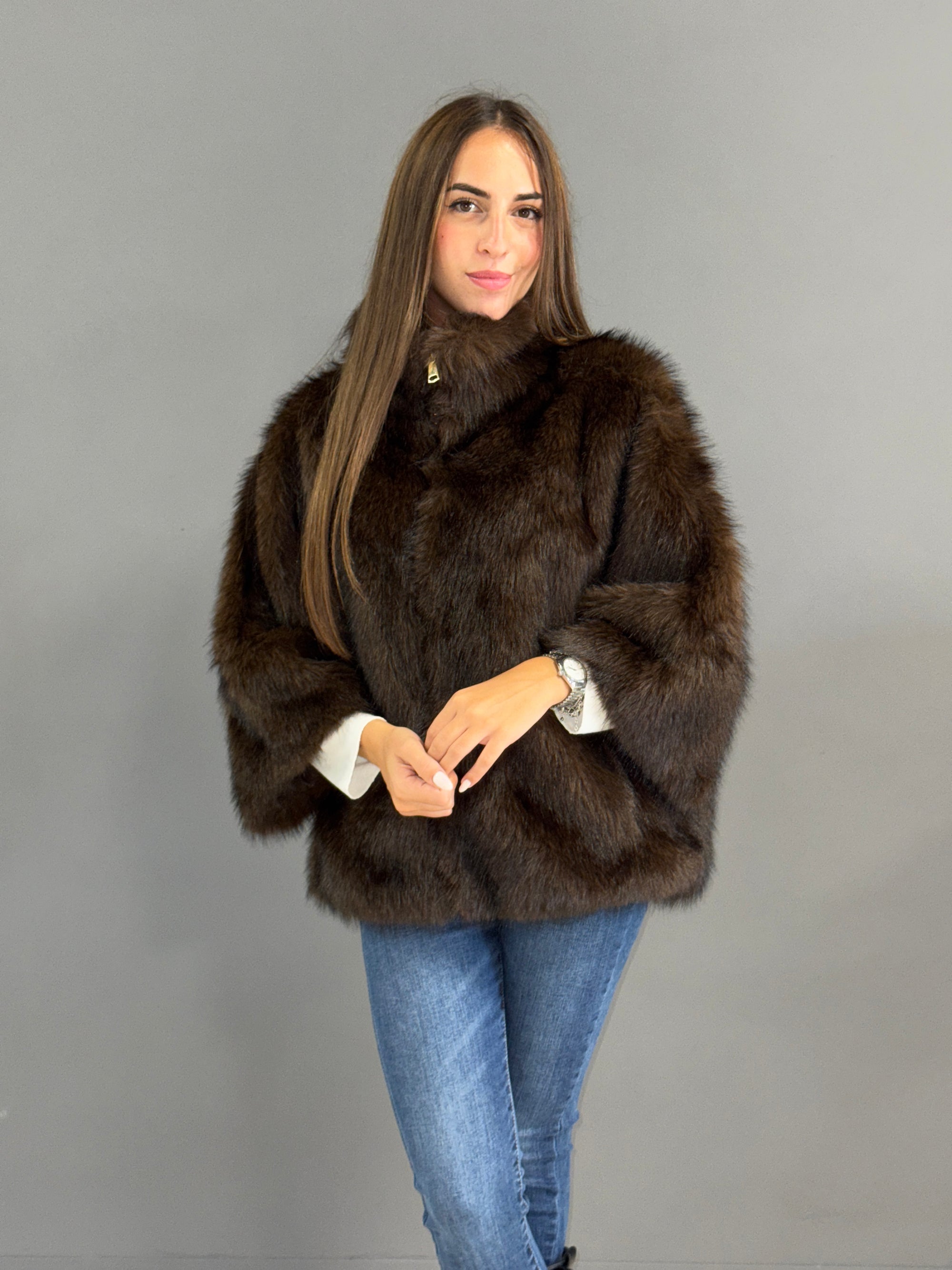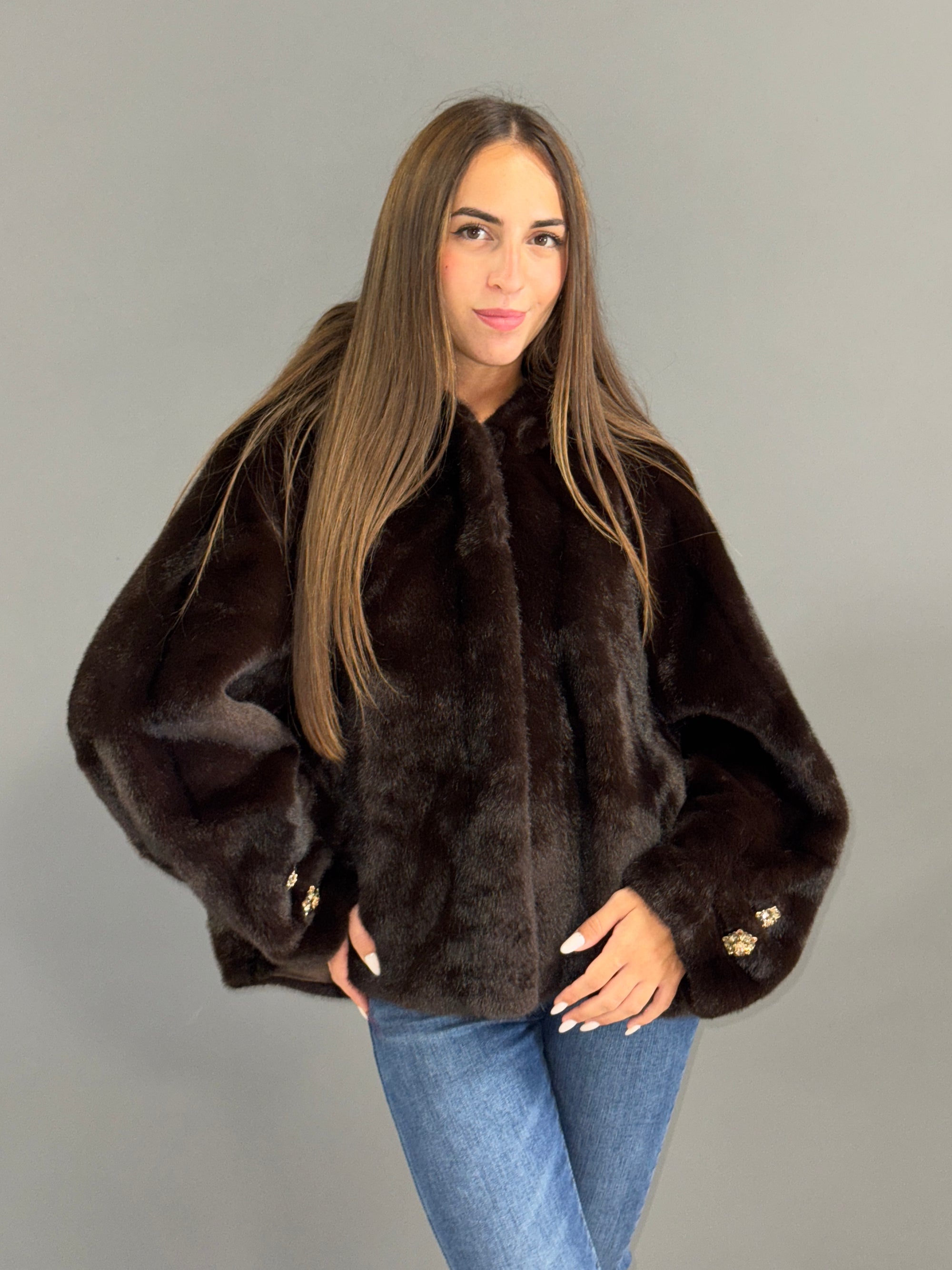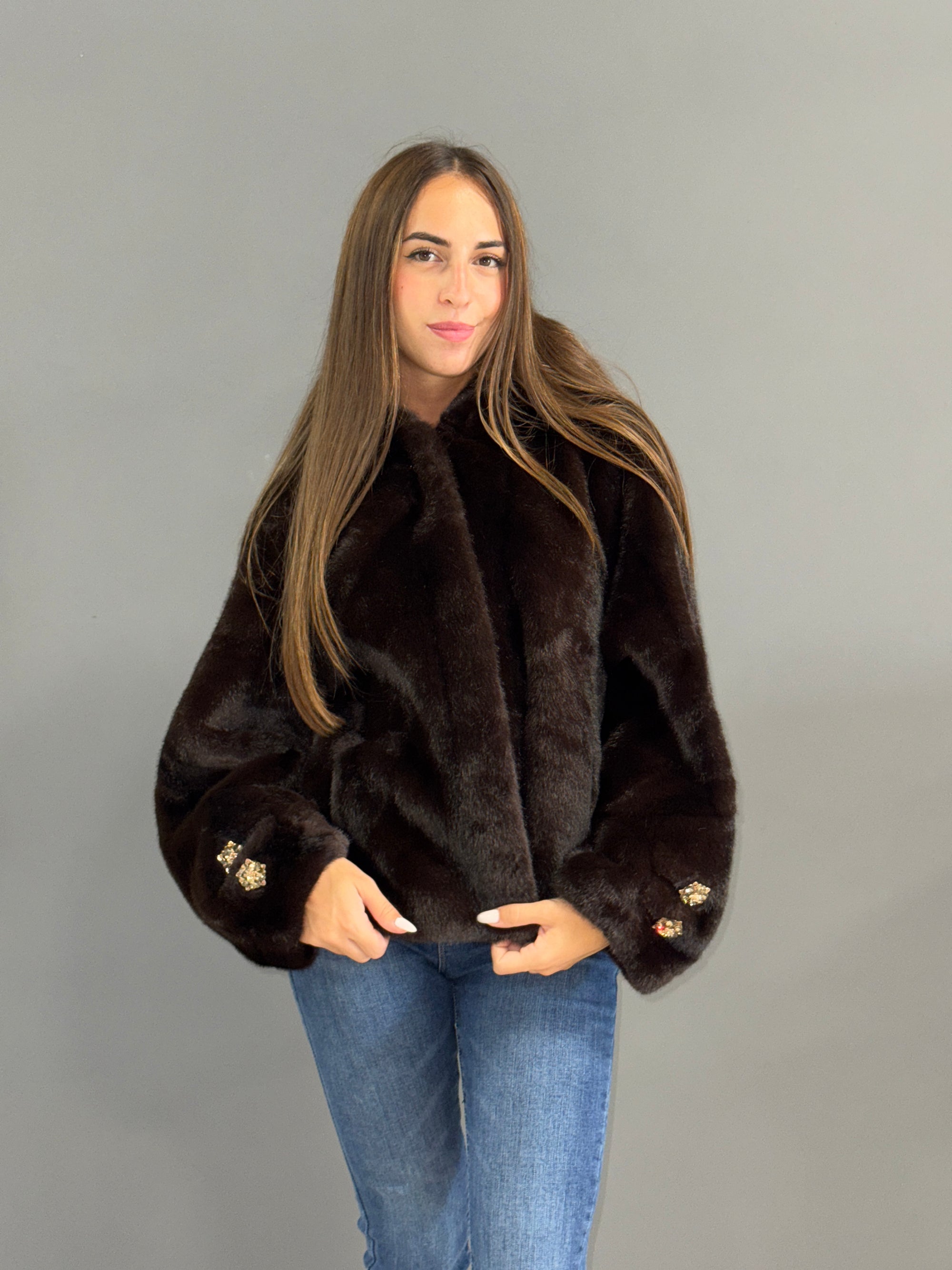 Giacca in ecopelliccia marrone con dettagli gioiello - Cortina
