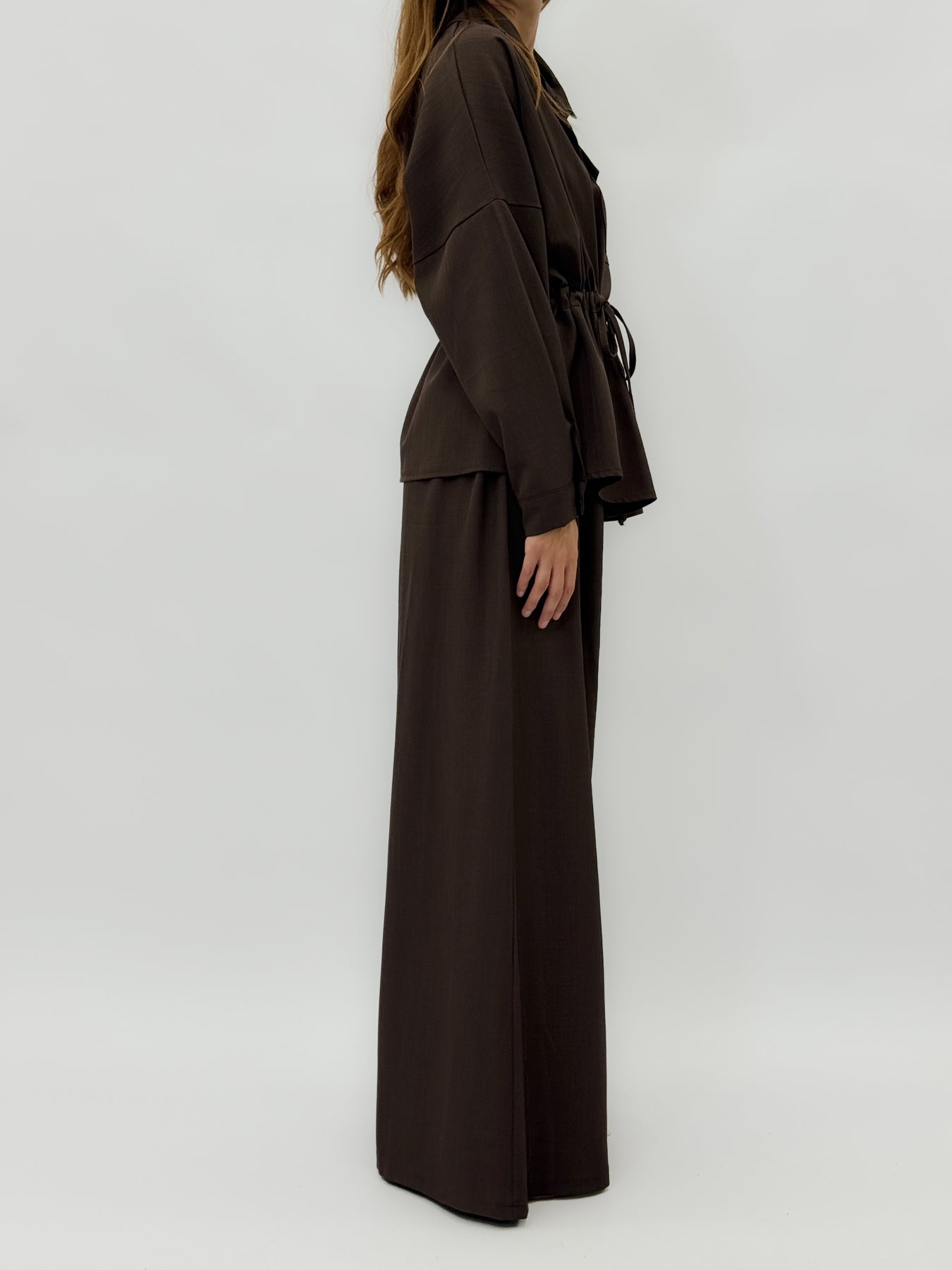 Completo coordinato in tessuto fluido, composto da camicia con colletto, taschini frontali e coulisse regolabile in vita per valorizzare la silhouette. I pantaloni ampi modello palazzo donano un tocco elegante e moderno, perfetto per look da ufficio, occasioni speciali o outfit chic da giorno.