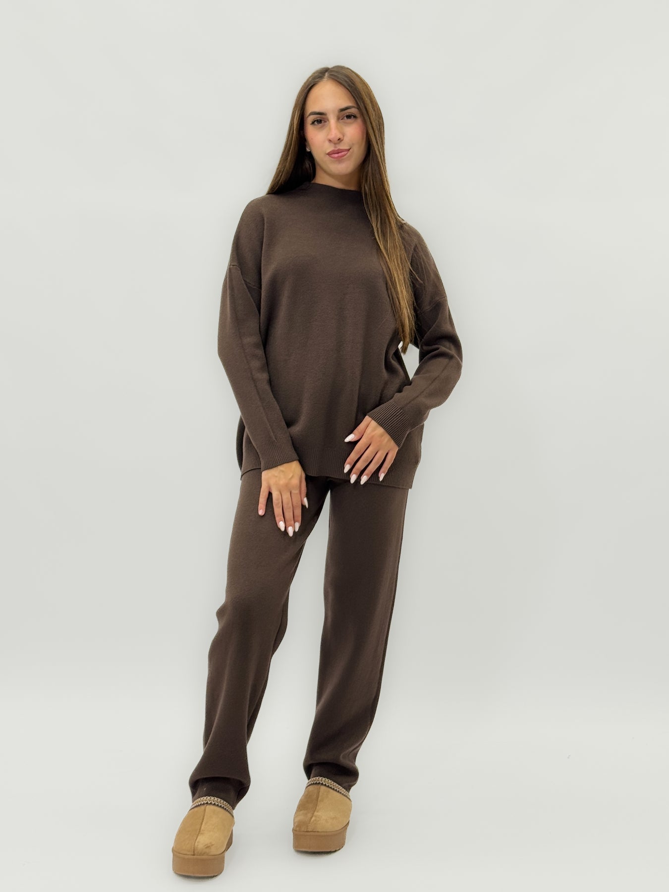 Completo donna in maglia, composto da maglione a collo alto morbido e pantalone lungo a gamba dritta. Stile comfy chic, ideale per la stagione fredda. Veste comodo.