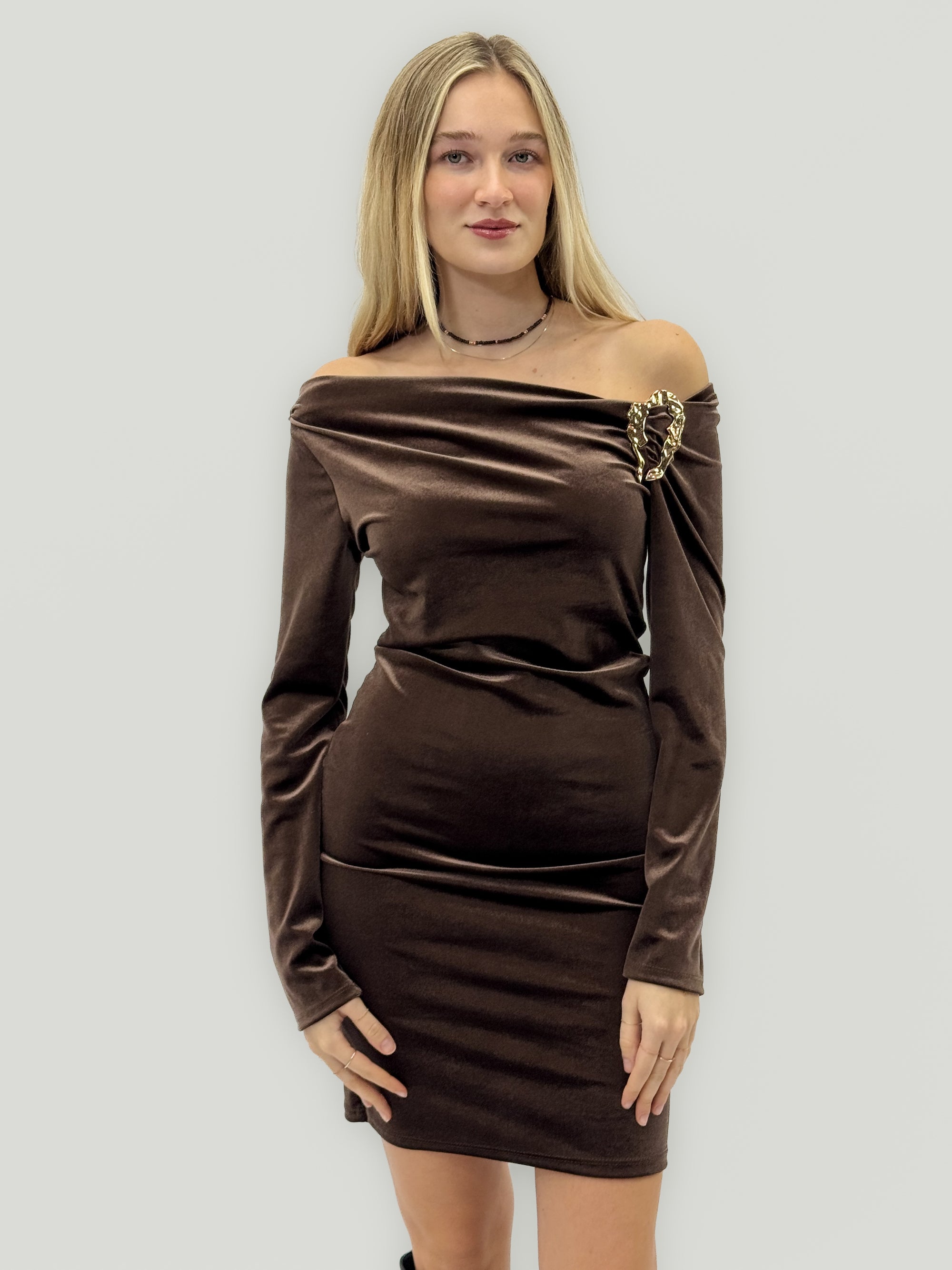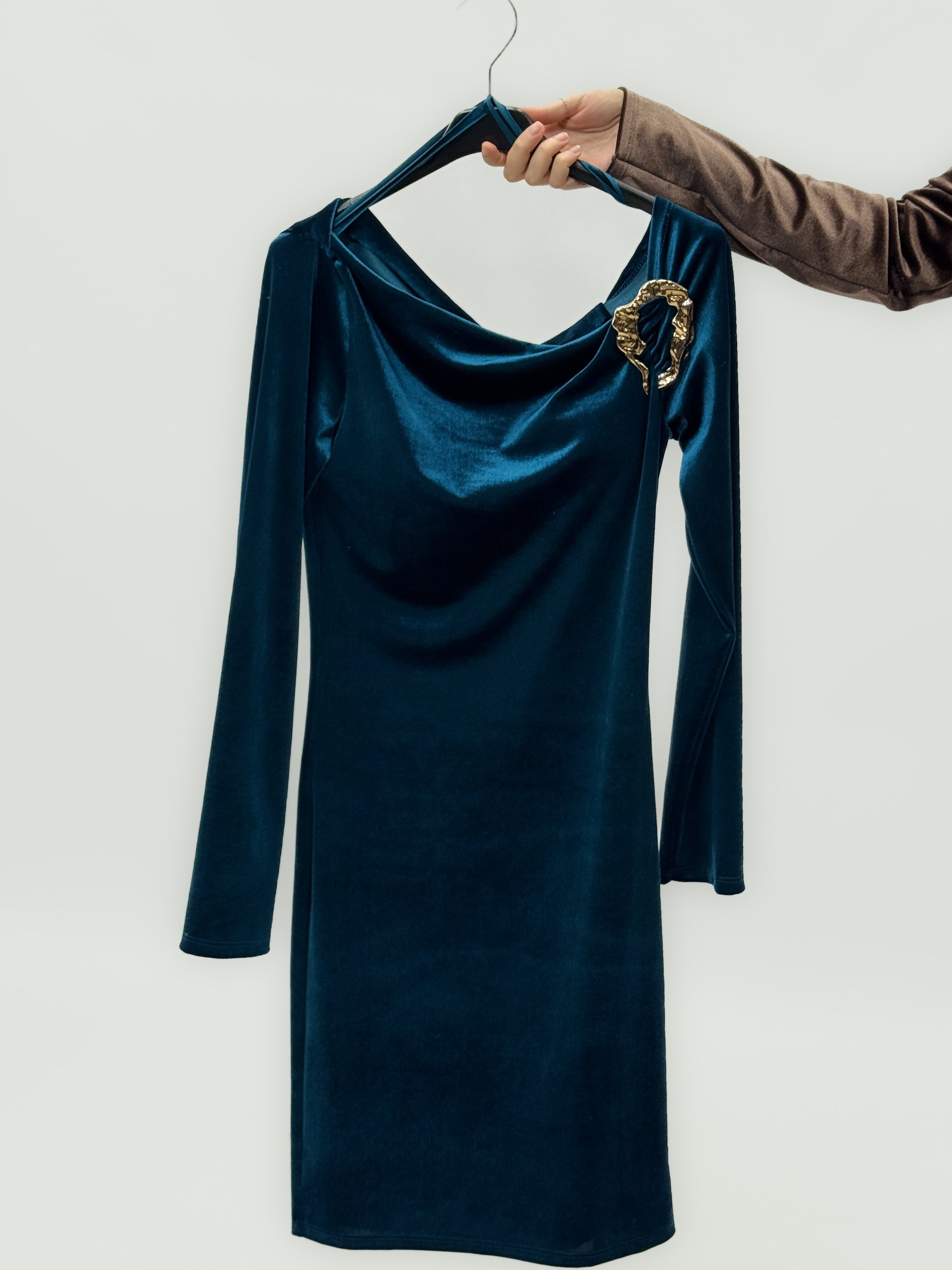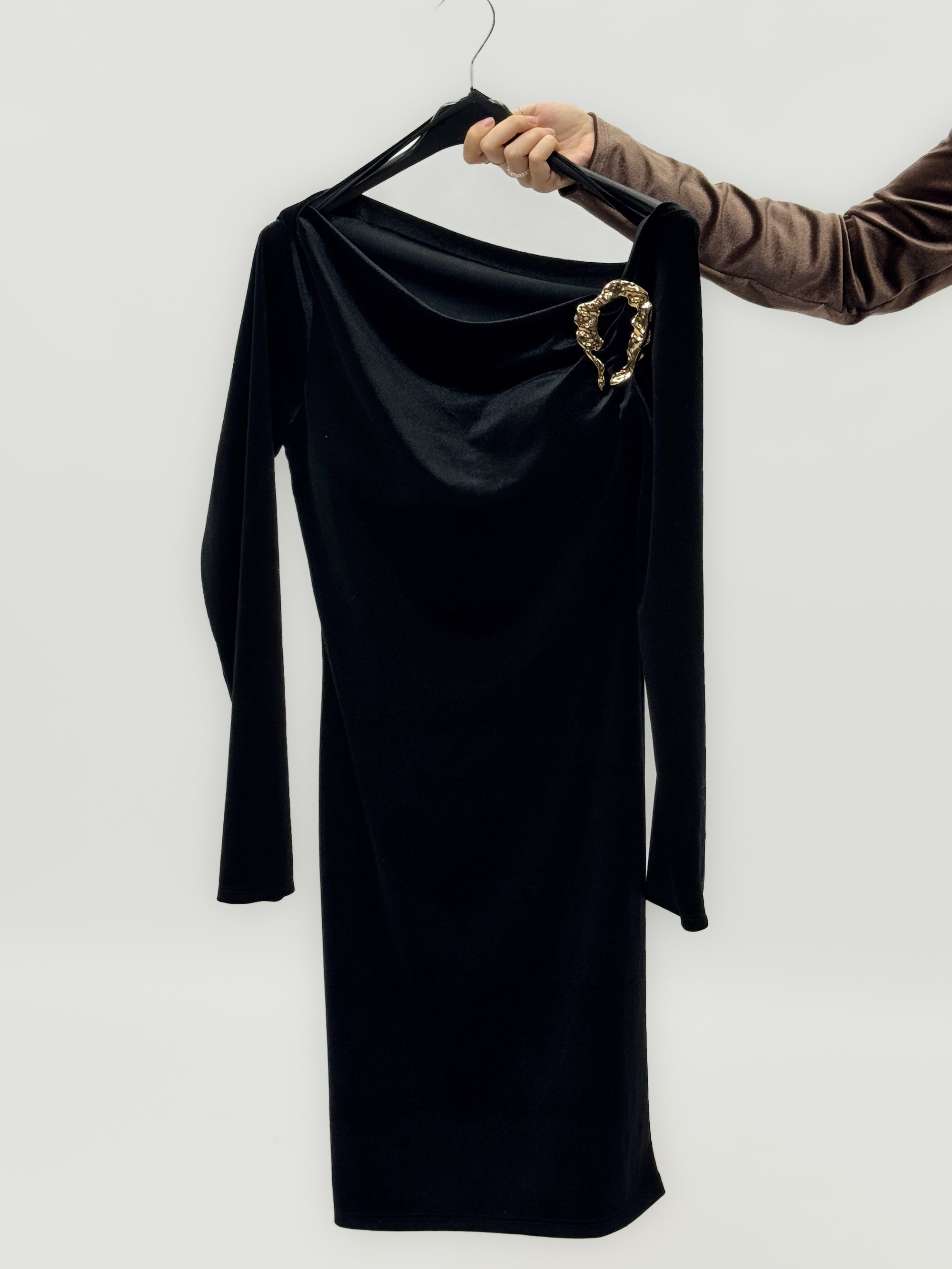 Abito corto in velluto con scollo monospalla e dettaglio gioiello