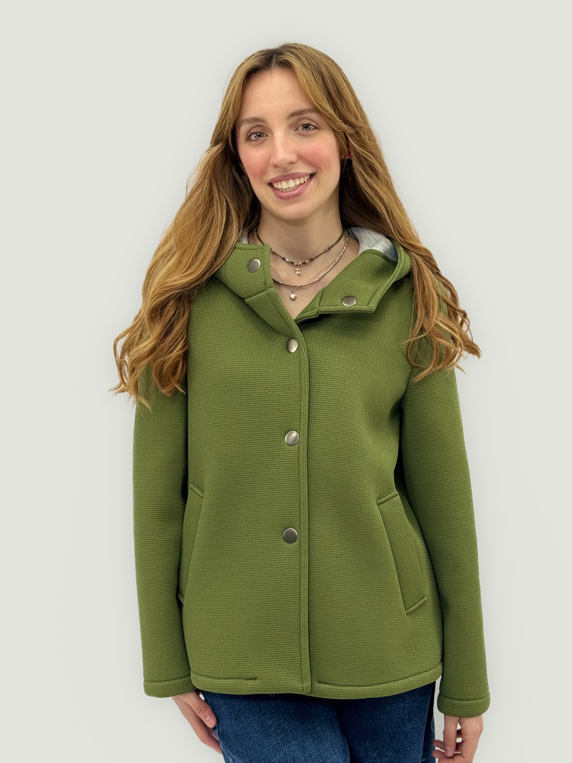 Cappotto in neoprene con cappuccio e bottoni