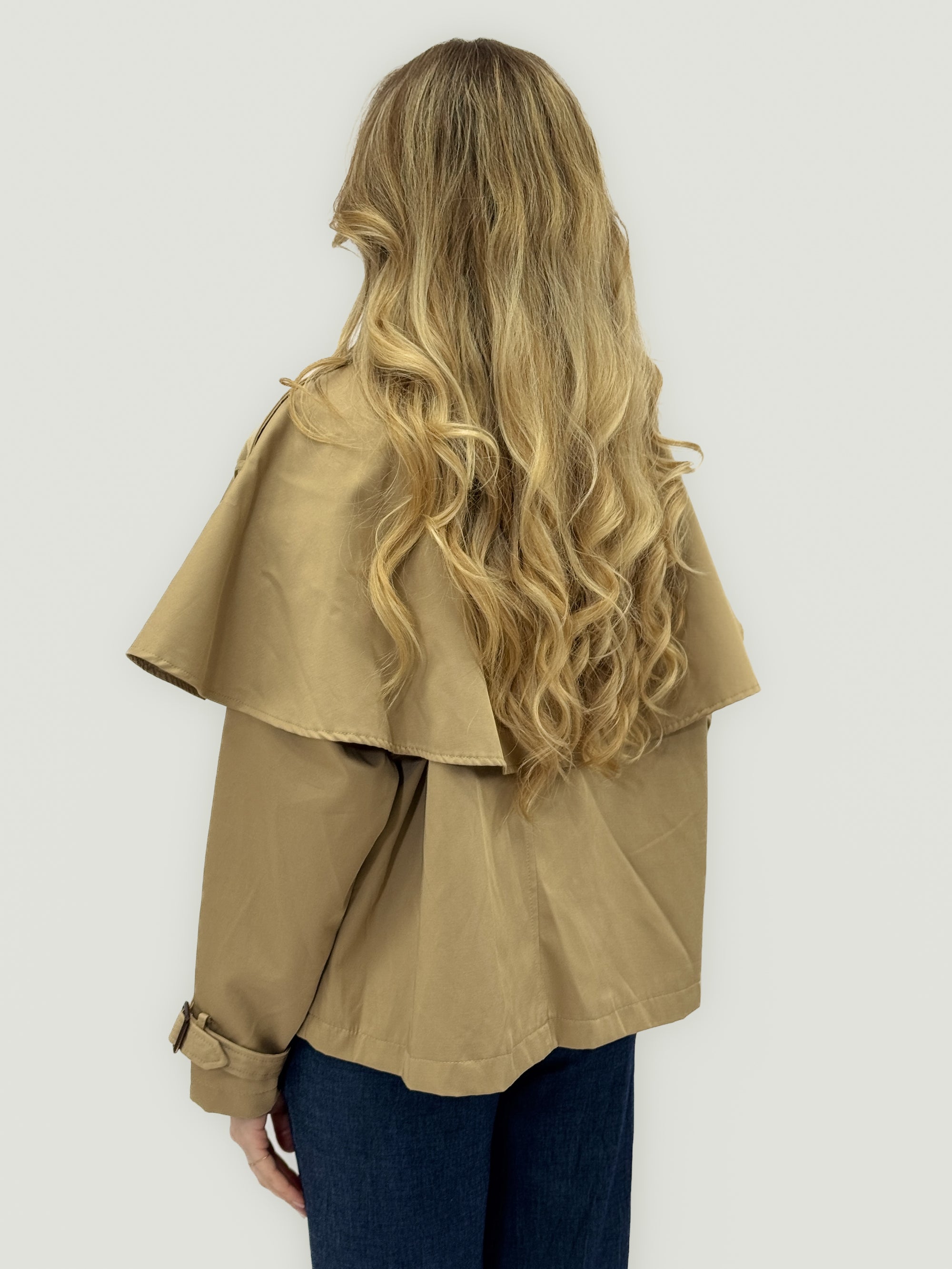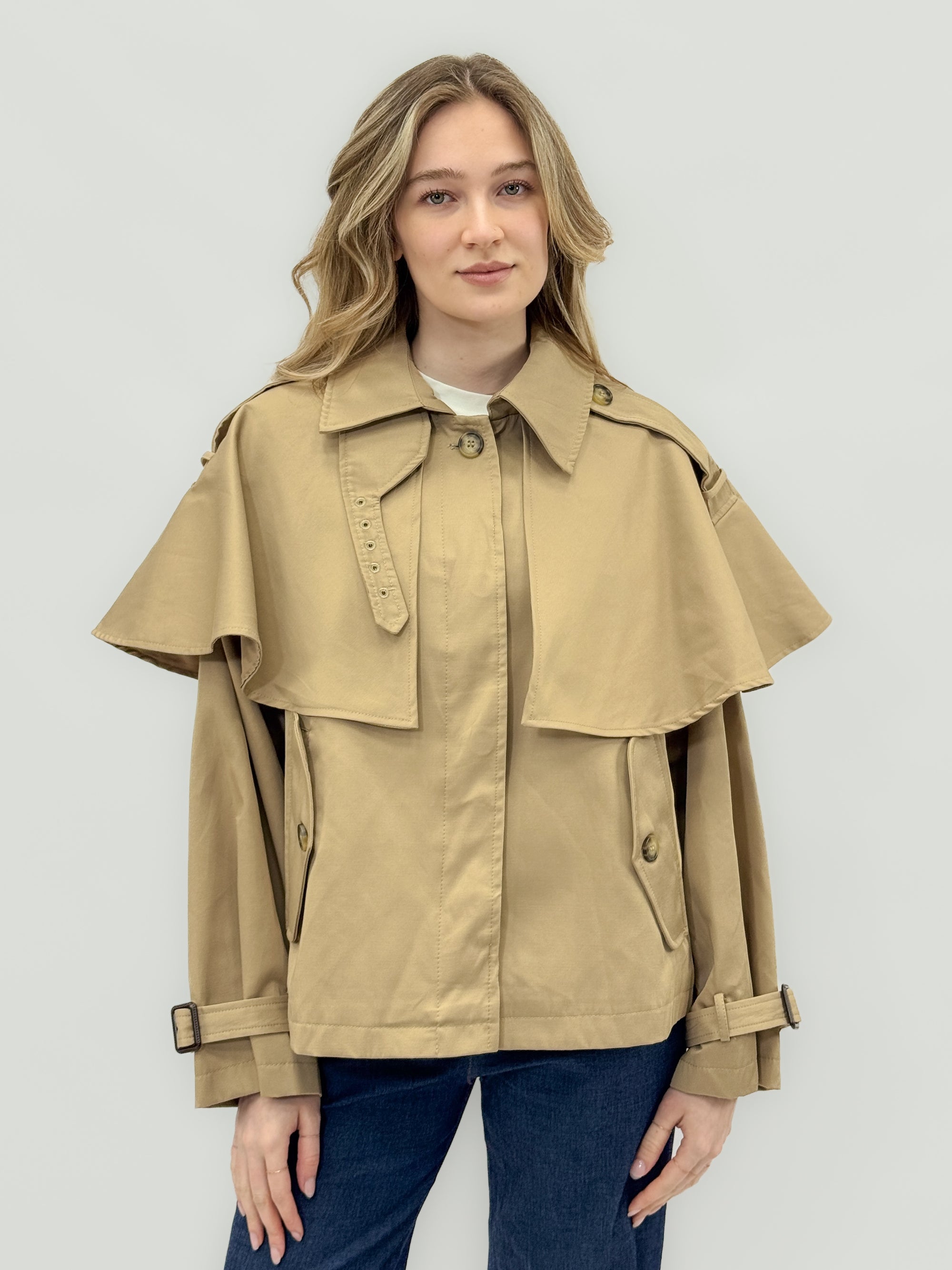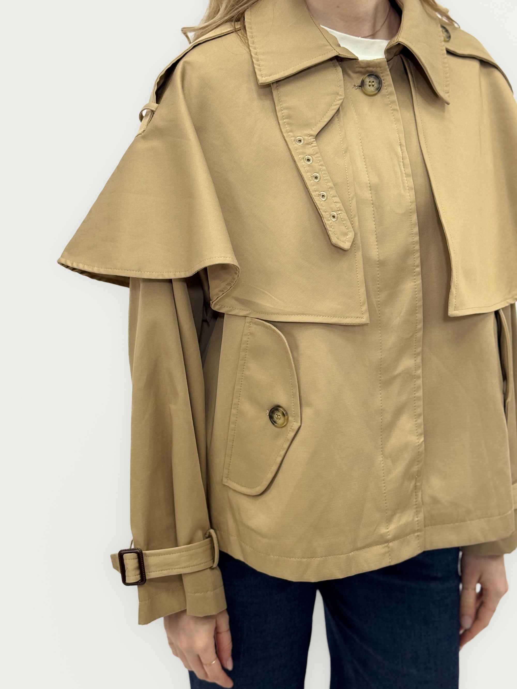 Giacca trench corta con mantella e dettagli regolabili