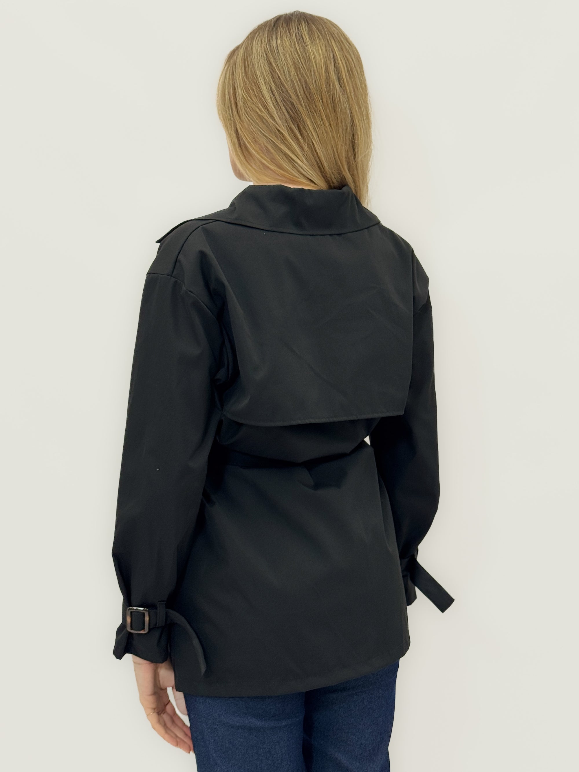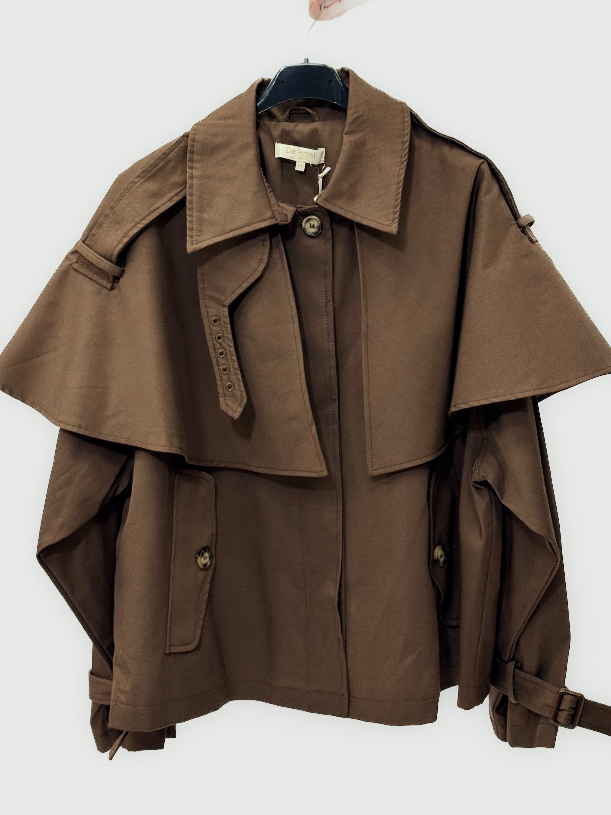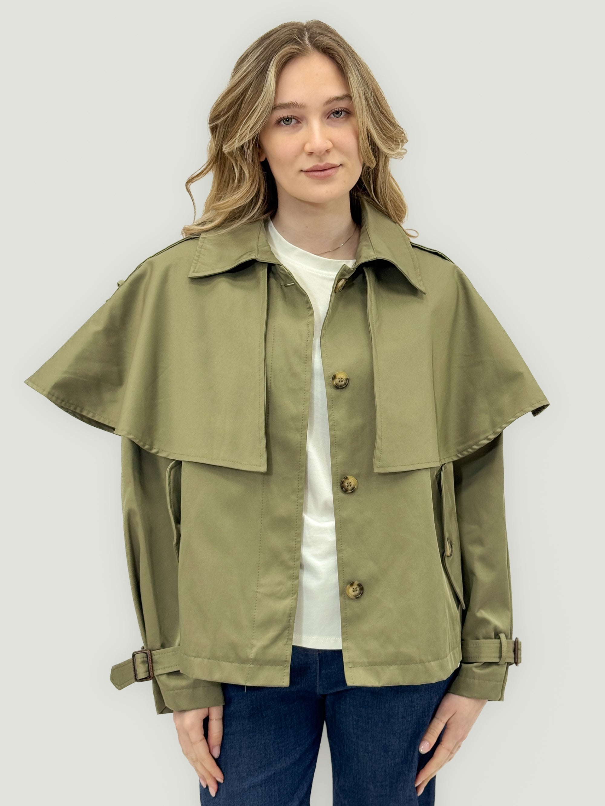 Giacca trench corta con mantella e dettagli regolabili