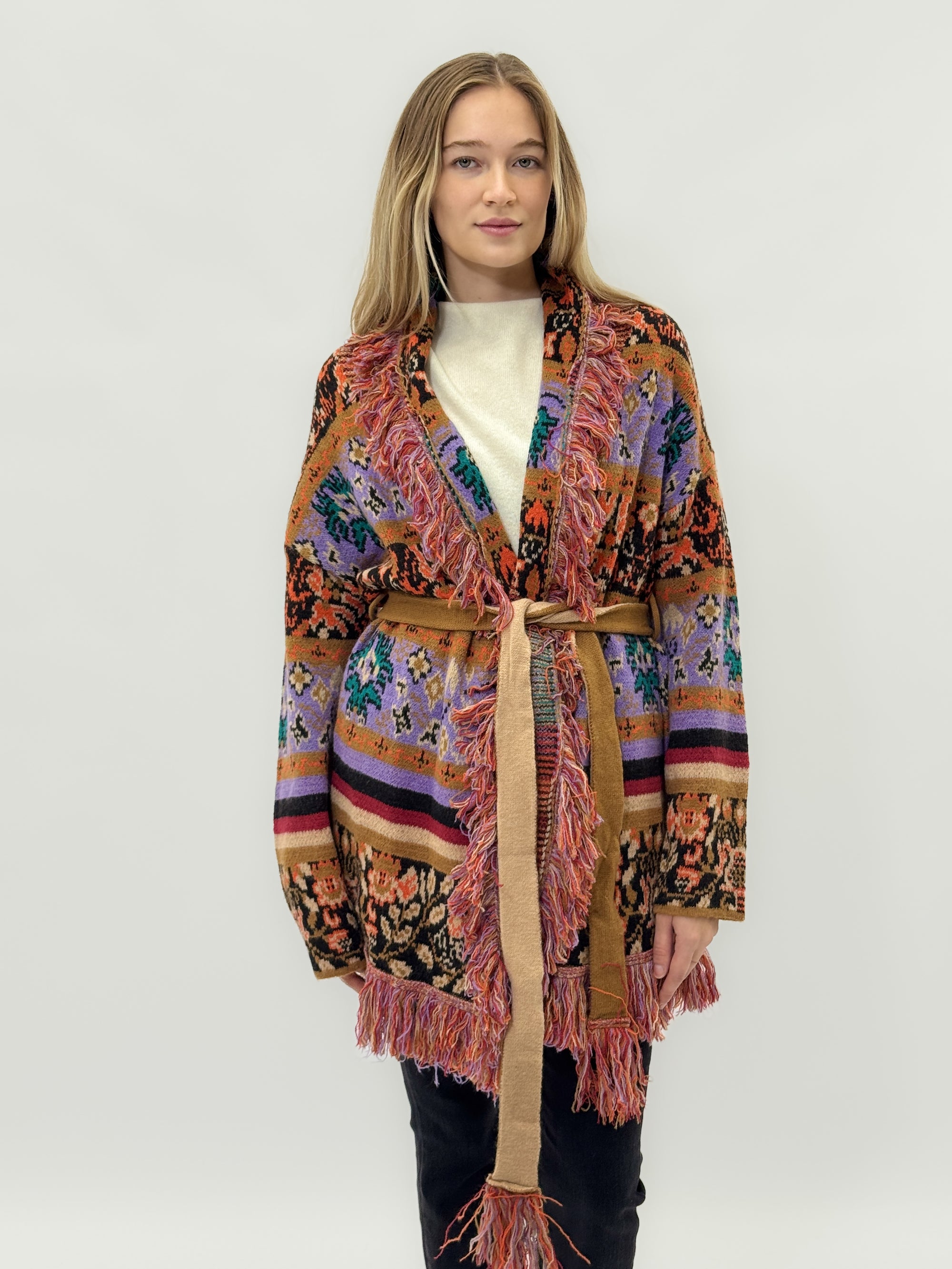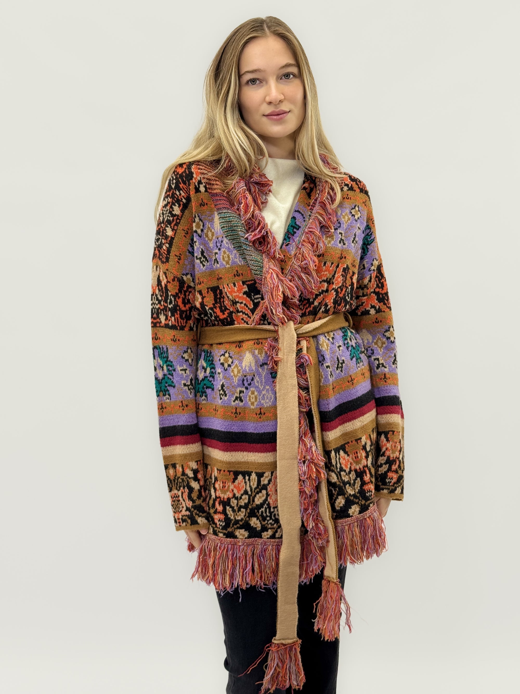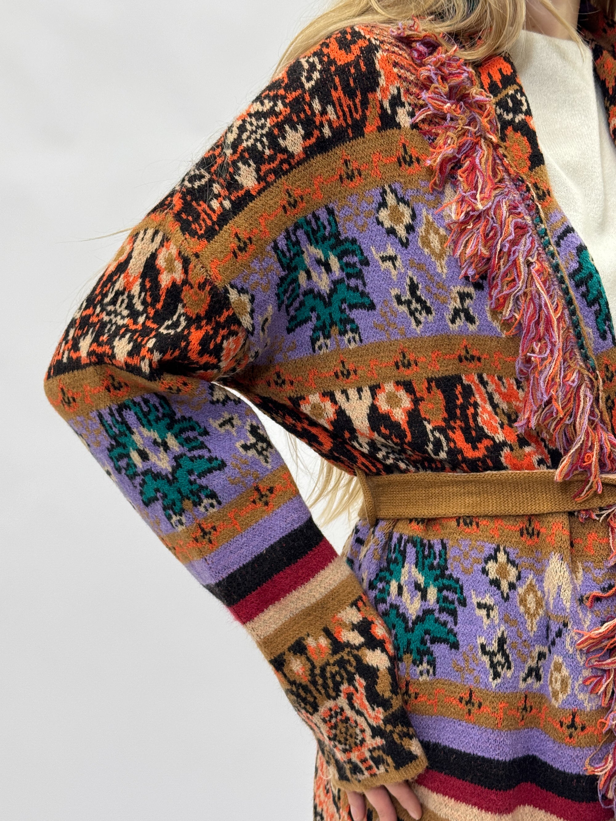 Cardigan fantasia etnica con frange e cintura – Stile boho chic
