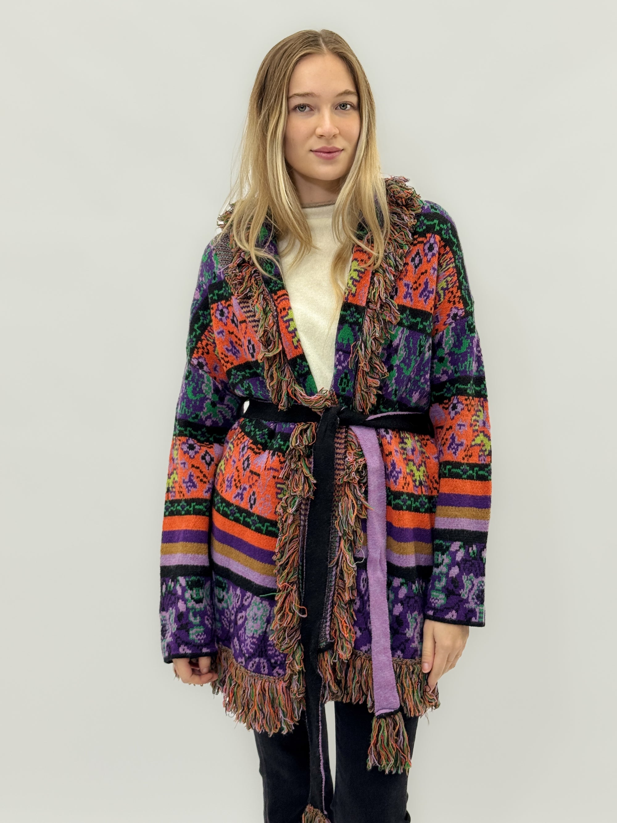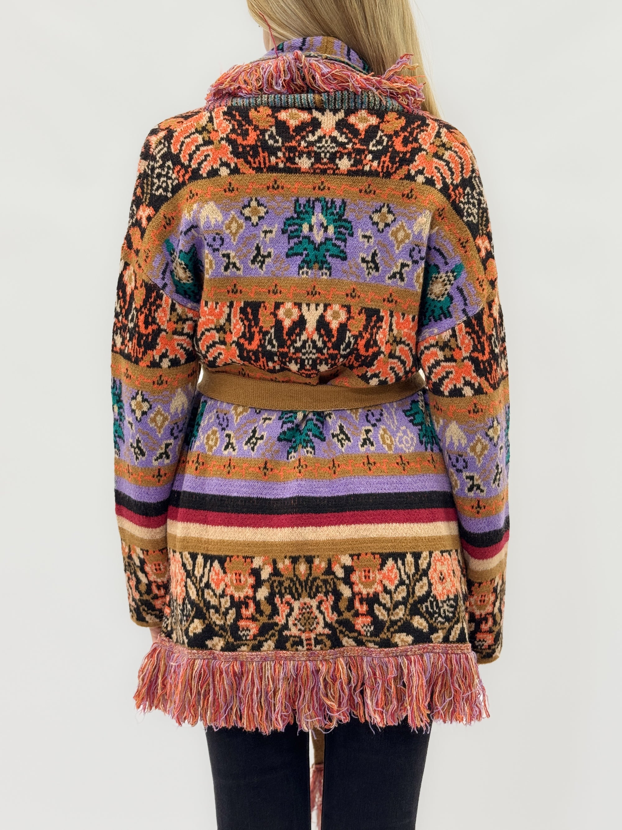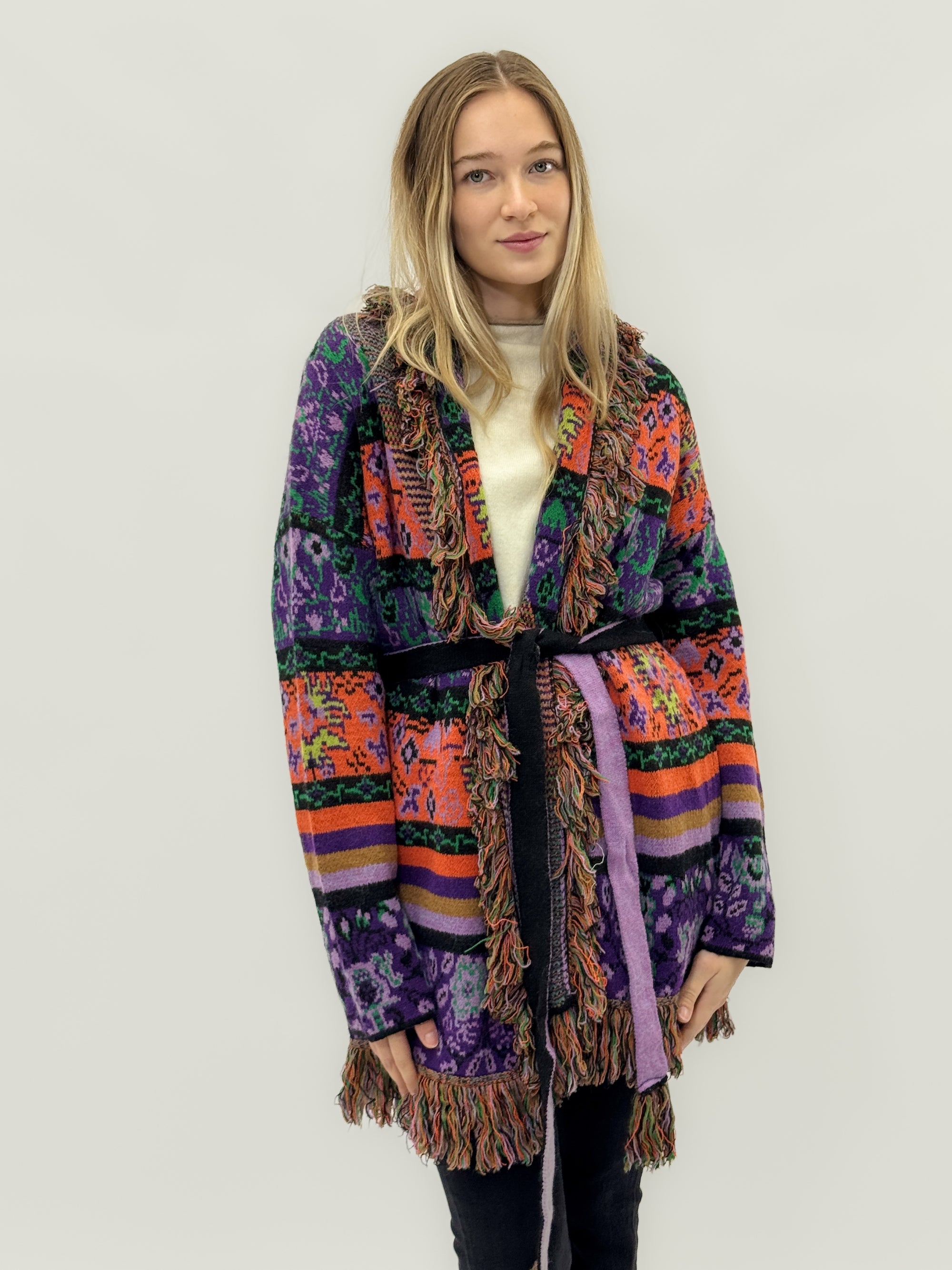 Cardigan fantasia etnica con frange e cintura – Stile boho chic