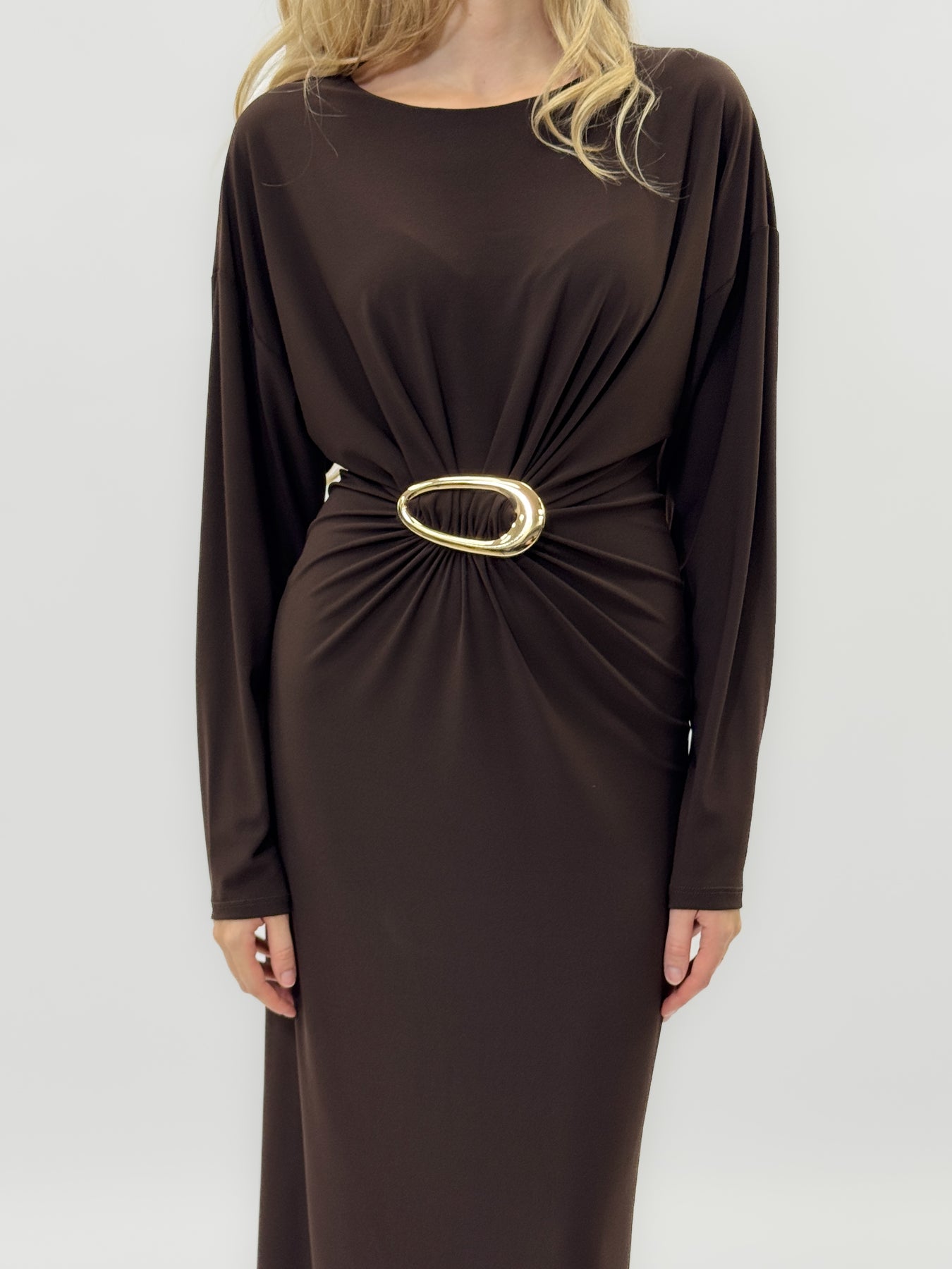Un abito lungo e sofisticato che unisce comfort e stile. Realizzato in tessuto fluido e morbido, valorizza la figura grazie al dettaglio della cintura dorata in vita, che crea un elegante effetto drappeggiato. Le maniche lunghe e la linea dritta donano un’eleganza minimal e raffinata, perfetta per ogni occasione speciale.