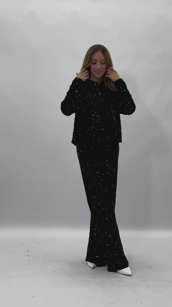 Completo felpa a zip con cappuccio e pantaloni in paillettes. Elasticizzato.