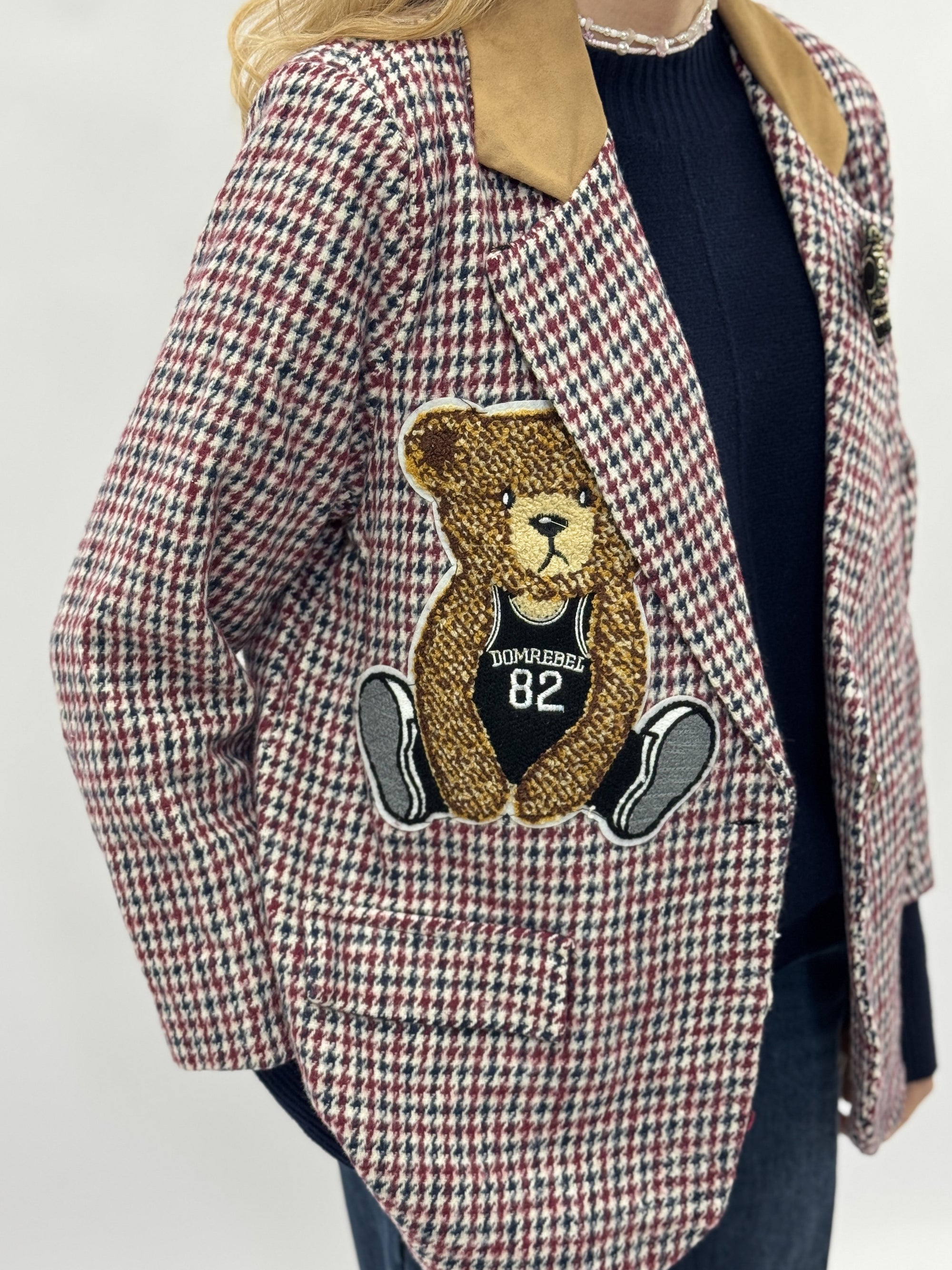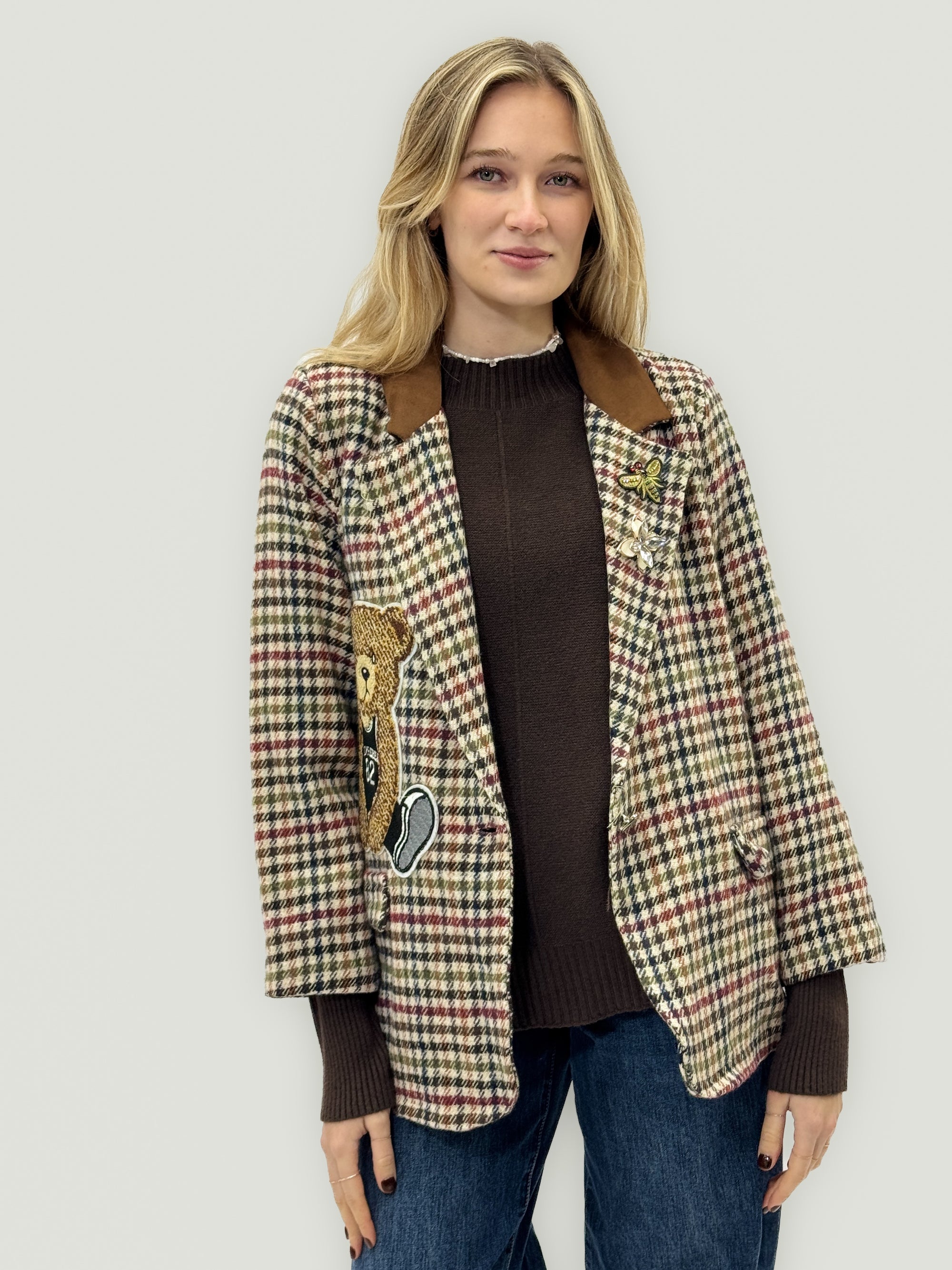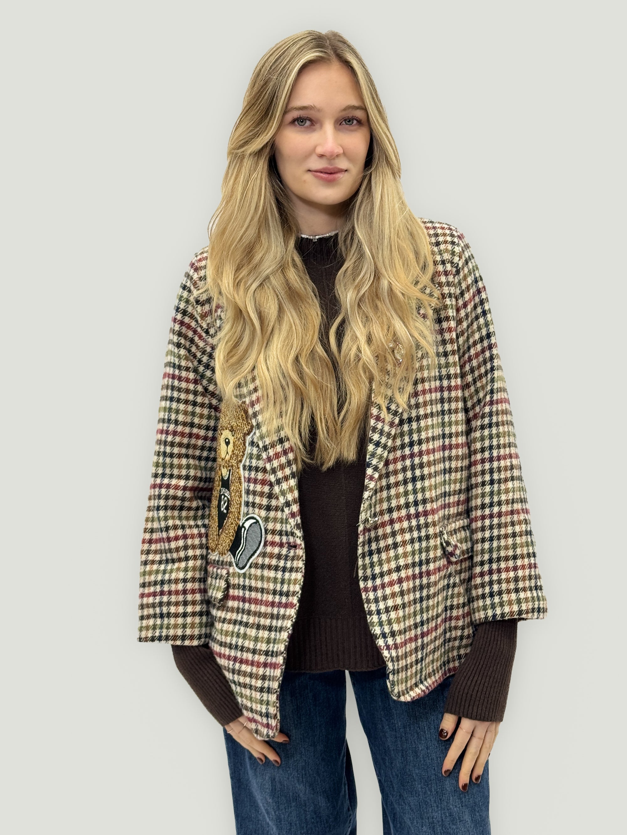 Giacca check con patch teddy – Stile Iconico & Casual Chic