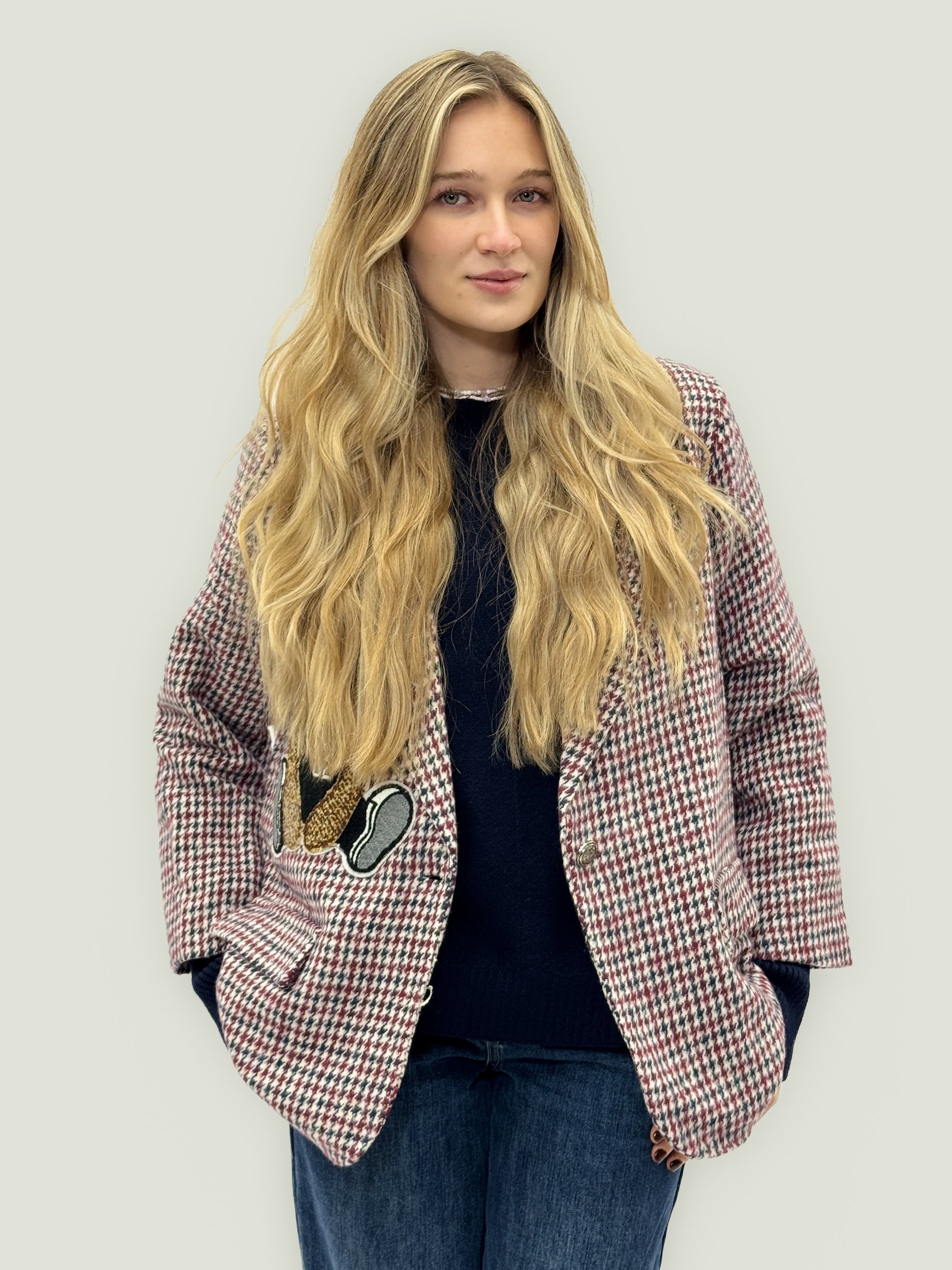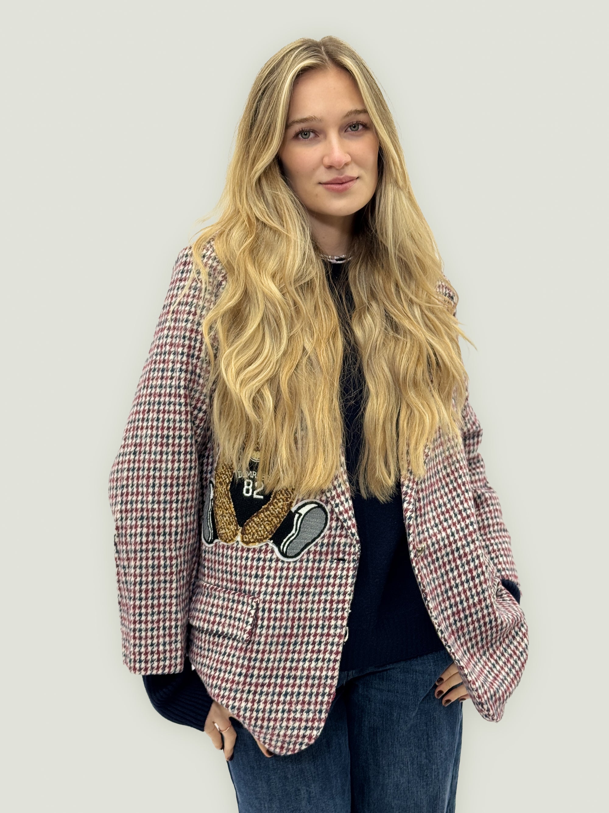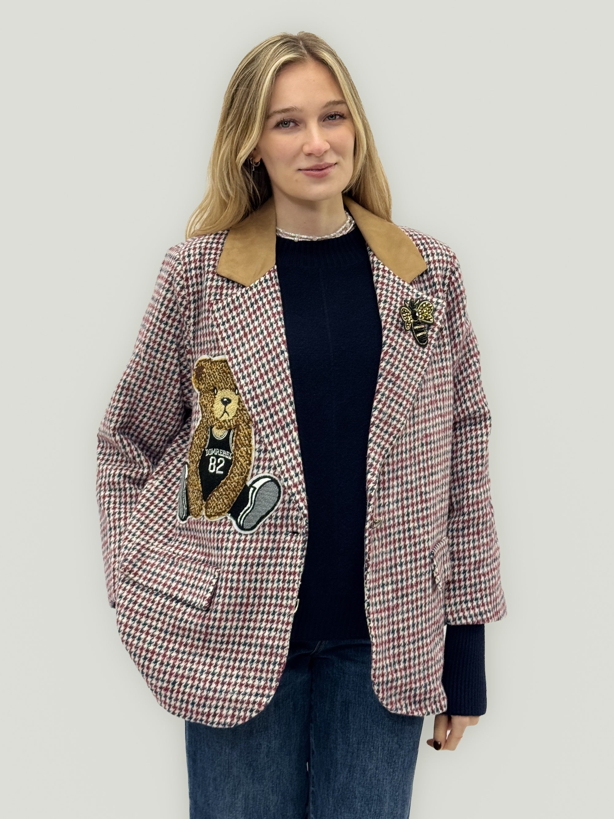 Giacca check con patch teddy – Stile Iconico & Casual Chic