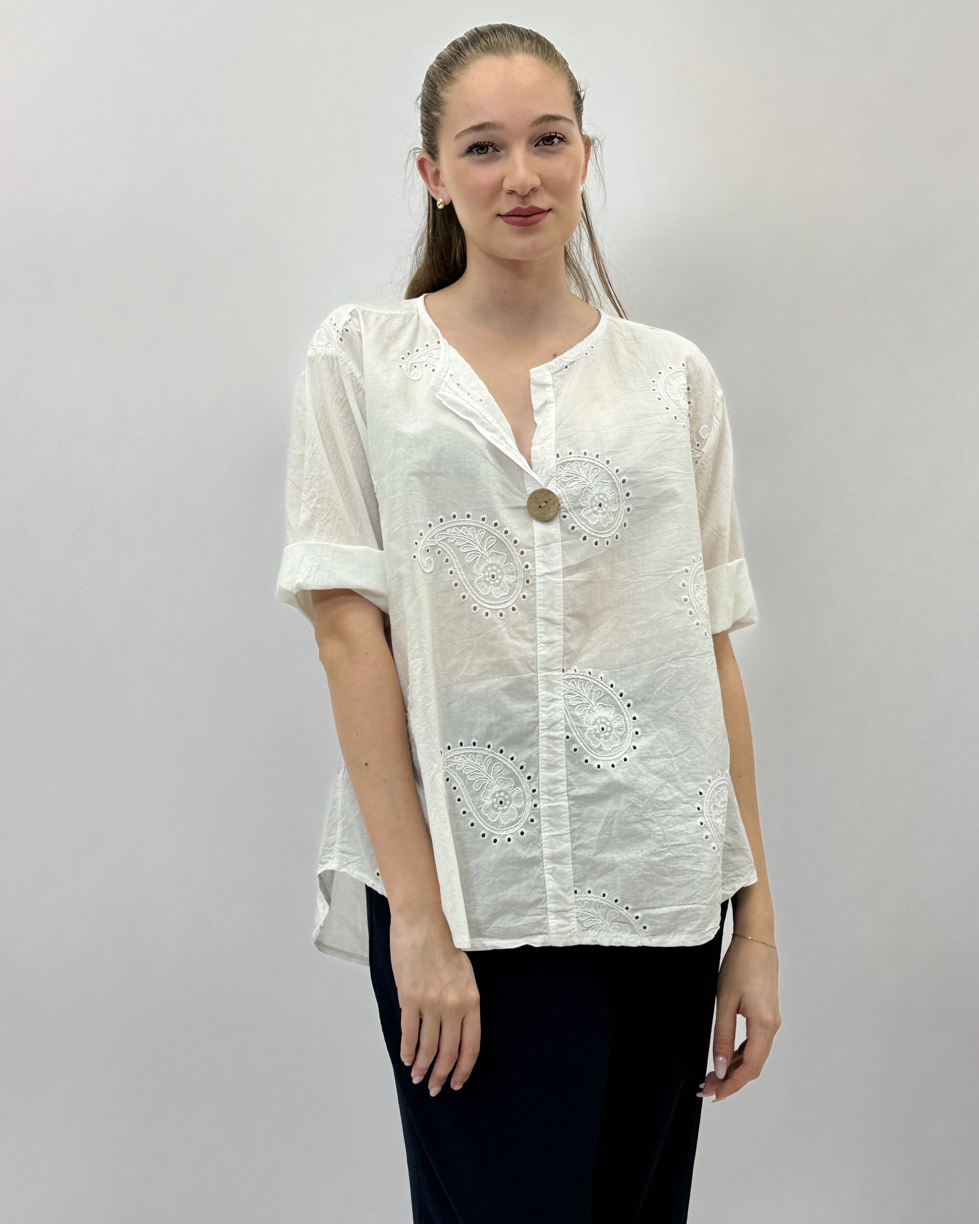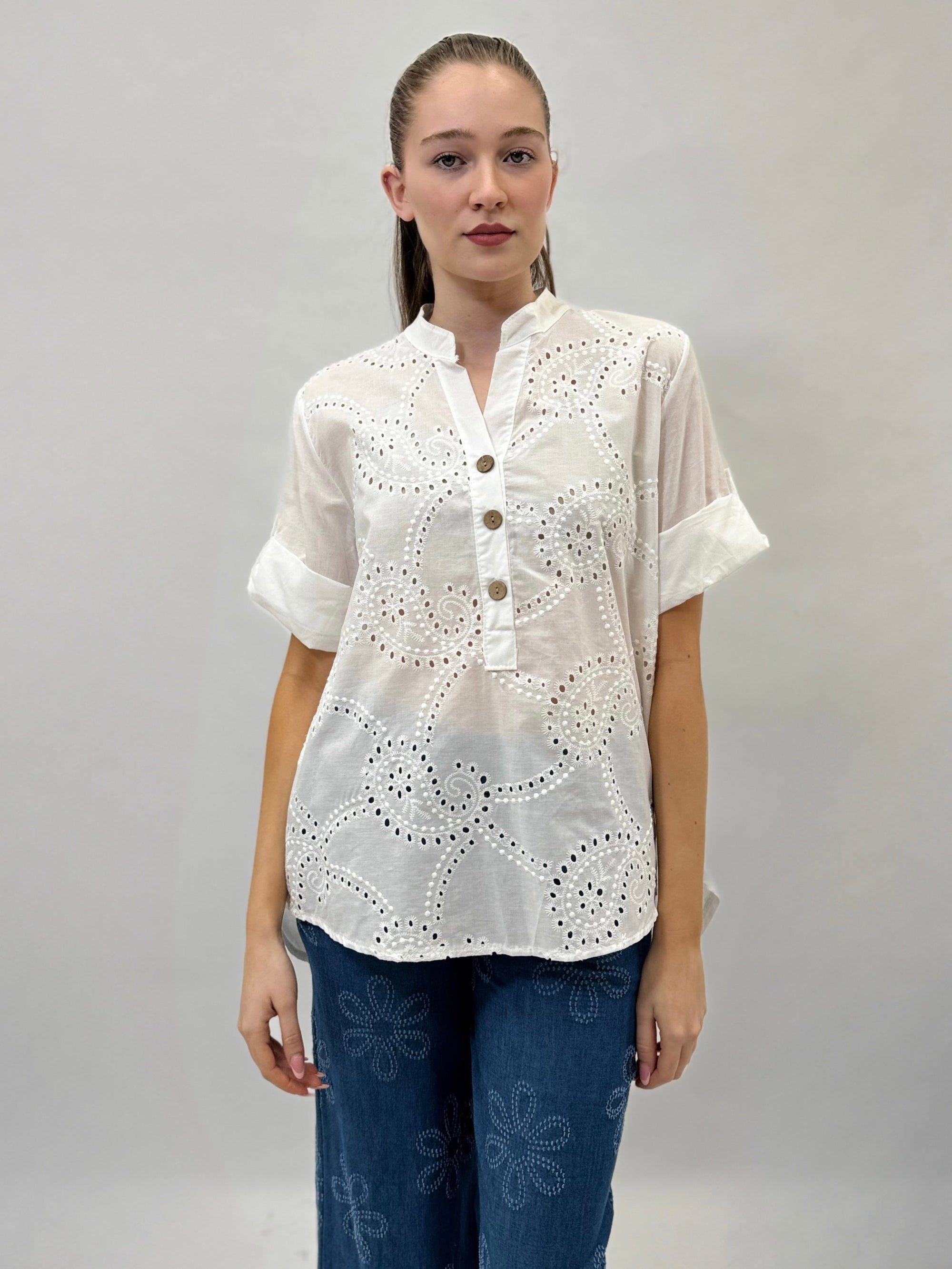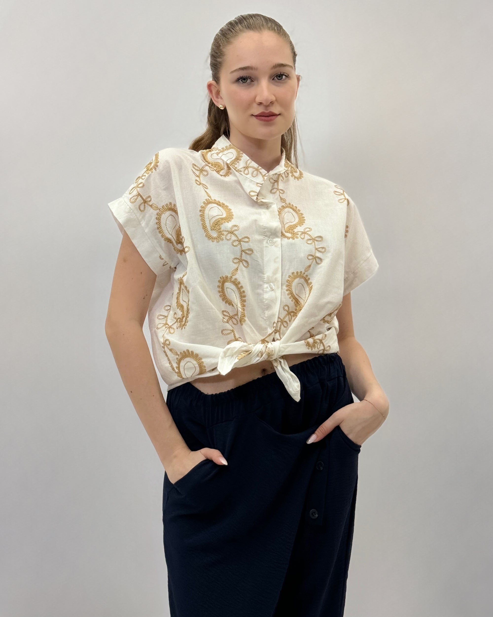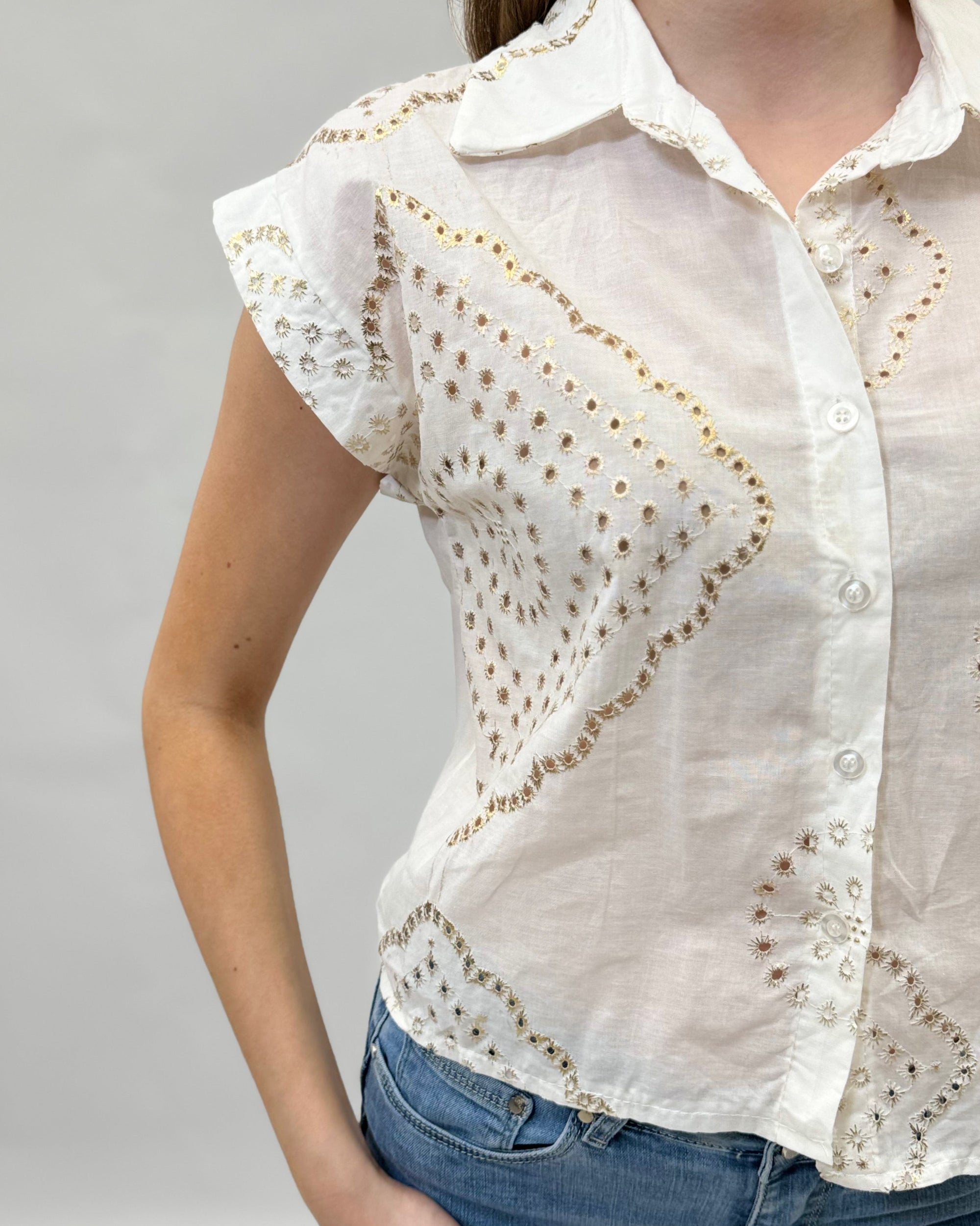 Camicia mezze maniche in pizzo con dettagli dorati