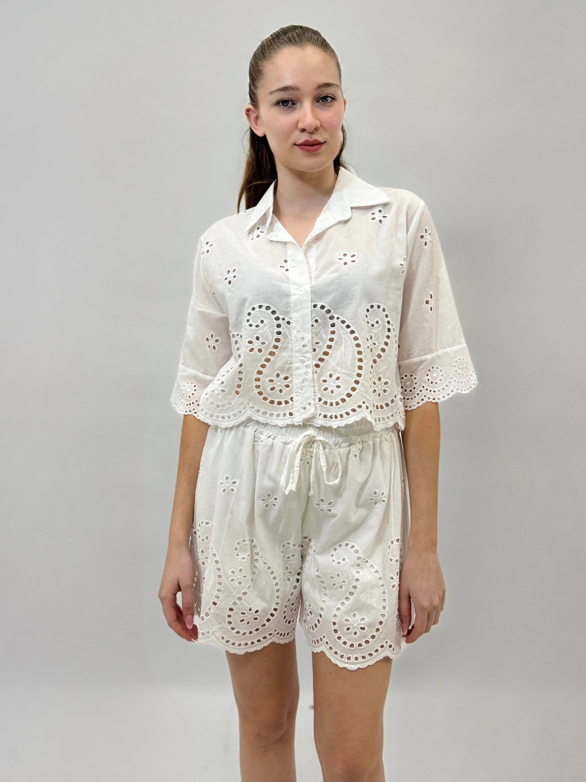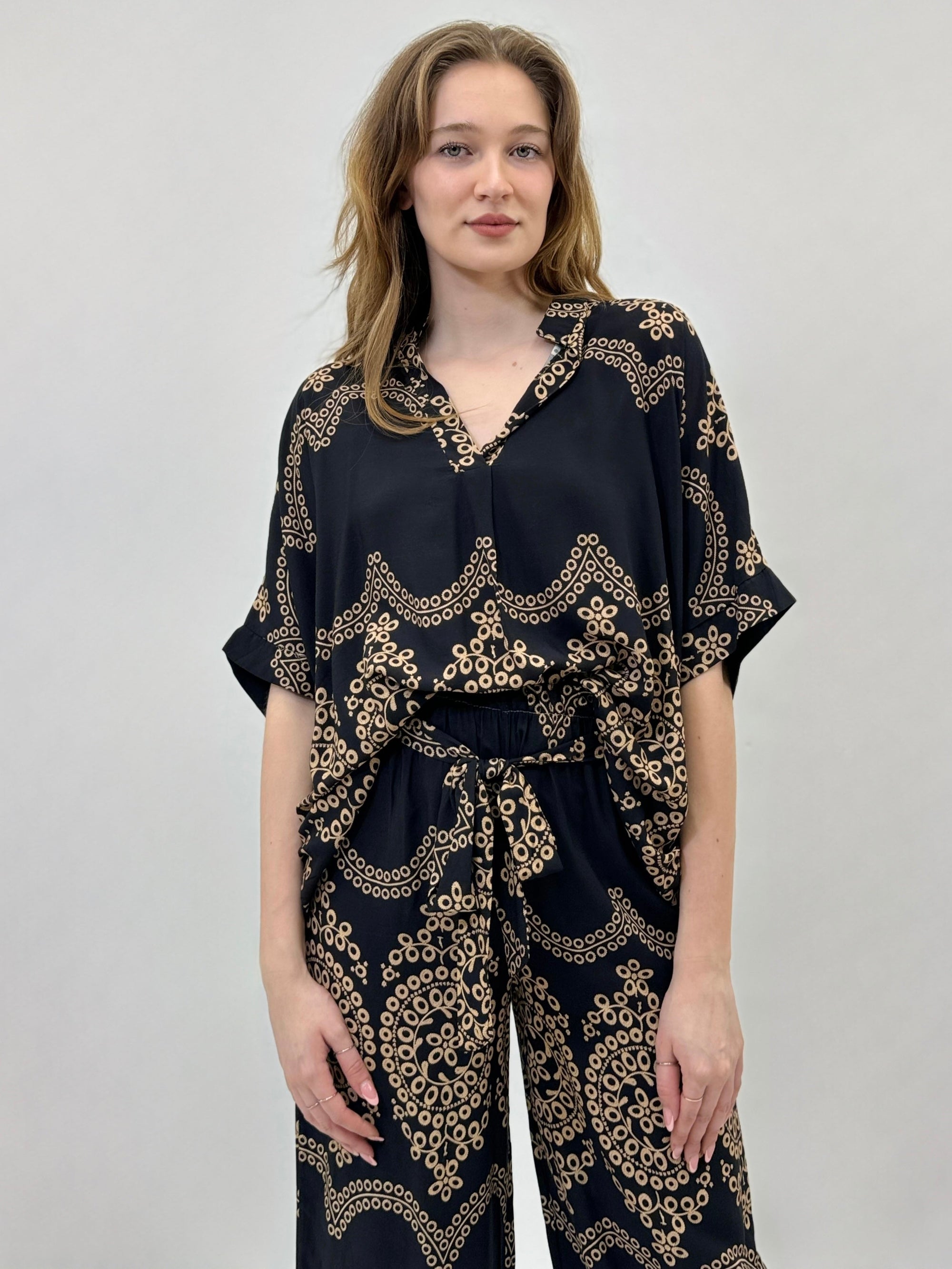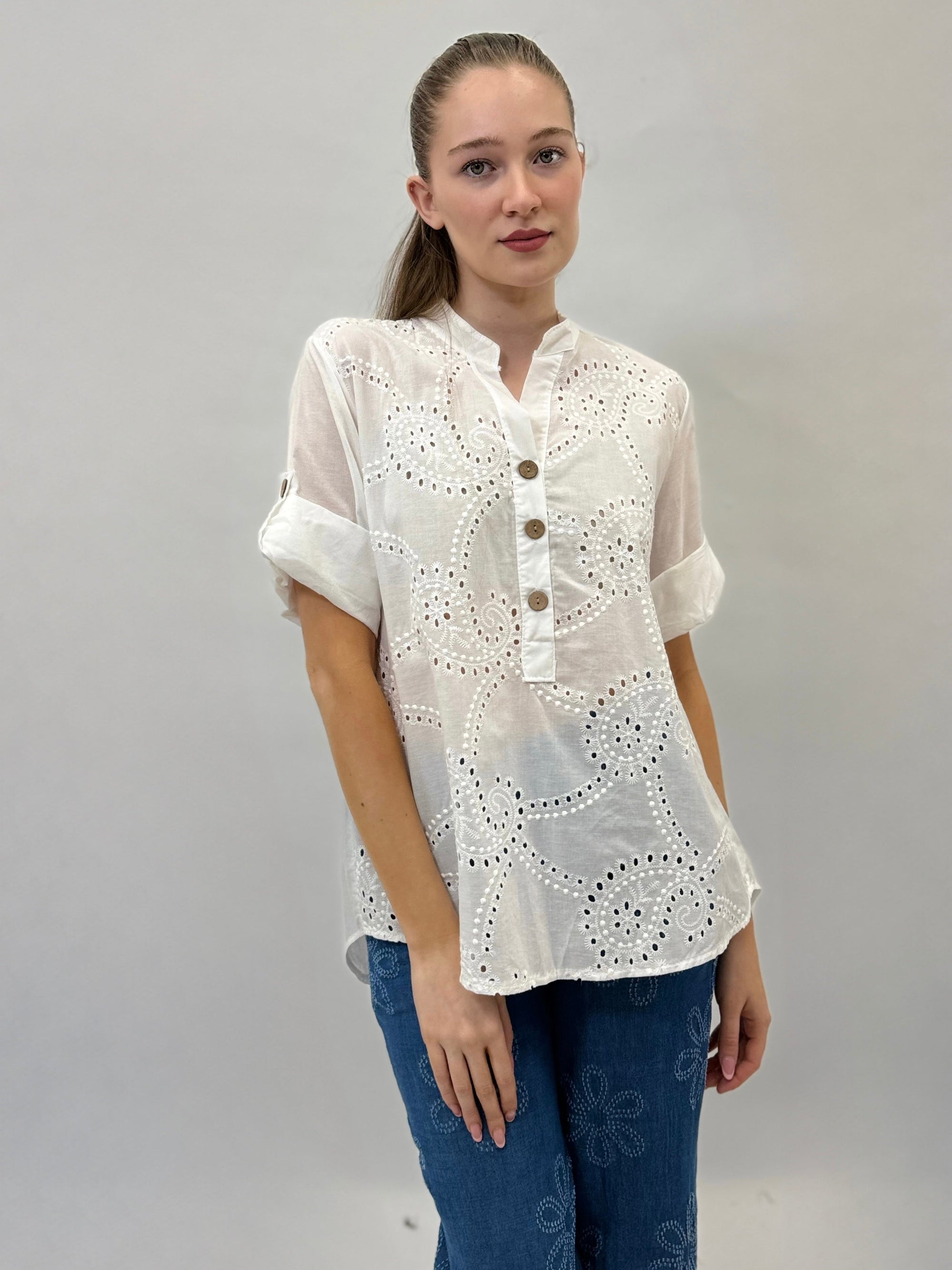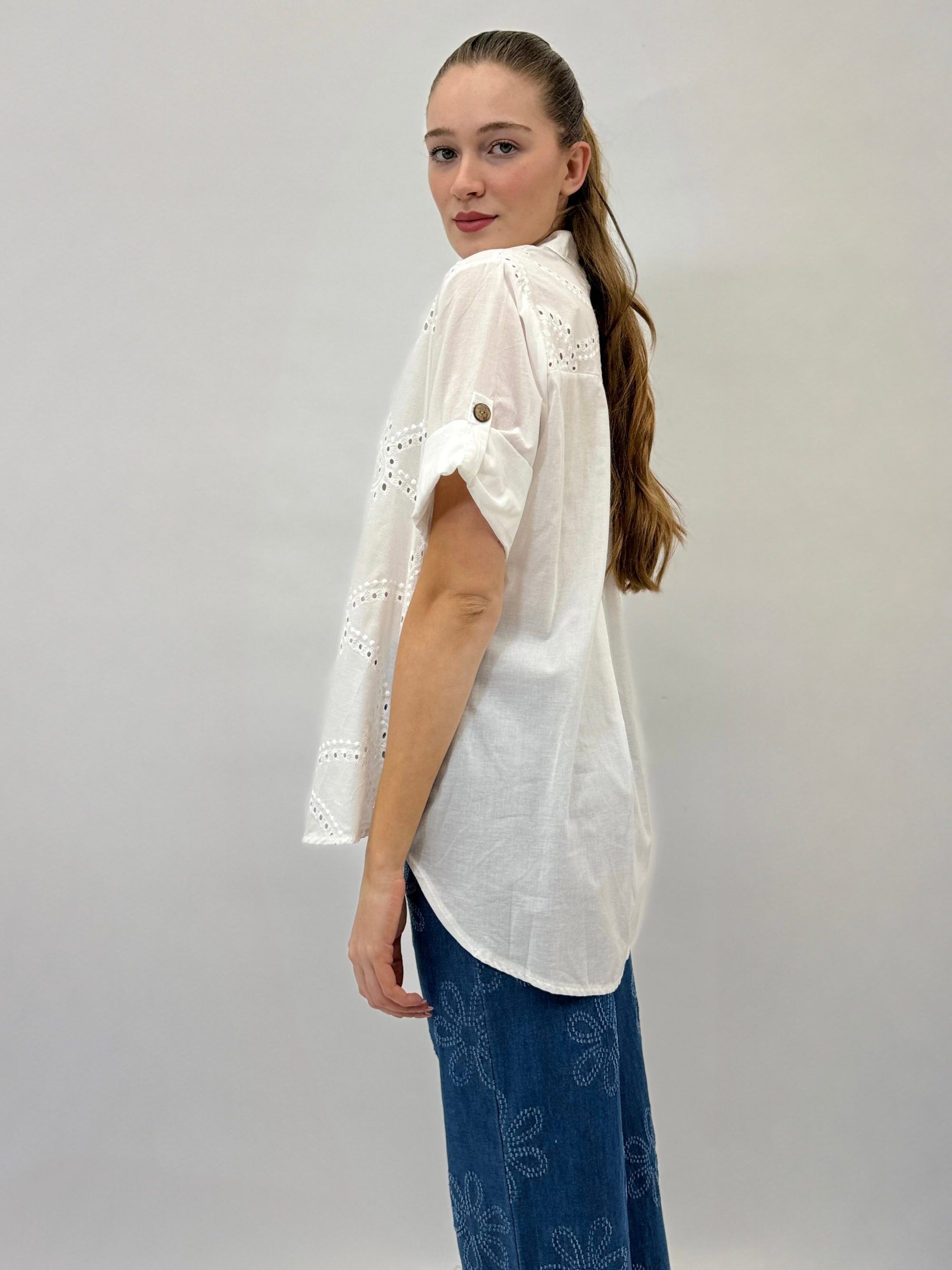 Camicia mezze maniche in pizzo con dettagli dorati