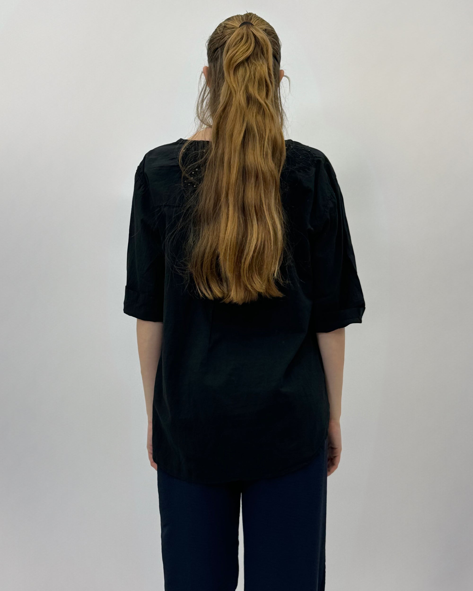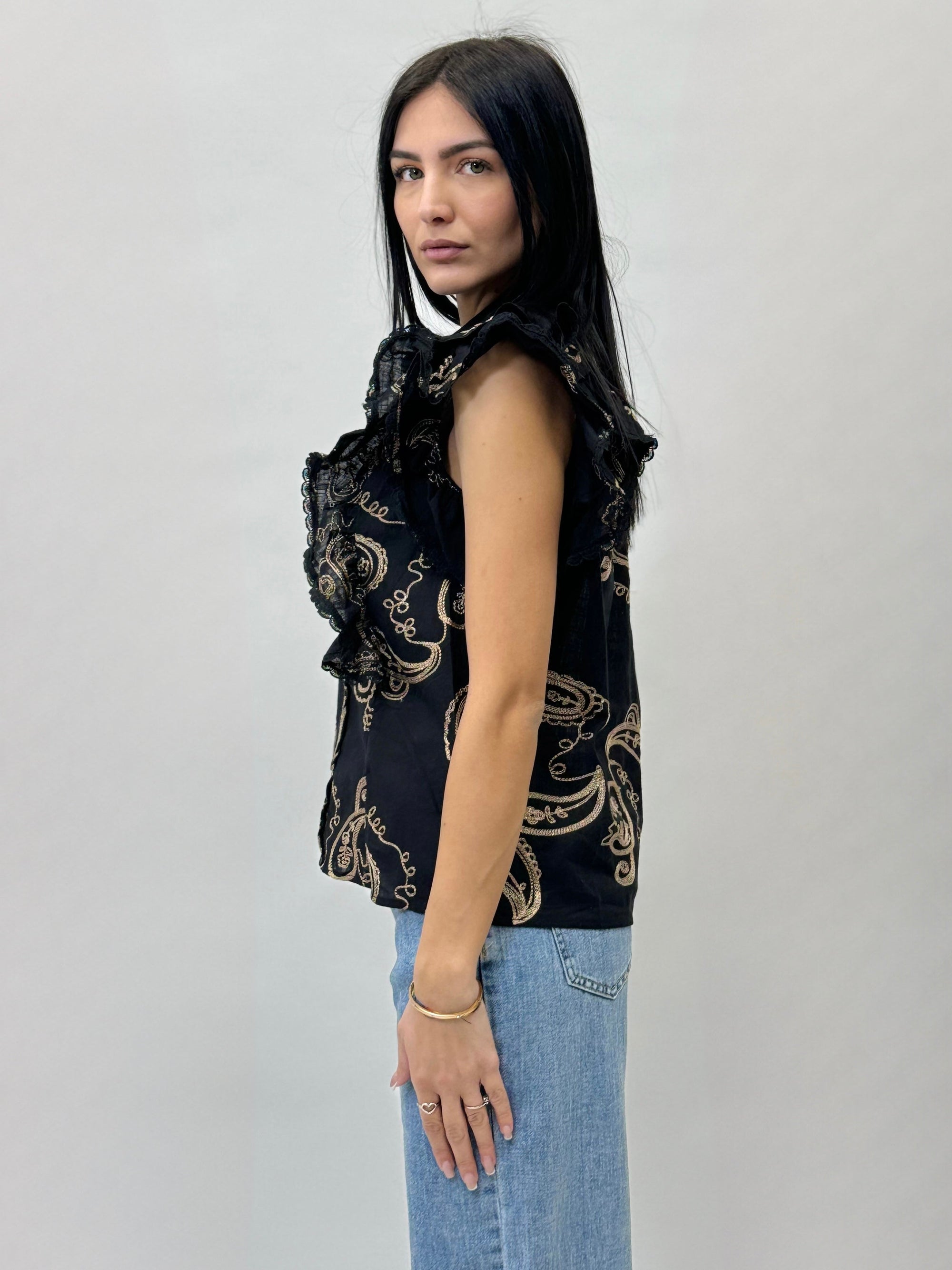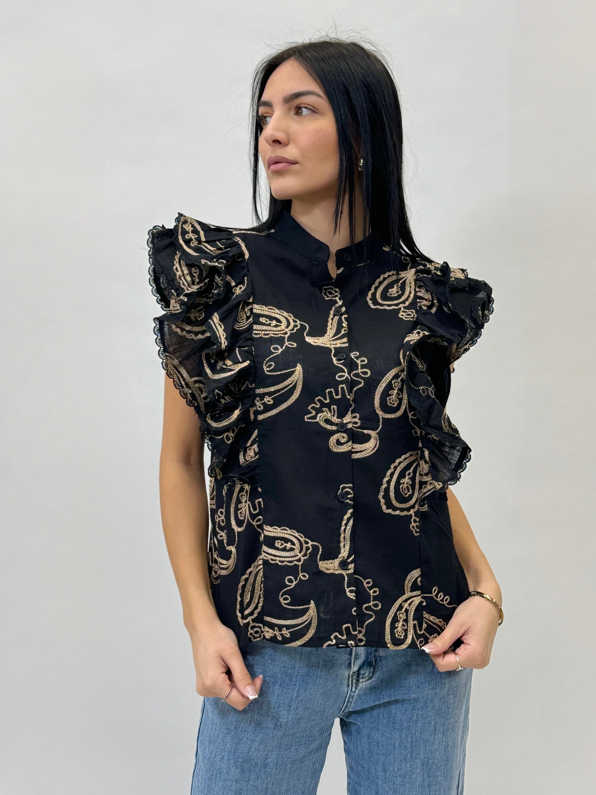 Blusa in cotone con maniche a volant con ricami
