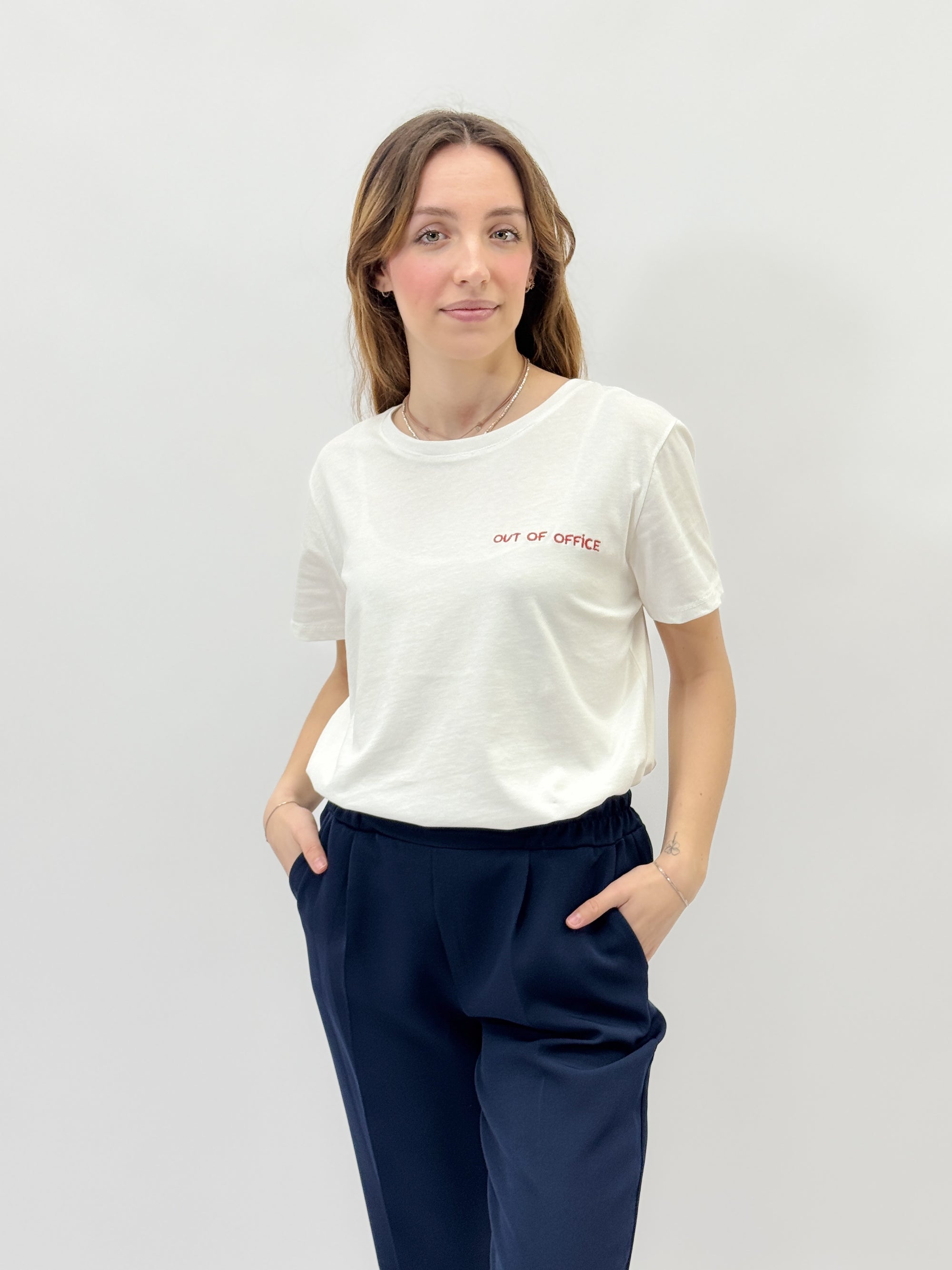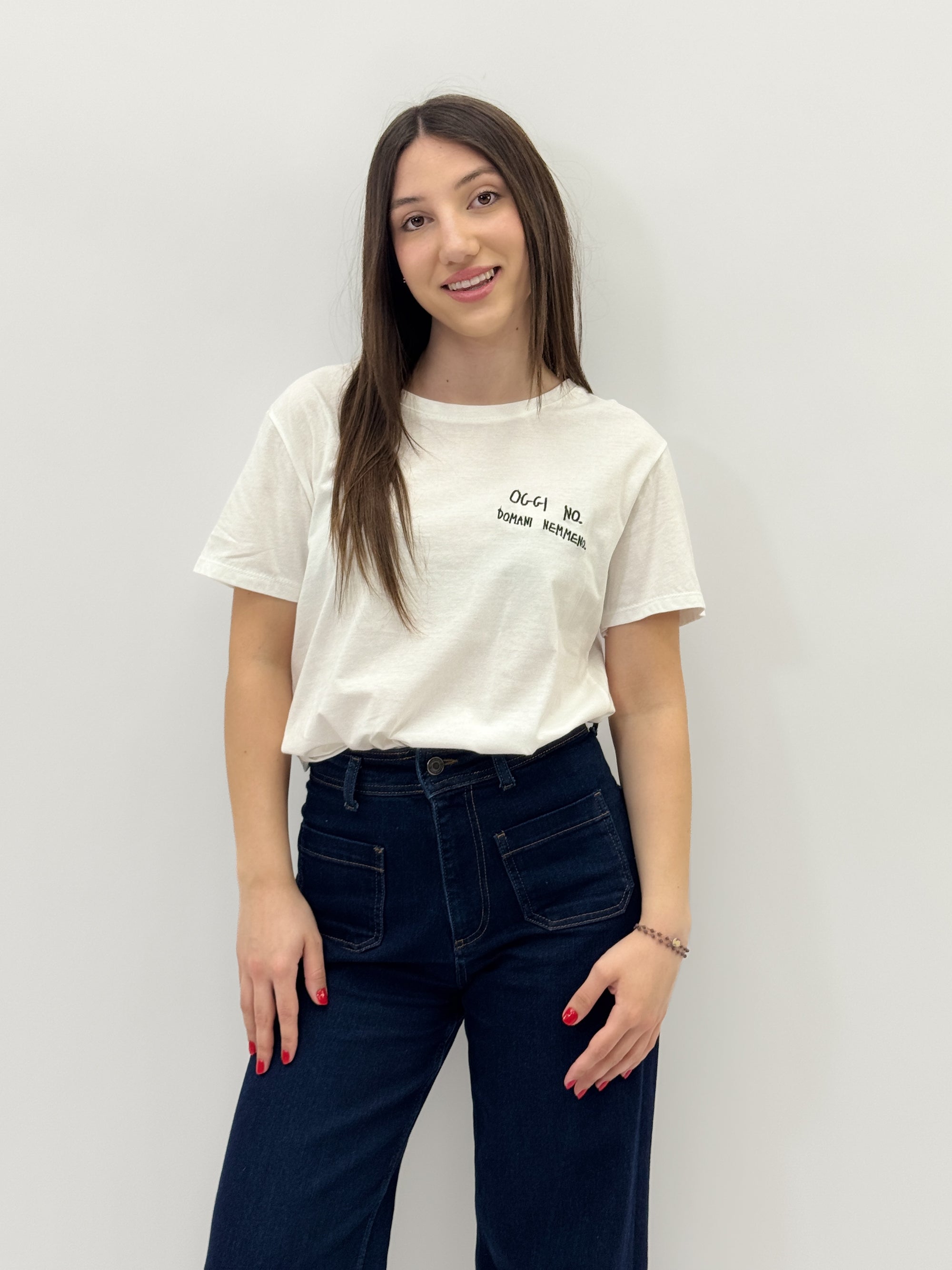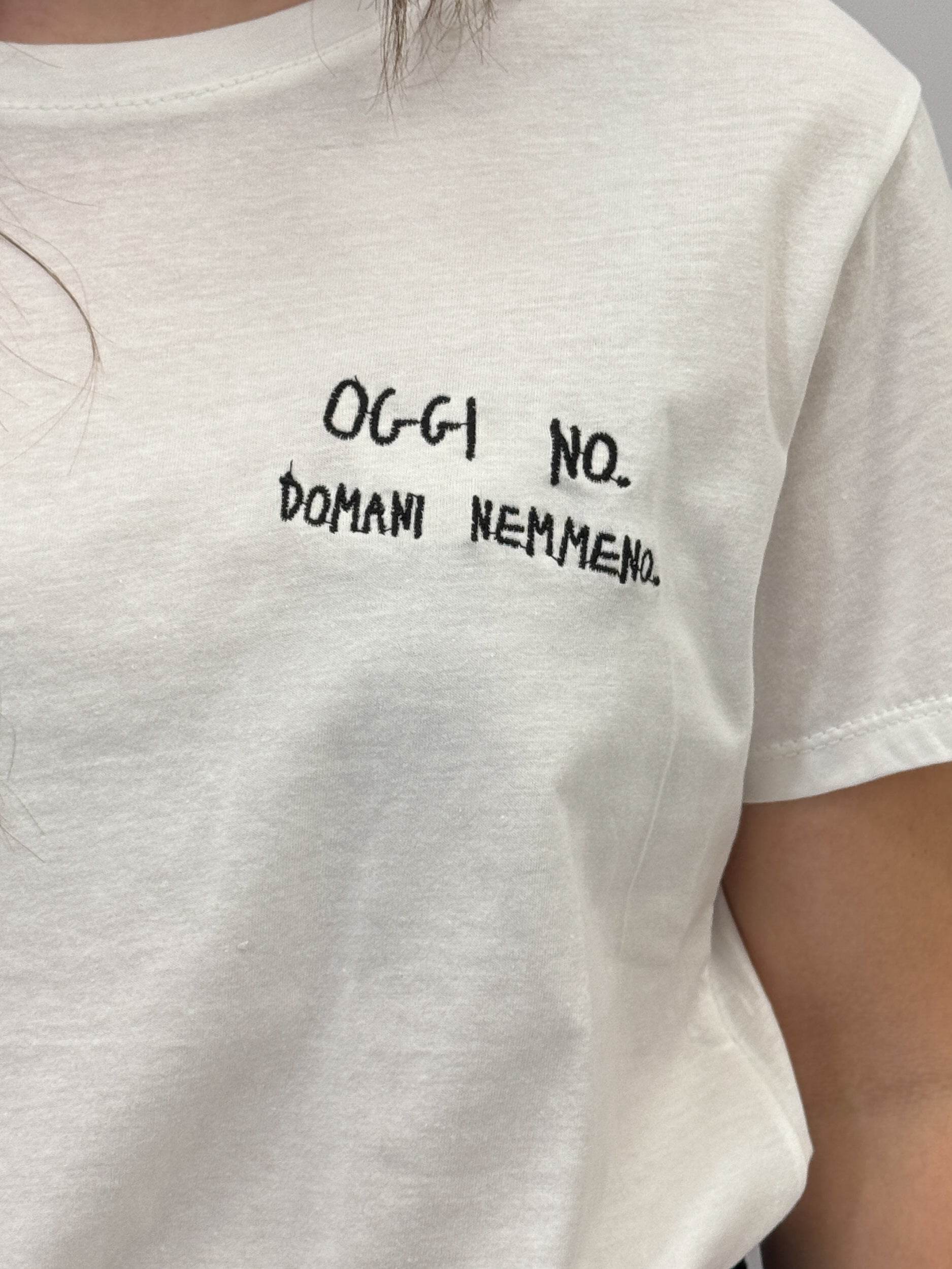 T-shirt in cotone con scritta "Oggi no domani nemmeno"