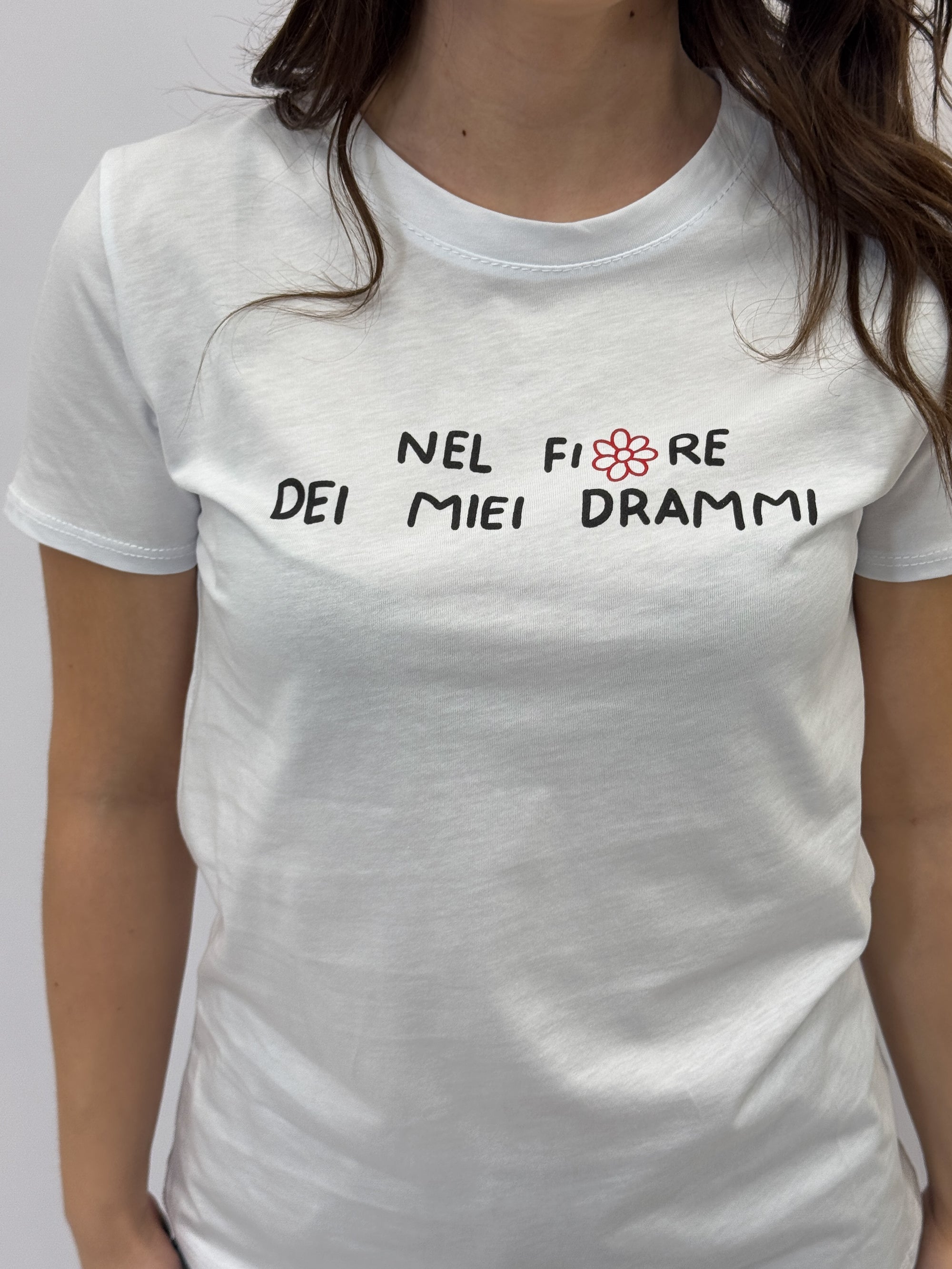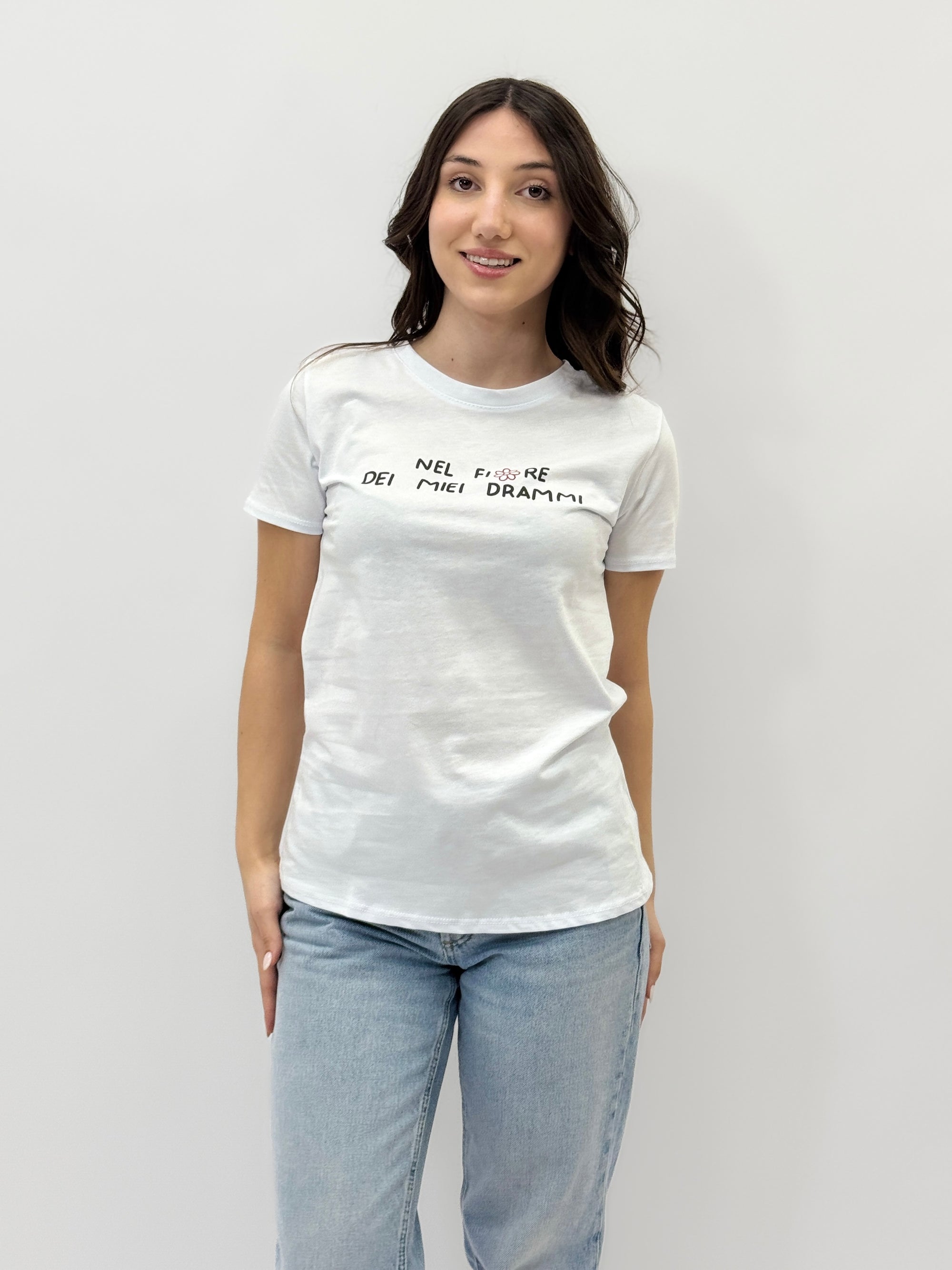 T-shirt petite con scritta "Nel fiore dei miei drammi"
