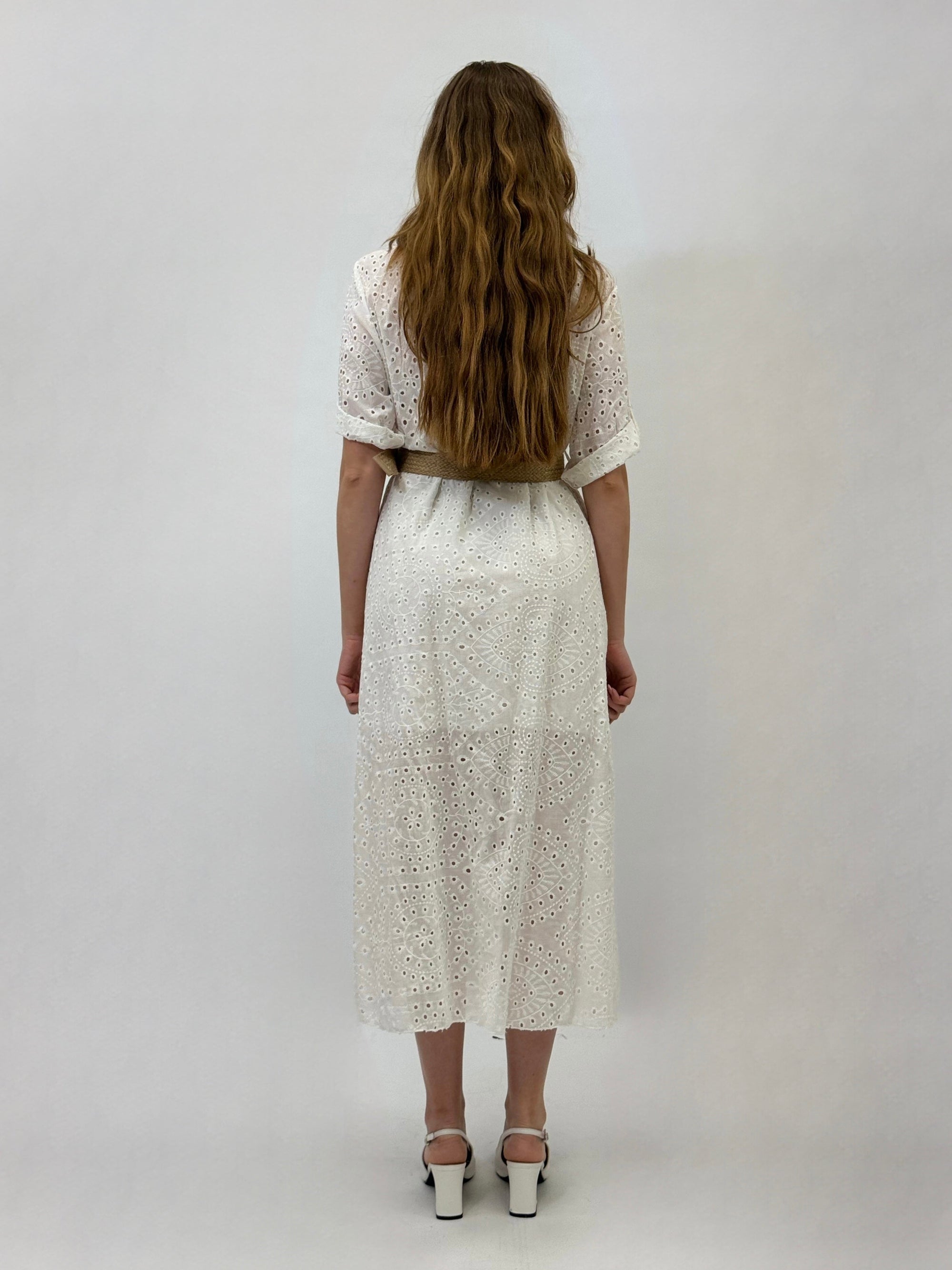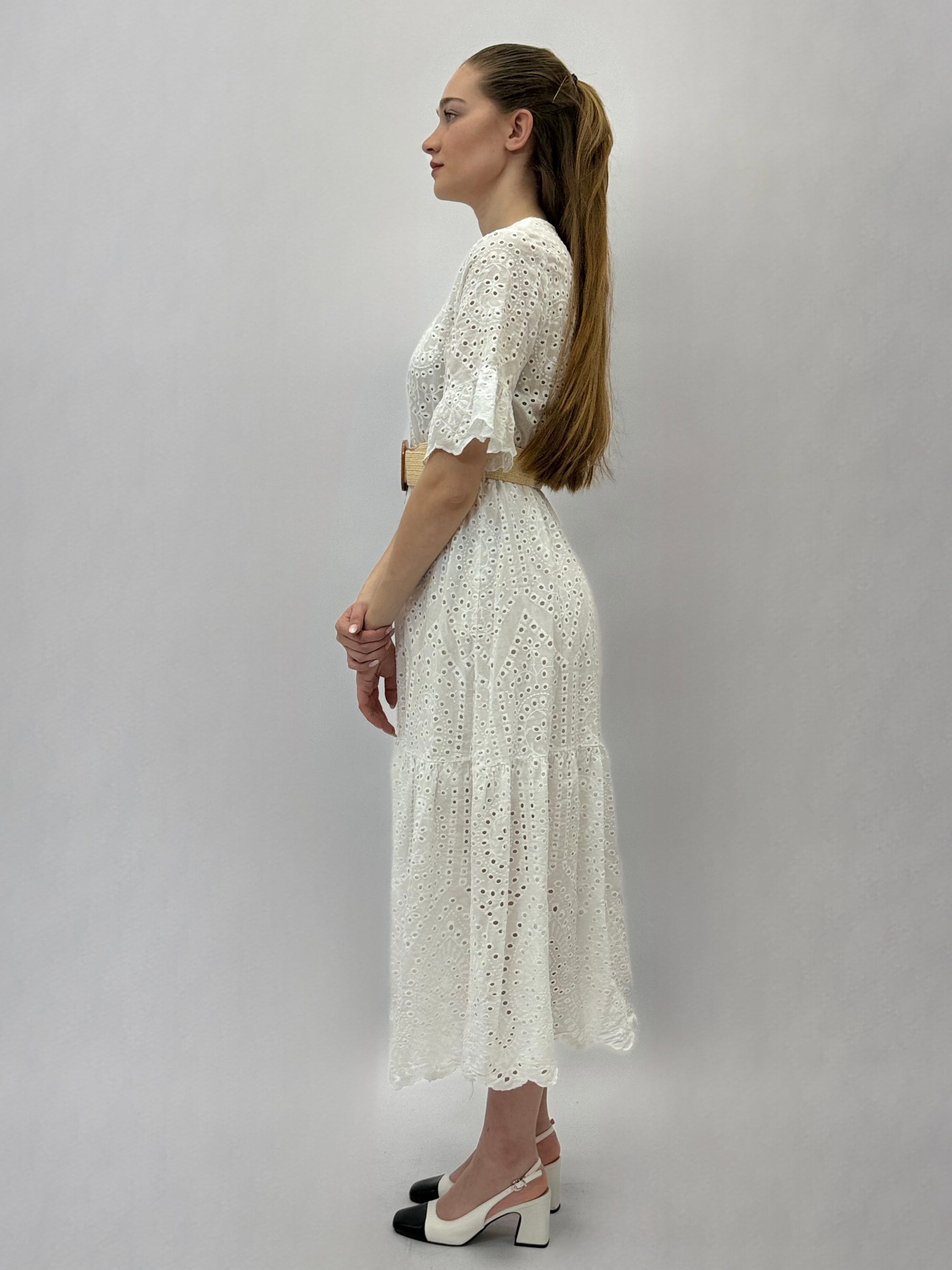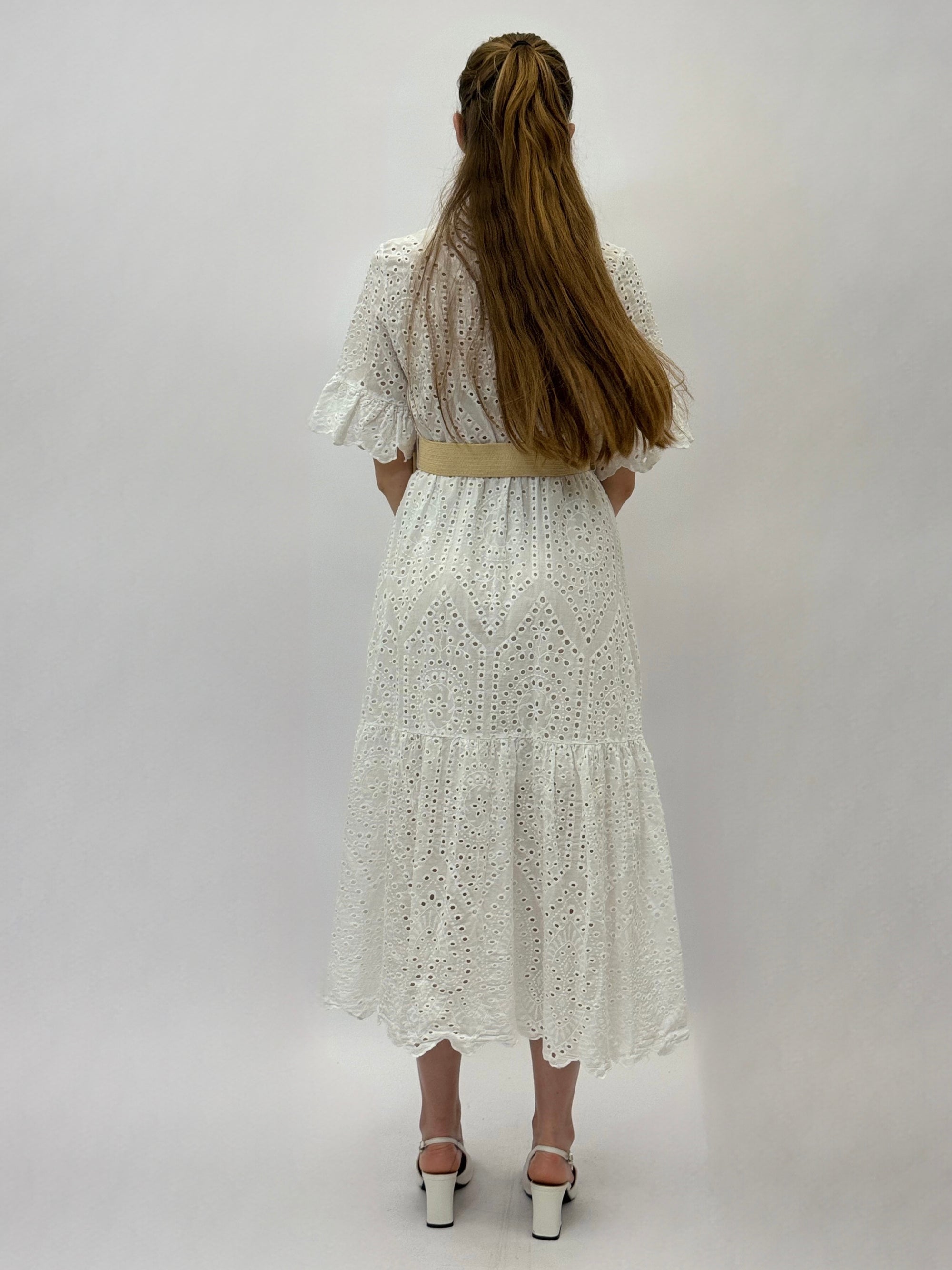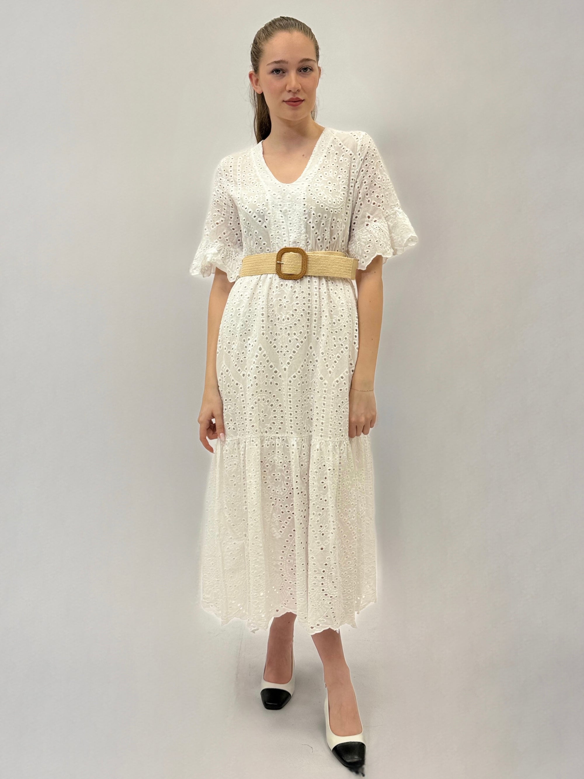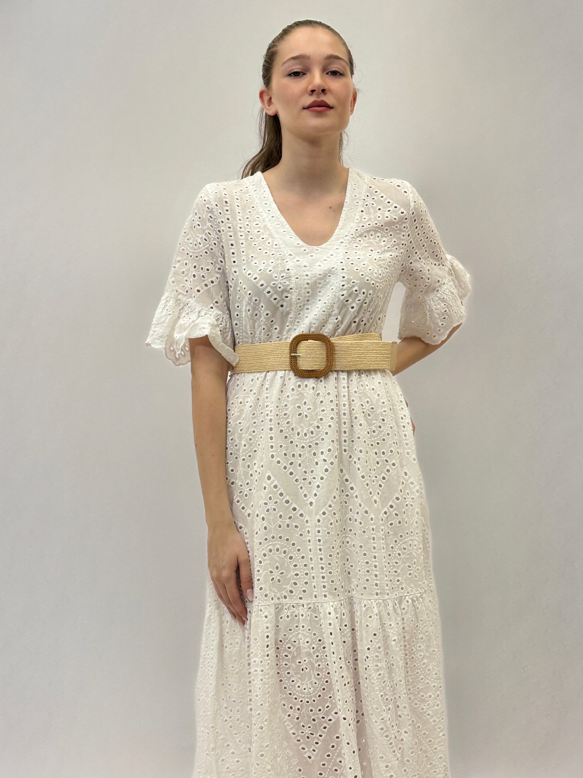Abito lungo in pizzo sangallo con maniche a tre quarti e cintura