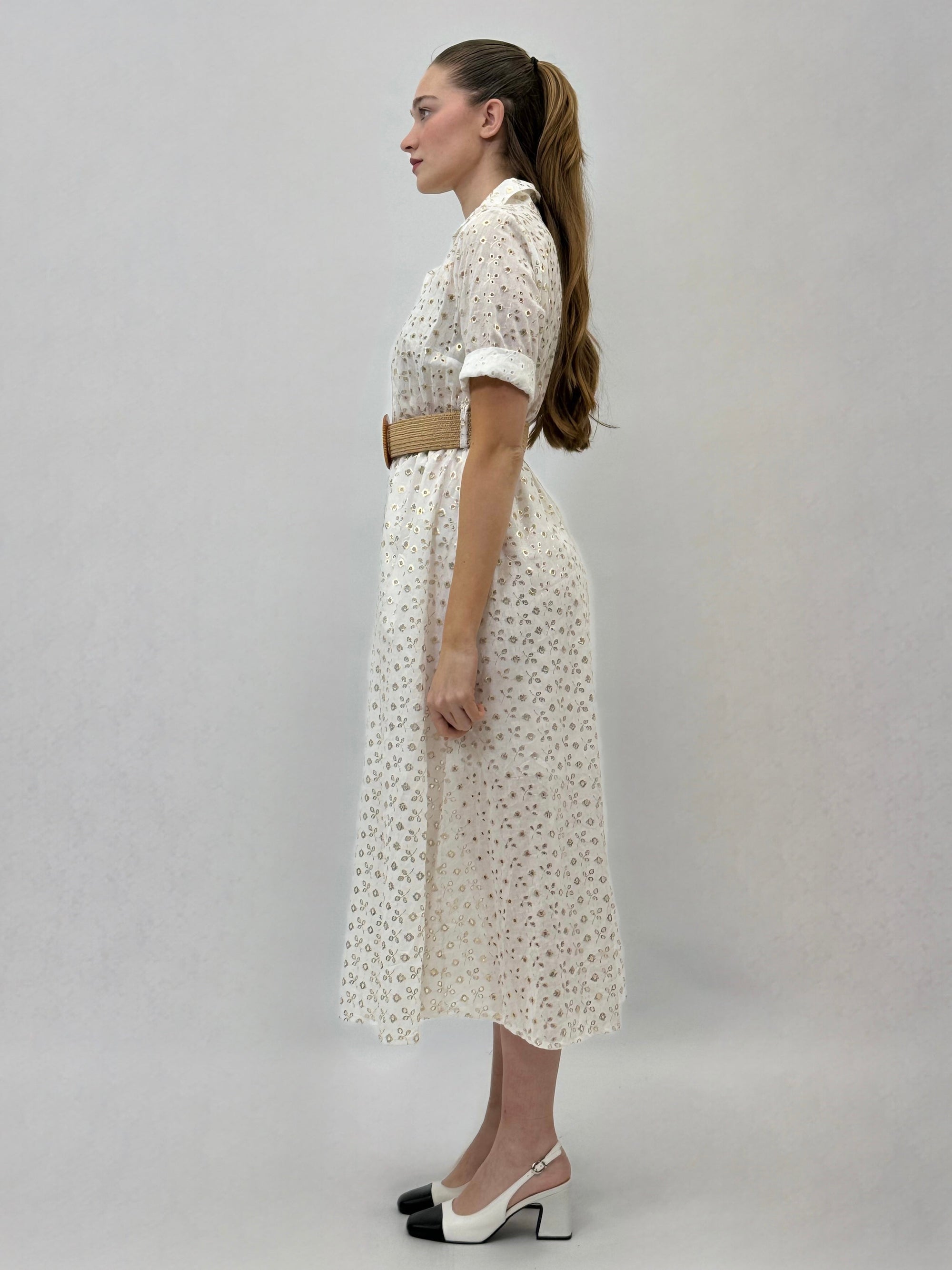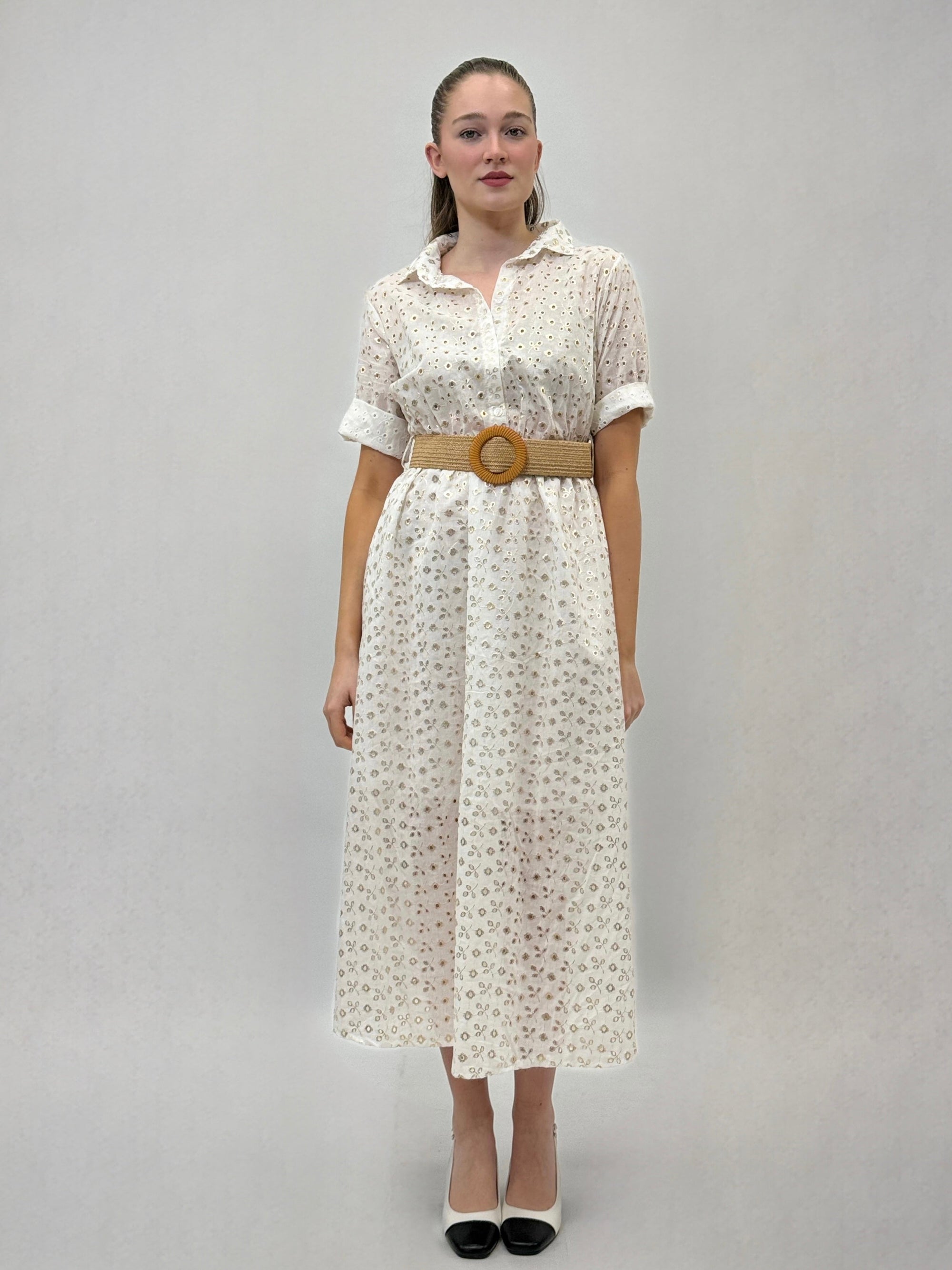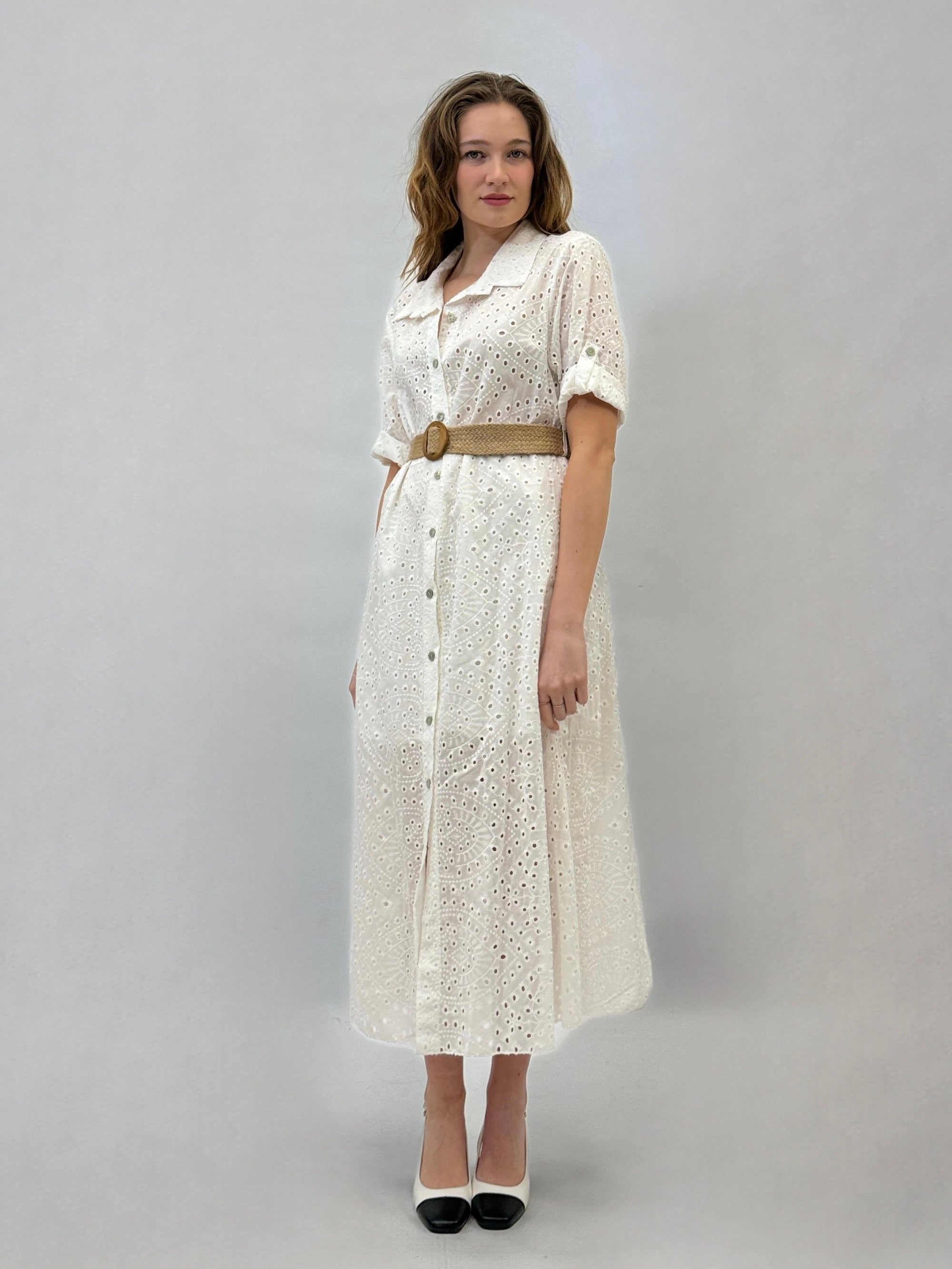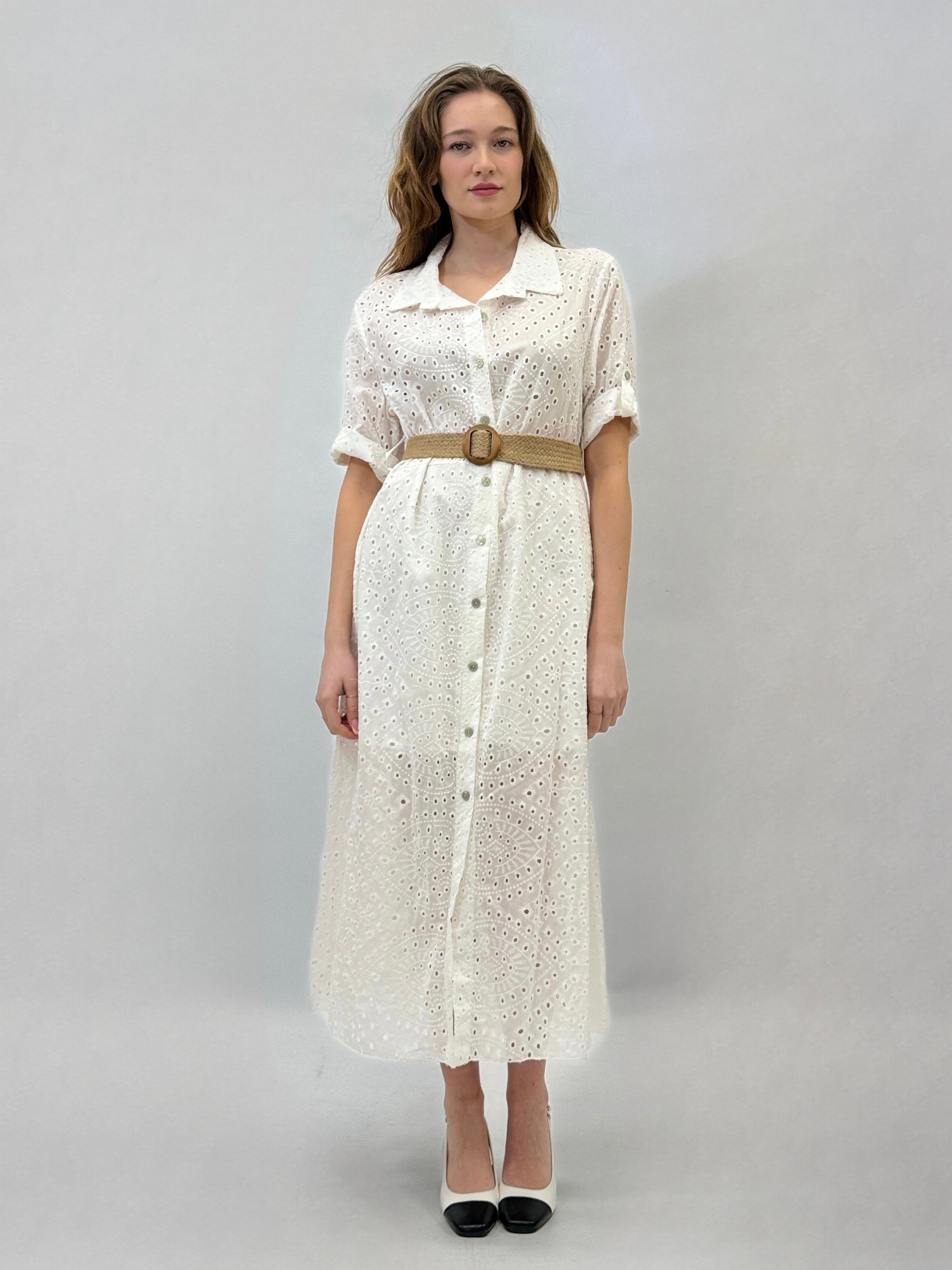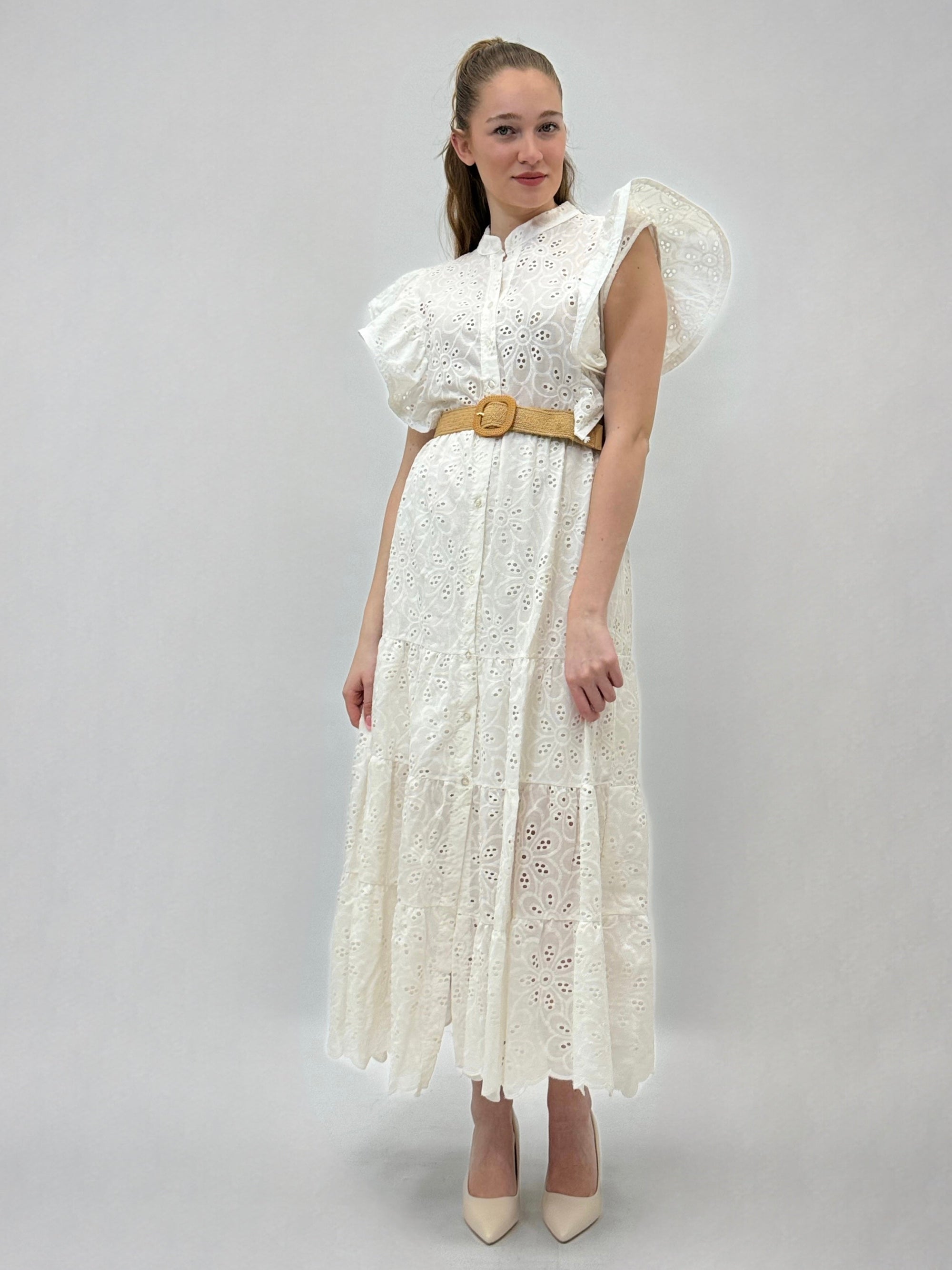Abito lungo in pizzo sangallo con maniche a tre quarti e cintura