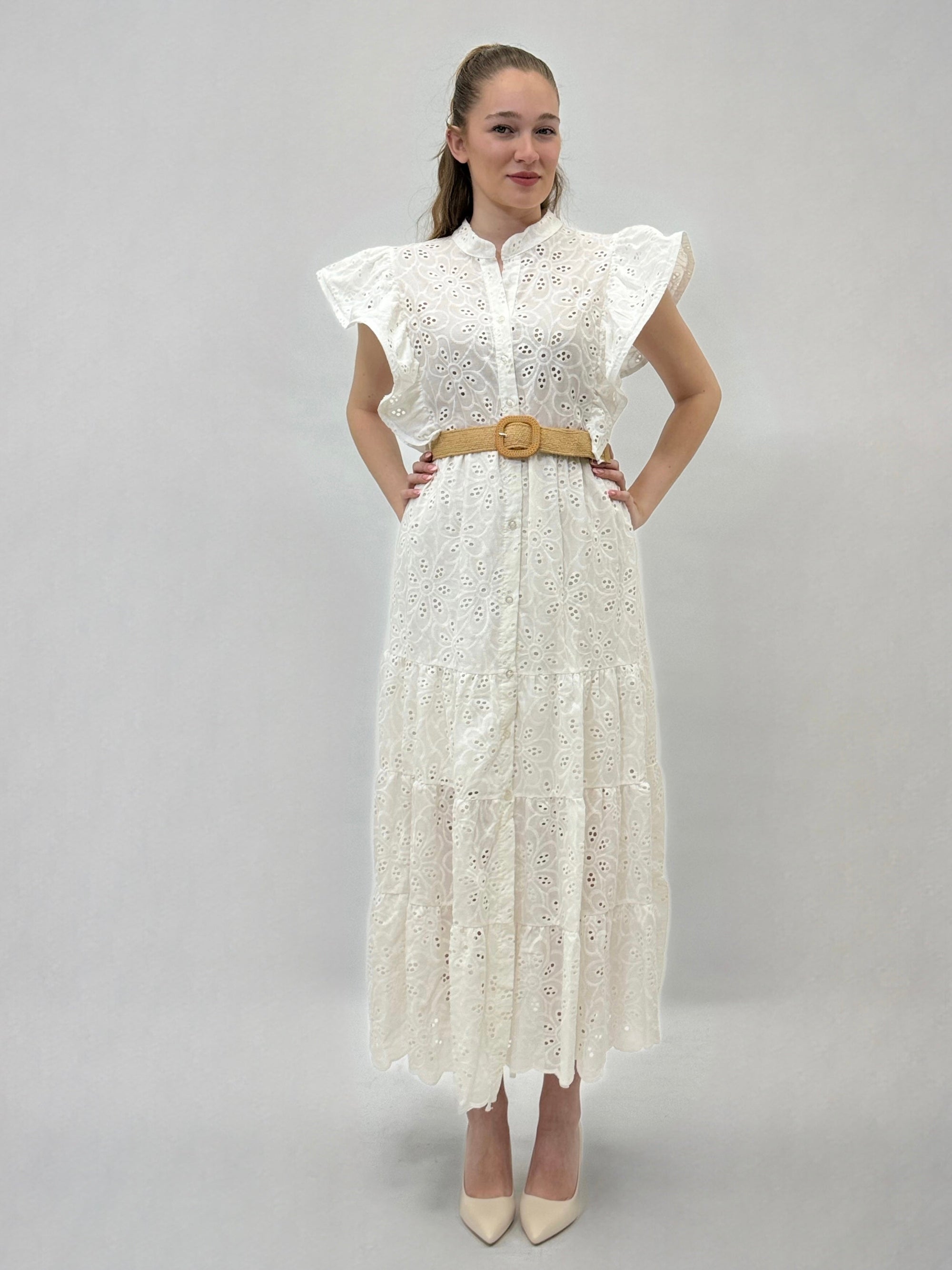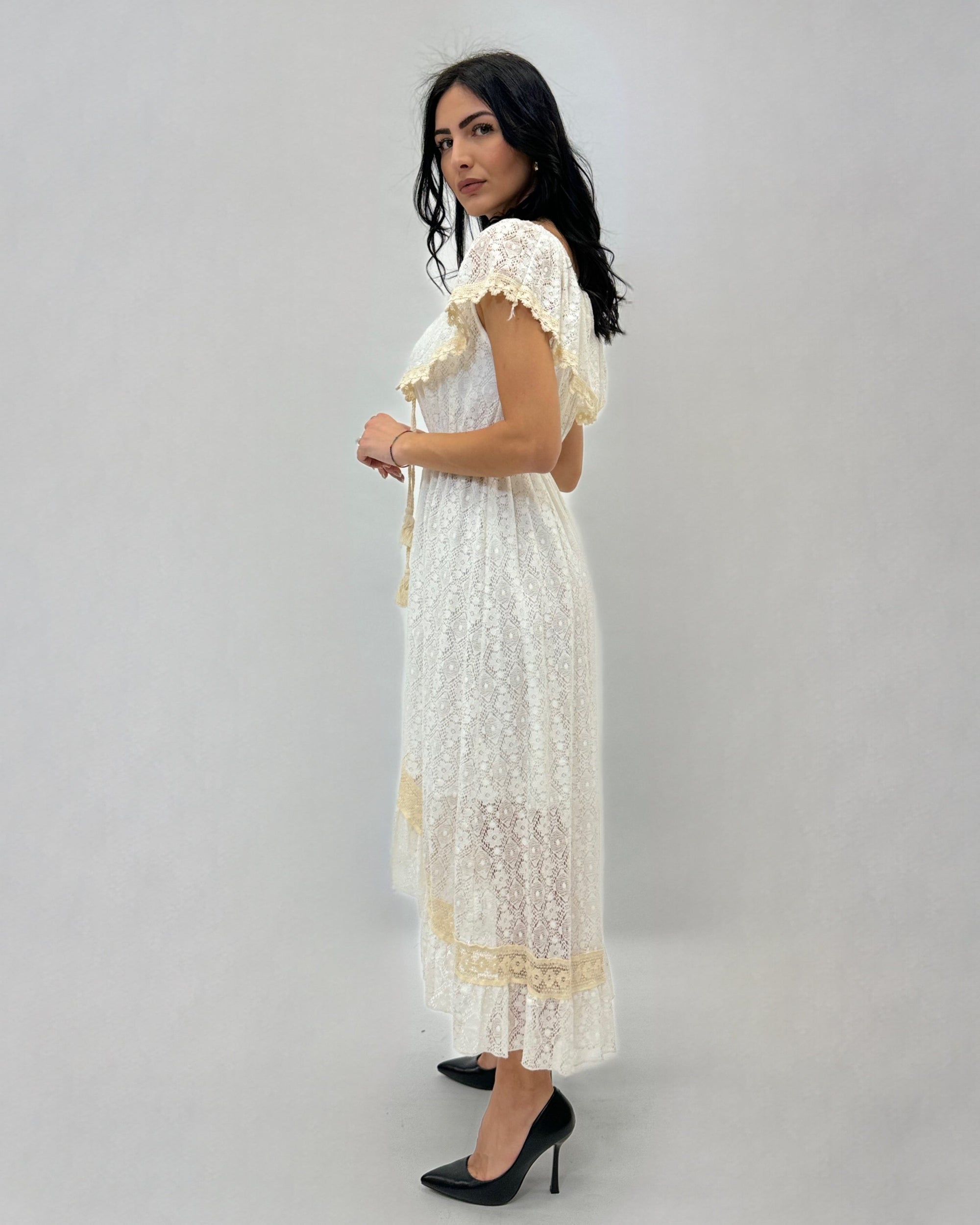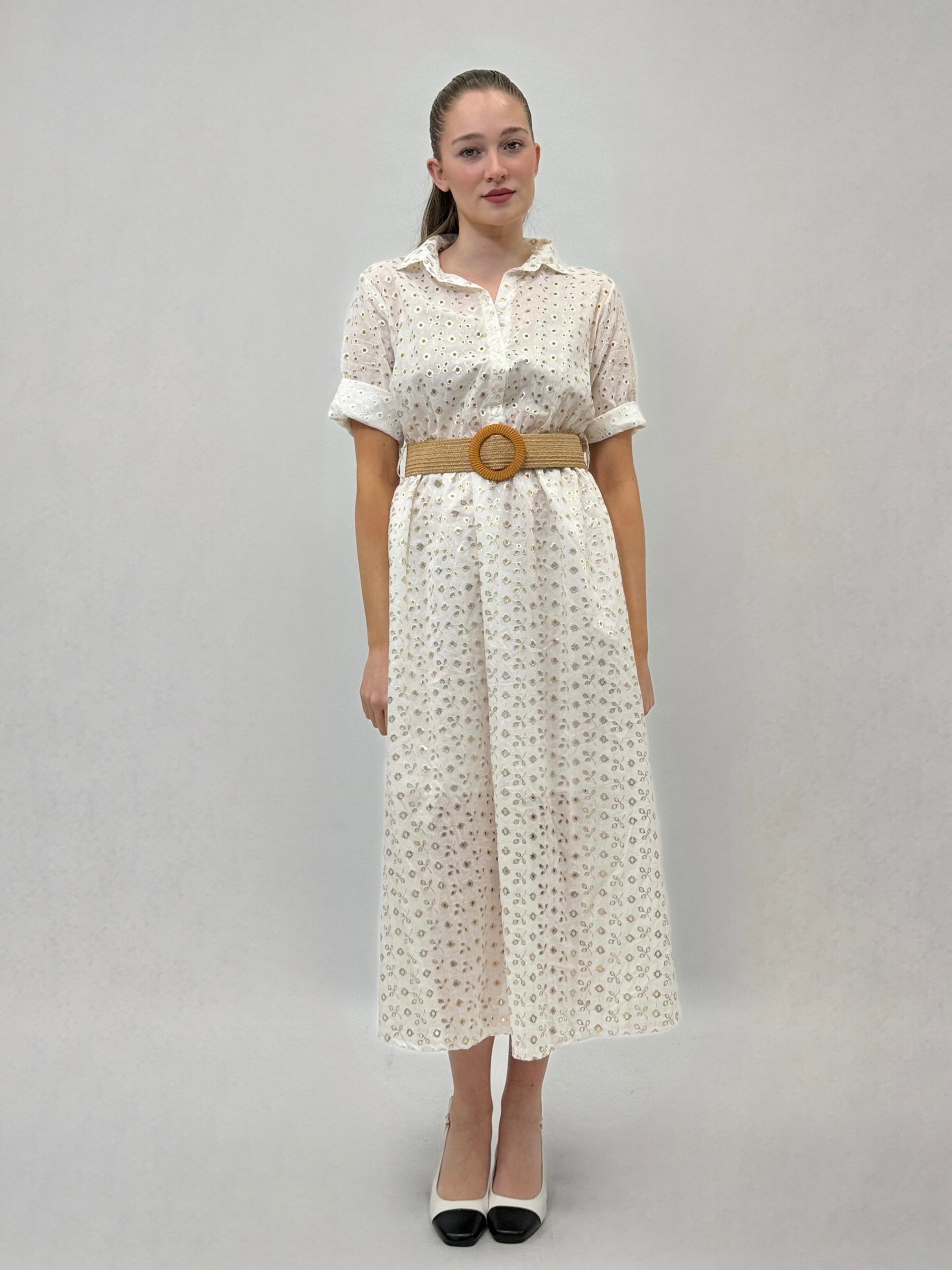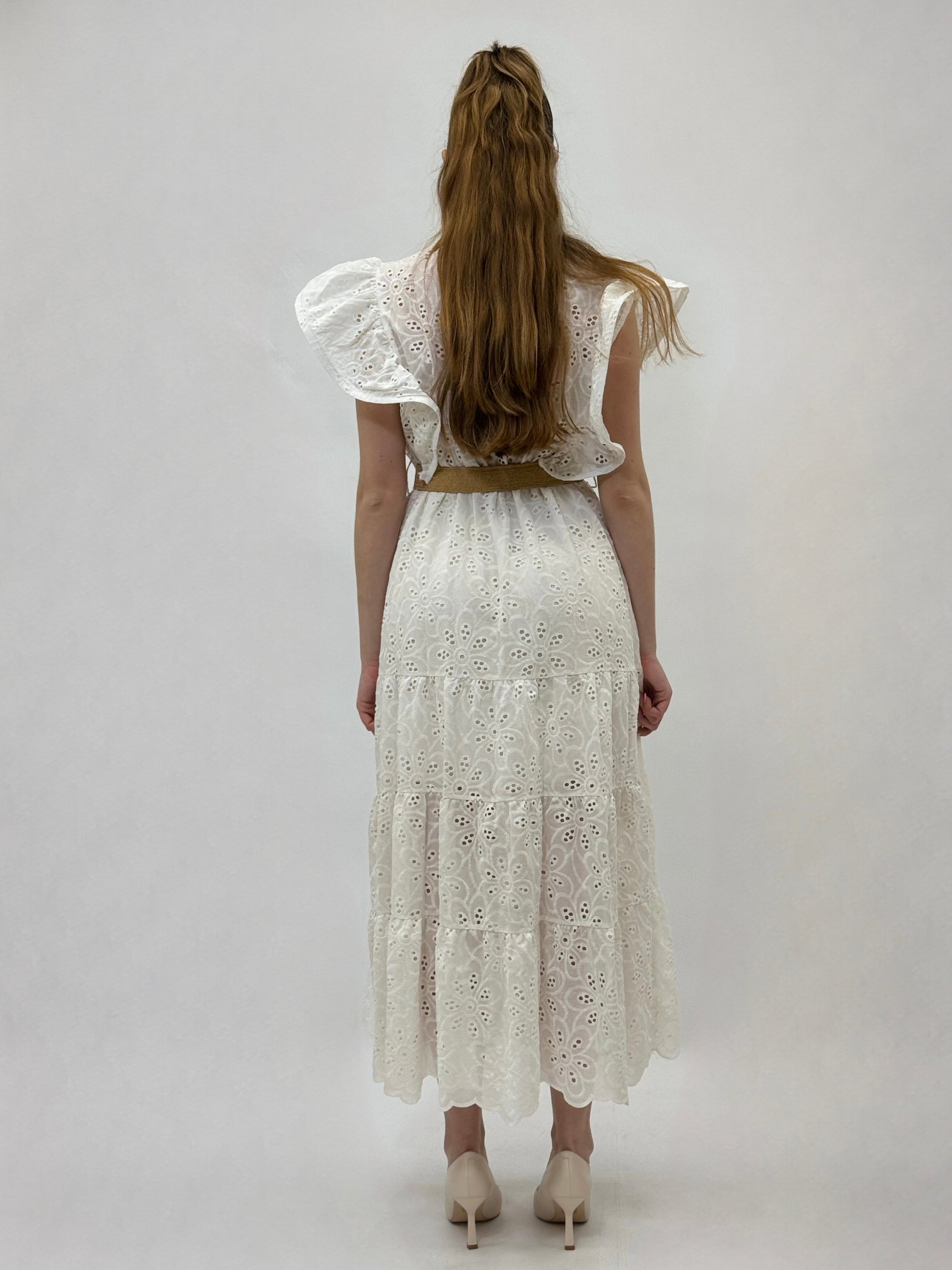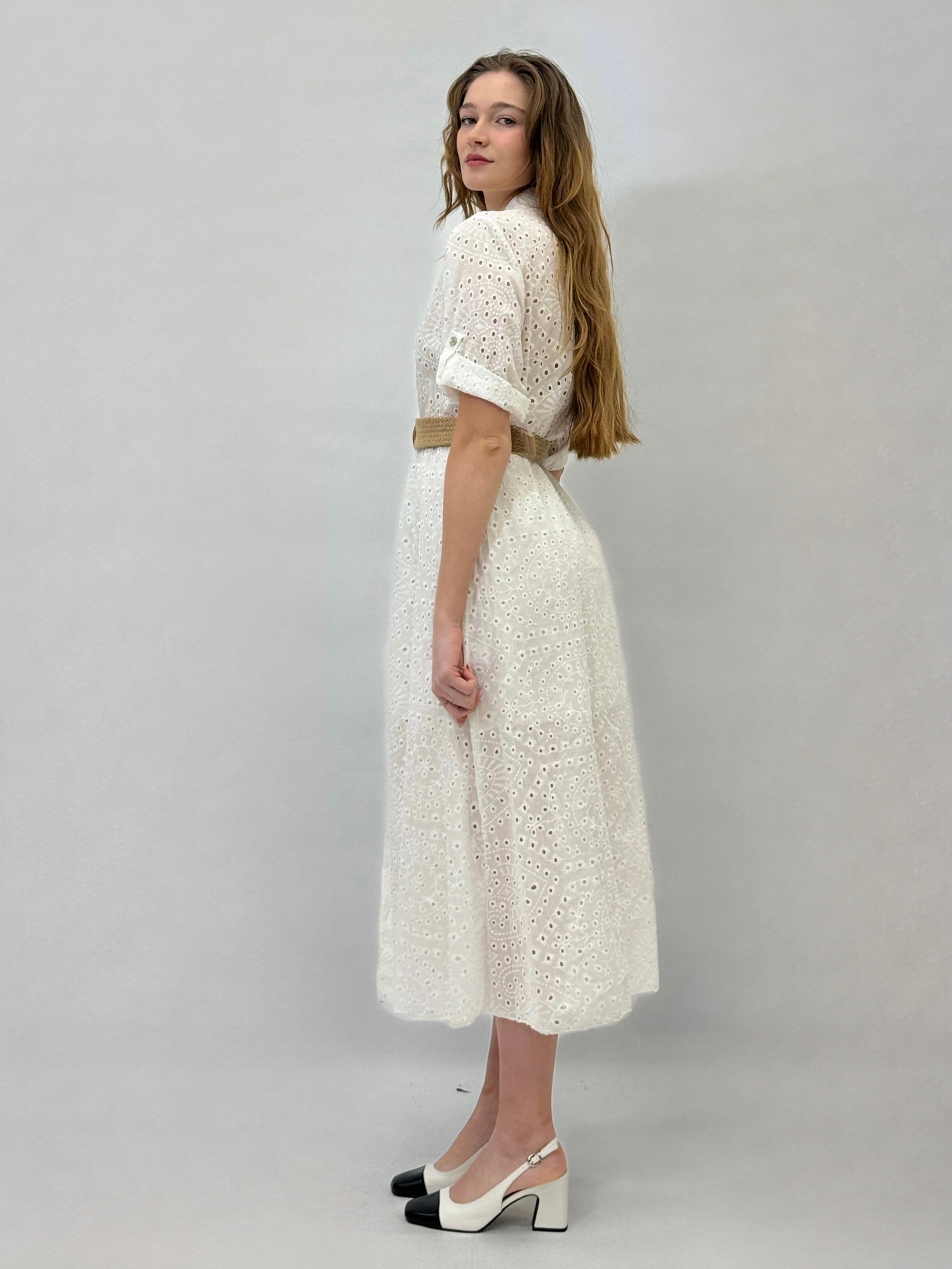 Abito lungo in pizzo sangallo con maniche a tre quarti e cintura