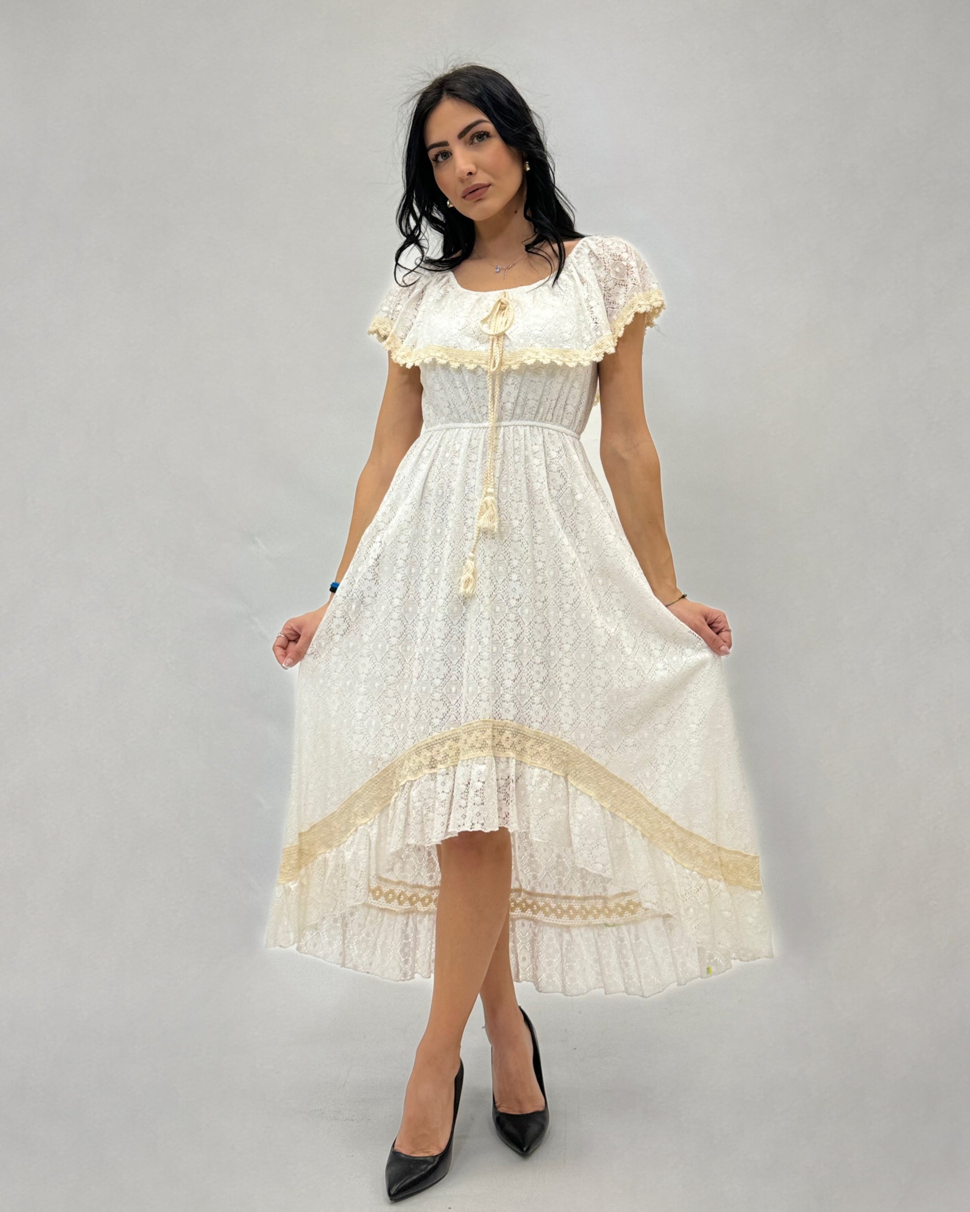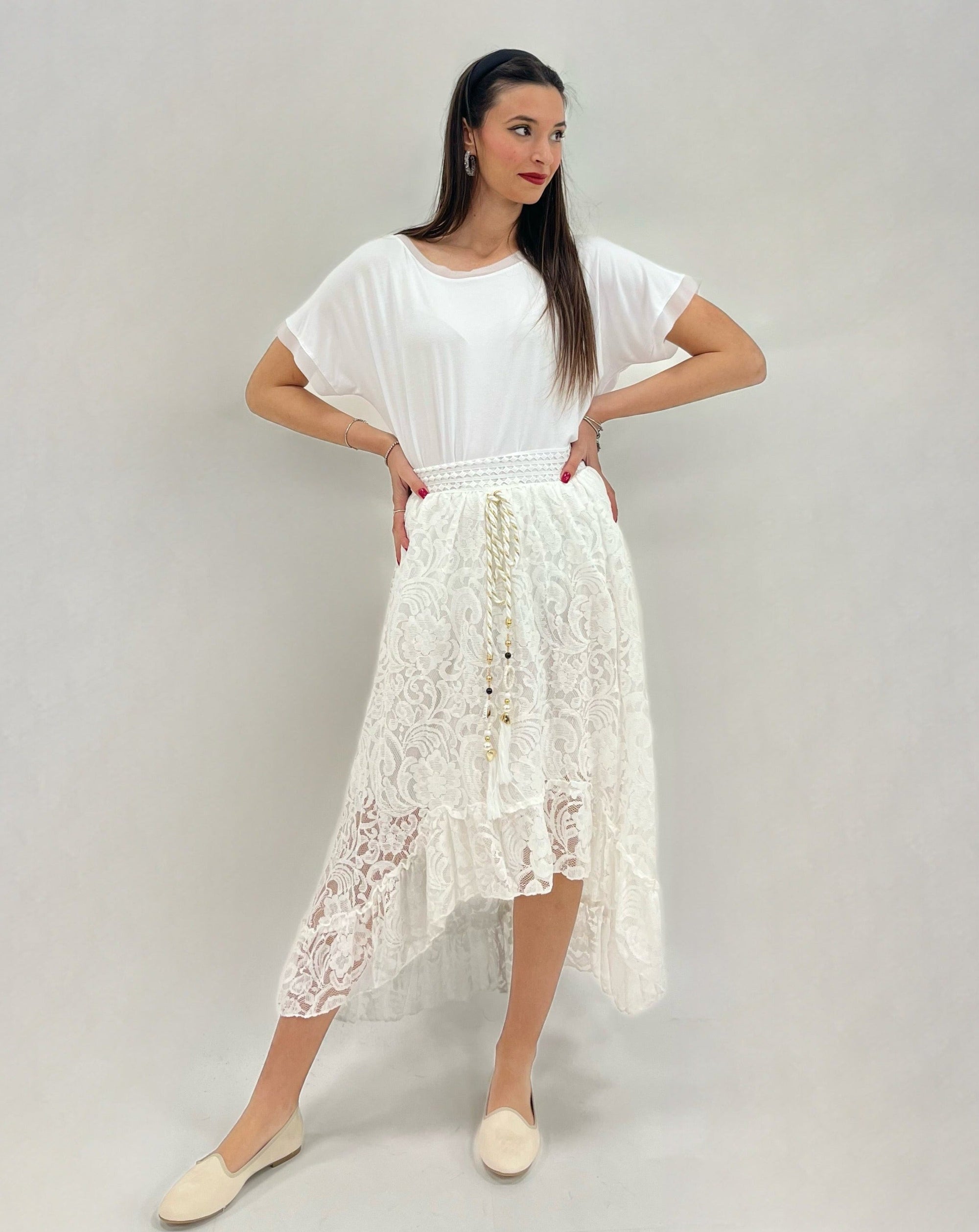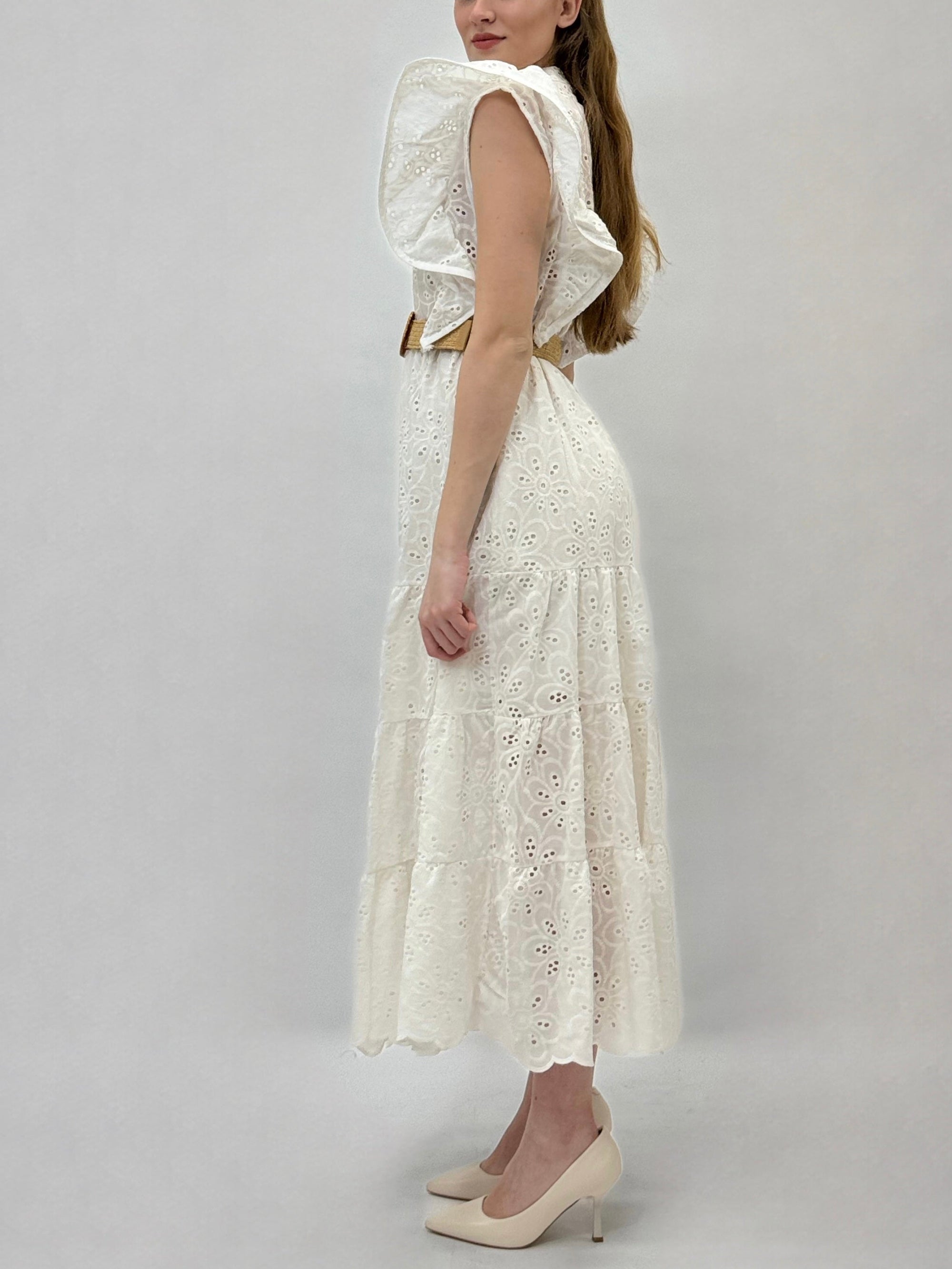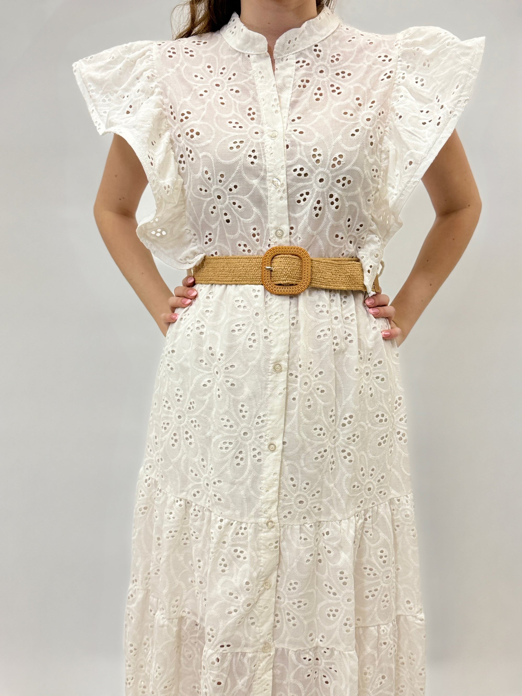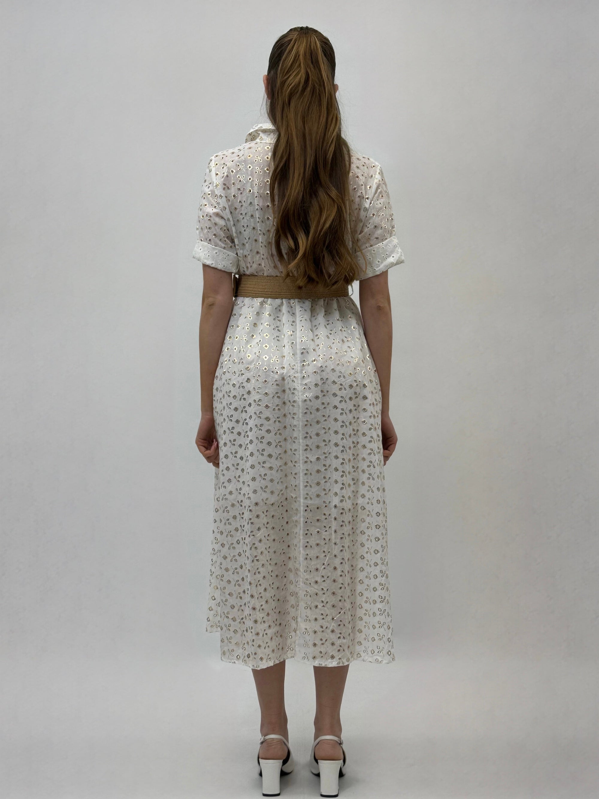 Abito lungo in pizzo sangallo con maniche a tre quarti e cintura