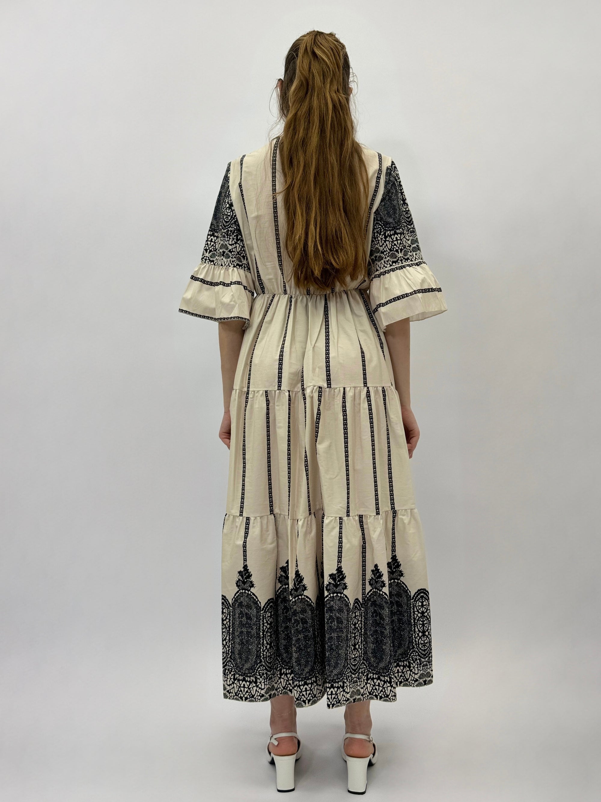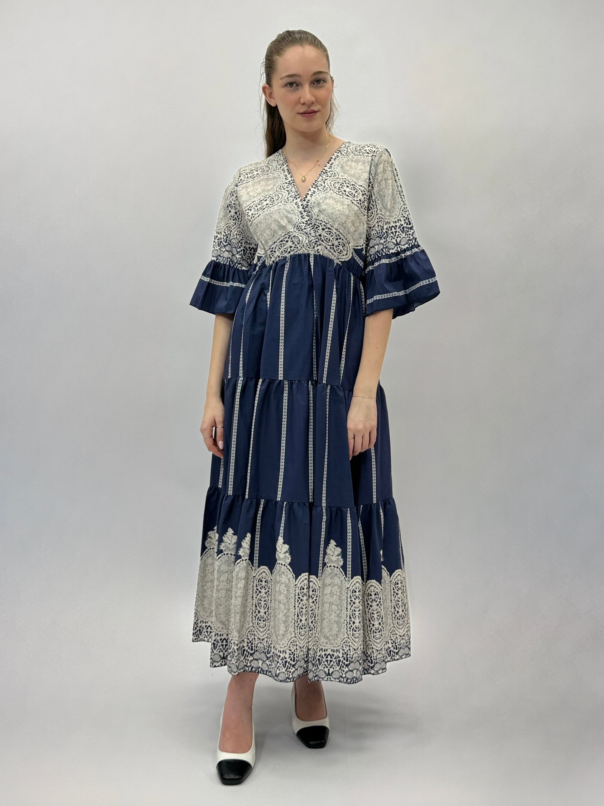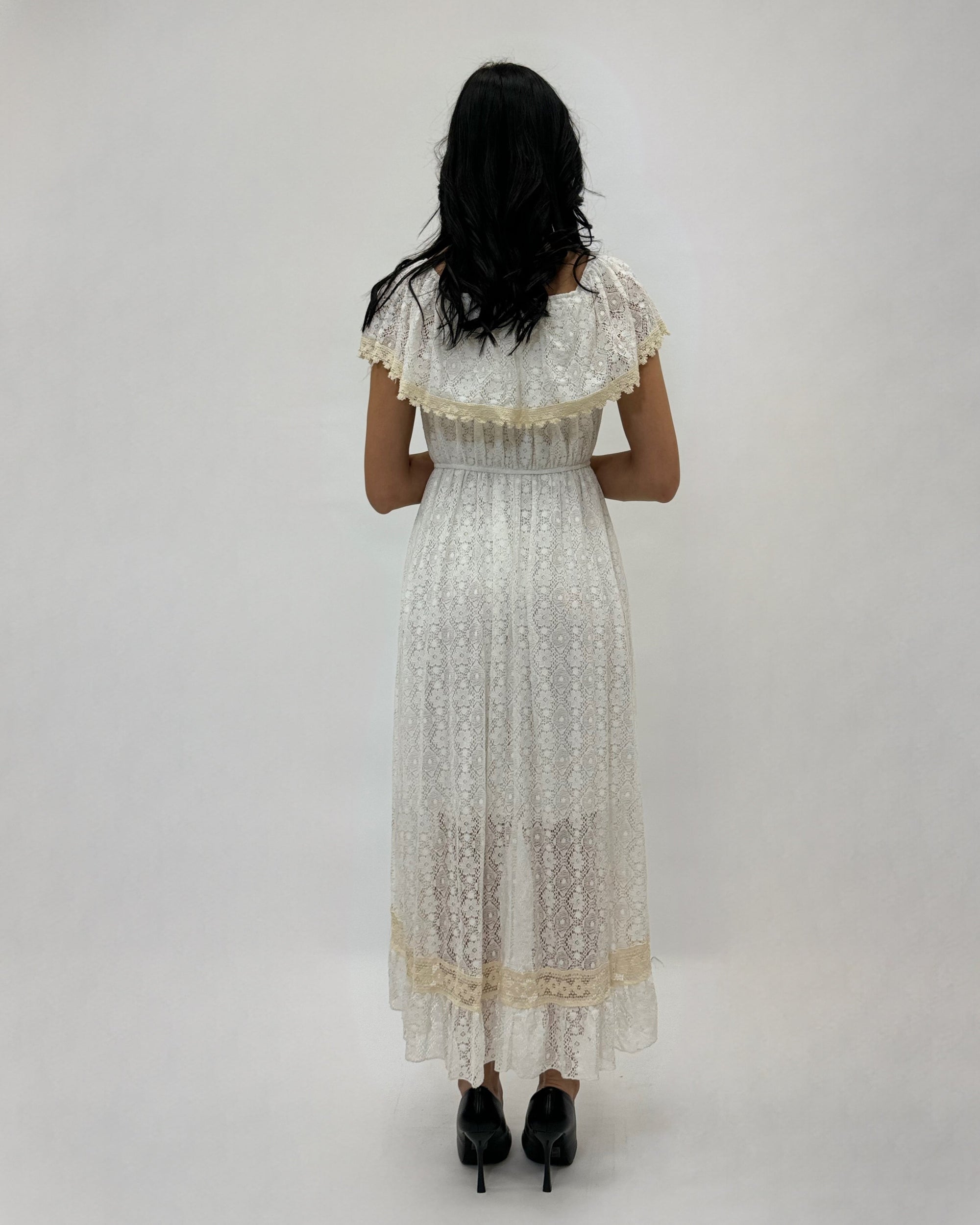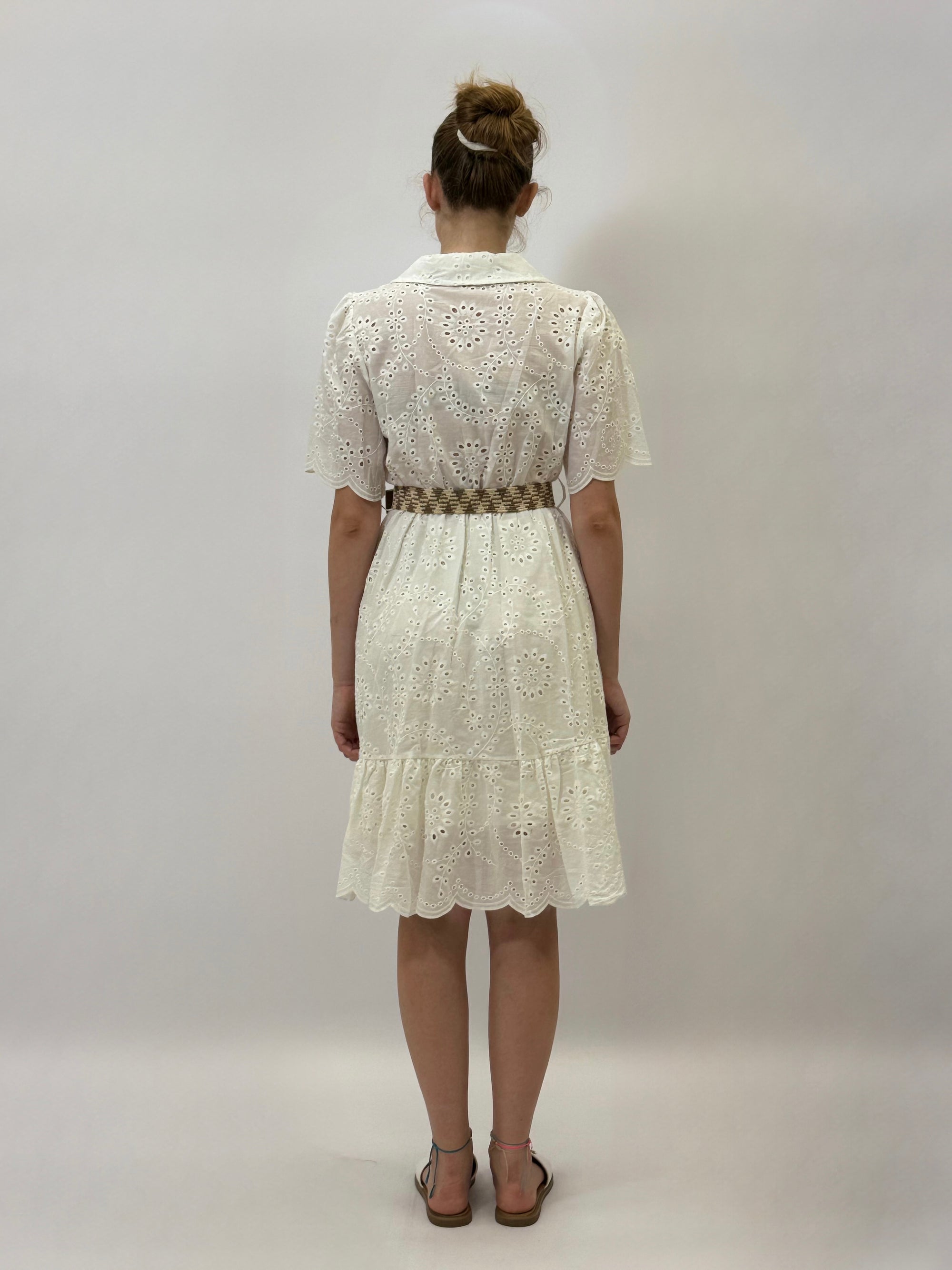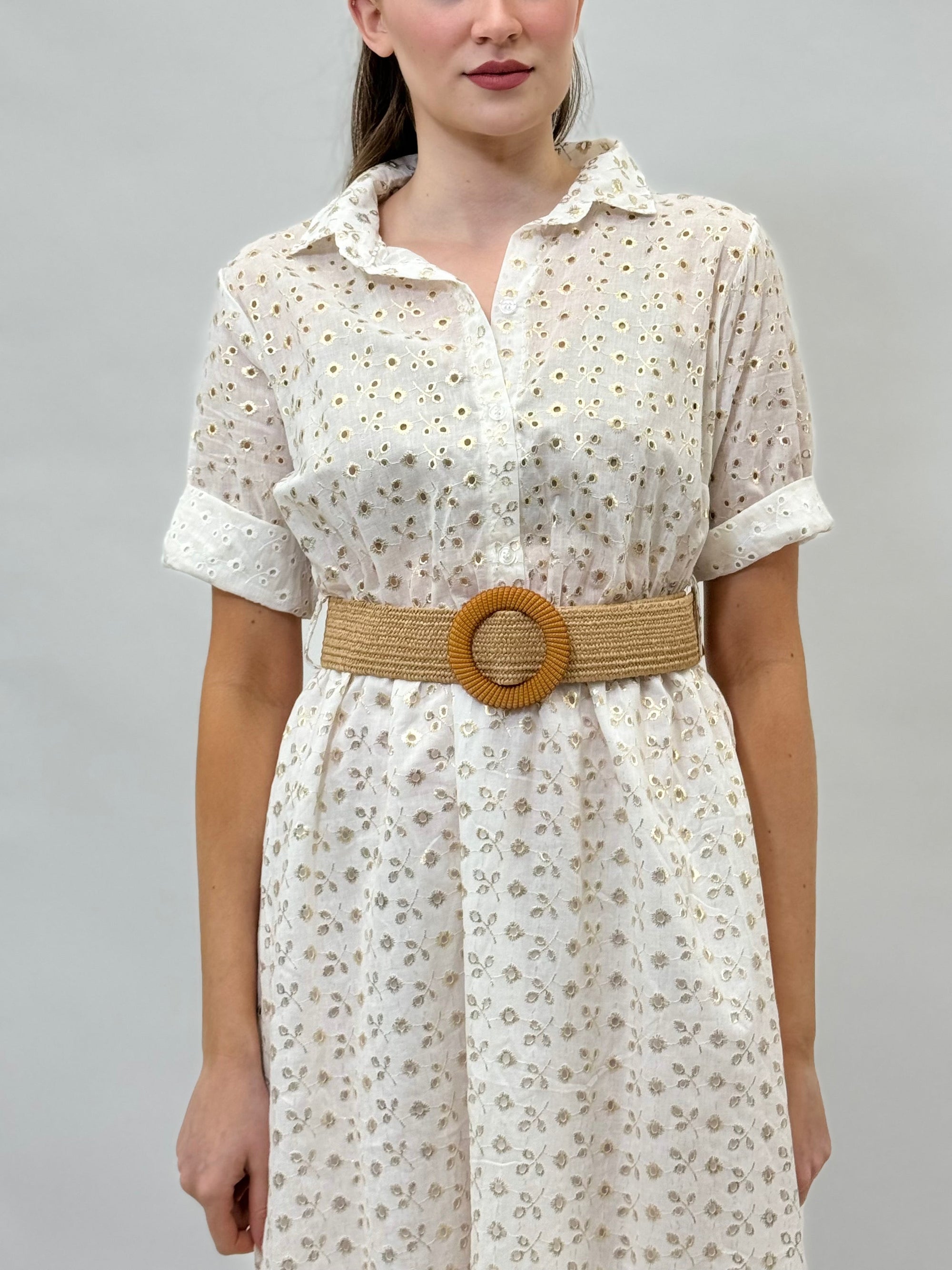 Abito lungo in pizzo sangallo con maniche a tre quarti e cintura