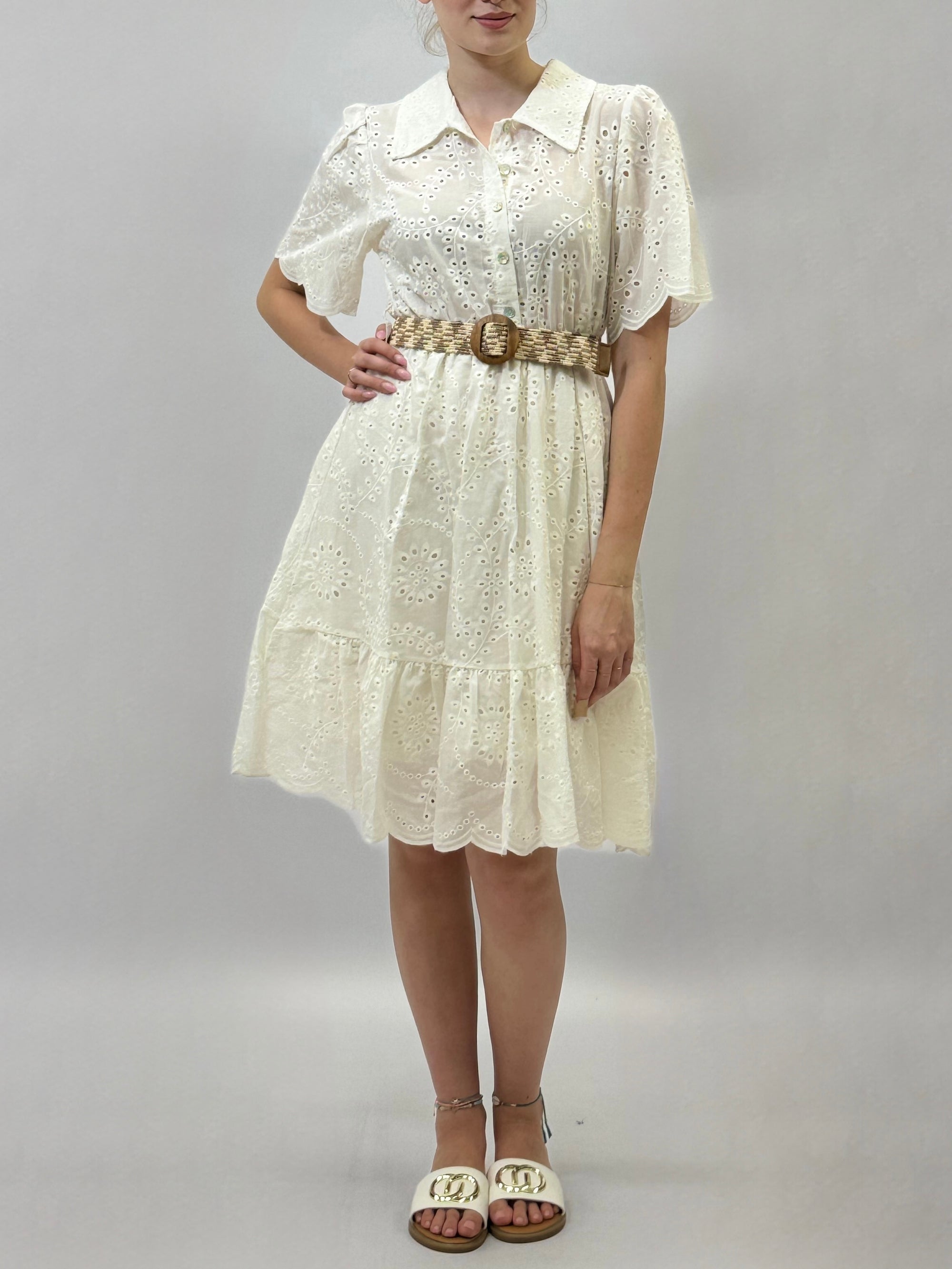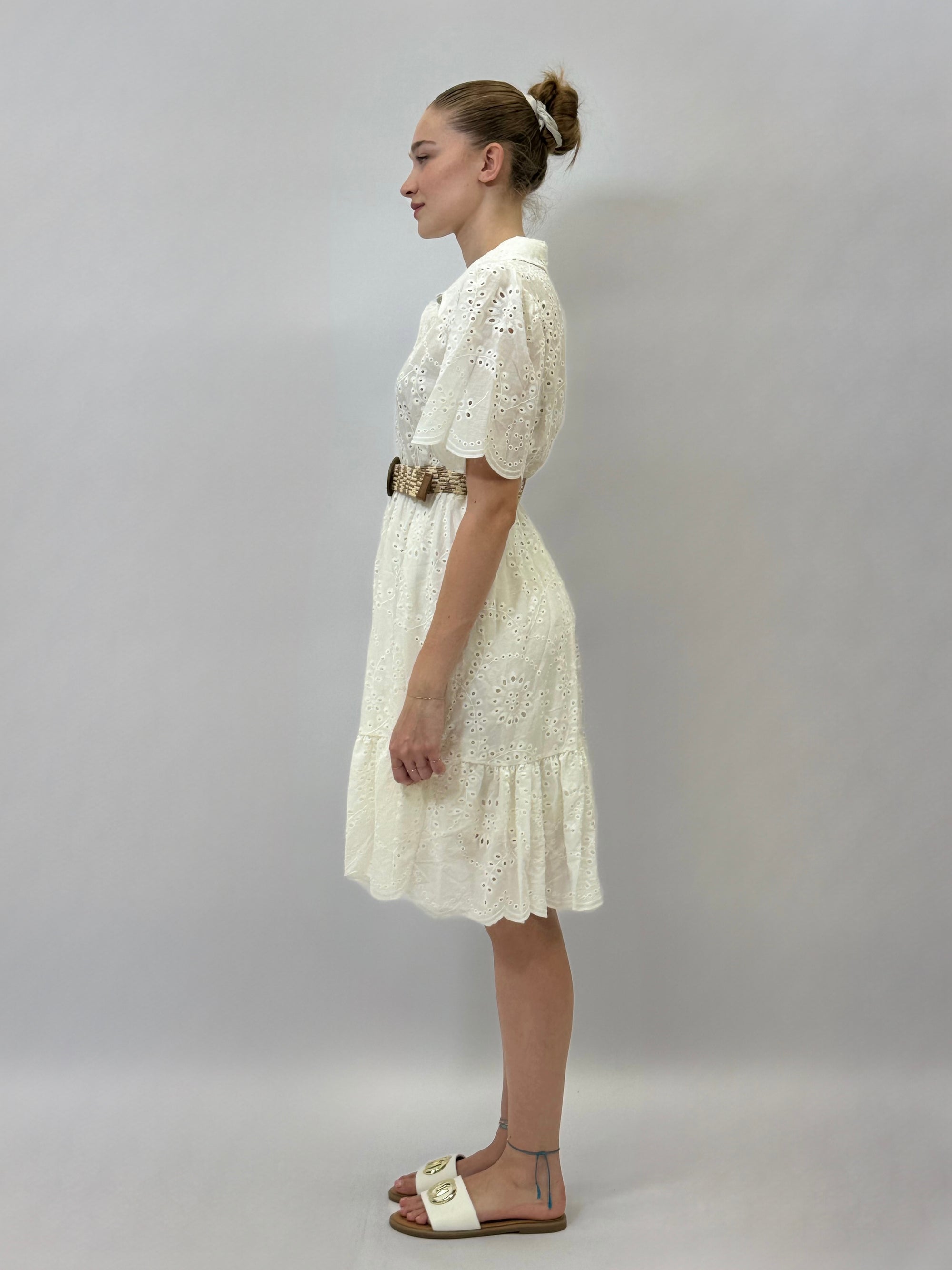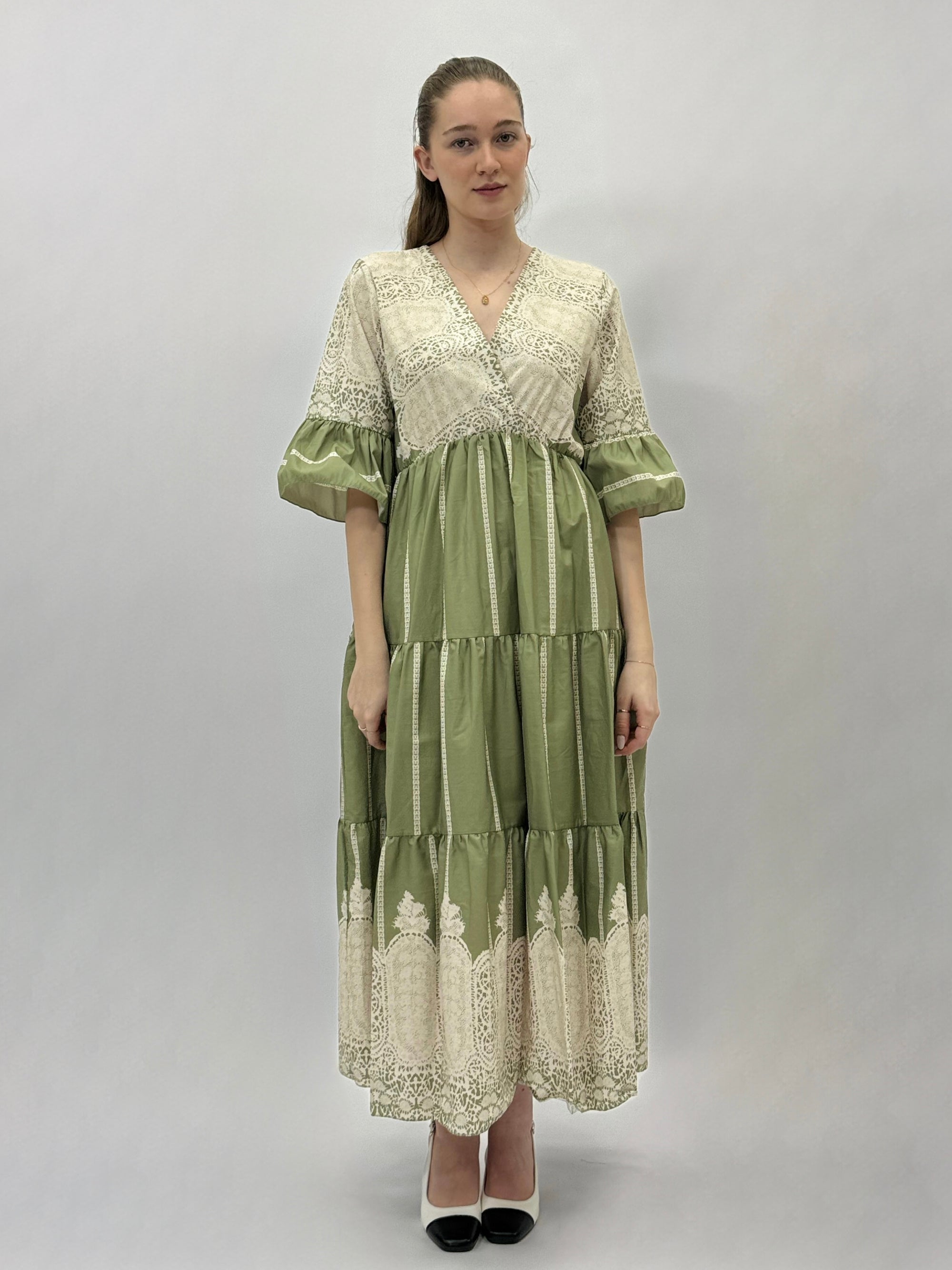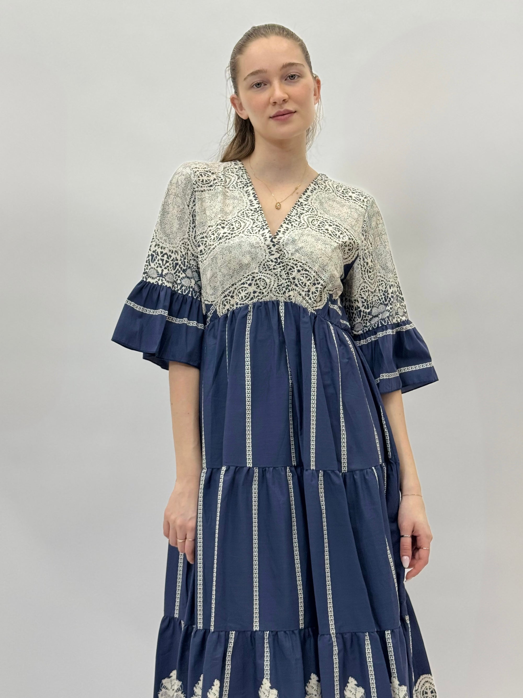 Abito lungo in pizzo sangallo con maniche a tre quarti e cintura