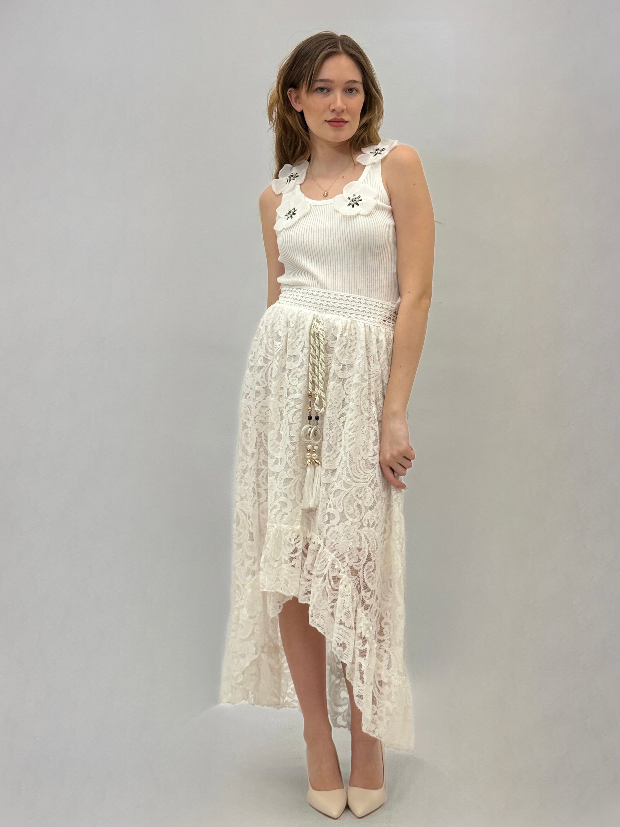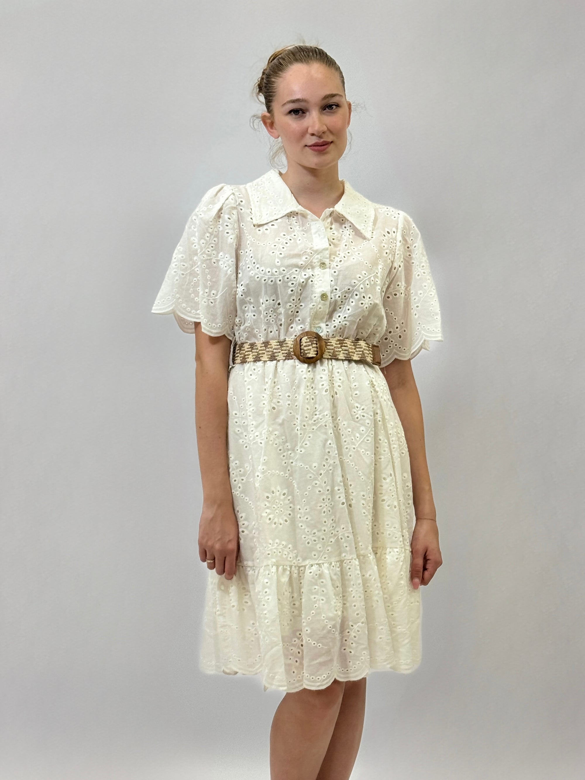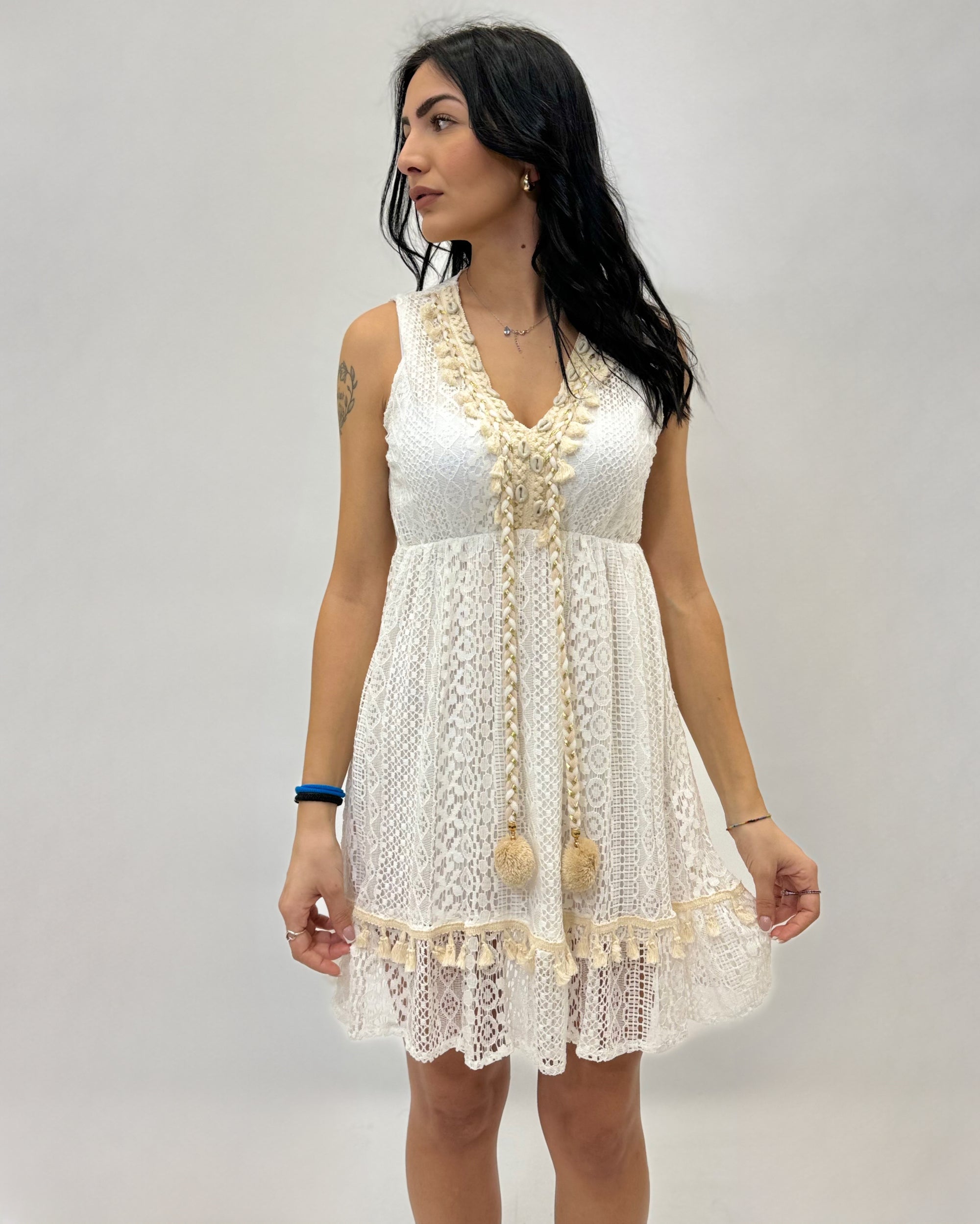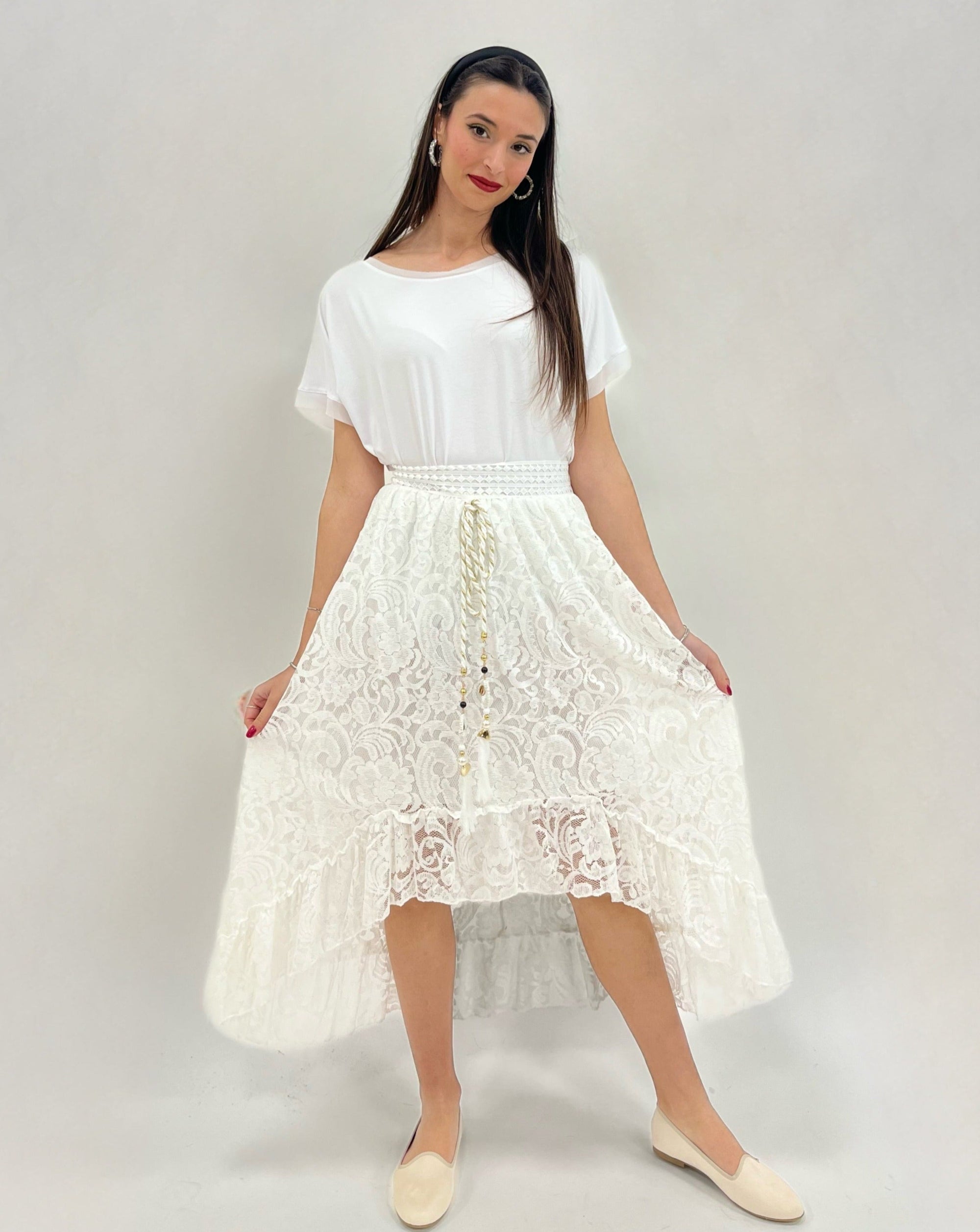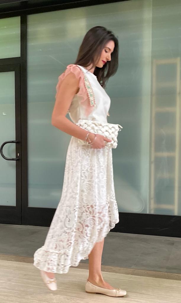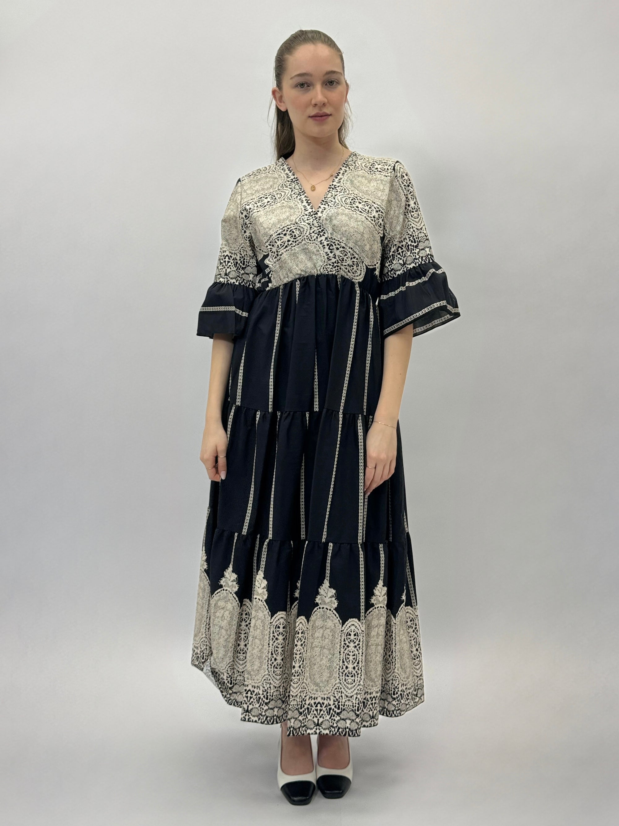 Abito lungo in pizzo sangallo con maniche a tre quarti e cintura