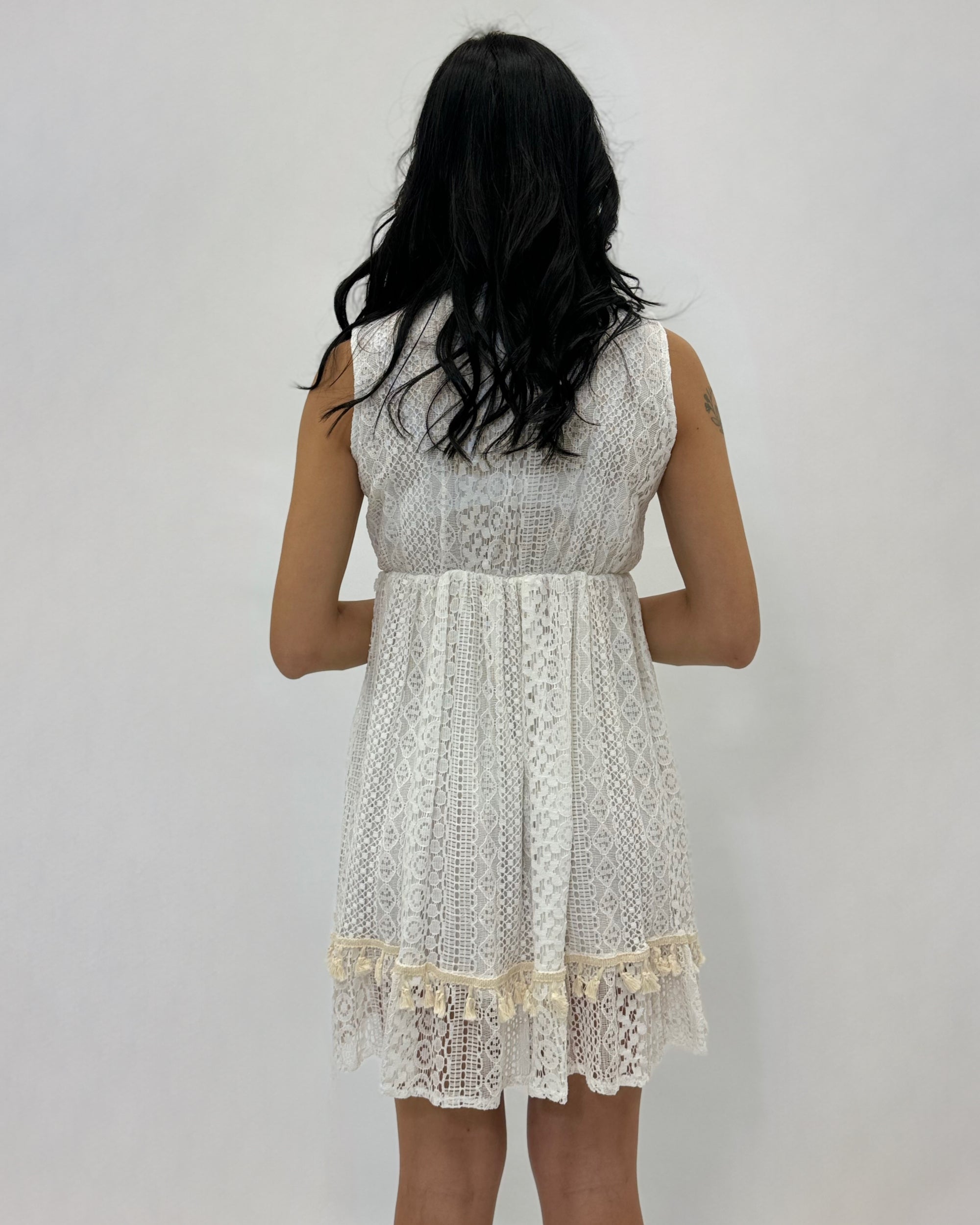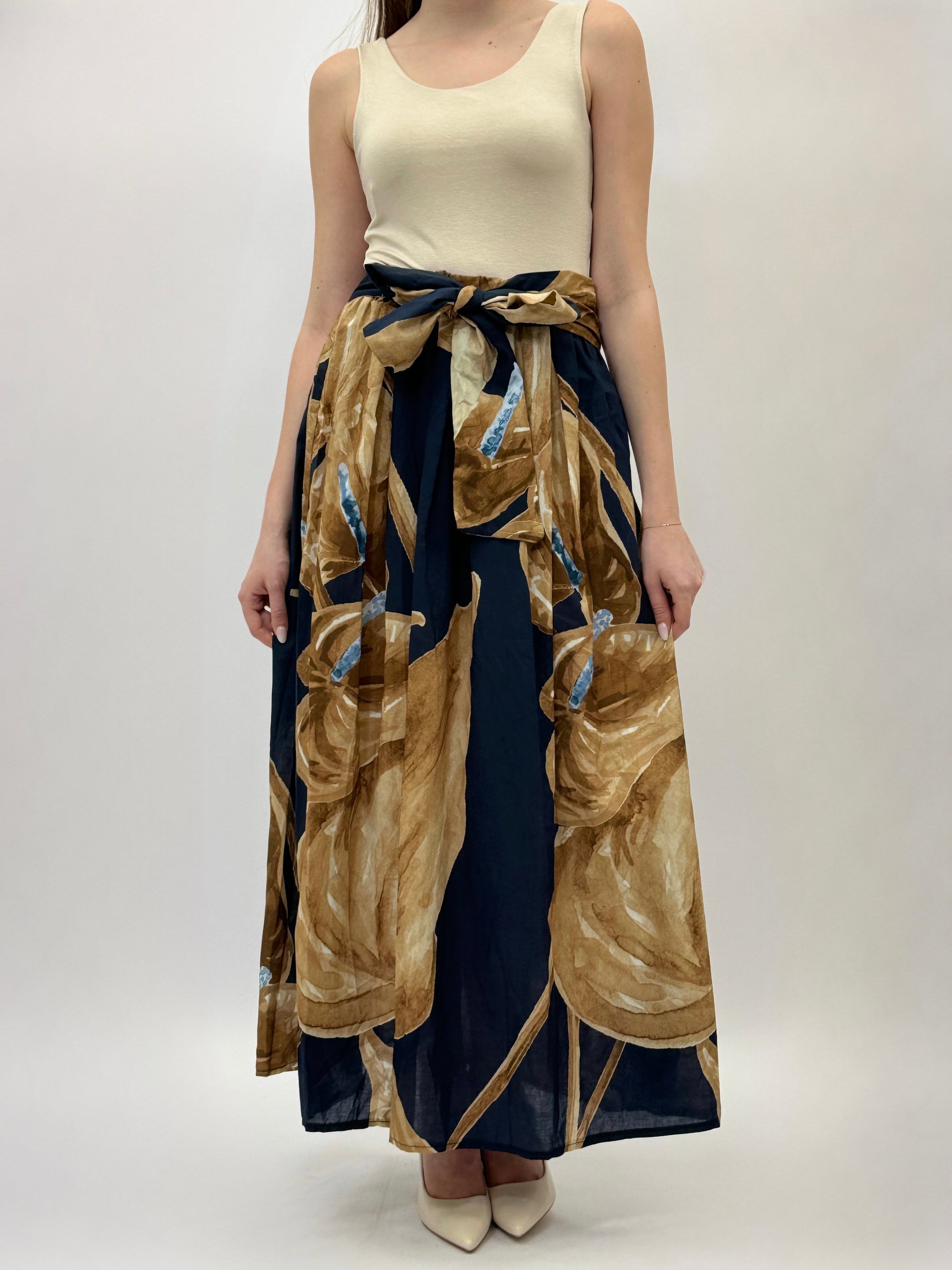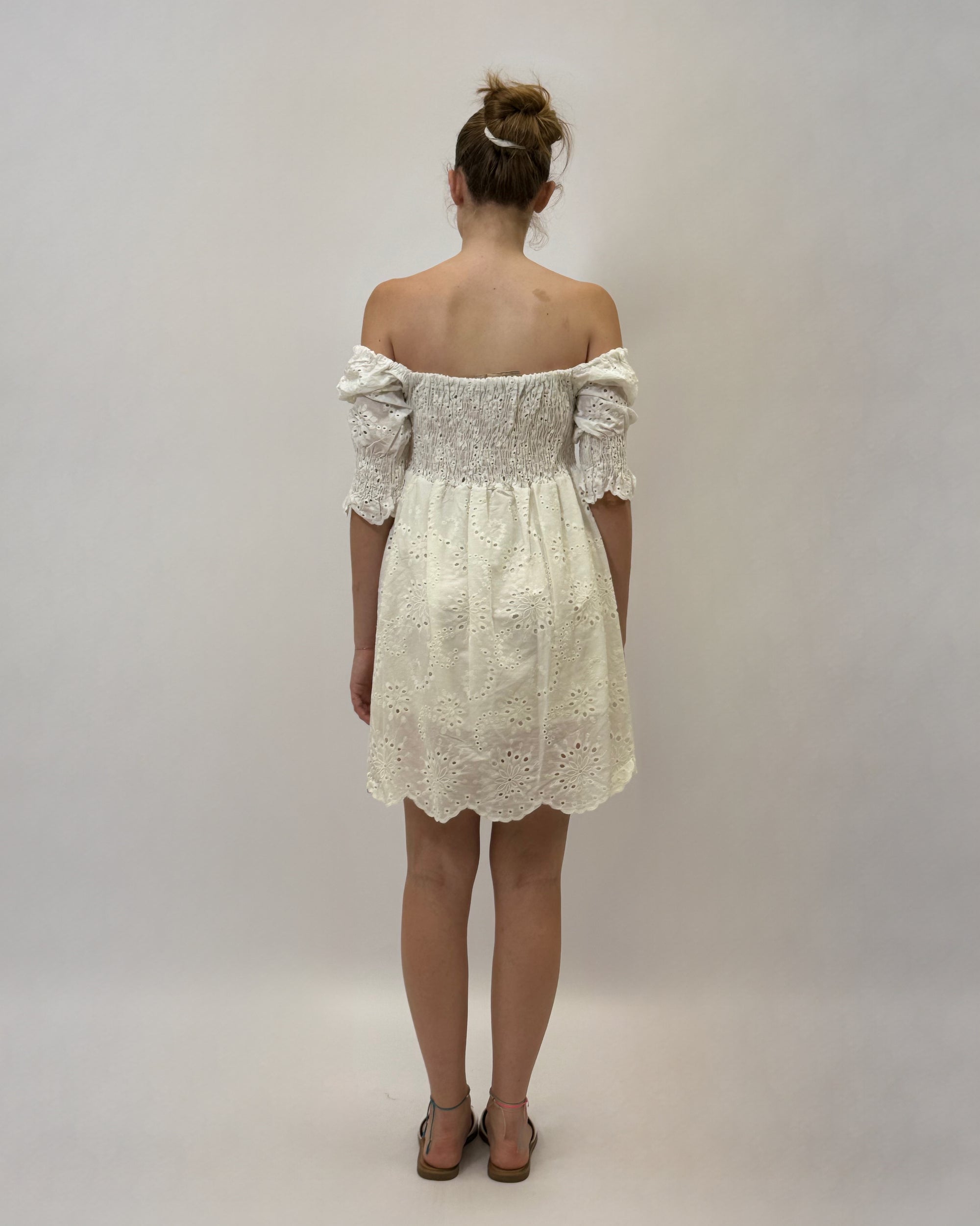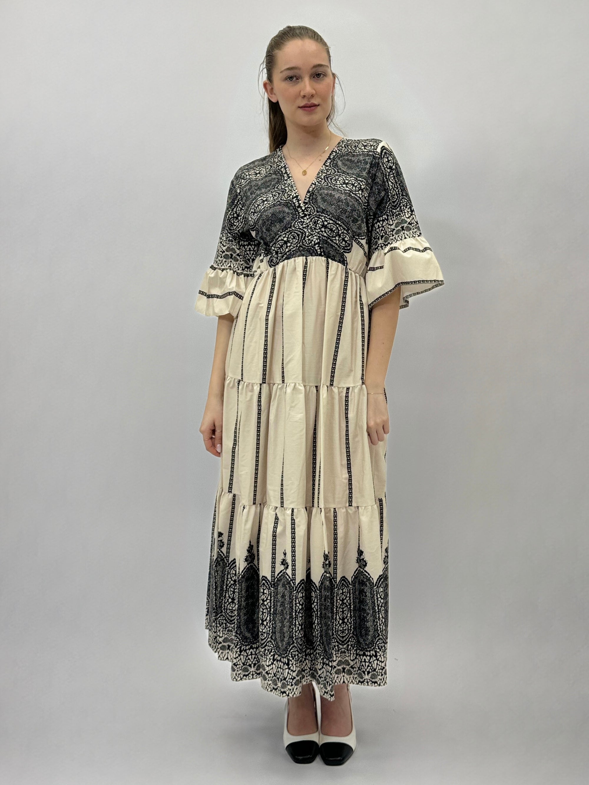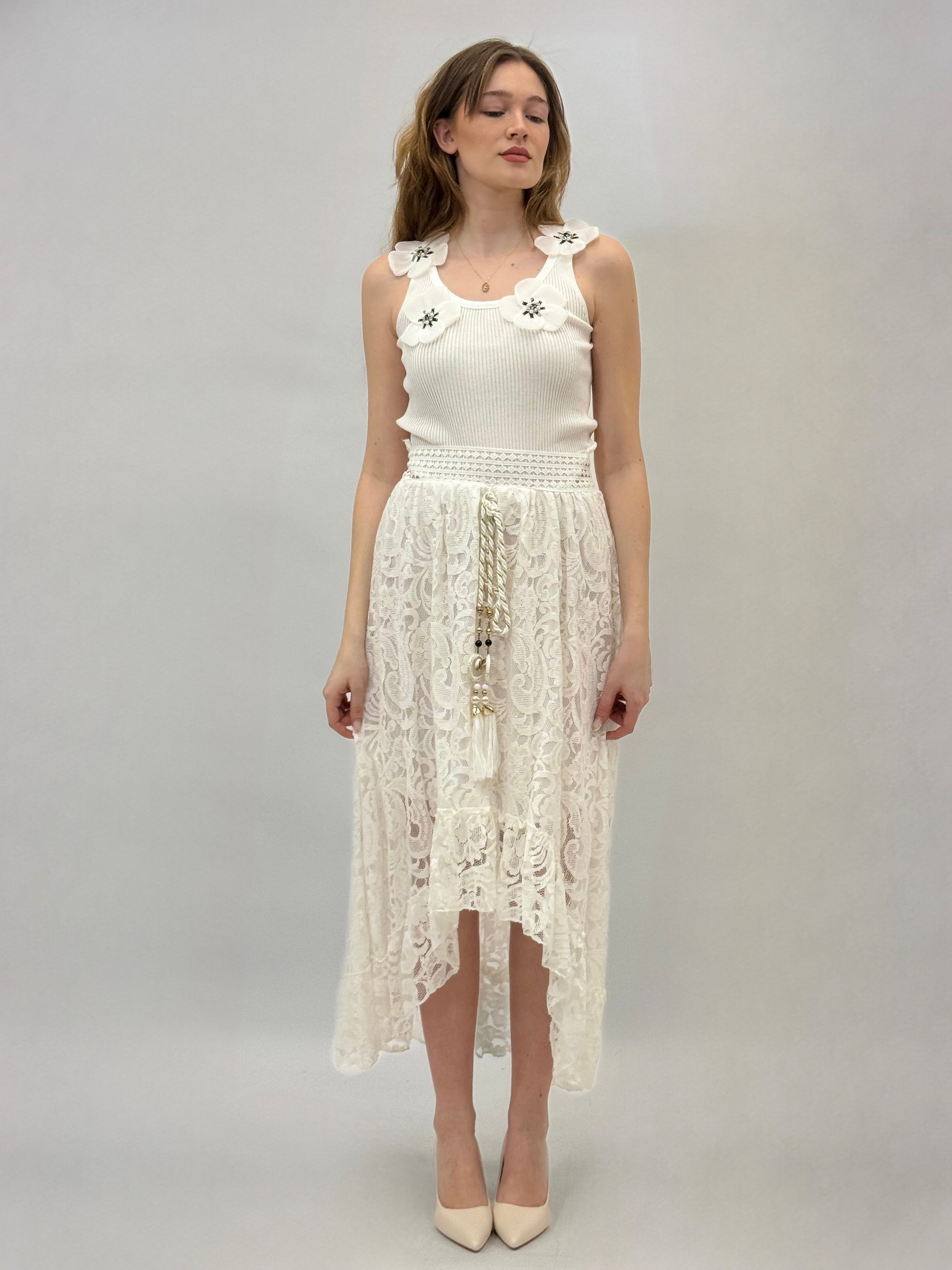 Abito lungo in pizzo sangallo con maniche a tre quarti e cintura