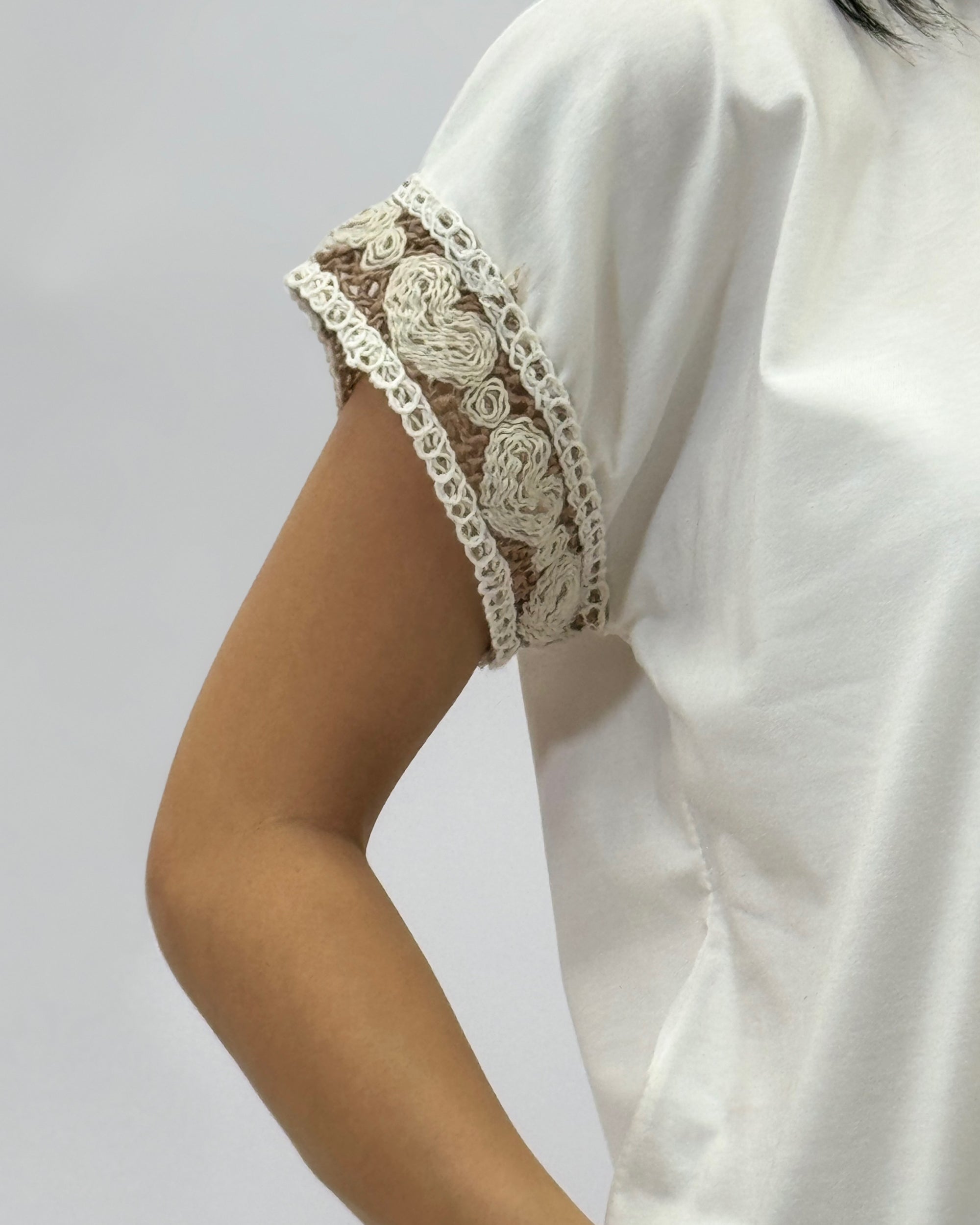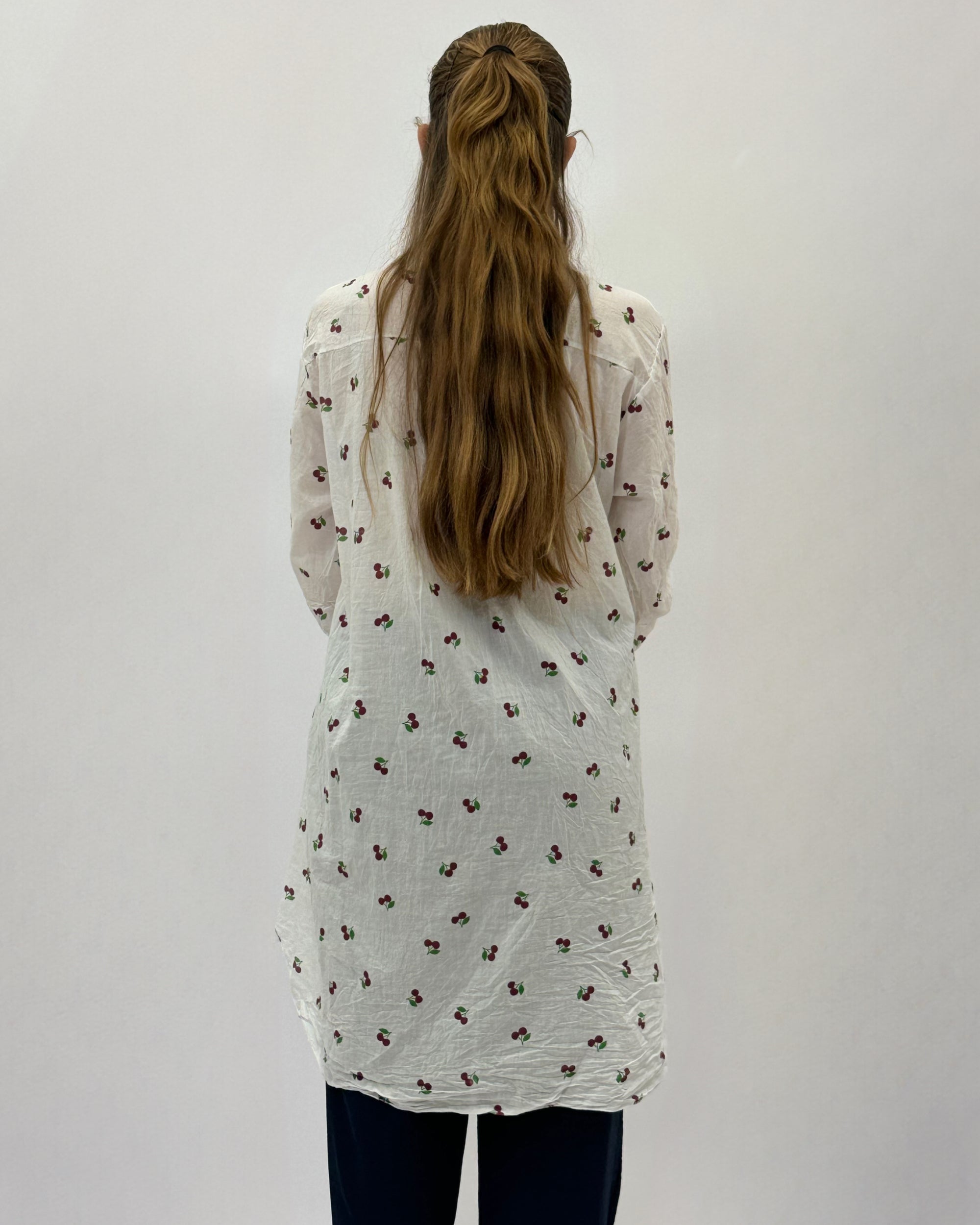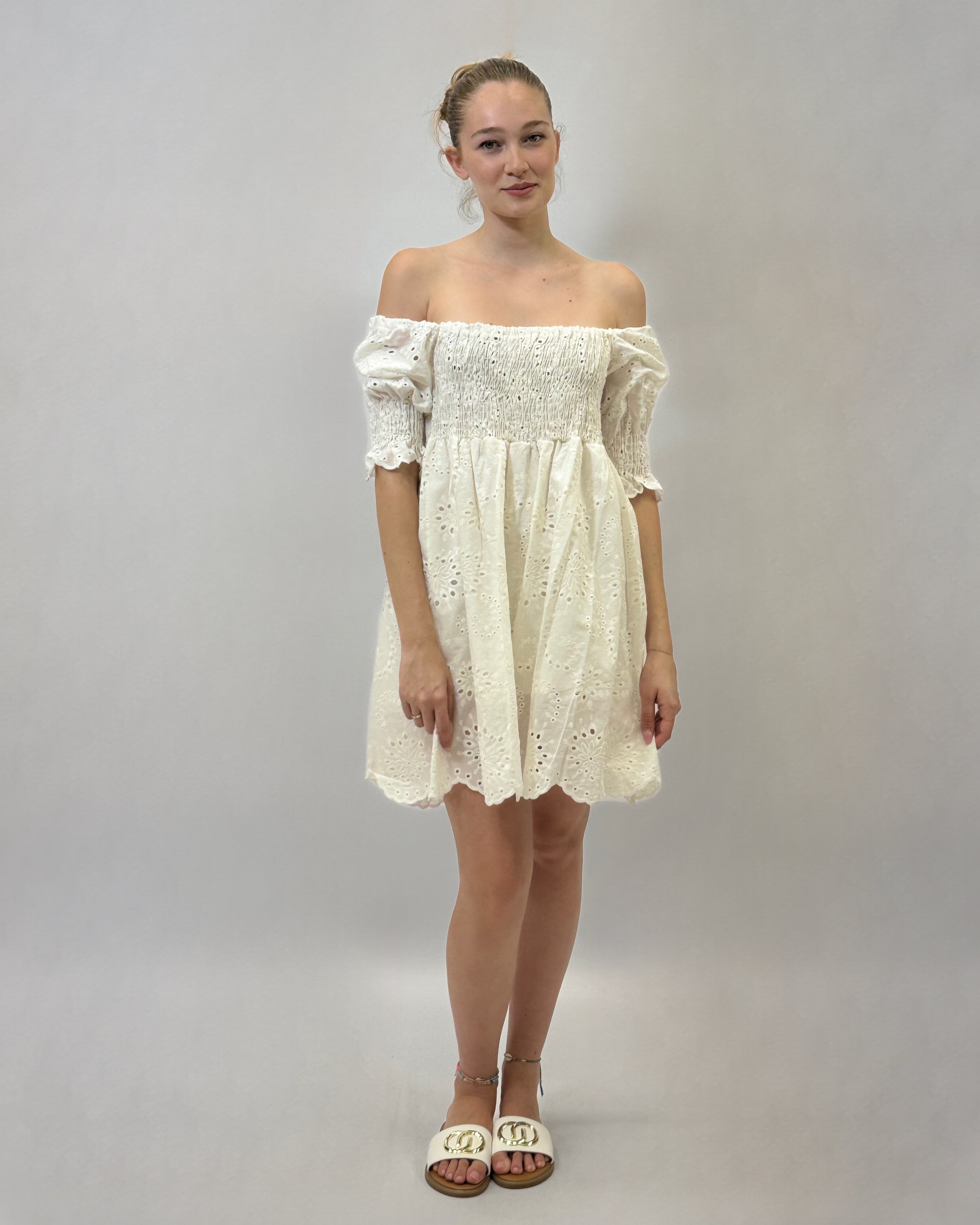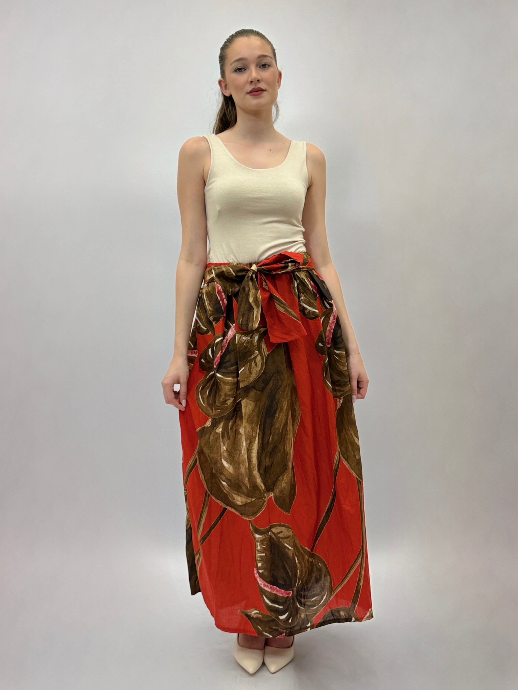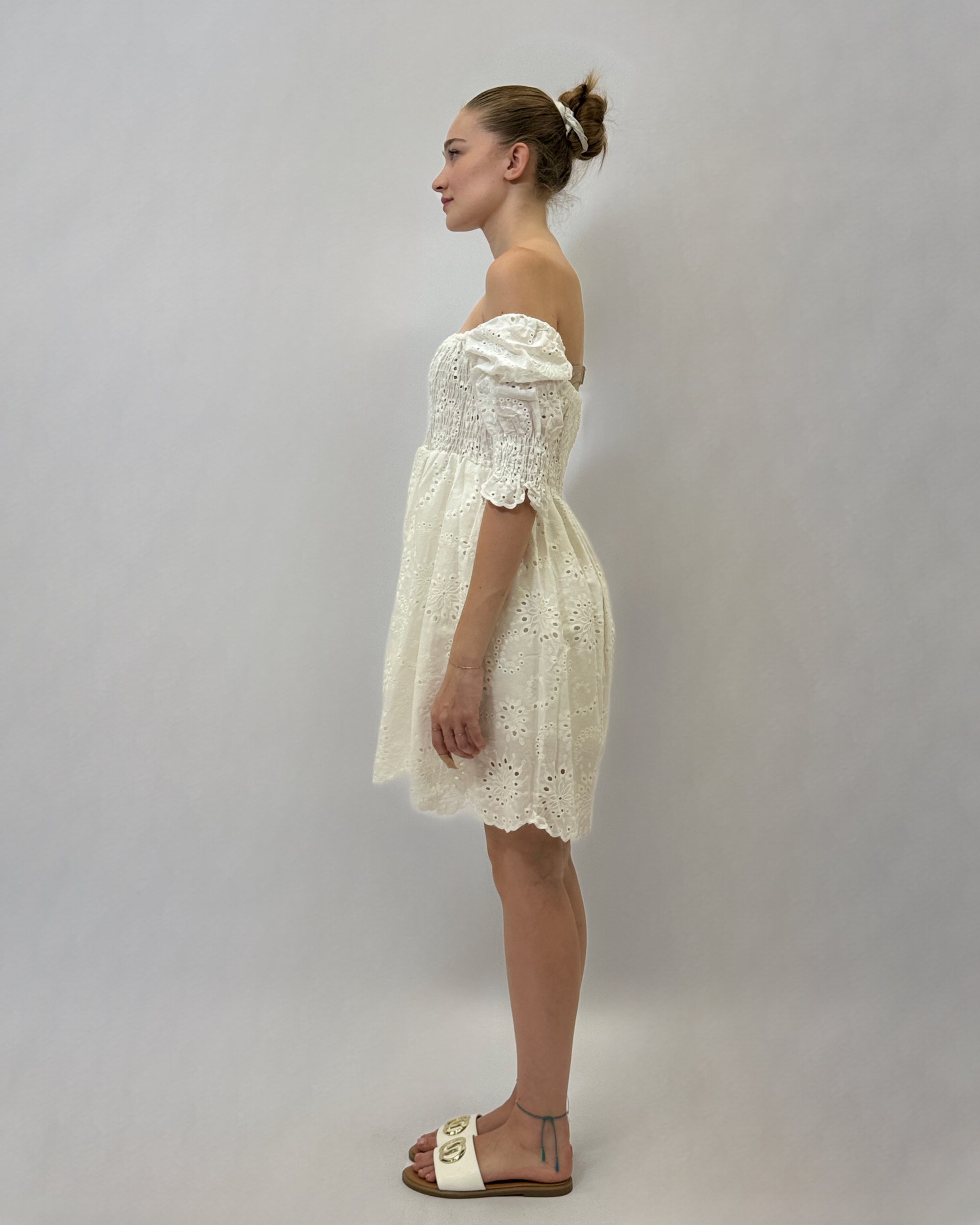 Abito lungo in pizzo sangallo con maniche a tre quarti e cintura