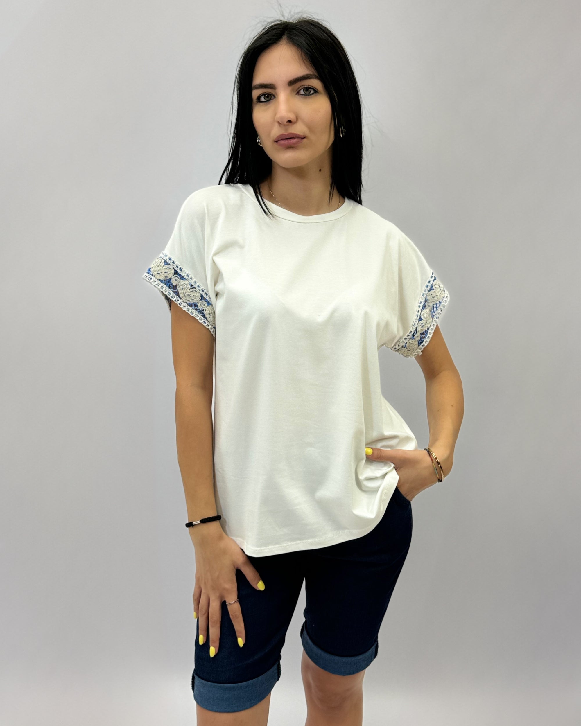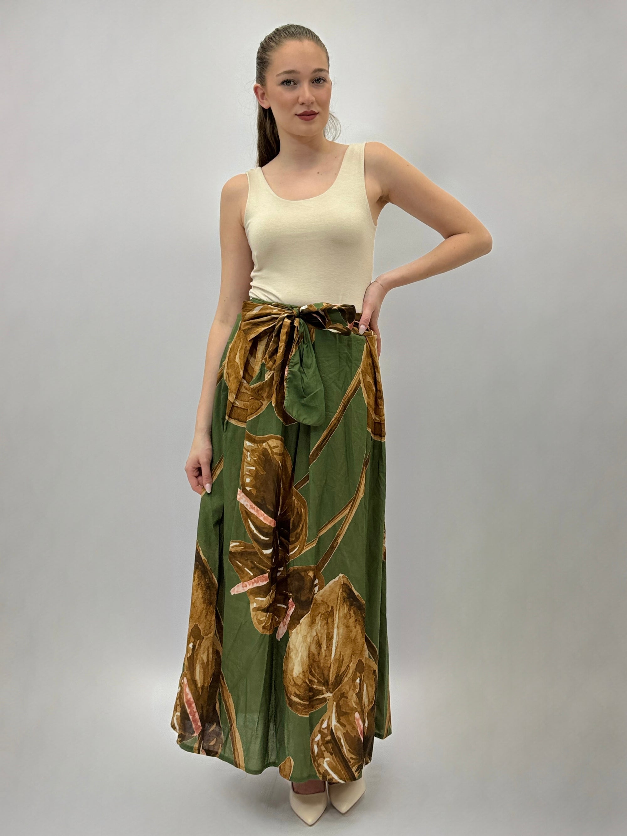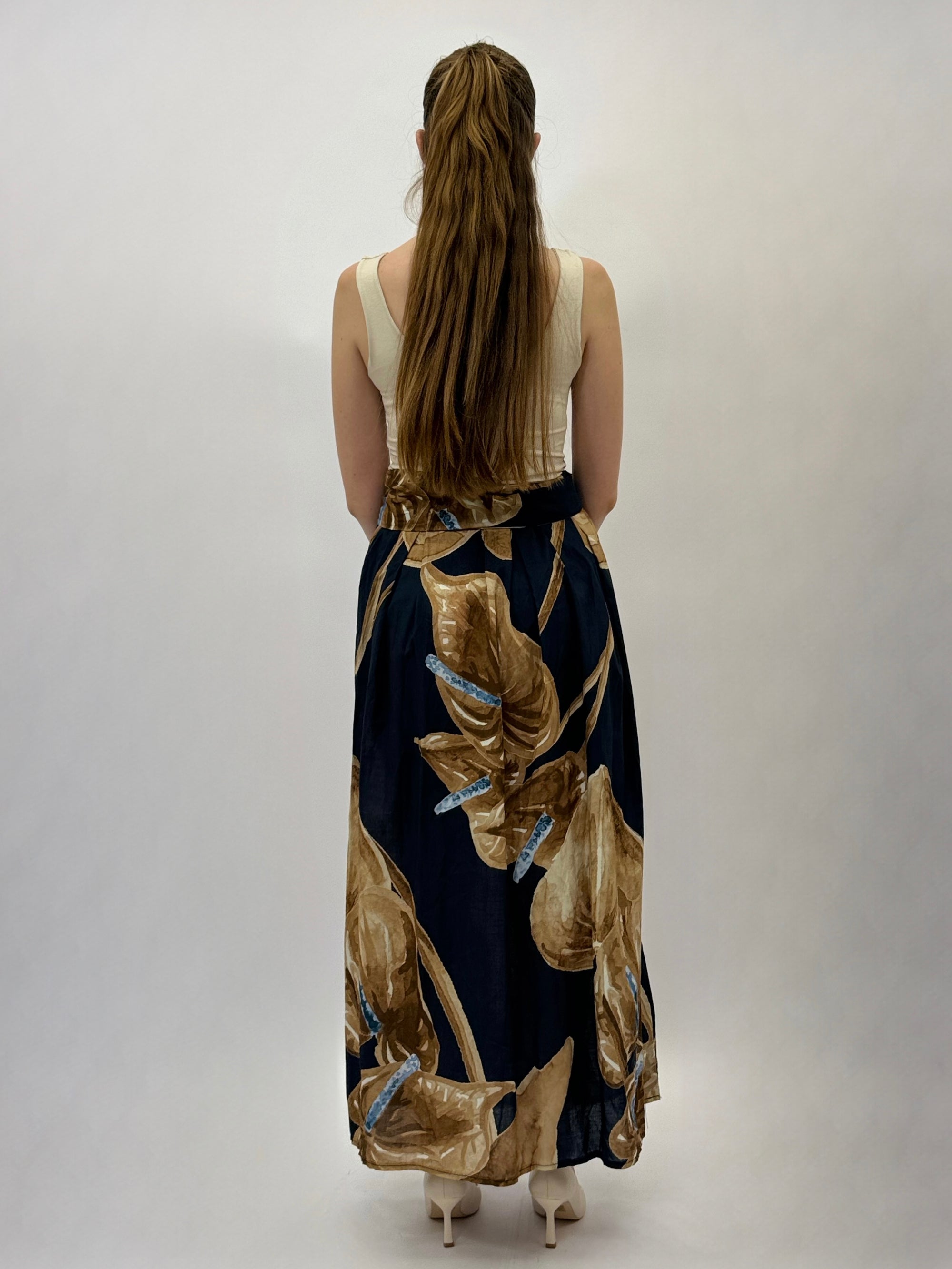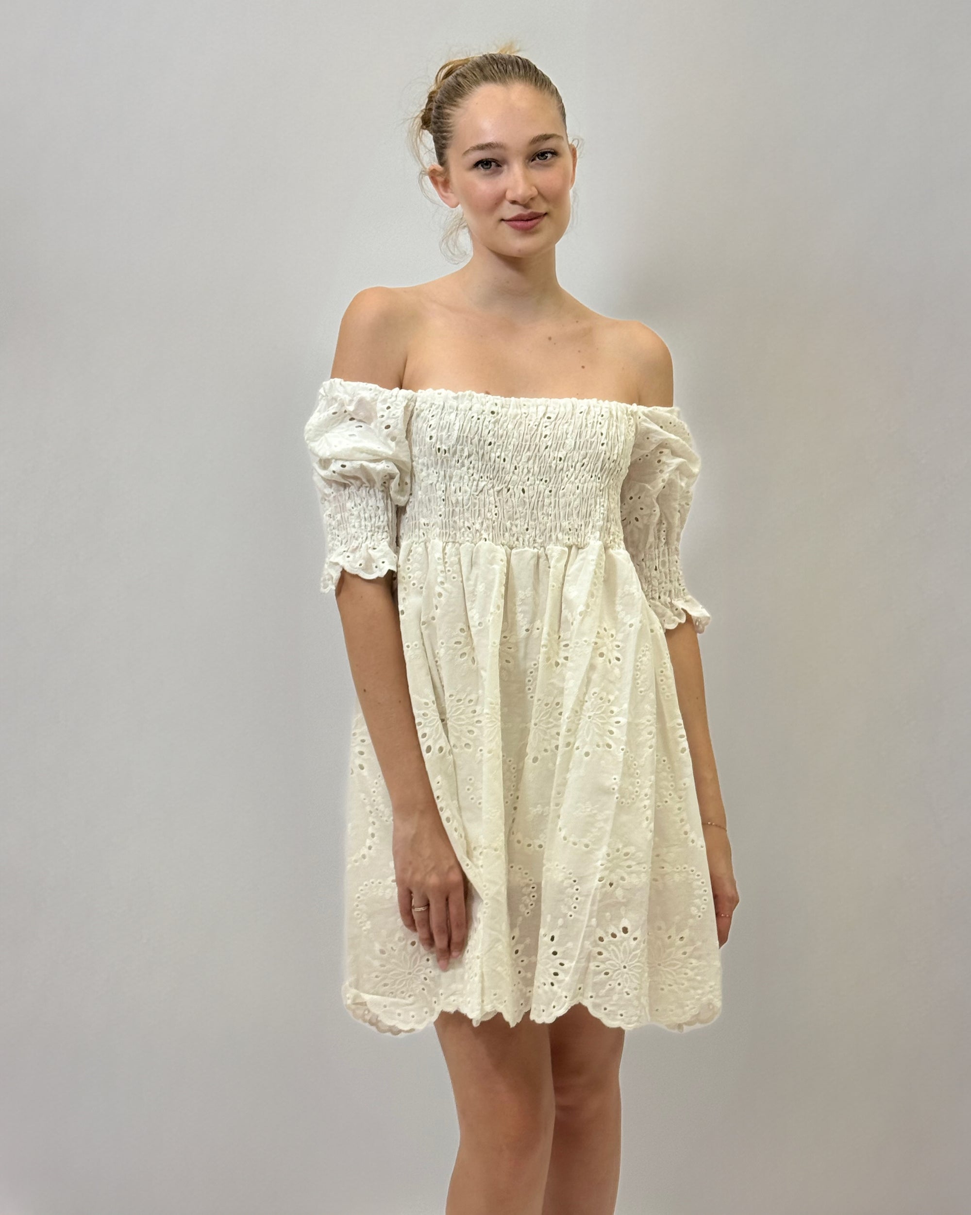 Abito lungo in pizzo sangallo con maniche a tre quarti e cintura