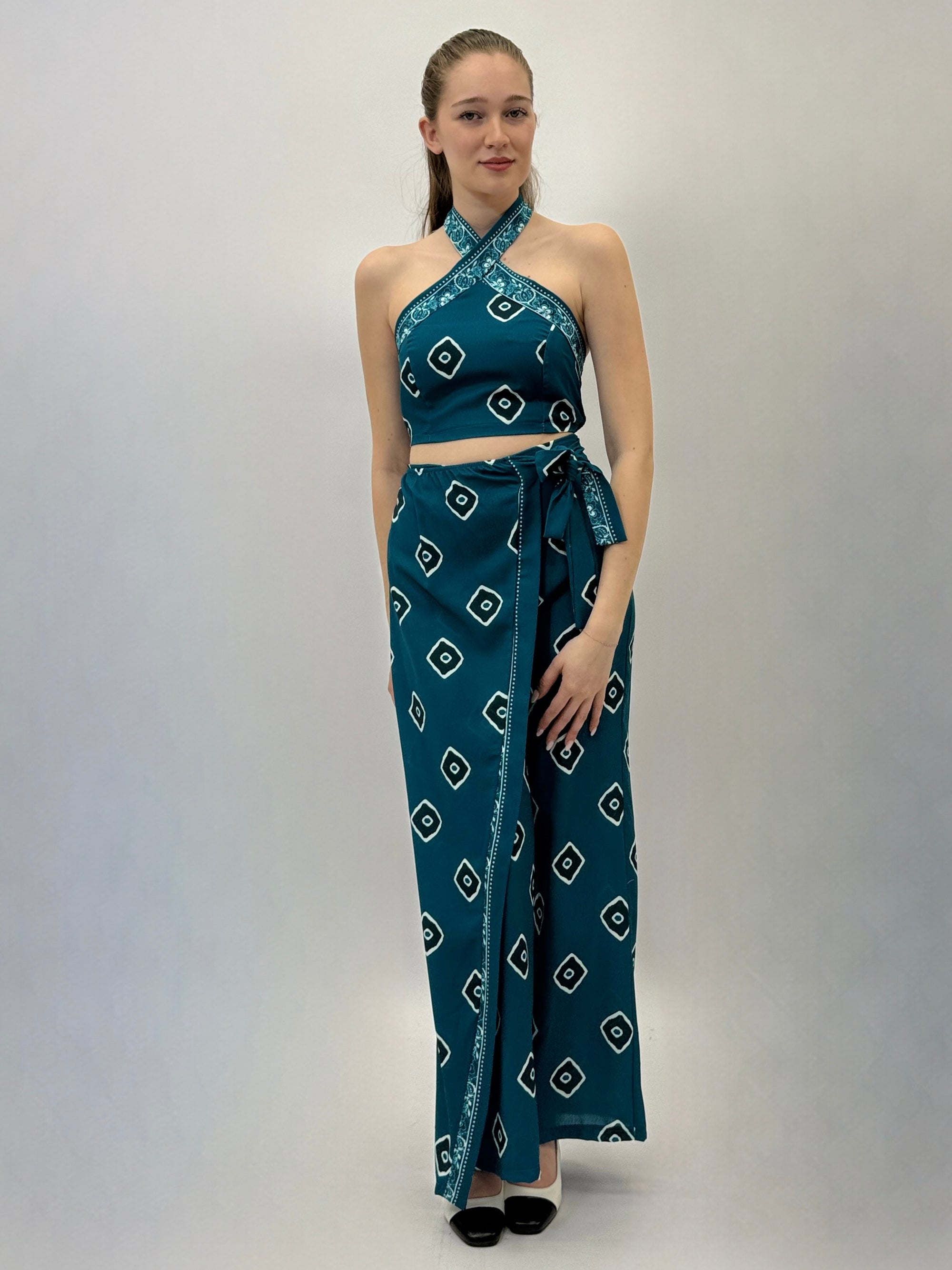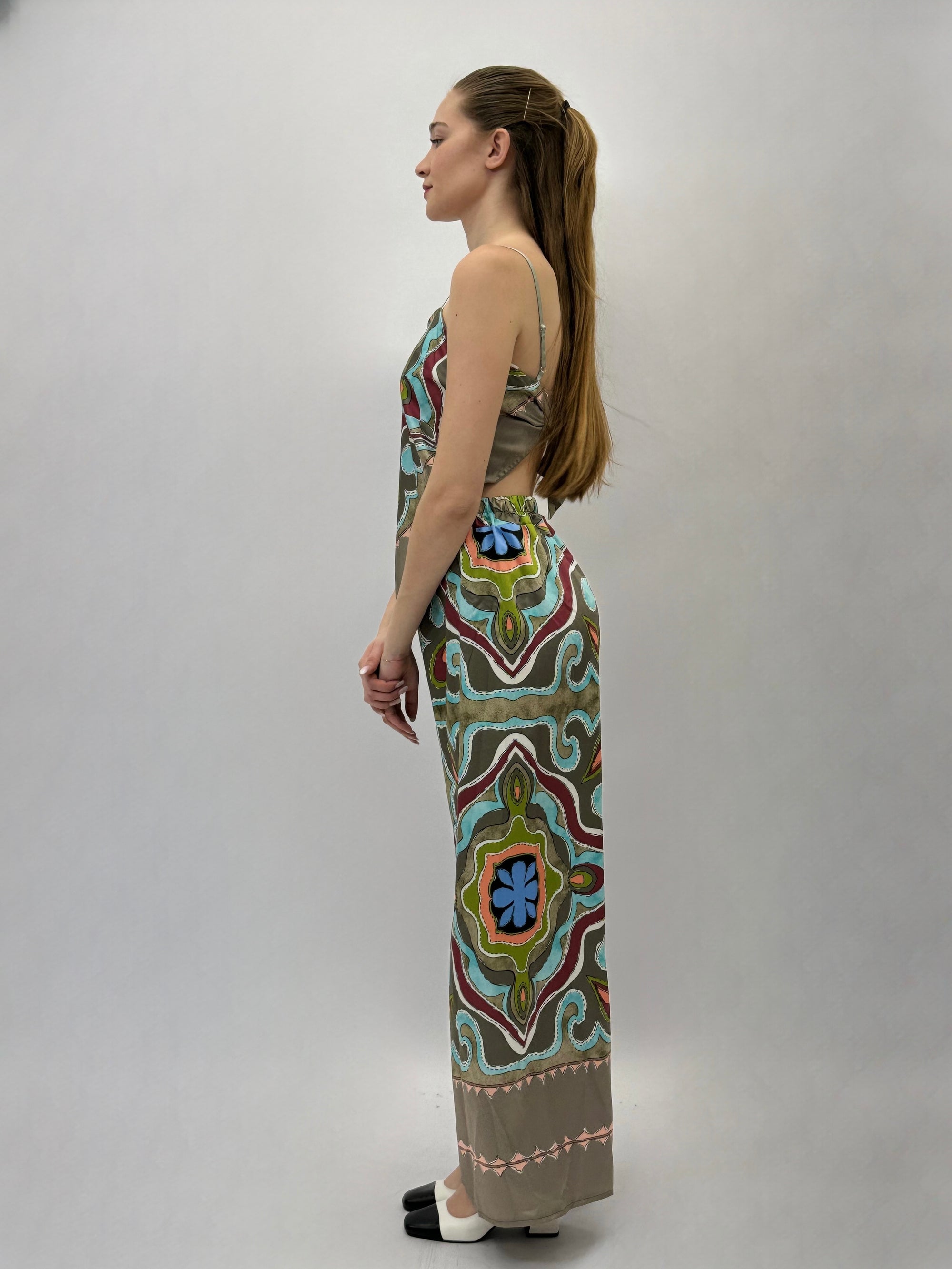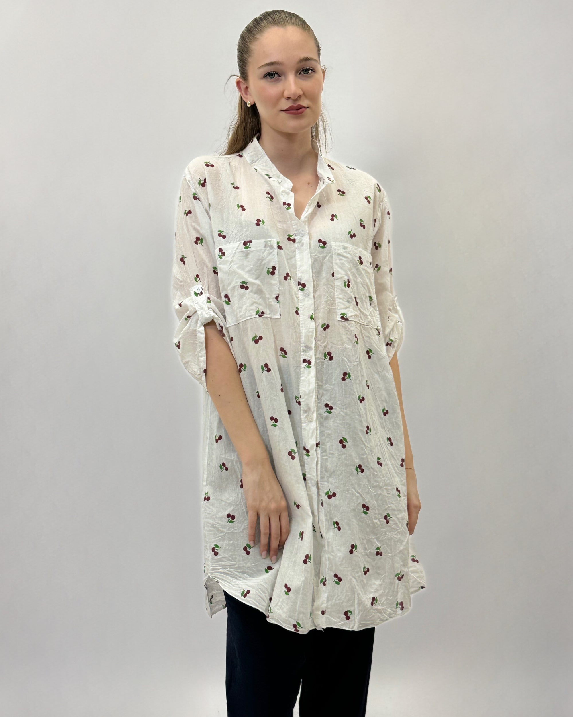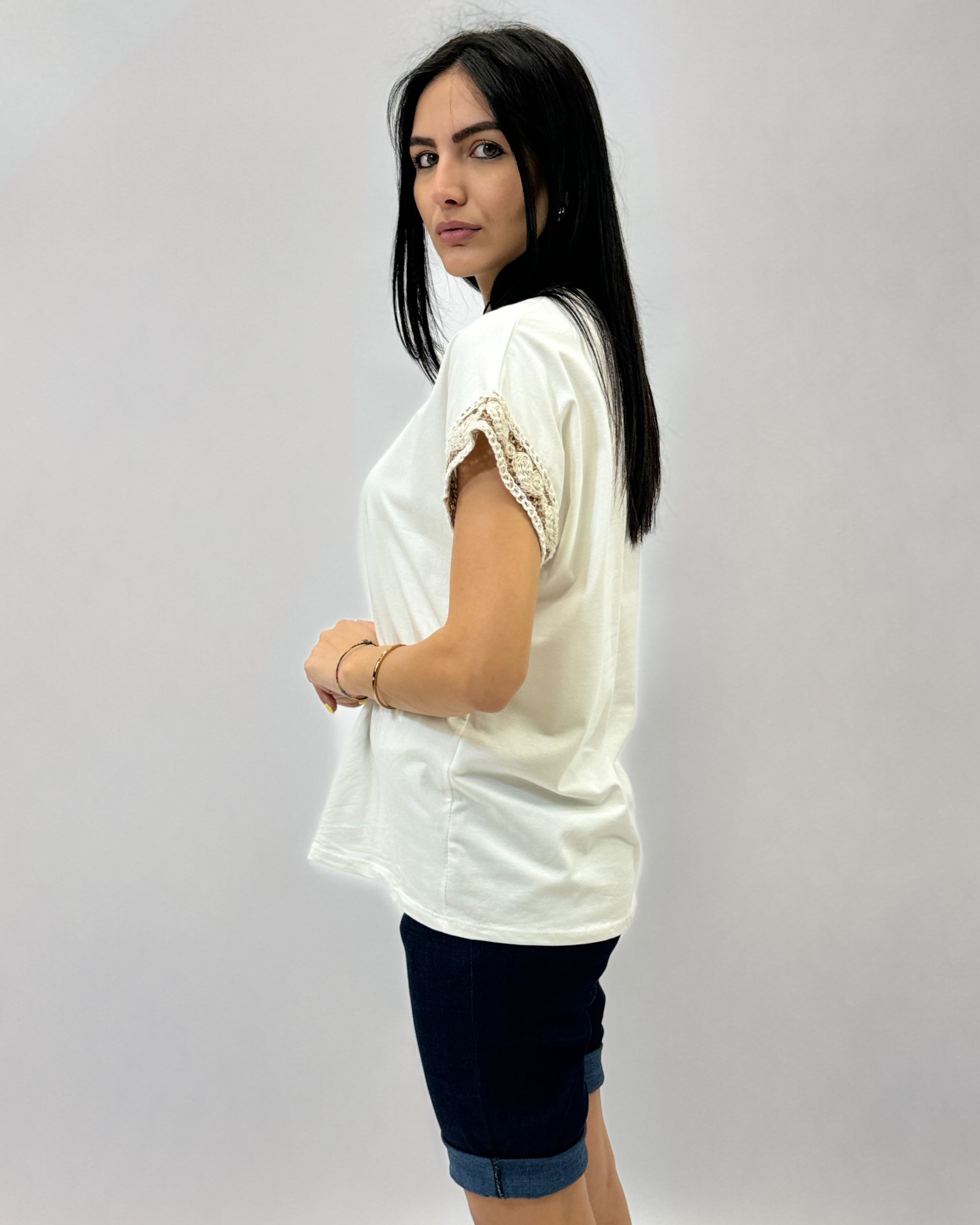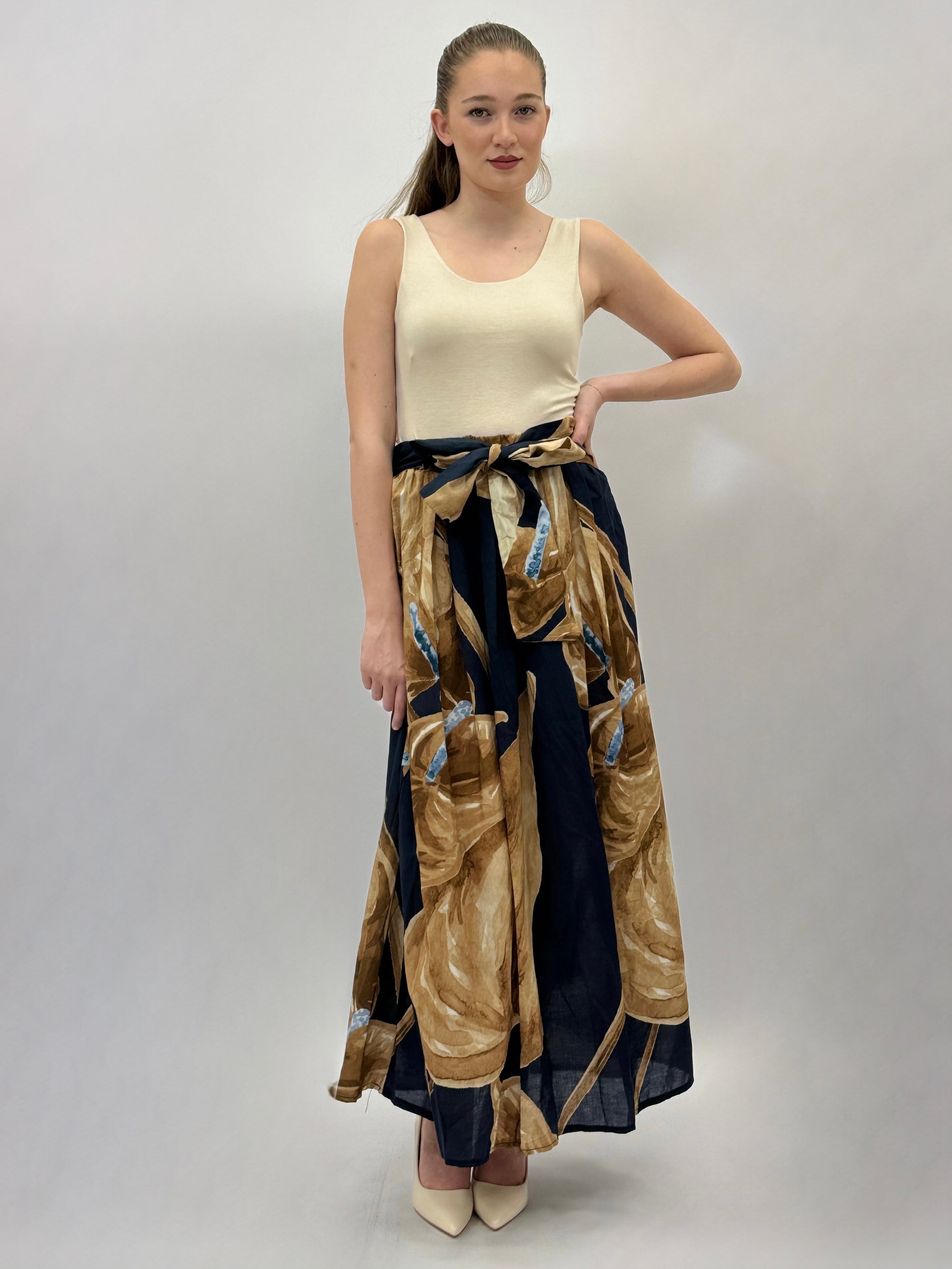 Abito lungo in pizzo sangallo con maniche a tre quarti e cintura