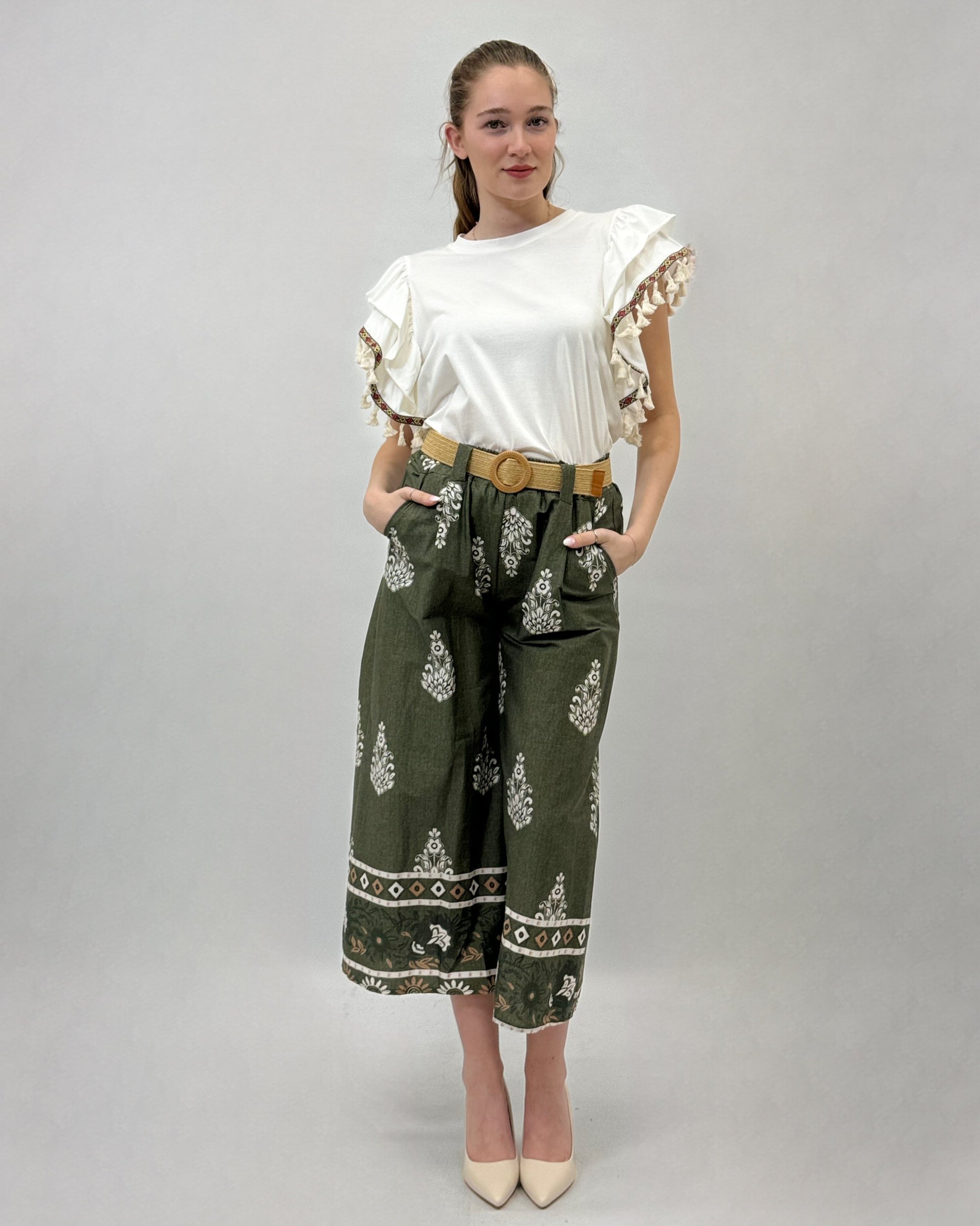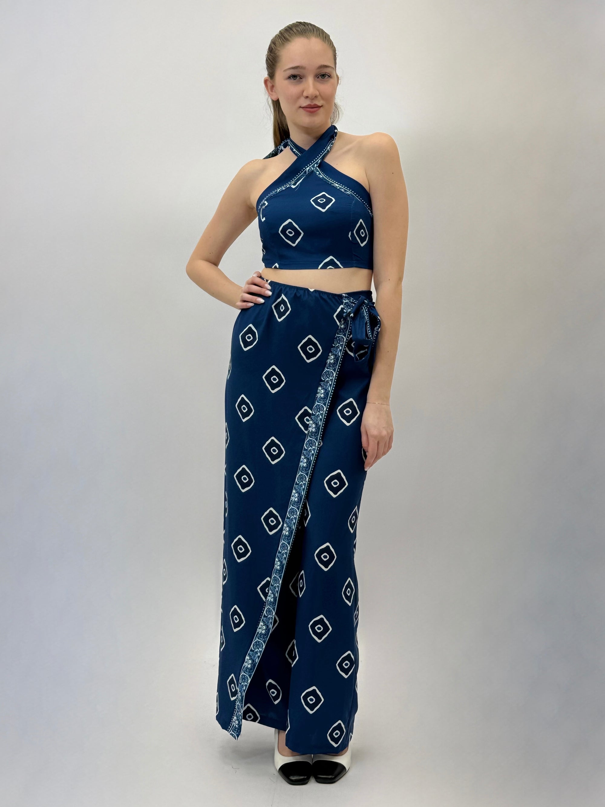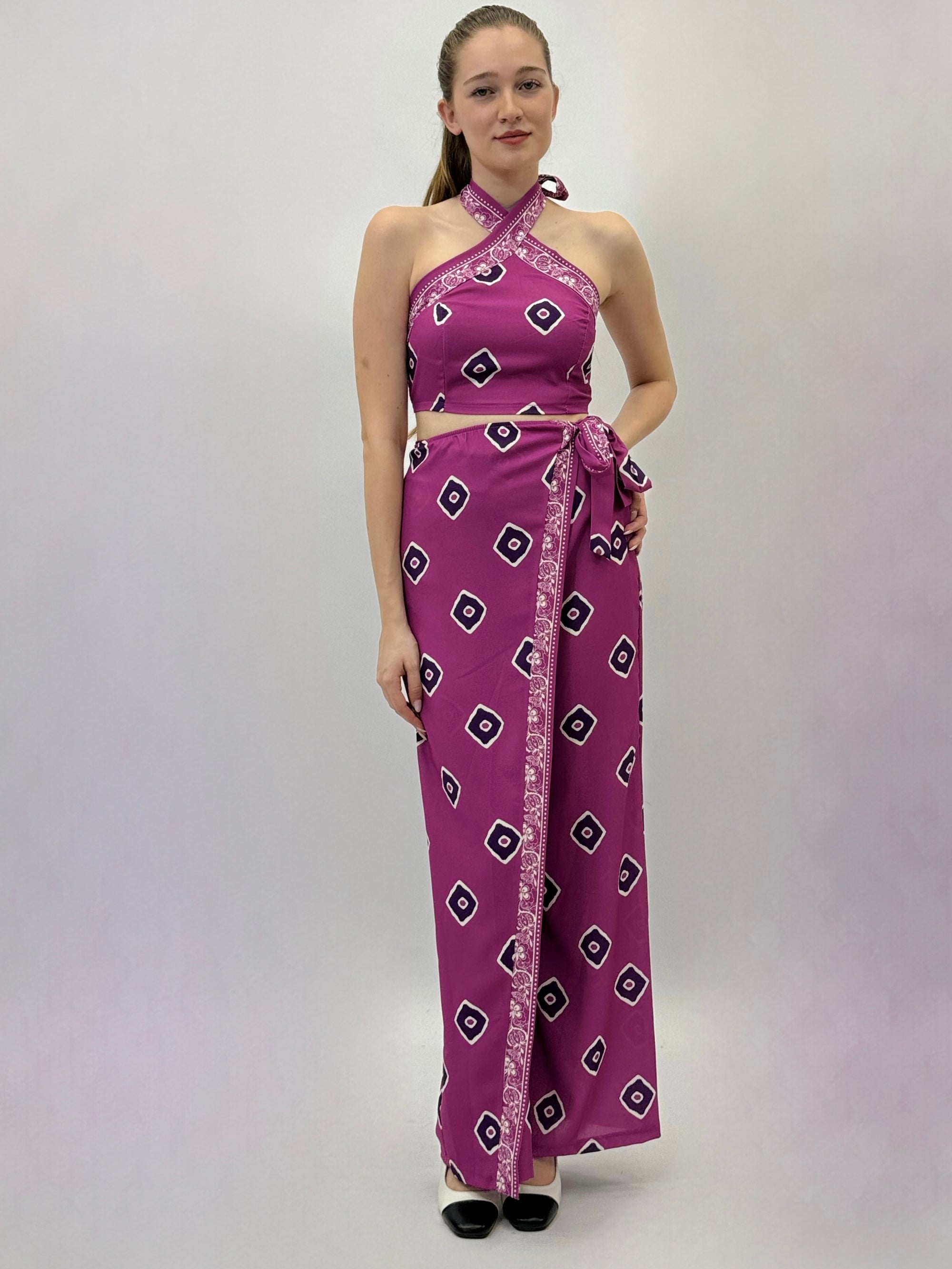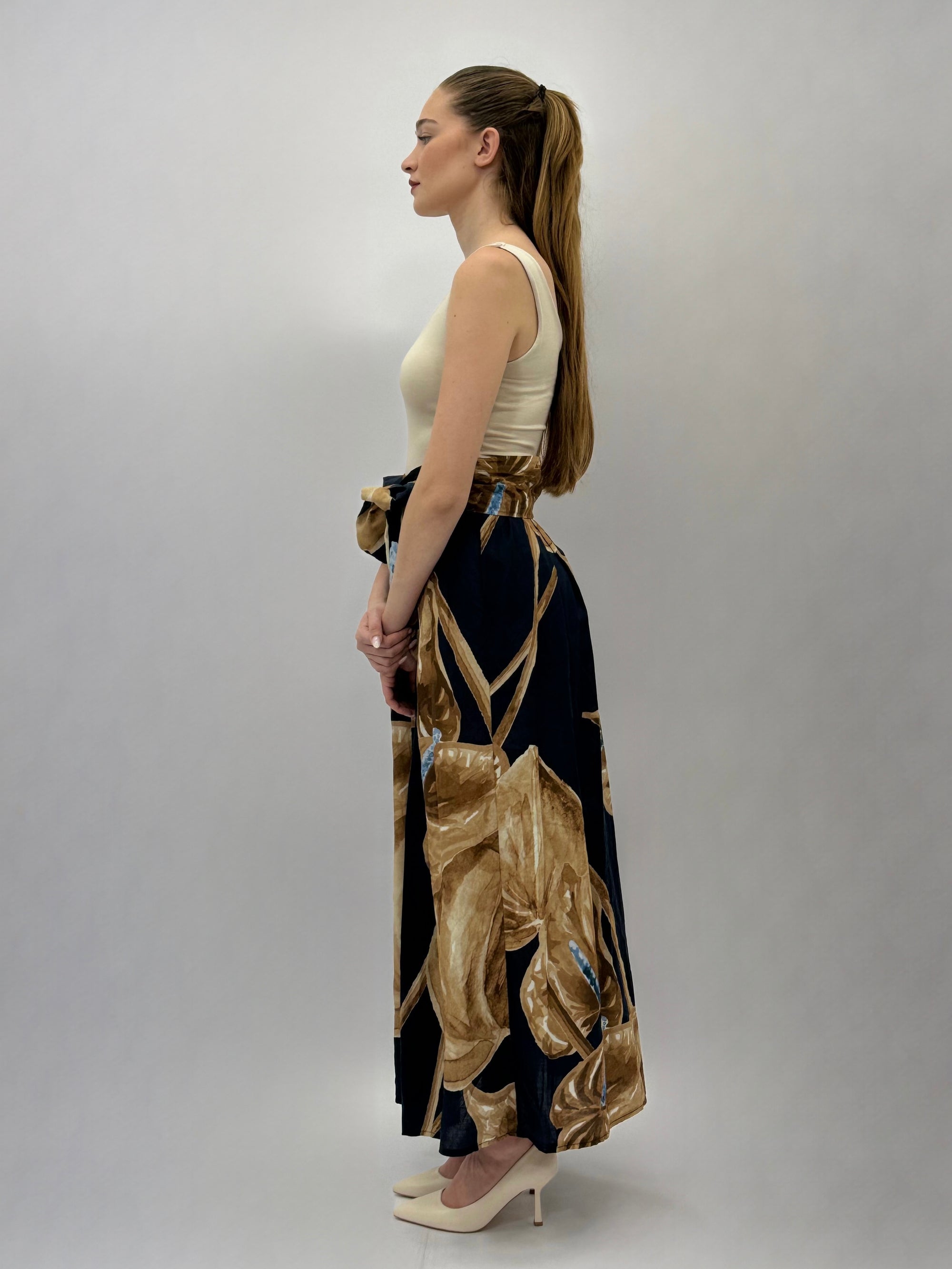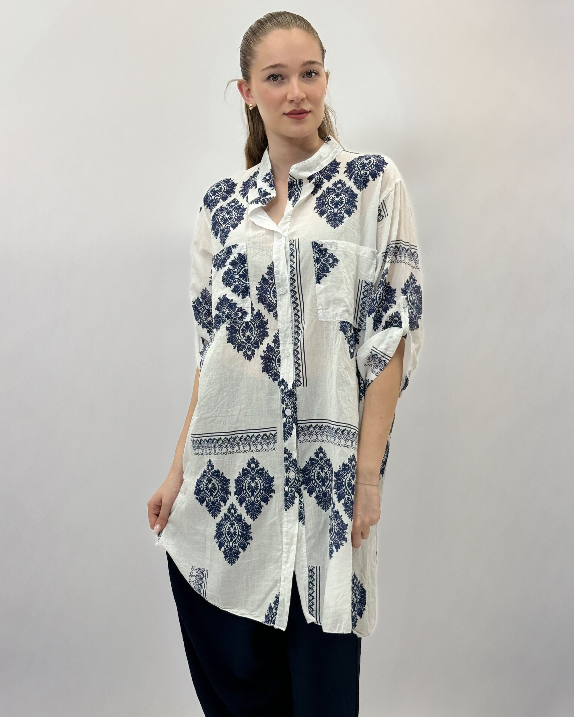 Abito lungo in pizzo sangallo con maniche a tre quarti e cintura