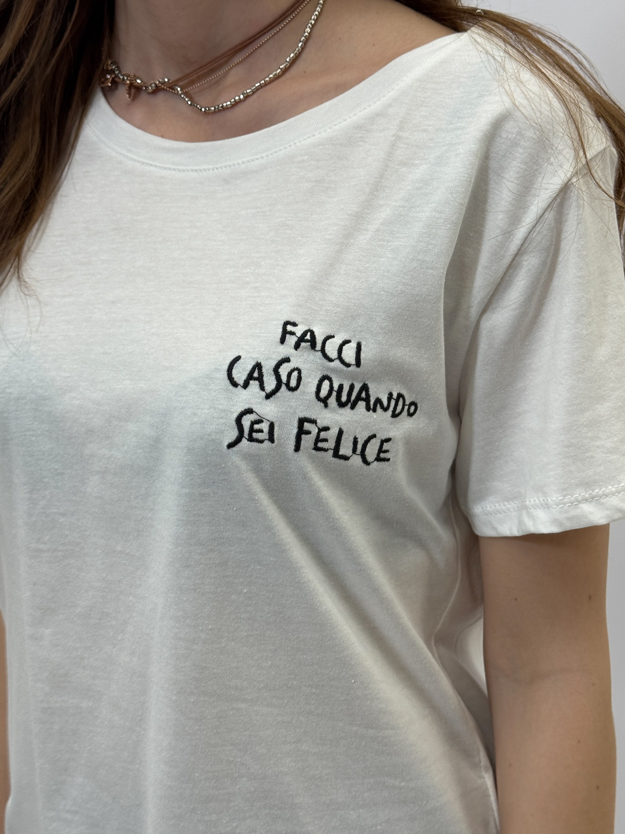 T-shirt con scritta "facci caso quando sei felice"