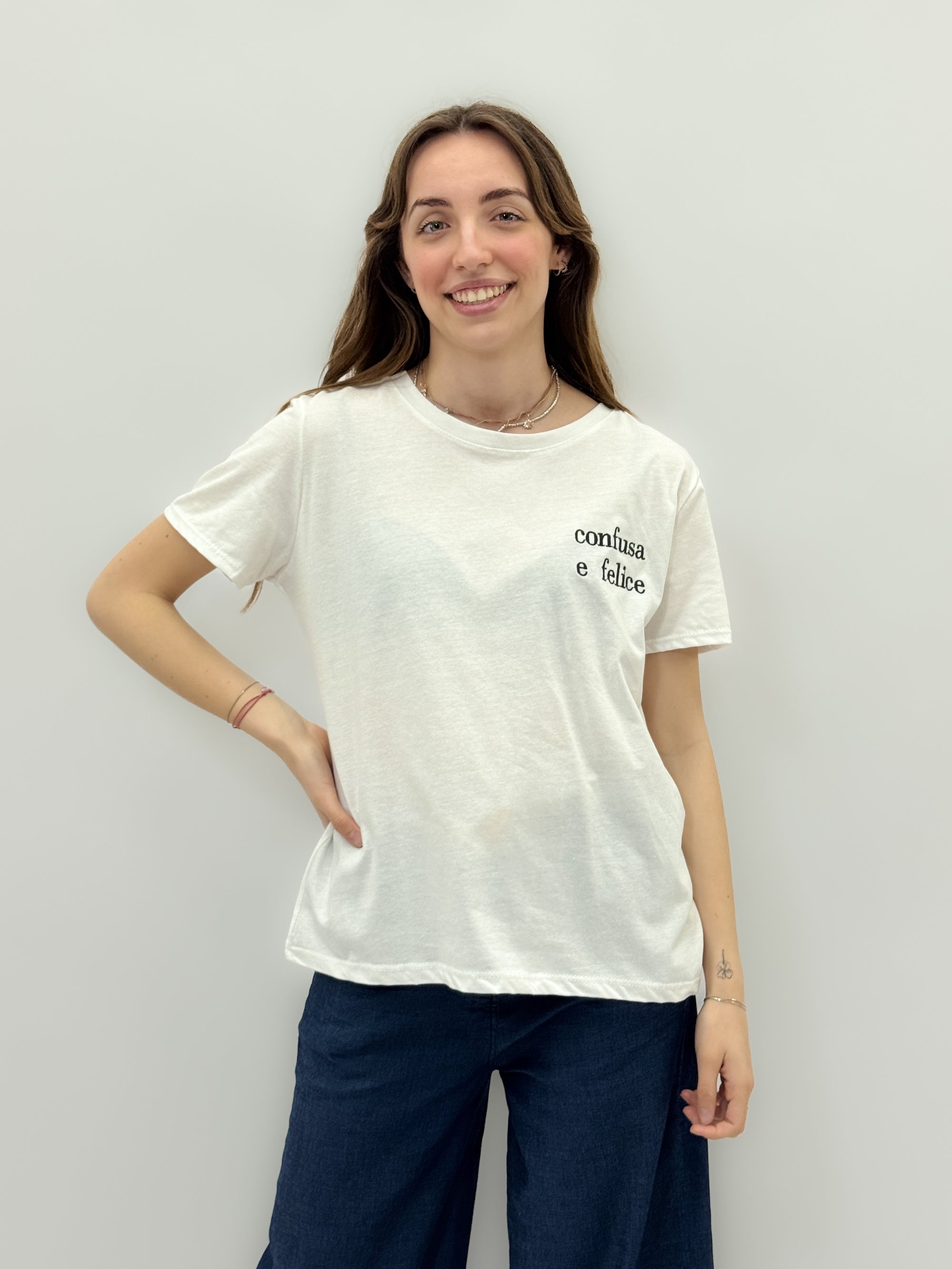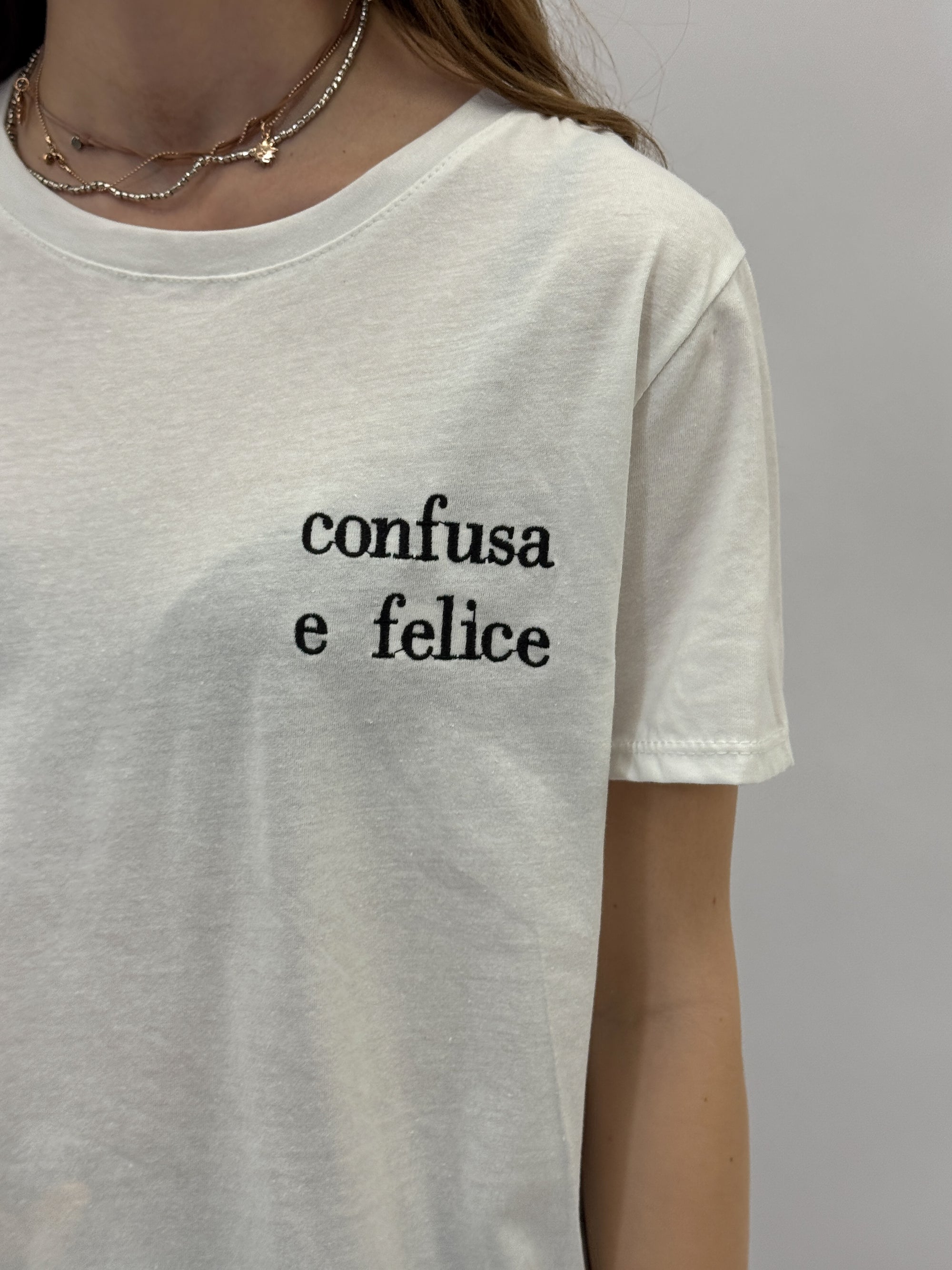 T-shirt con scritta "confusa e felice"